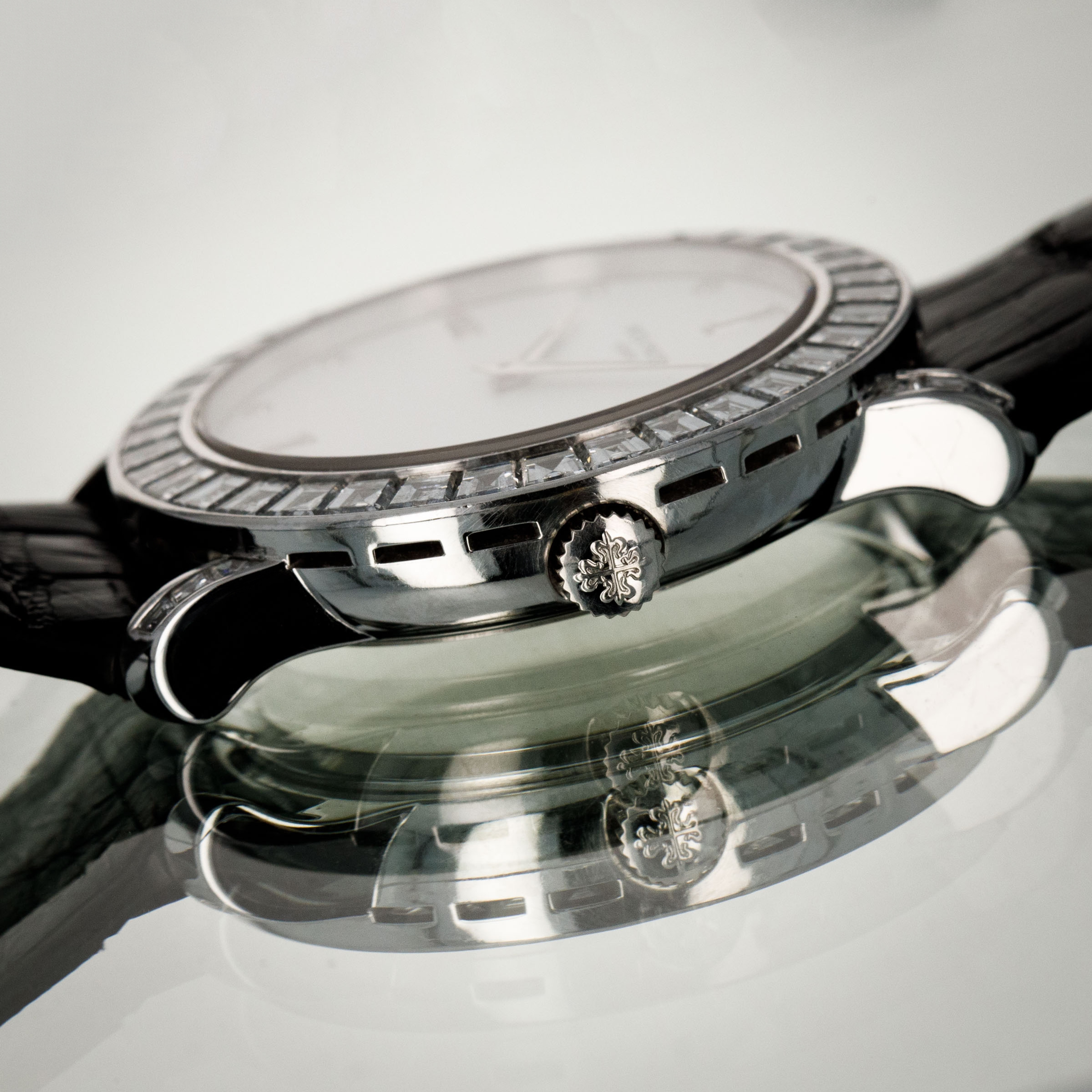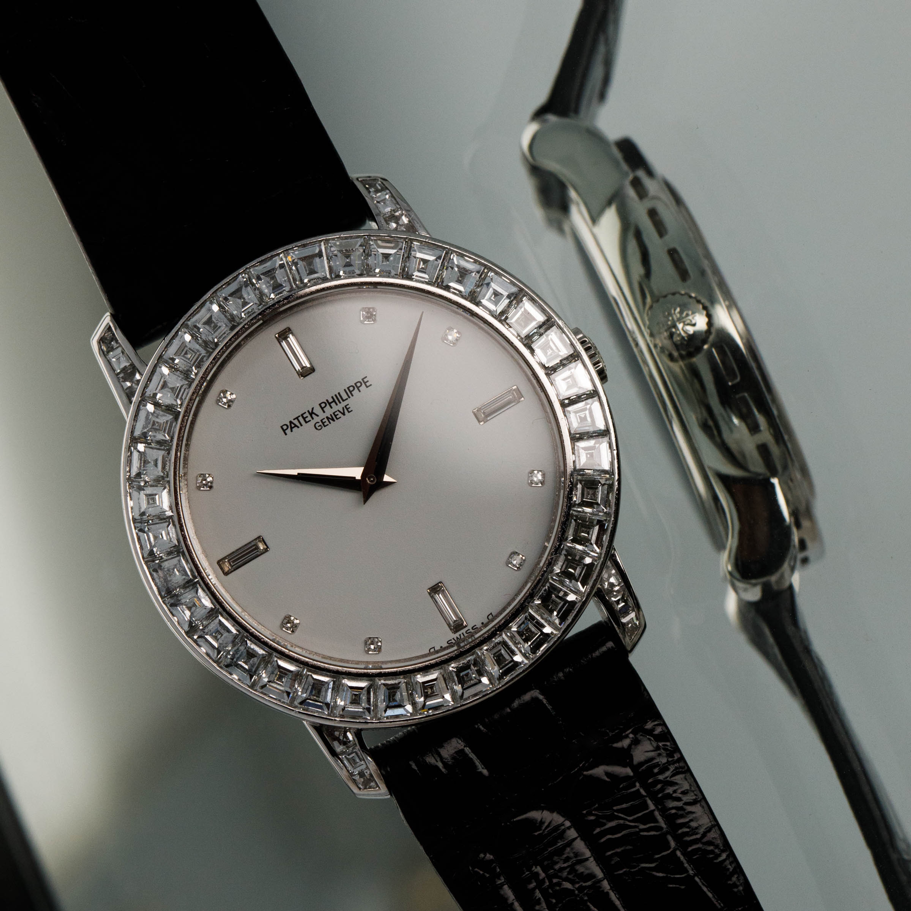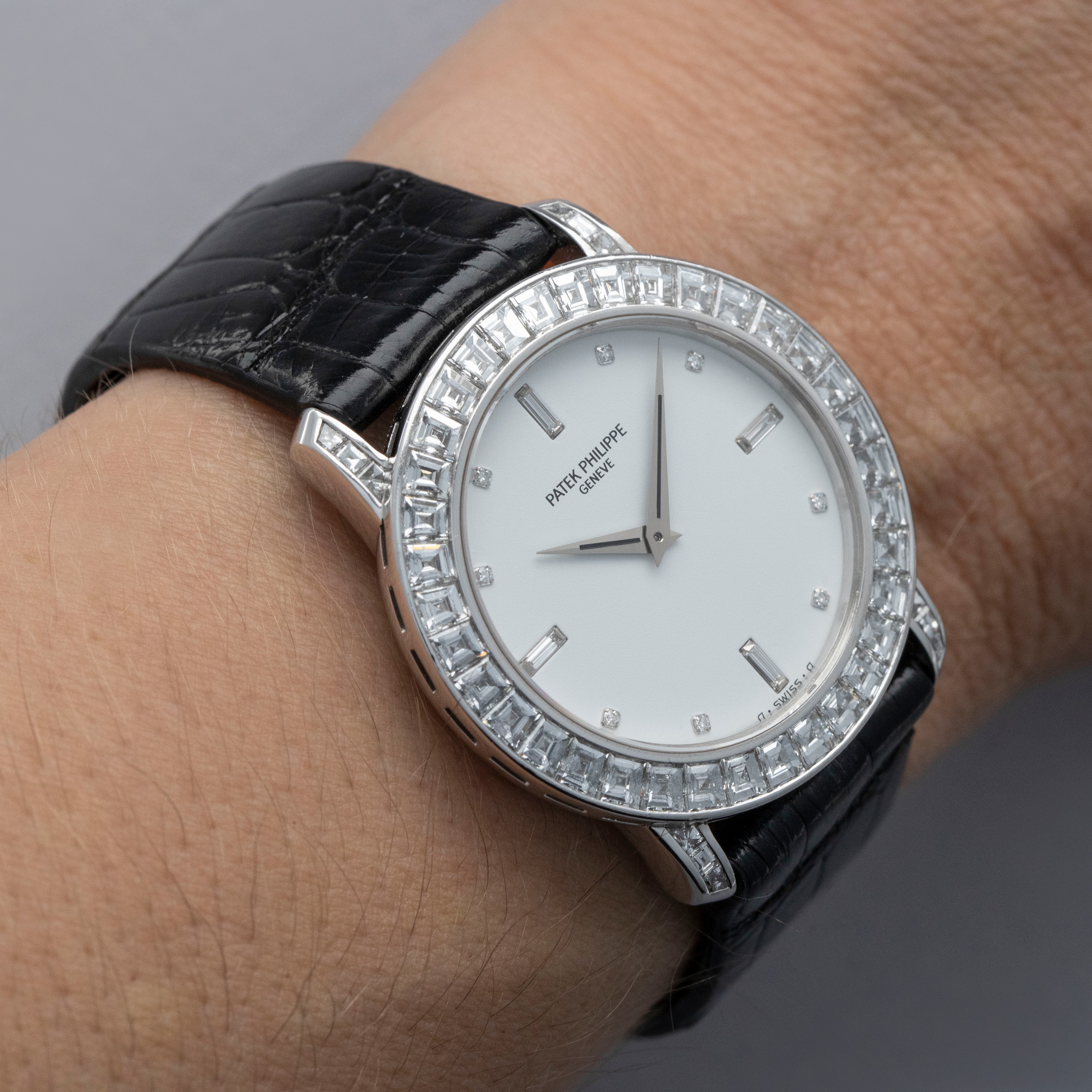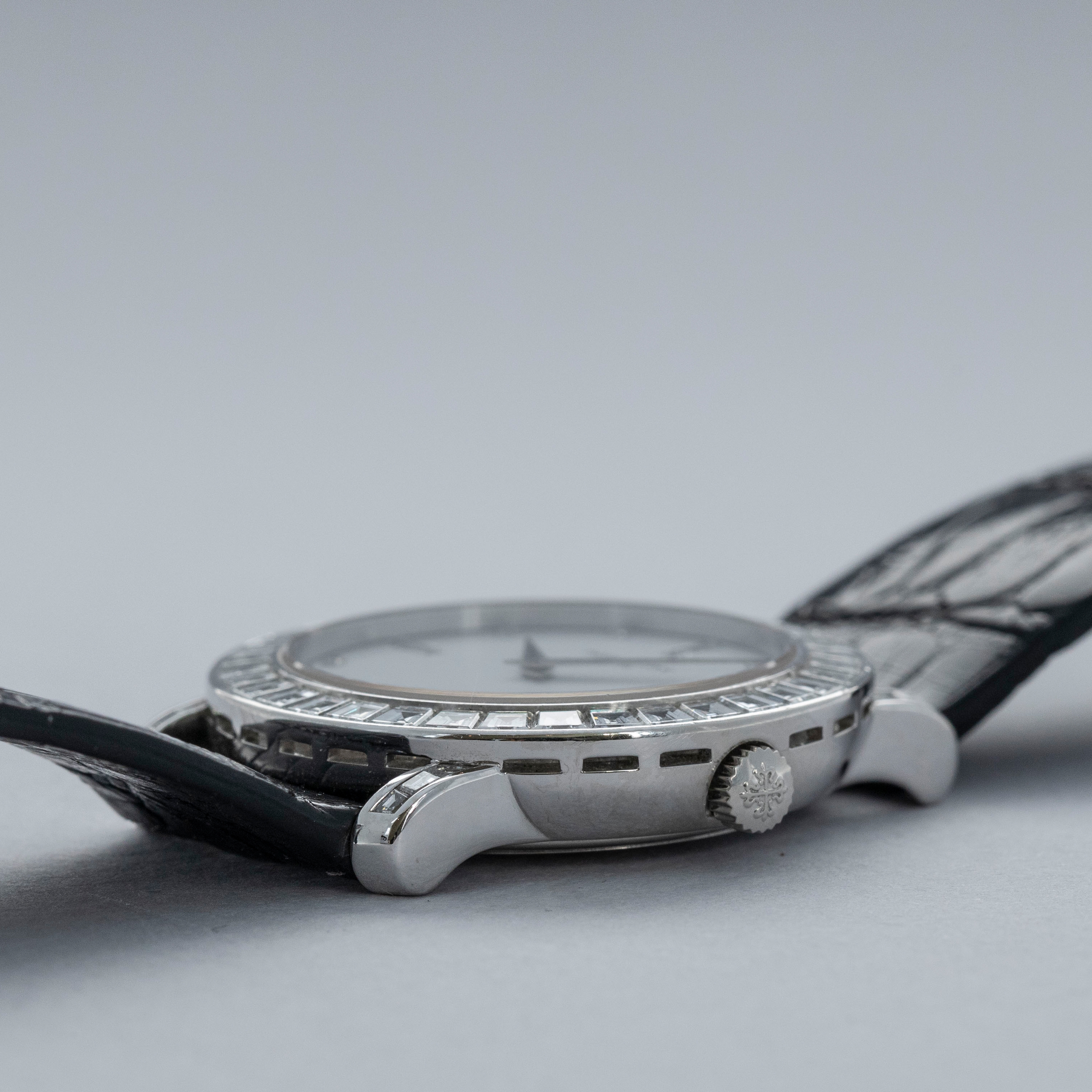 Released in 1932 and named after the cross that the Calatrava Knights paraded around Spain and Portugal during the 12th and 13th centuries, the Patek Philippe Calatrava was released as a simple timepiece with broad appeal that would help secure Patek Philippe's finances following Jean and Charles Henri Stern's investment in the brand in the same year. Designed with a strict Bauhaus-inspired aesthetic in mind, the Calatrava used, and continues to use, simplicity as its means of establishing intrigue around the craftsmanship required to construct such a stunning timepiece. Without a complicated movement or a busy design, collectors gravitate towards the Calatrava's clean aesthetic and practicality, however, every now and again Patek will create a special Calatrava that results from out-of-the-box thinking, which is exactly what we have here, the ref. 5027P. Launched in the mid-1990s, the ref. 5027P was a classically-sized Calatrava variant at 33mm in diameter, but its construction is far from normal. Made of platinum, its entire case is diamond-set with 48 Top Wesselton baguette diamonds weighing a total of 4.01 carats. Fit with a white diamond dial to suit its diamond-set case, this is easily one of the most opulent Calatravas ever made.