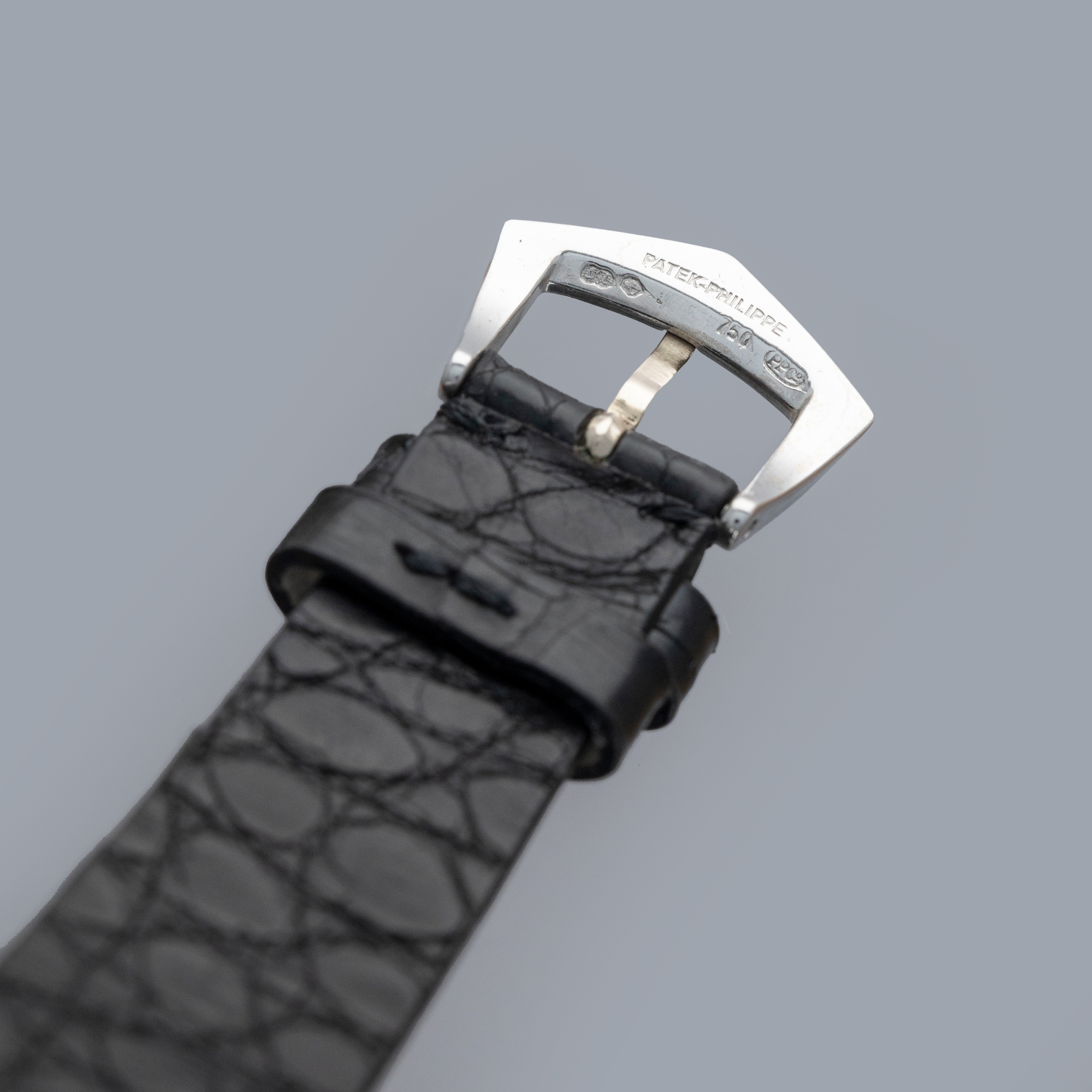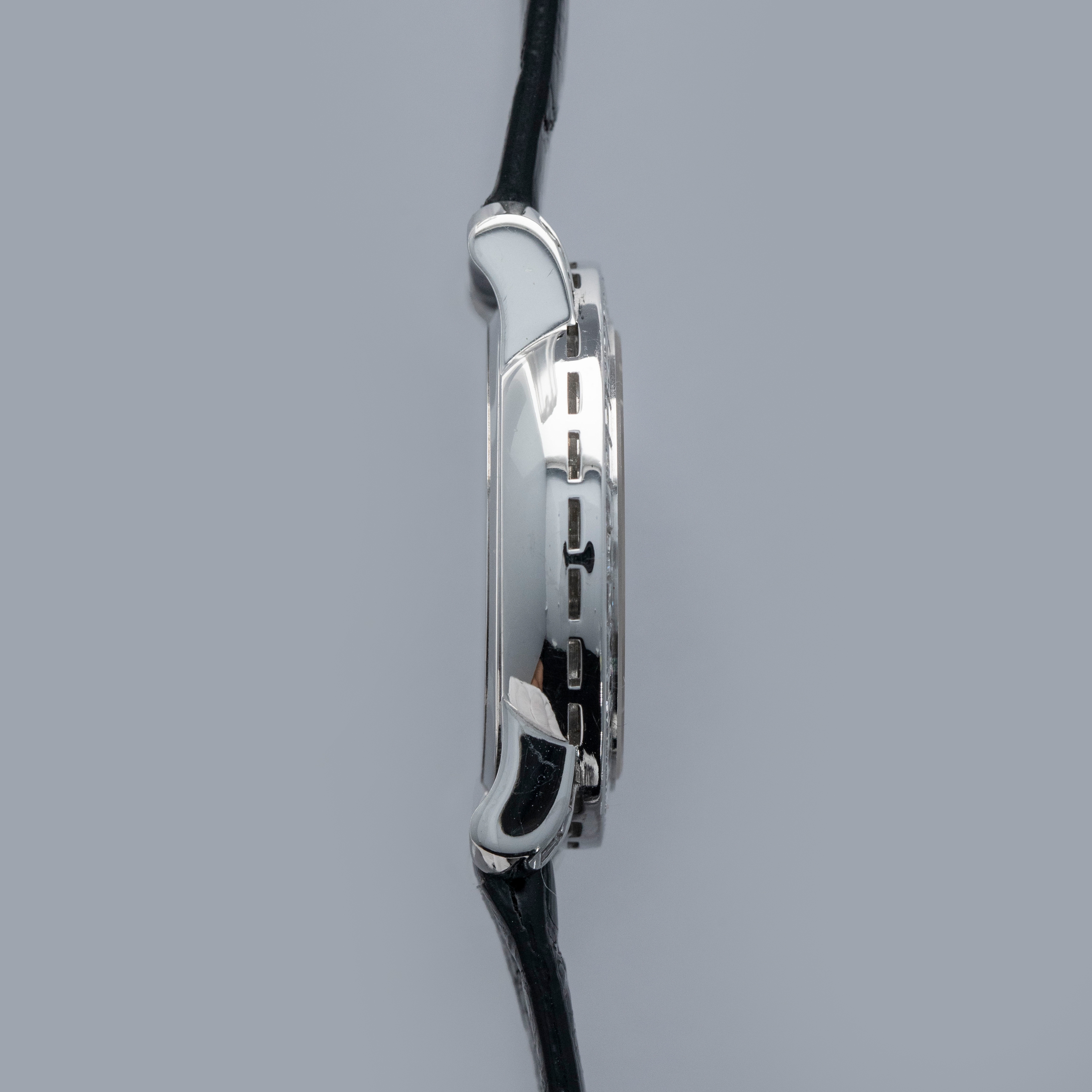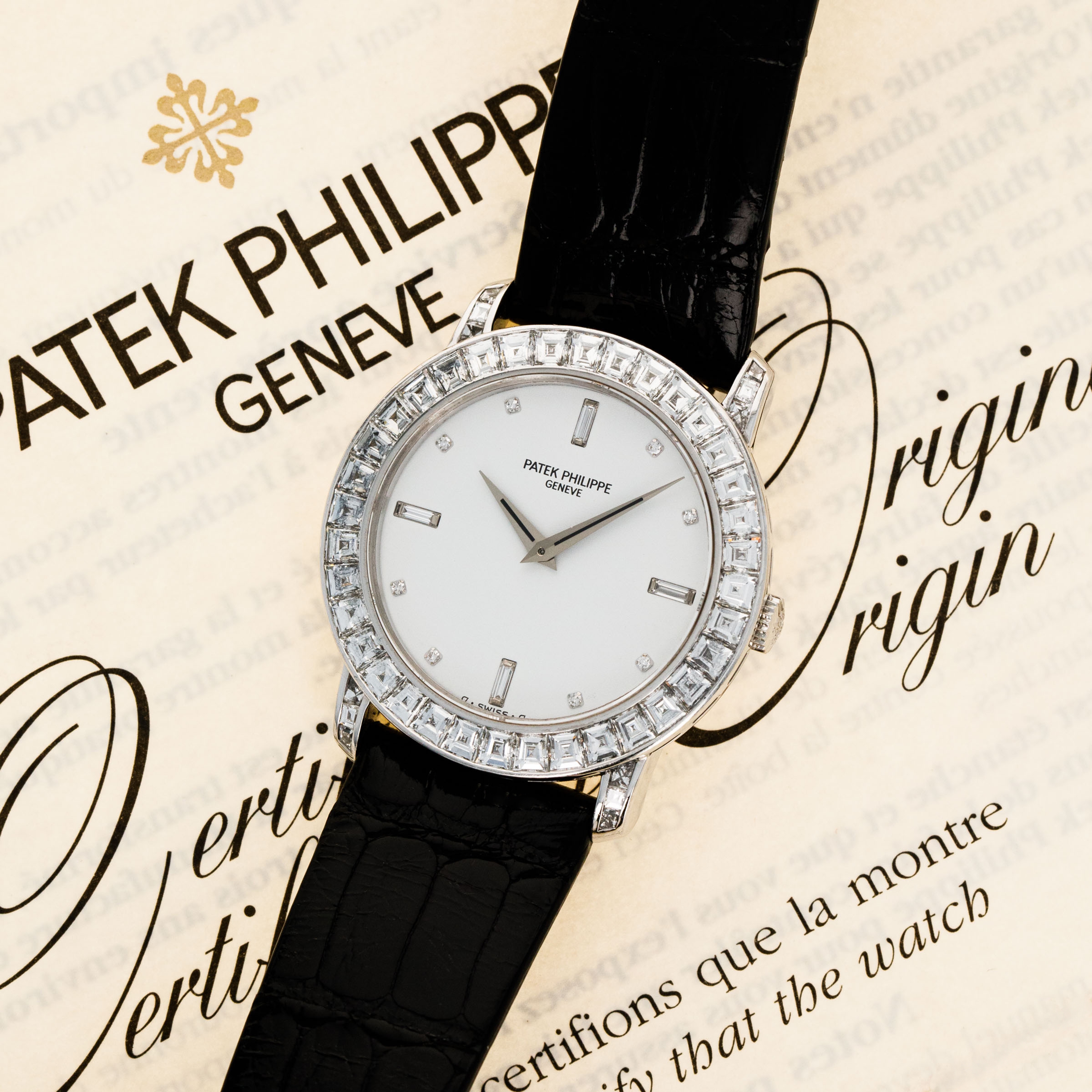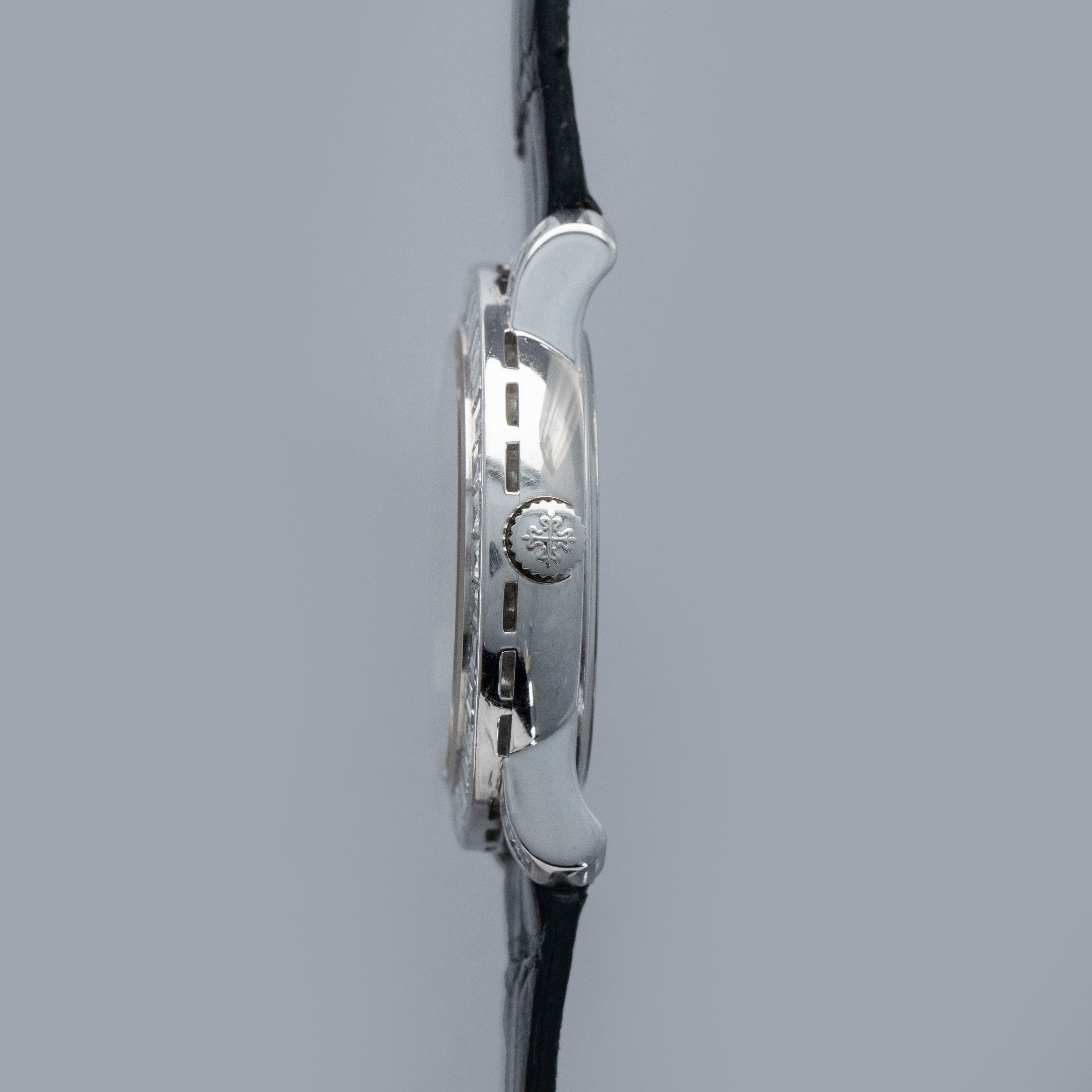 Watch is in overall near-mint condition. The platinum case shows light surface scratches and marks to the polished sections, while the diamond-set bezel and lugs display some light marks where the metal is exposed; all diamonds remain well set and in near-mint condition. The hallmarks on the case back remain crisp and well defined. The sigma dial and hands remain near mint. It is fitted with a black crocodile strap and a Patek pin buckle showing some light surface scratches. Comes complete with certificate of origin, booklets, document holder, and Collectibility box.