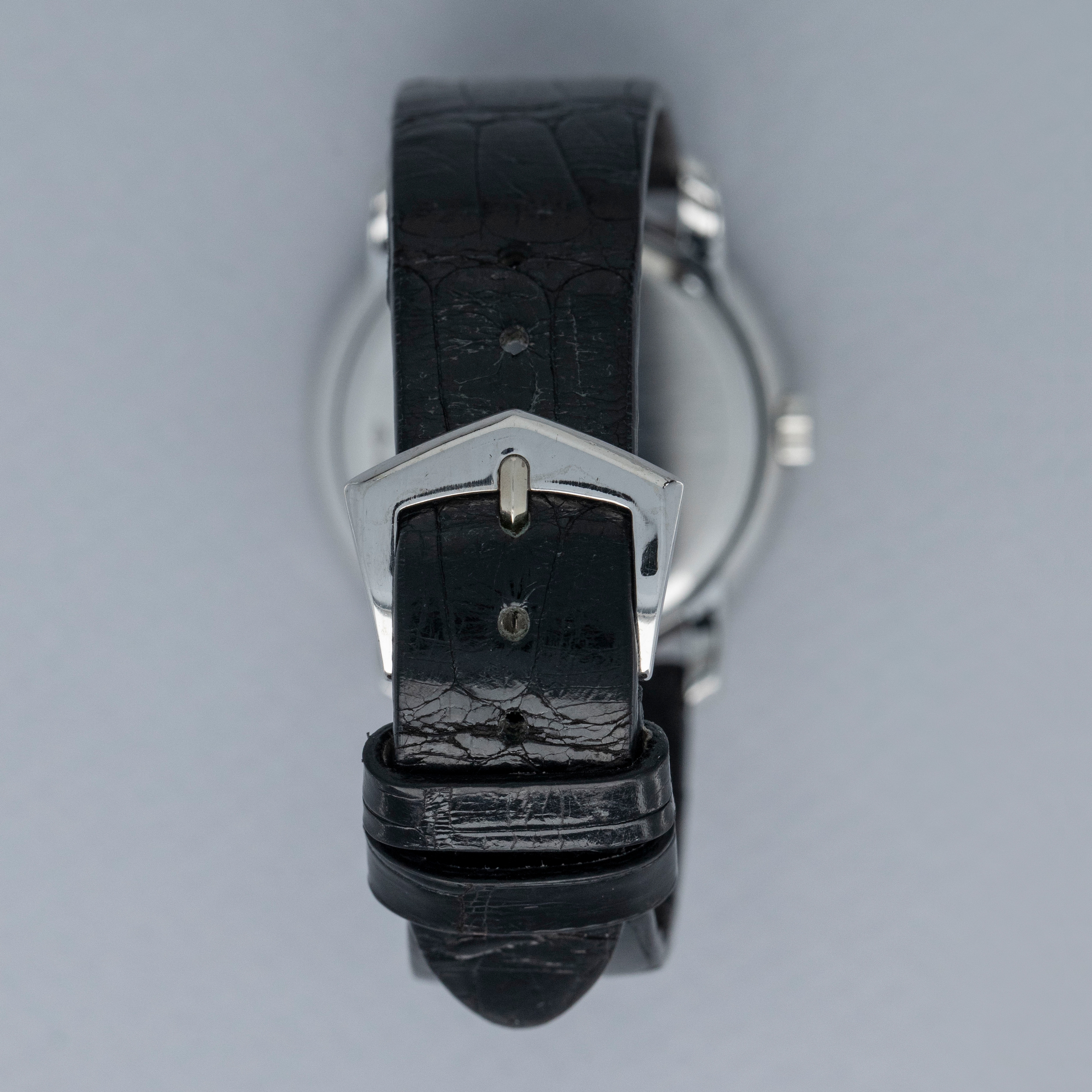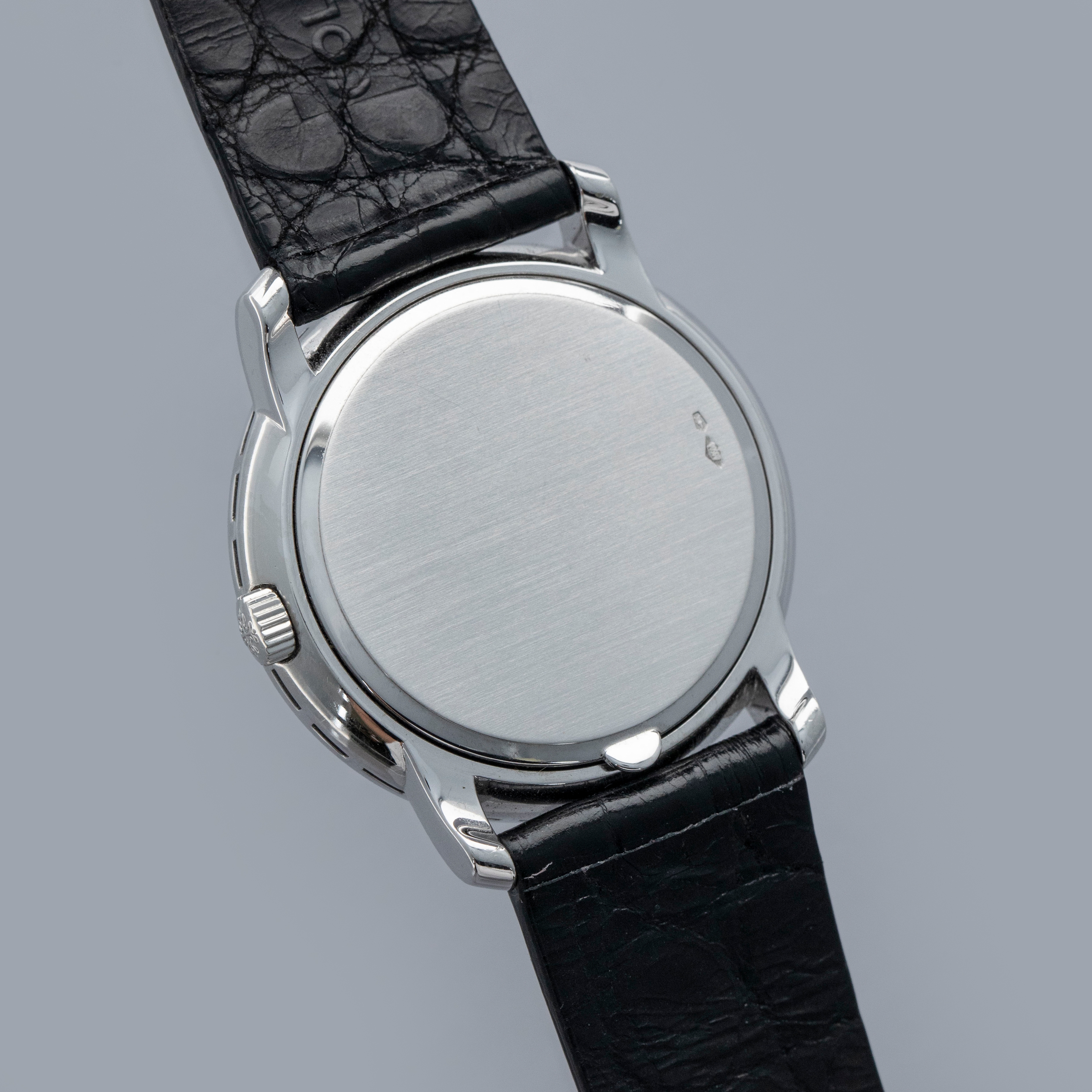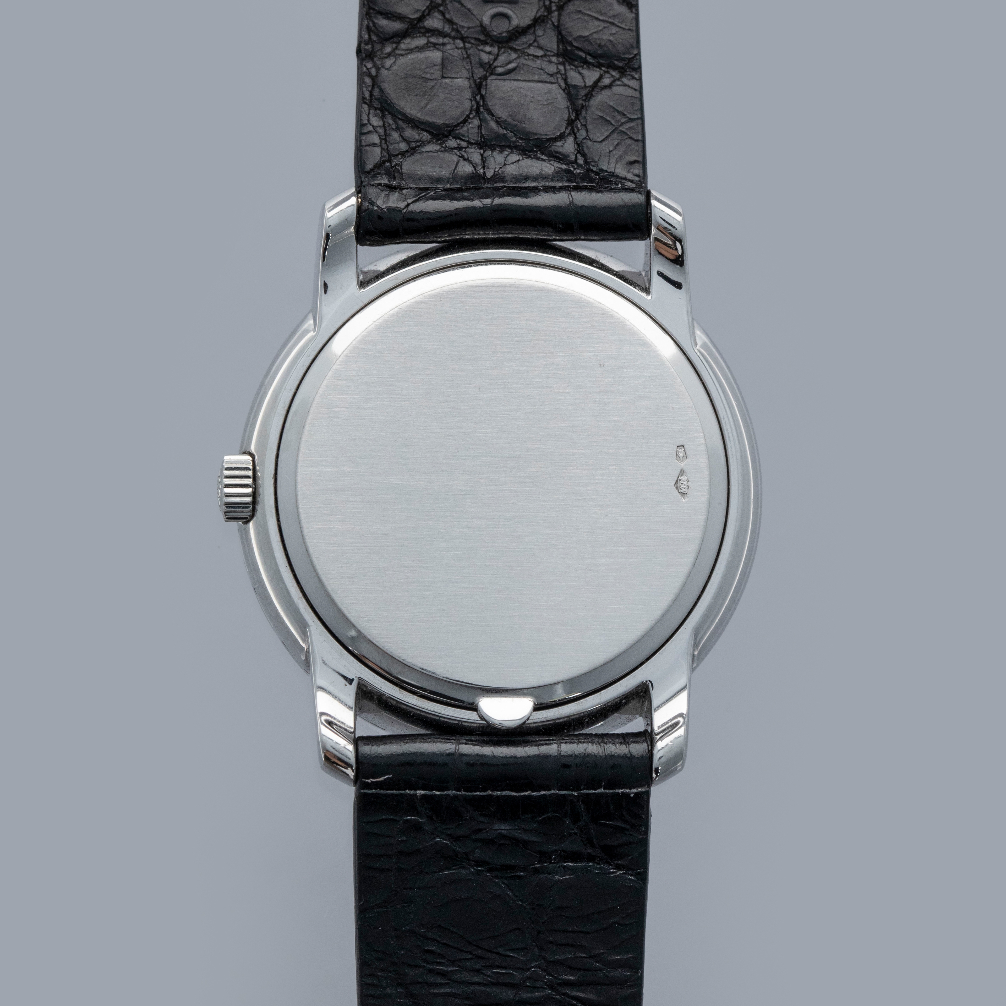 Watch is in overall near-mint condition. The platinum case shows light surface scratches and marks to the polished sections, while the diamond-set bezel and lugs display some light marks where the metal is exposed; all diamonds remain well set and in near-mint condition. The hallmarks on the case back remain crisp and well defined. The sigma dial and hands remain near mint. It is fitted with a black crocodile strap and a Patek pin buckle showing some light surface scratches. Comes complete with certificate of origin, booklets, document holder, and Collectibility box.