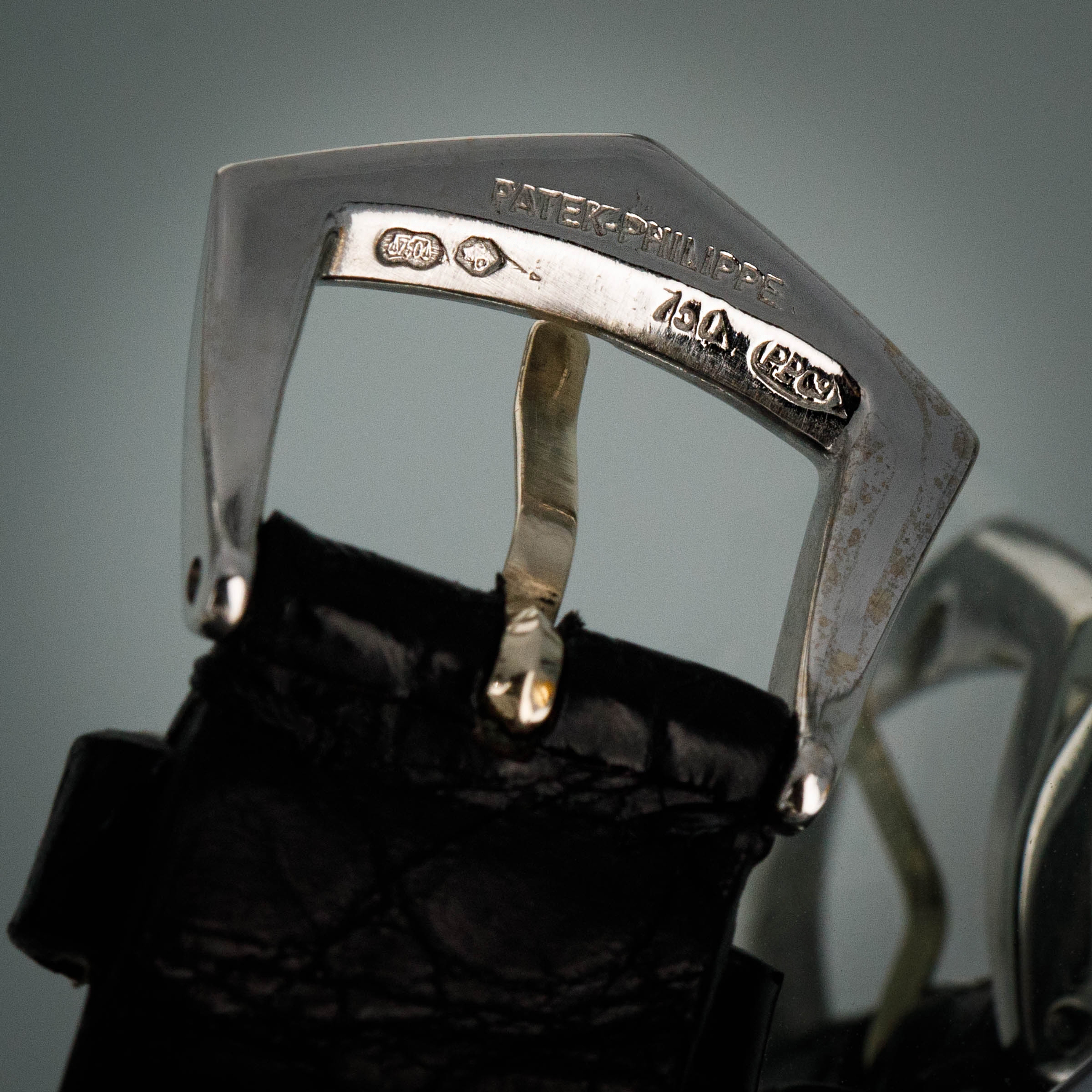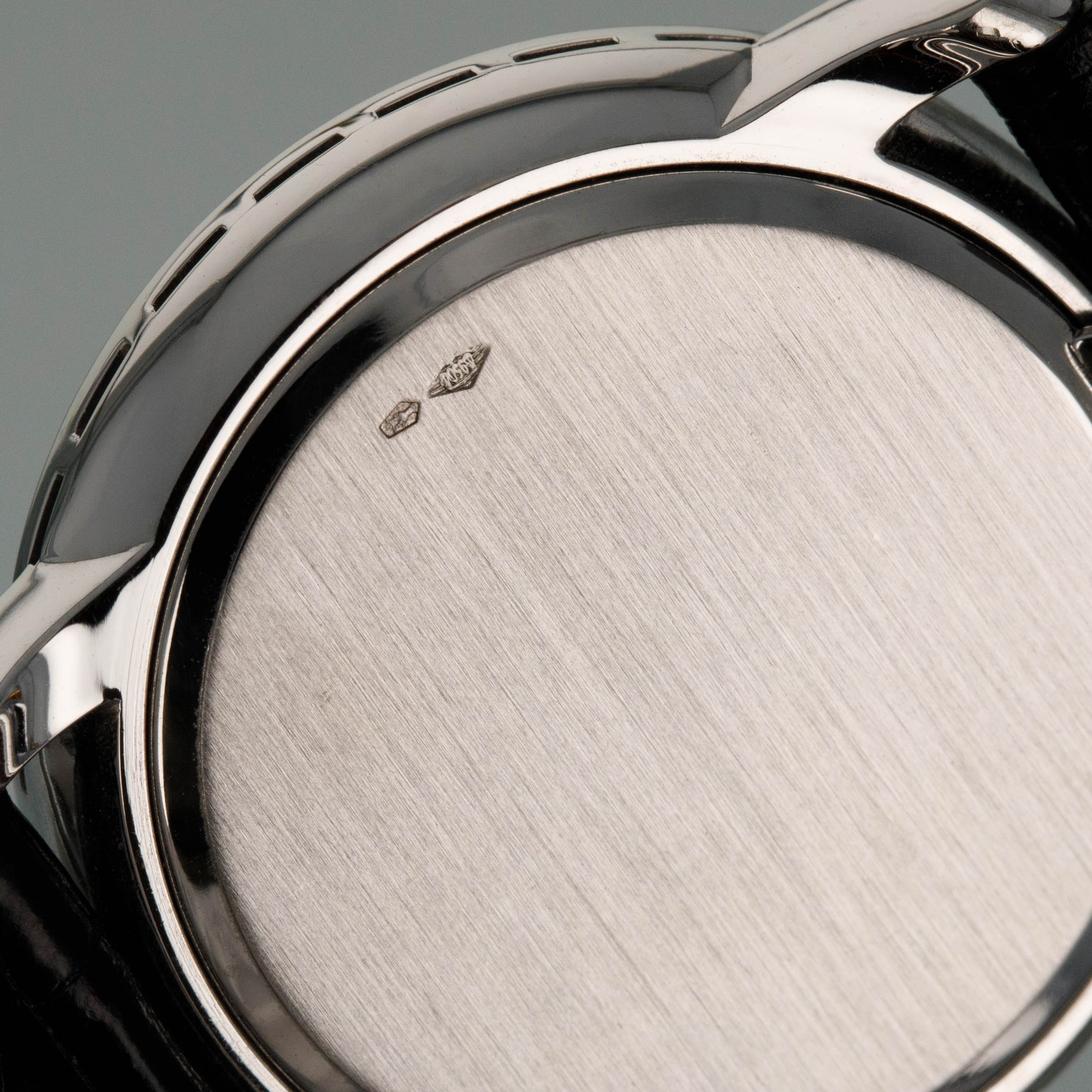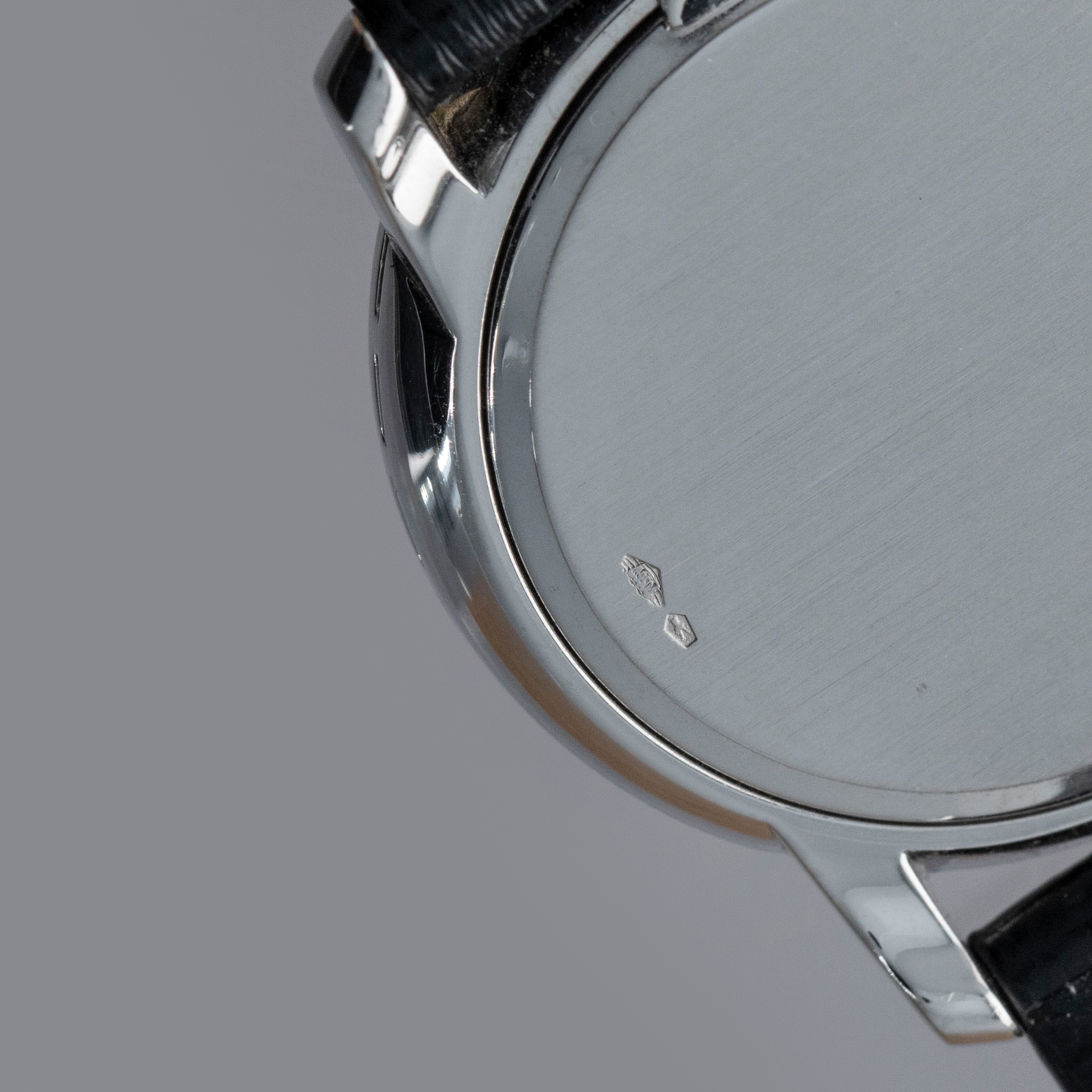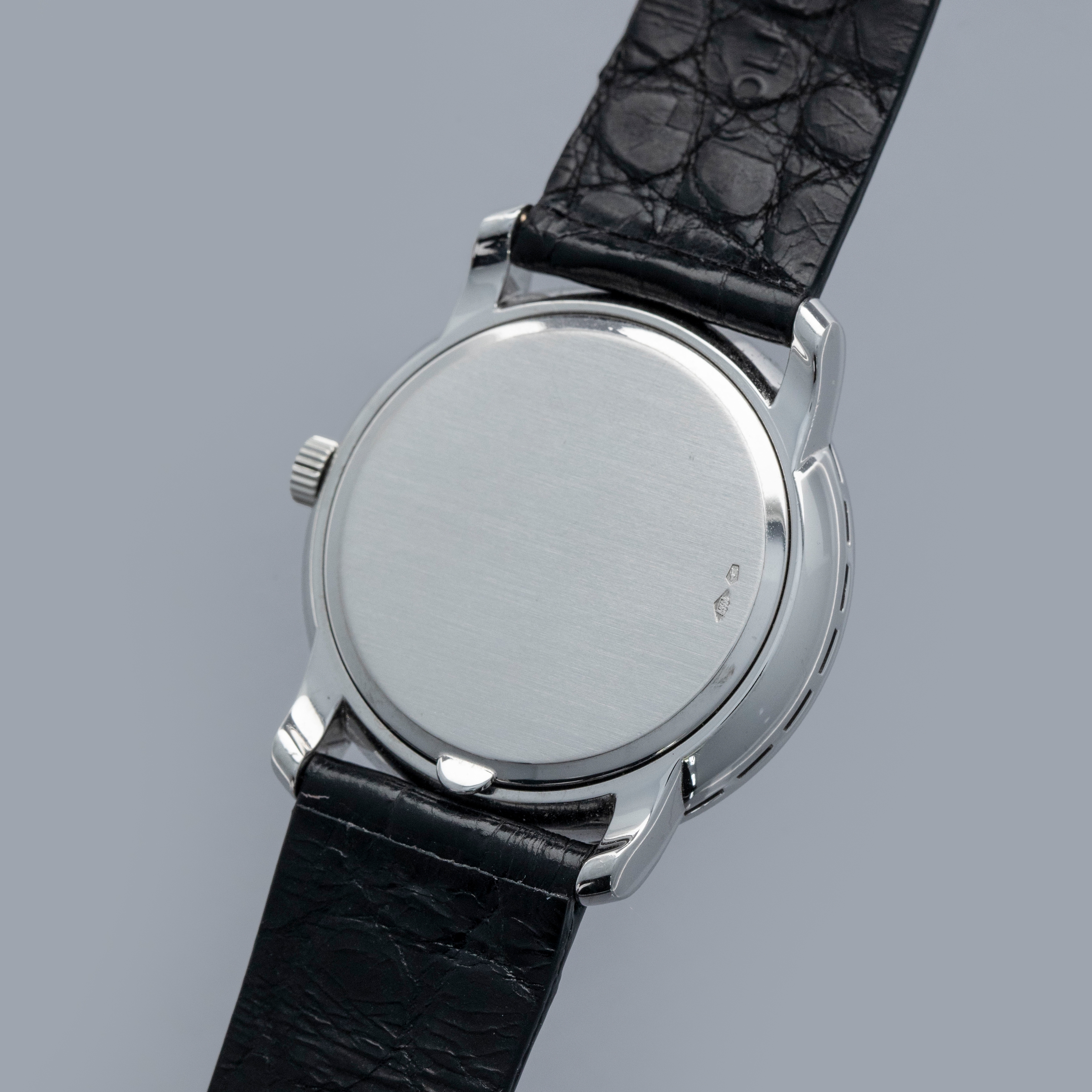 Watch is in overall near-mint condition. The platinum case shows light surface scratches and marks to the polished sections, while the diamond-set bezel and lugs display some light marks where the metal is exposed; all diamonds remain well set and in near-mint condition. The hallmarks on the case back remain crisp and well defined. The sigma dial and hands remain near mint. It is fitted with a black crocodile strap and a Patek pin buckle showing some light surface scratches. Comes complete with certificate of origin, booklets, document holder, and Collectibility box.