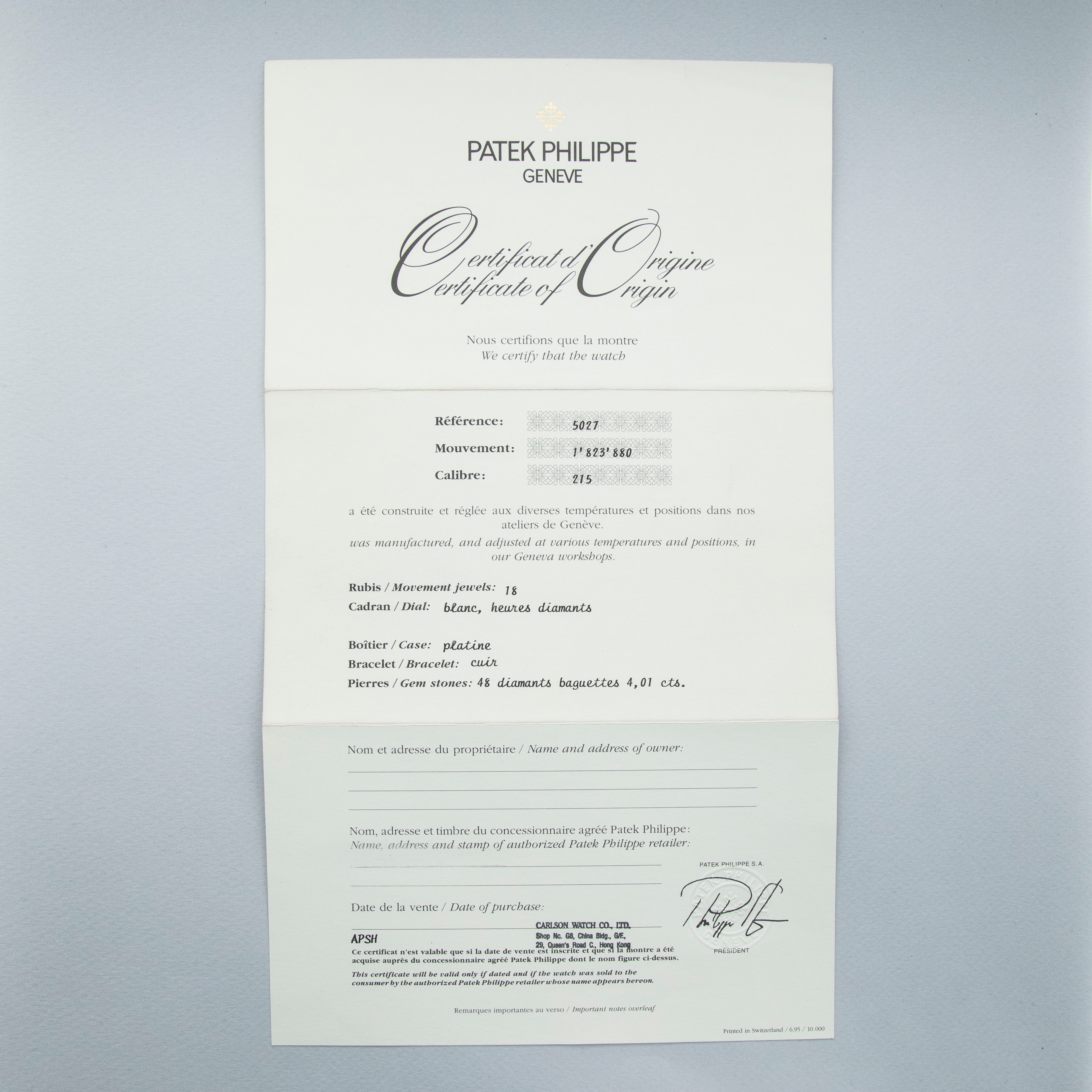 Patek Philippe Calatrava 5027P Baguette Bezel Diamond Dial Platinum with Gurantee Certificate