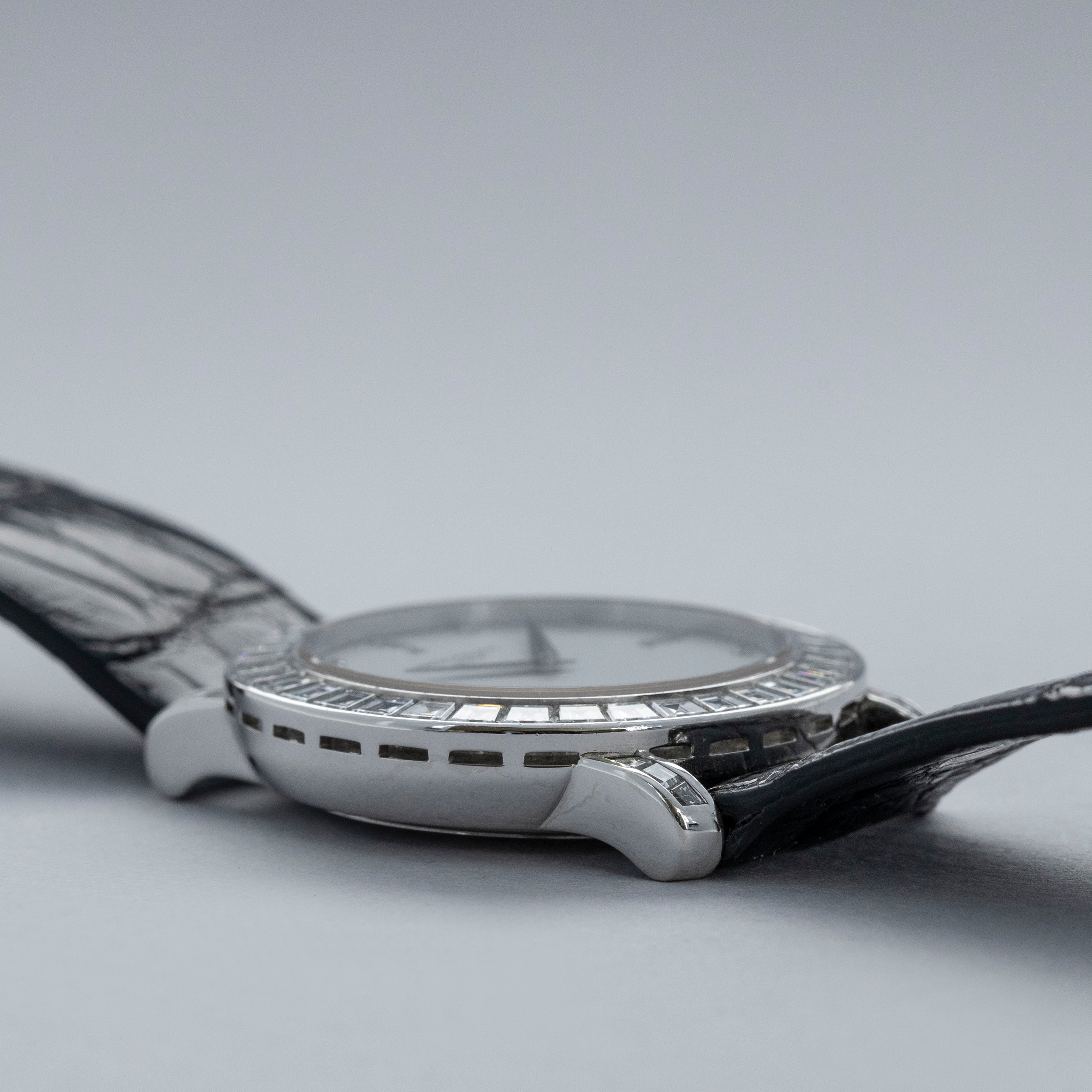 Featuring a bright white dial with sharp dauphine hands, the ref. 5027P's display is matched with its opulent case through its diamond-set hour markers, with large baguettes used for the quarter hours and small brilliant-cut stones used for the other 8 hours.
