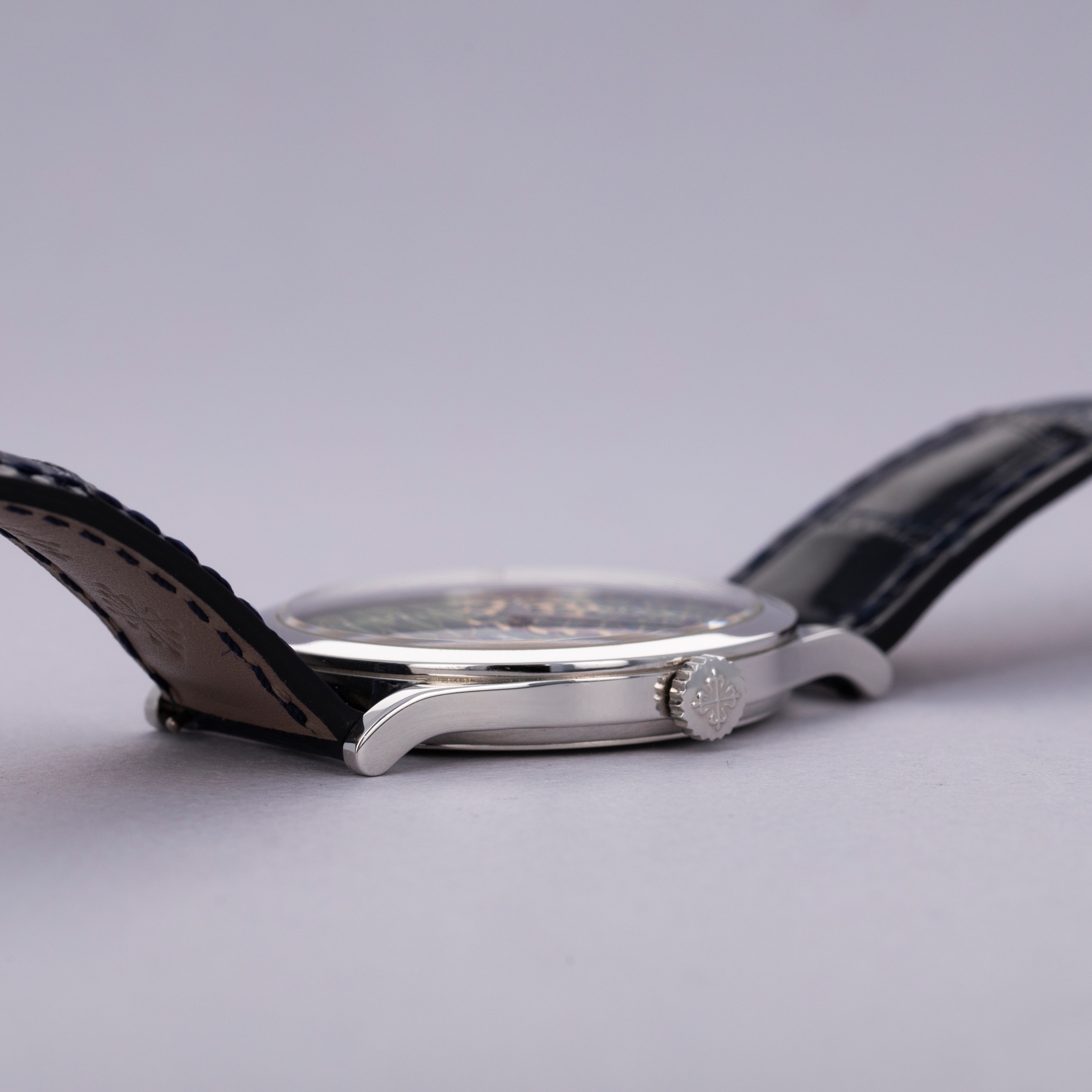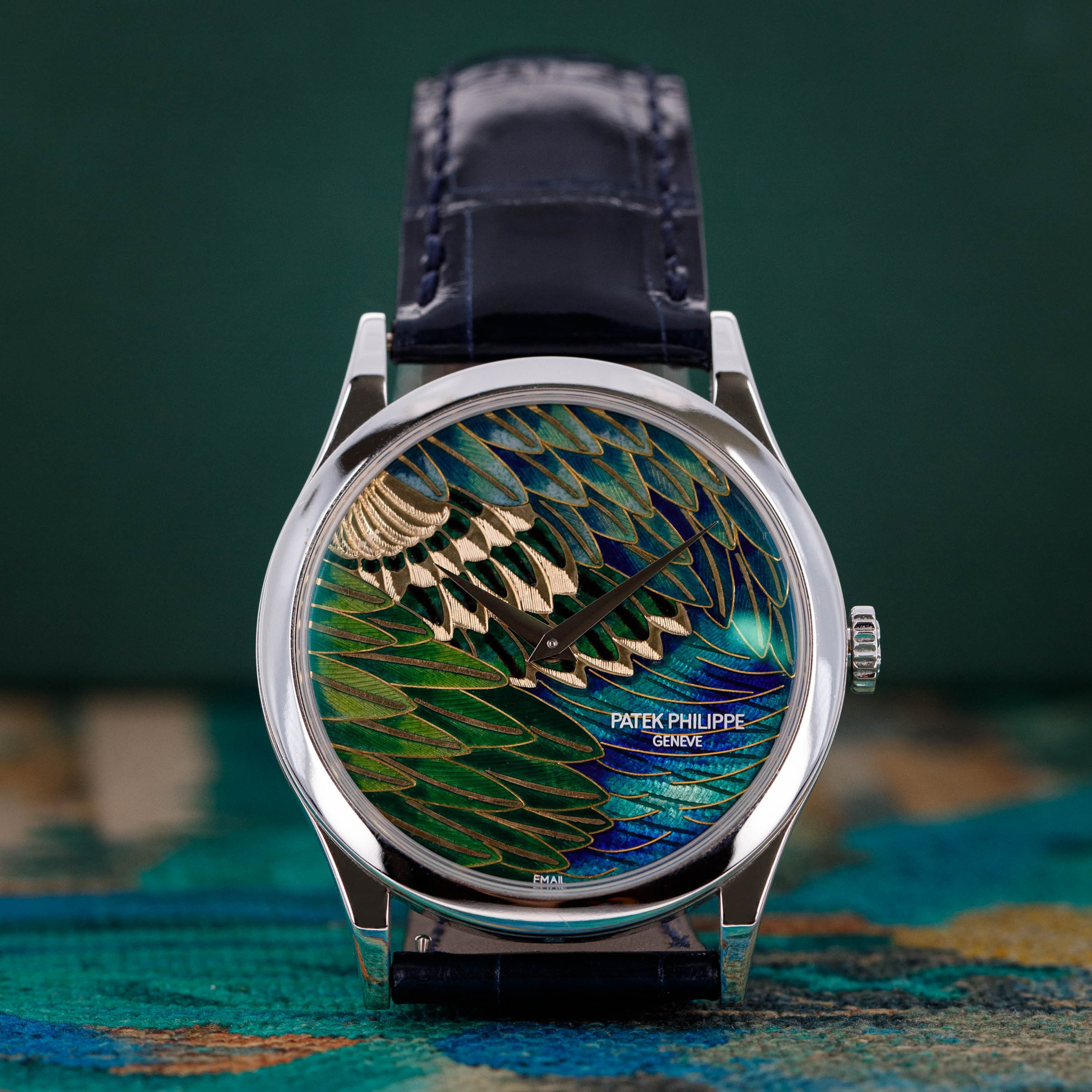 Released in 1932 and named after the cross that the Calatrava Knights paraded around Spain and Portugal during the 12th and 13th centuries, the Patek Philippe Calatrava was released as a simple timepiece with broad appeal that would help secure Patek Philippe's finances following Jean and Charles Henri Stern's investment in the brand in the same year. Designed with a strict Bauhaus-inspired aesthetic in mind, the Calatrava used, and continues to use, simplicity as its means of establishing intrigue around the craftsmanship required to construct such a stunning timepiece. However, not all members of the Calatrava family are born equal, and members of the Rare Handcrafts collection are a testament to that fact, with the ref. 5077P that we have here the perfect example of that. Boasting a completely polished 38mm case and automatic cal. 240 movement, this example’s piece de resistance is its incredible cloisonne enamel dial that has been meticulously created by an artisan to resemble the feathers of a pheasant with hues of blue, green, black and gold combining to create a stunning image that celebrates the wonderful talents that Patek Philippe’s artisans command over their art. Created using thin gold wires to create the image on a gold dial plate before the partitions ("cloisons" in French) are filled with colored enamel powder and then fired in a furnace at around 1000 degrees Celsius to melt the powder and create a glassy image that is then polished, the ref. 5077P-089’s dial is an example in the lengths watchmakers will go to create a piece of art.