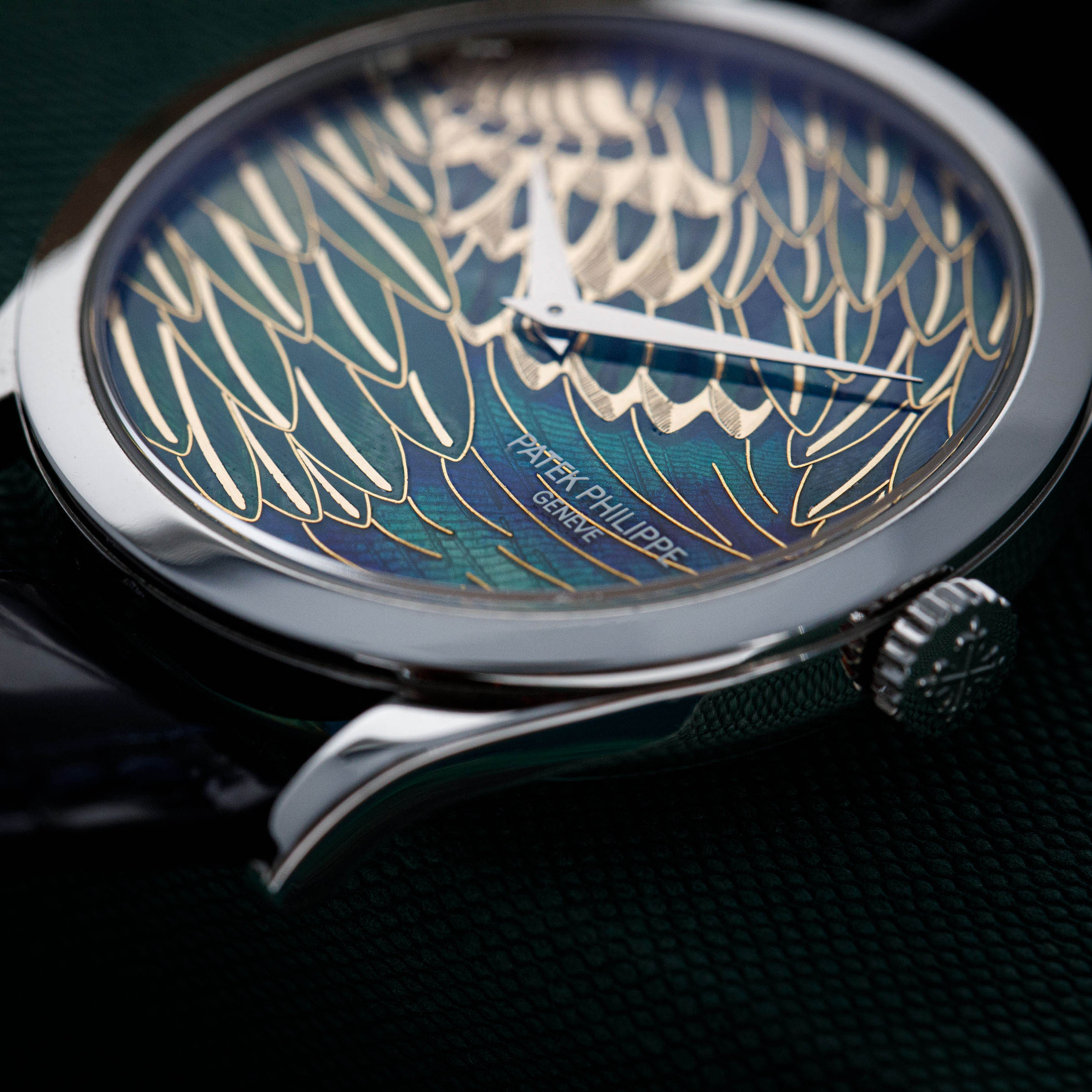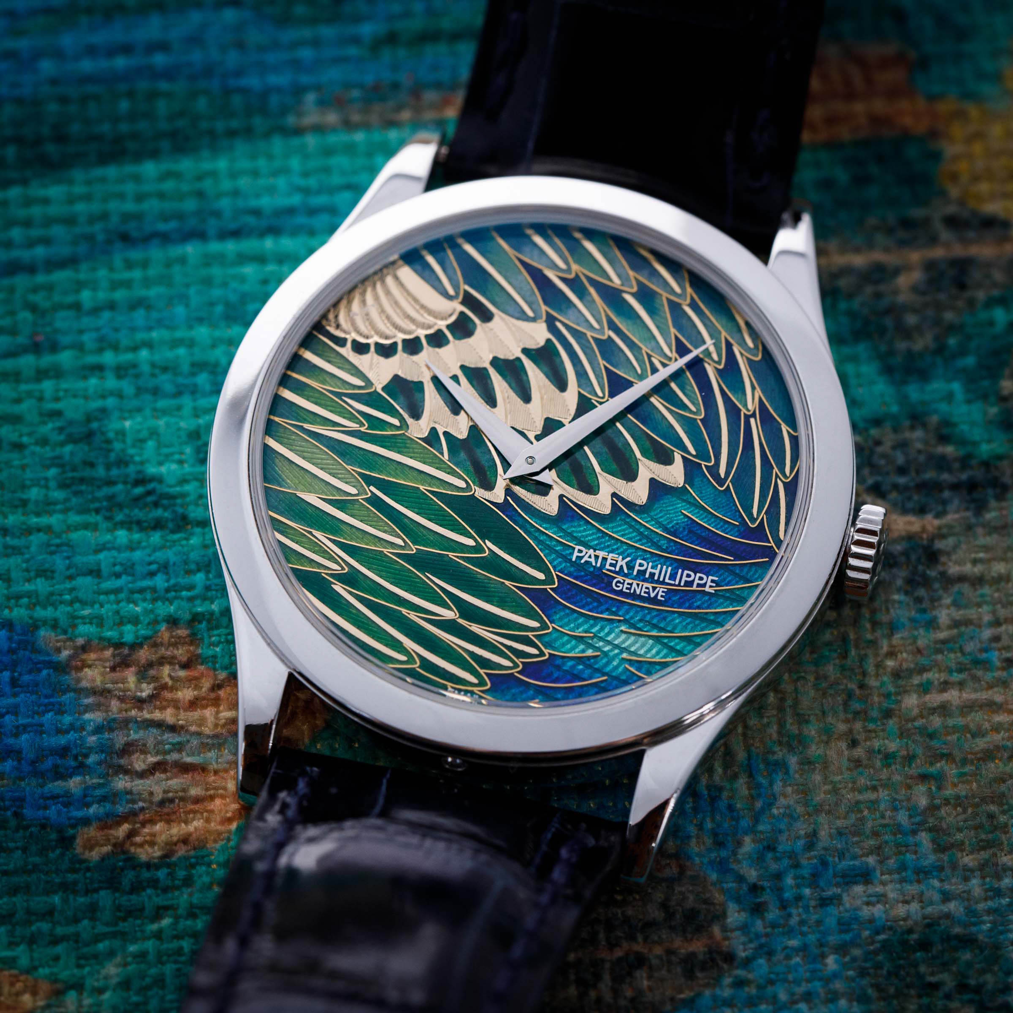 Made from cloisonne enamel, the ref. 5077P's dial resembles a pheasant feathers with its hues of green, blue, gold, and black combining to create a truly spectacular marvel of horological craftsmanship.