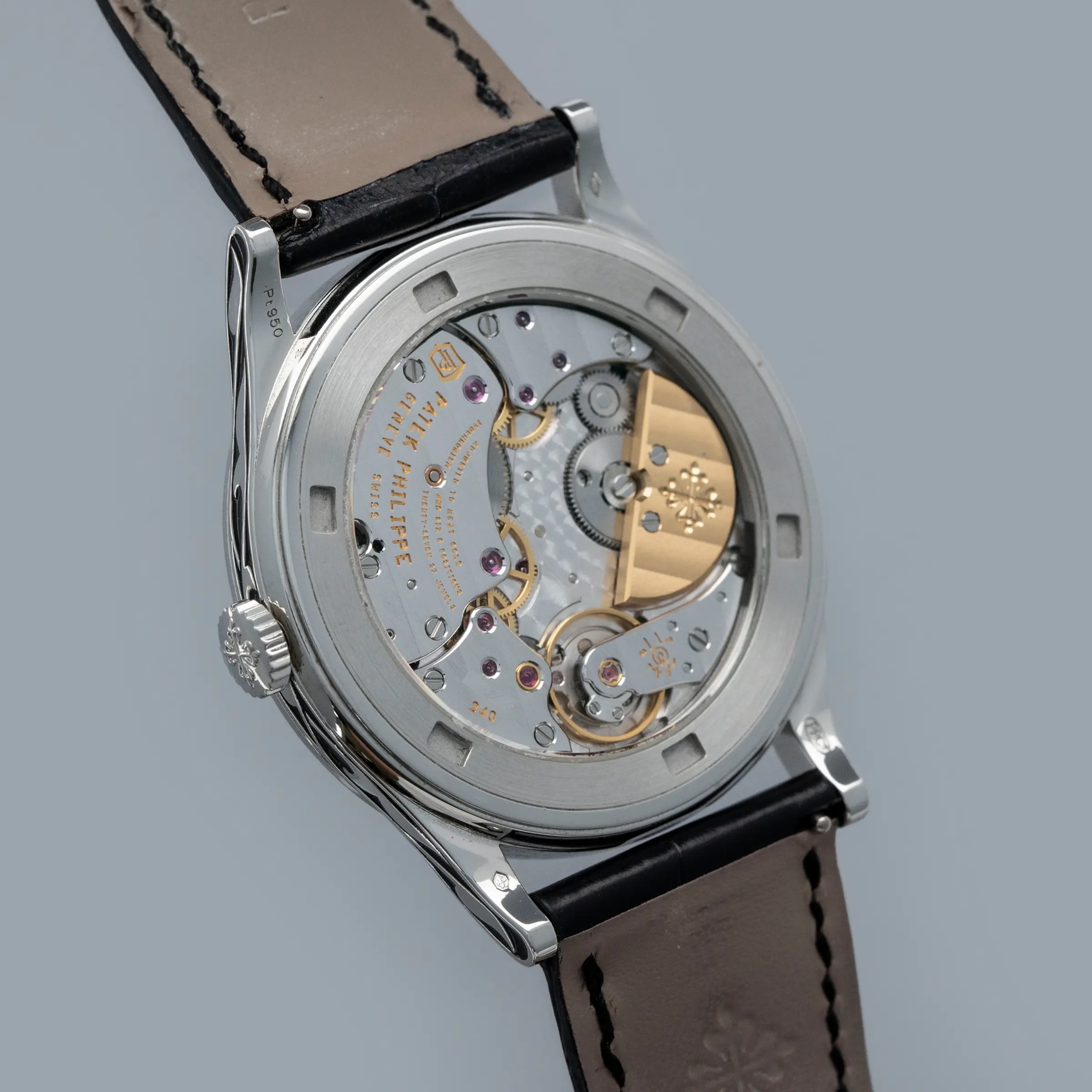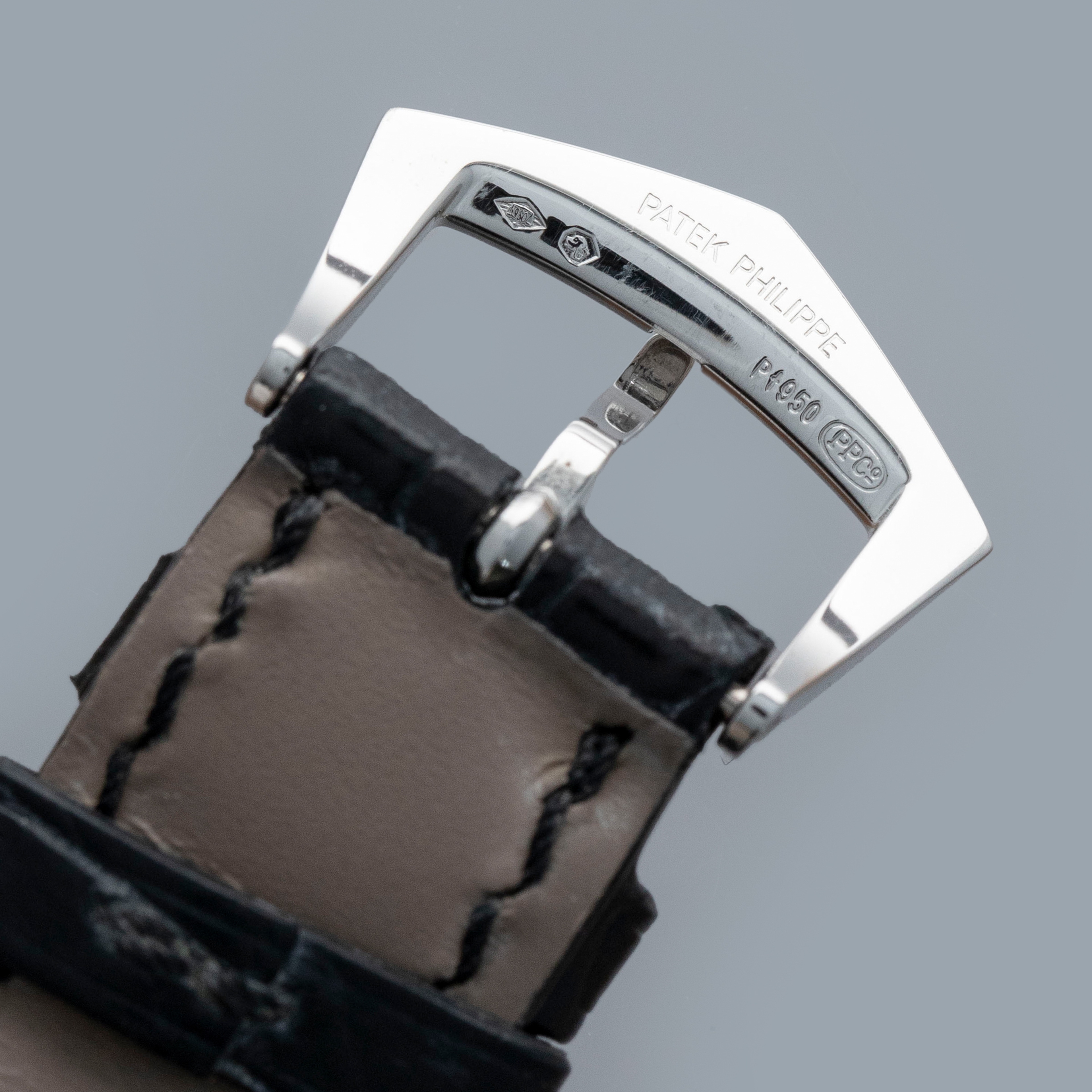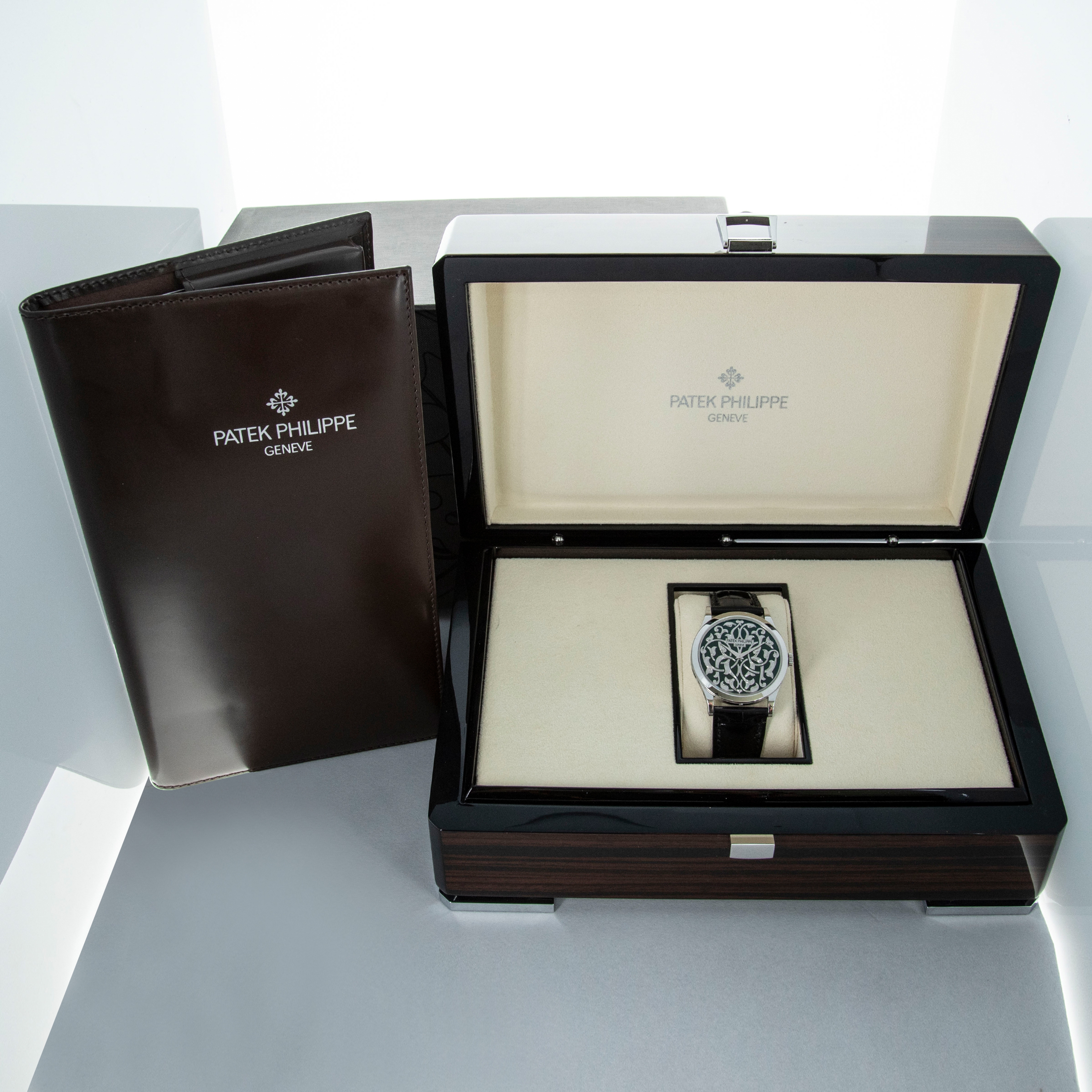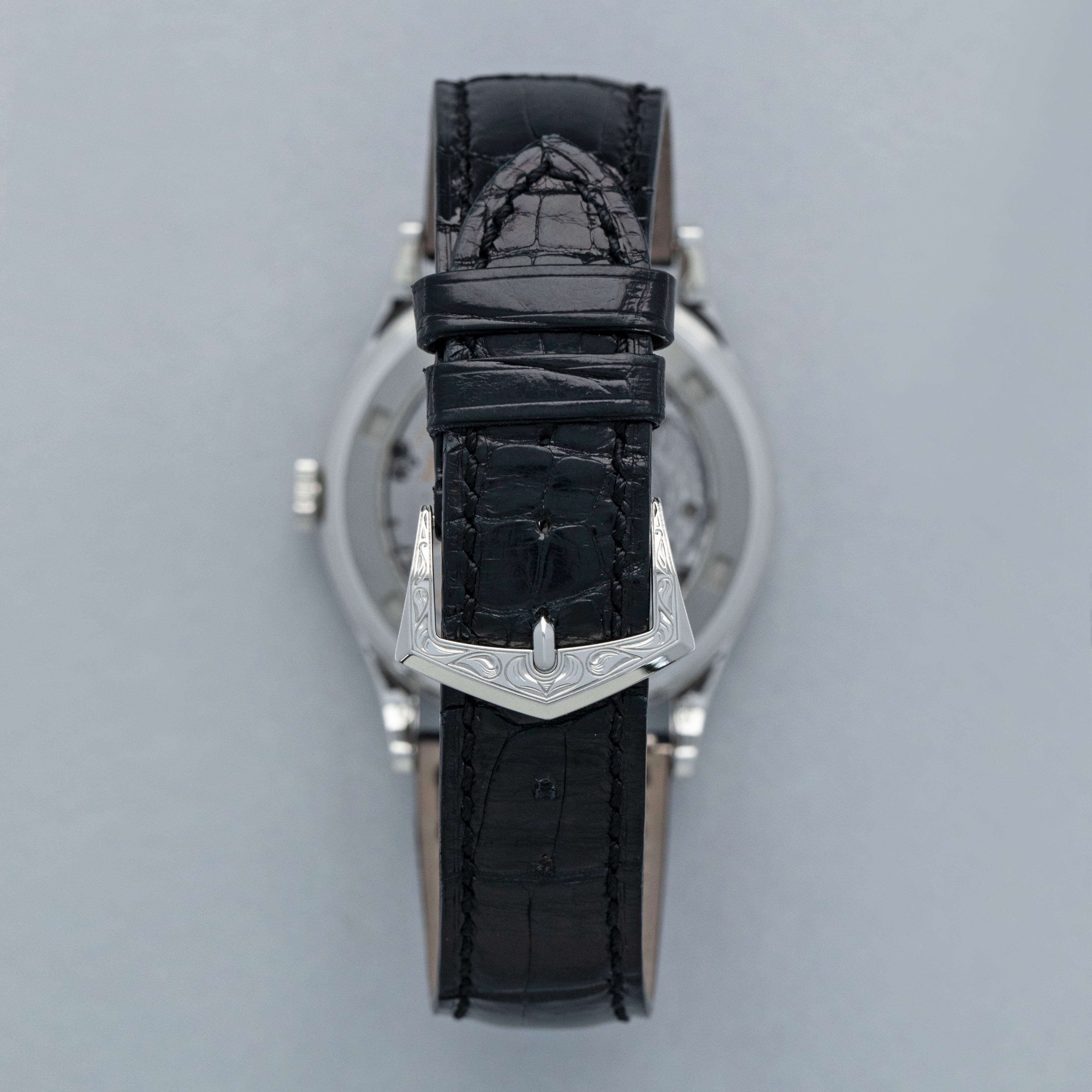 The watch is in near-mint condition. The engraved platinum case shows some light marks from wear, with all hallmarks and stamps on the backs of the lugs fully legible. The dial is like new. It is fitted with a black Patek Philippe alligator strap and an engraved platinum pin buckle, both in near-mint condition. The watch is accompanied by its inner and outer boxes, Certificate of Origin, booklets, and leather wallet.