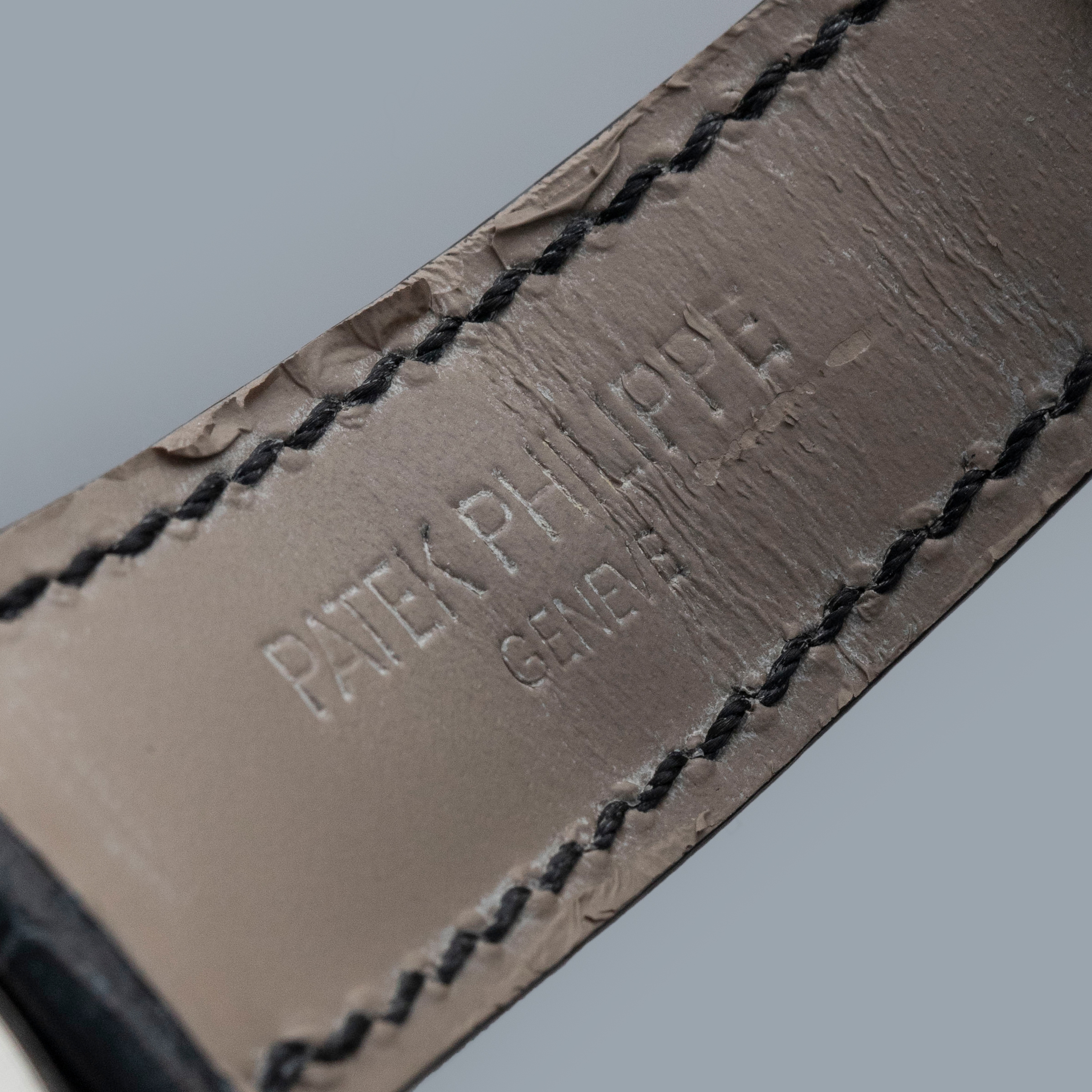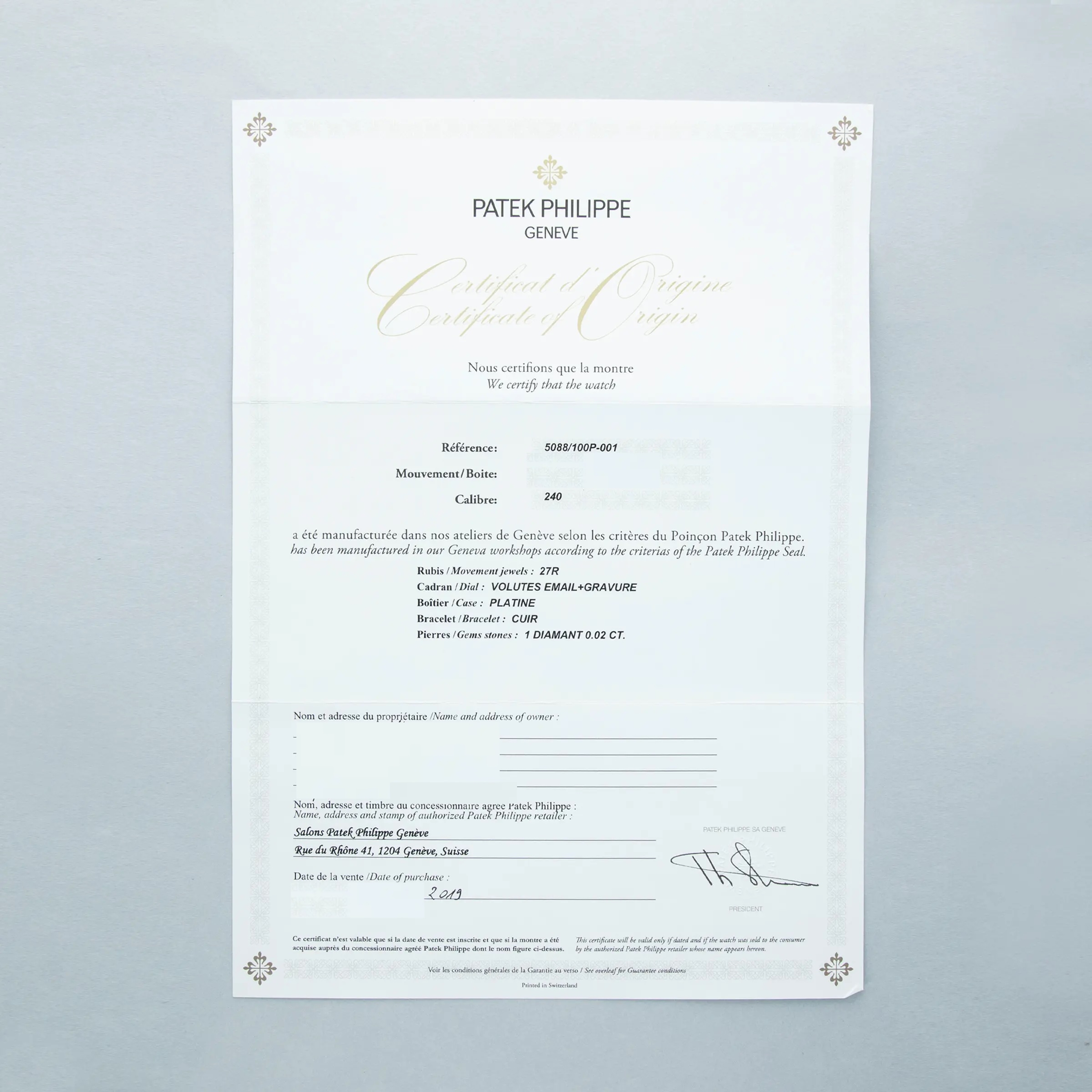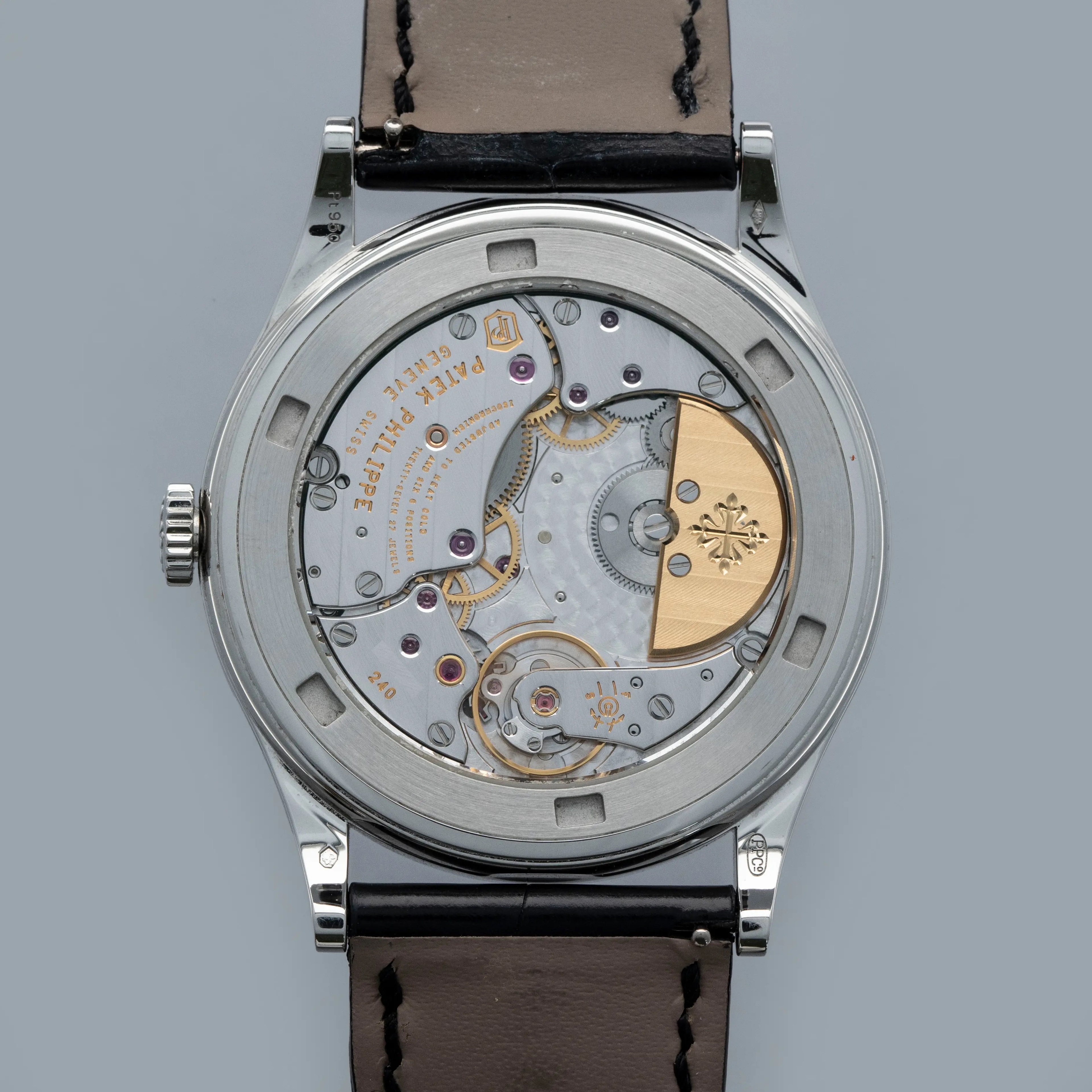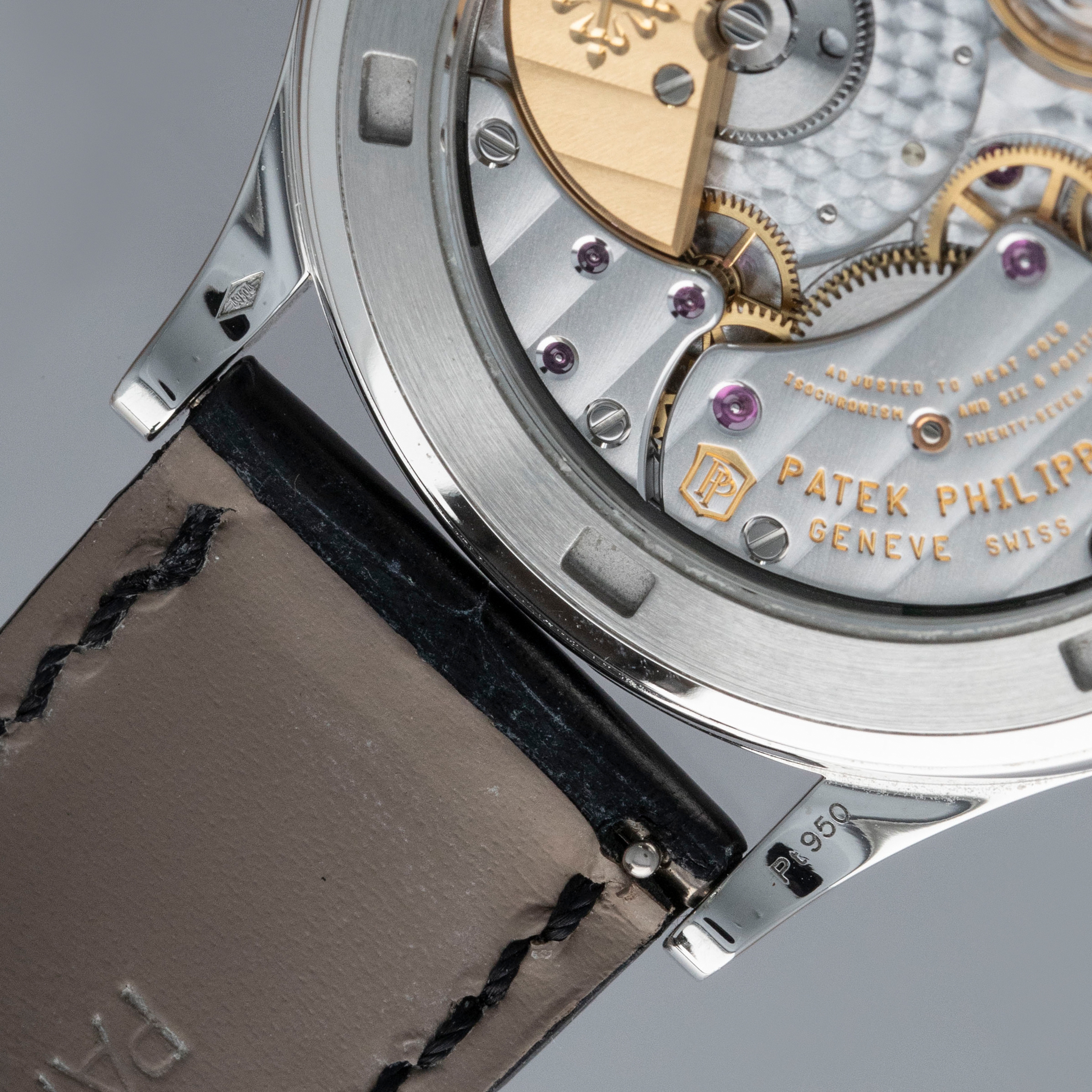 The watch is in near-mint condition. The engraved platinum case shows some light marks from wear, with all hallmarks and stamps on the backs of the lugs fully legible. The dial is like new. It is fitted with a black Patek Philippe alligator strap and an engraved platinum pin buckle, both in near-mint condition. The watch is accompanied by its inner and outer boxes, Certificate of Origin, booklets, and leather wallet.