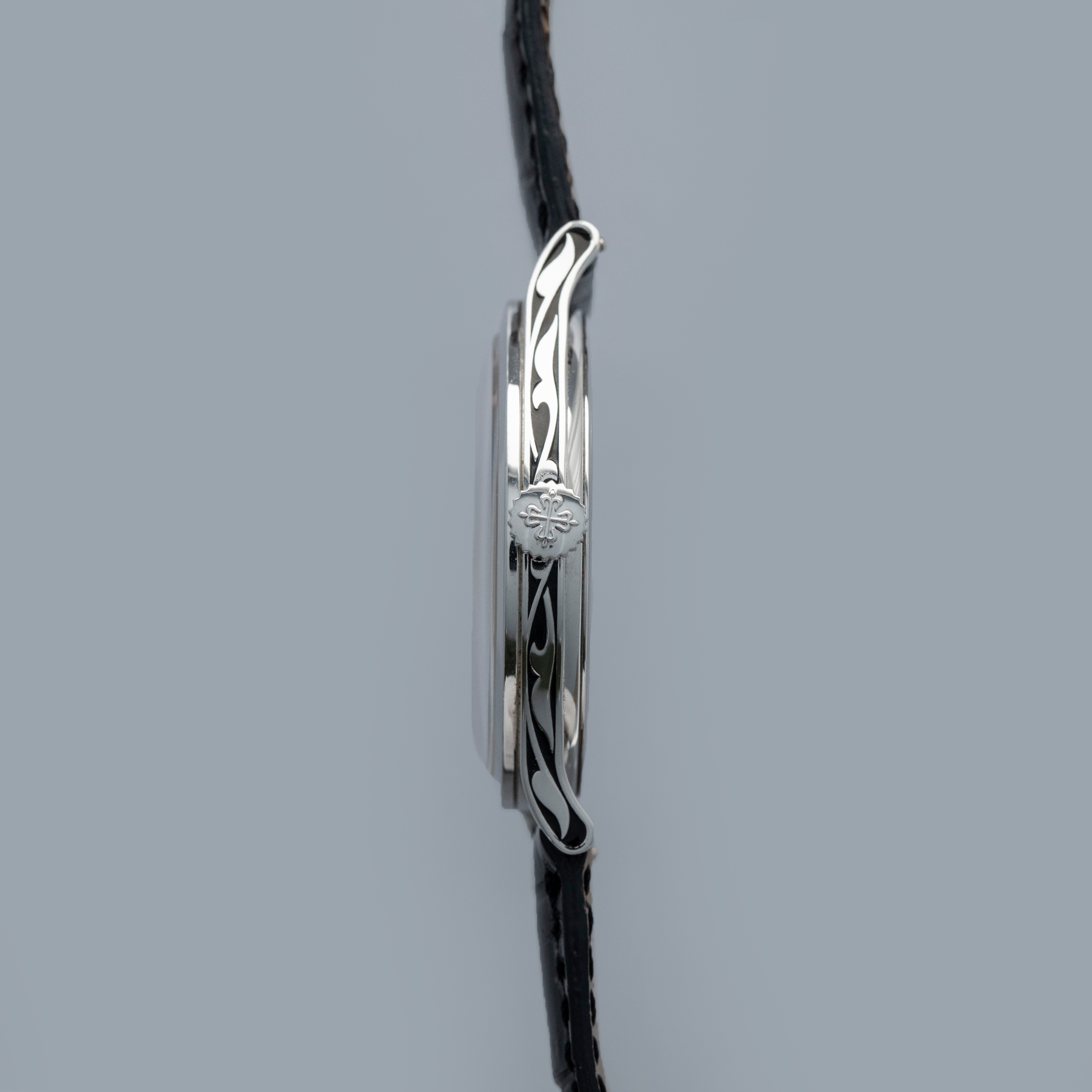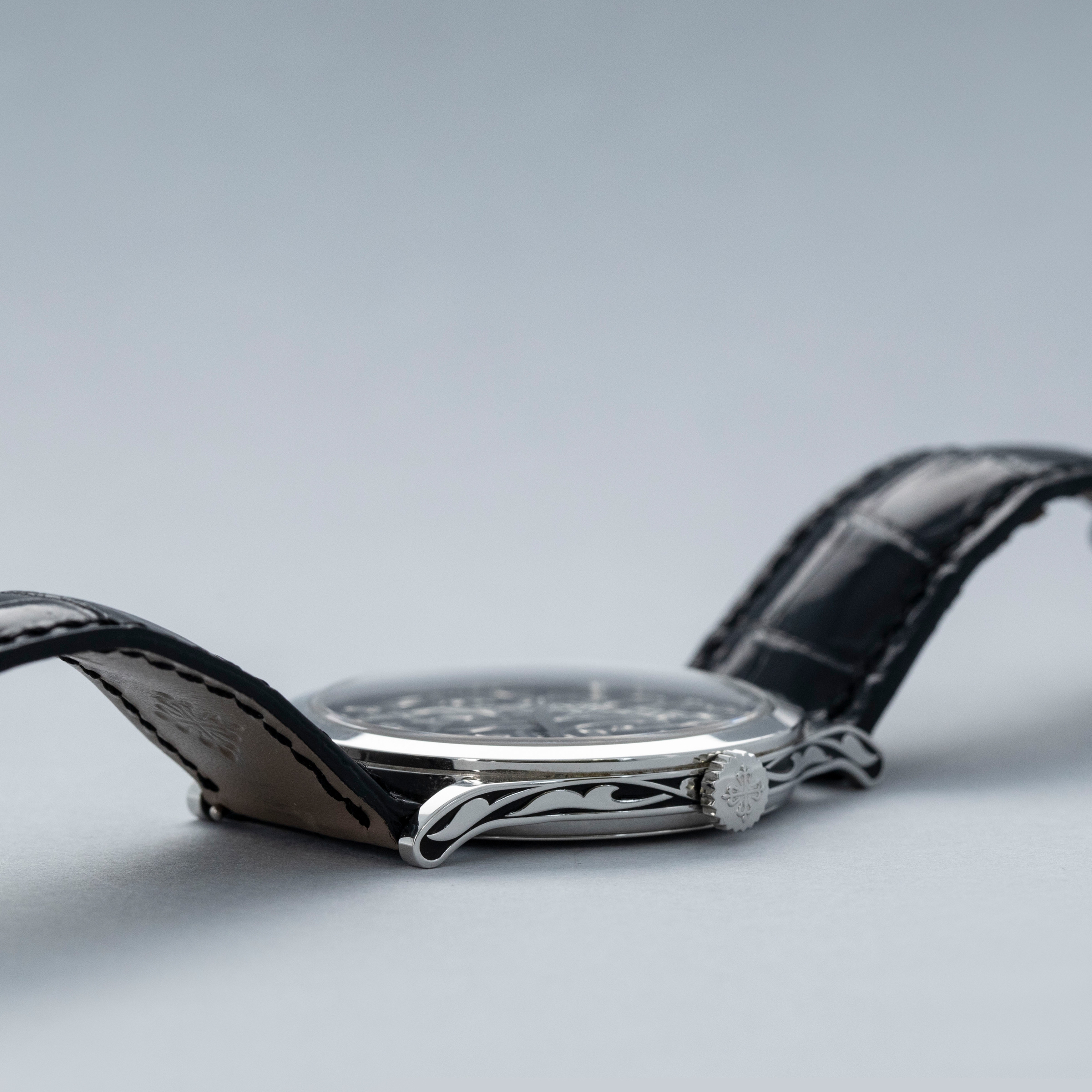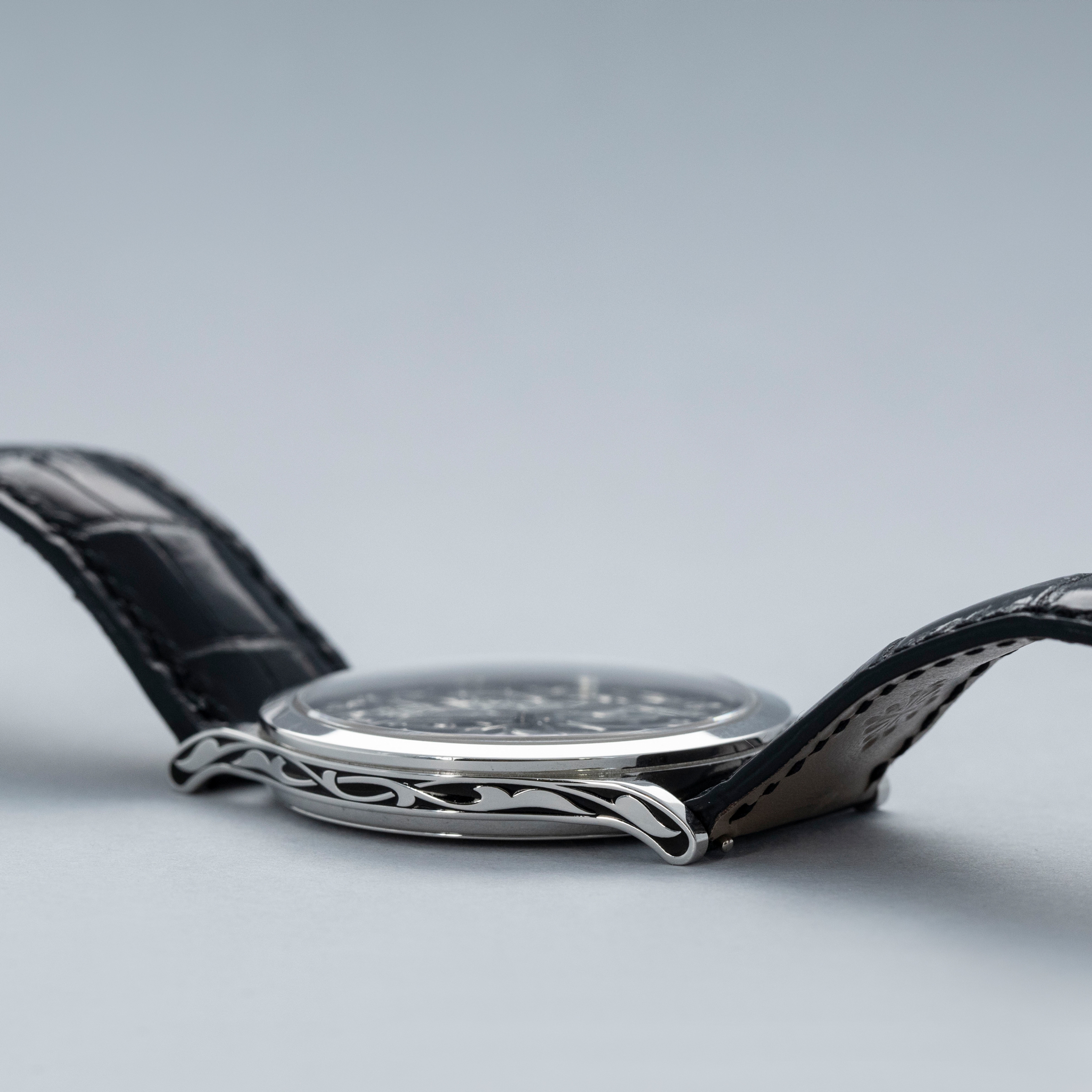 Ensuring no stone is left unturned, but still keen to leave its dial as the focal point, Patek decided to decorate both sides of the ref. 5088P's platinum midcase with the same decorative engraved patterns and black enamel as its dial.
