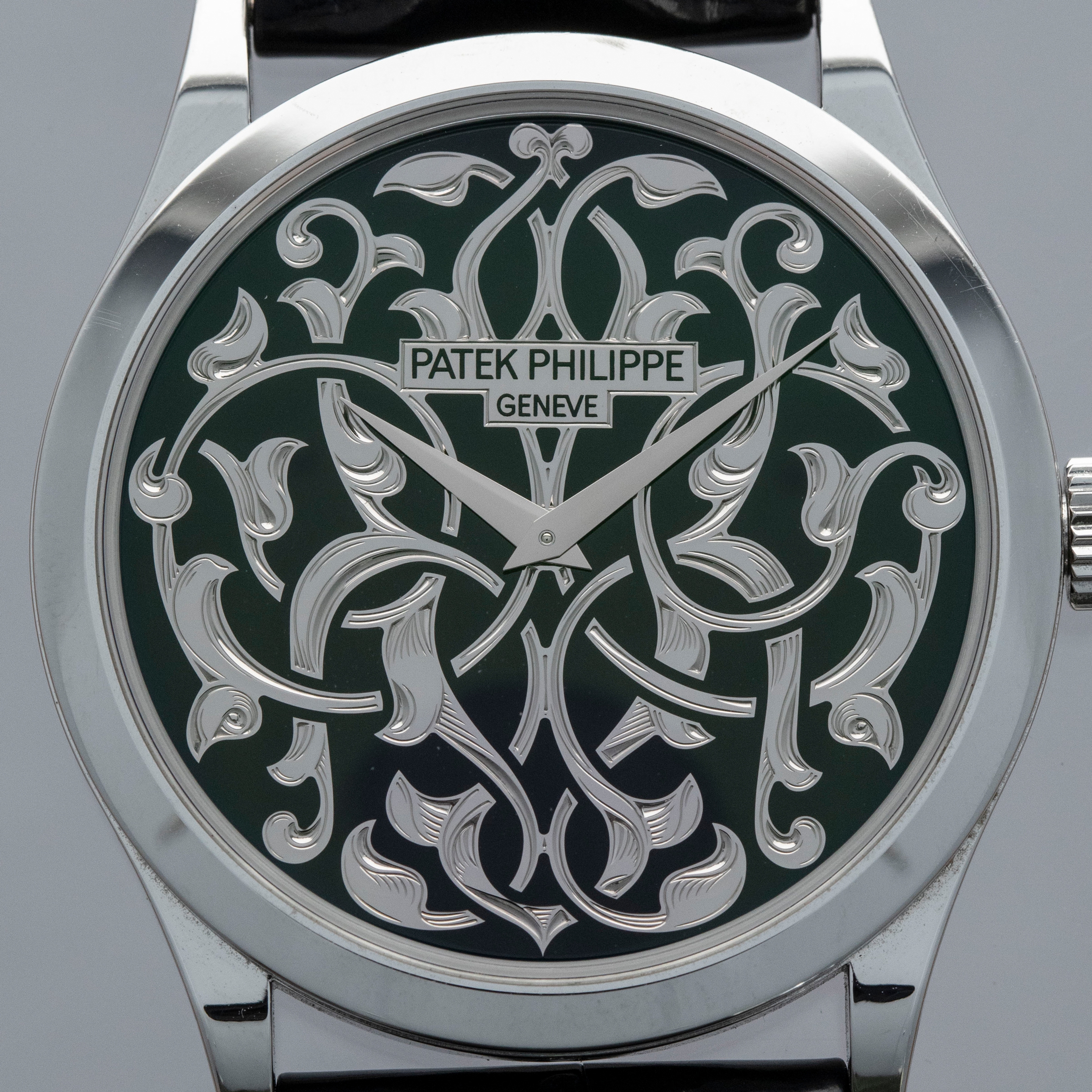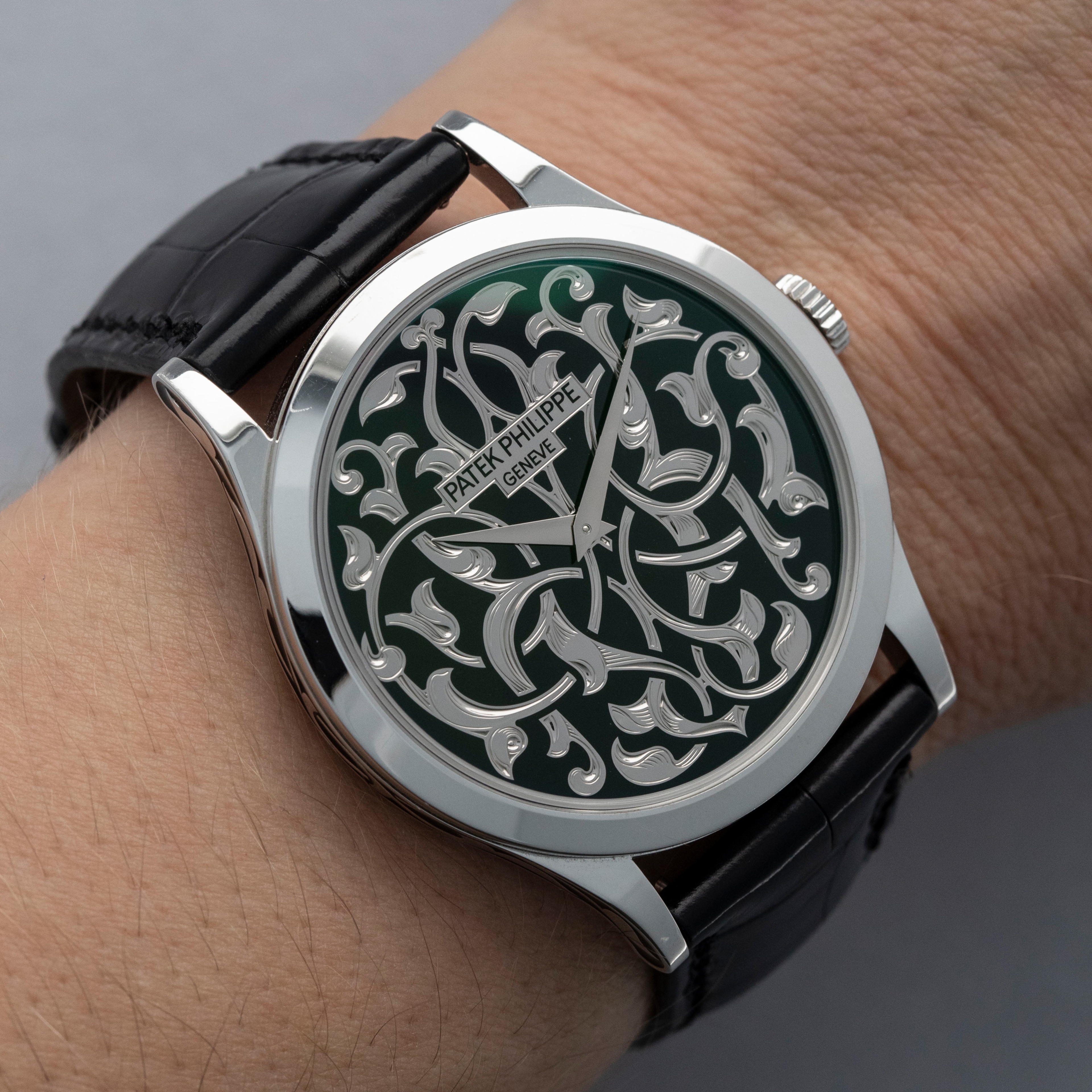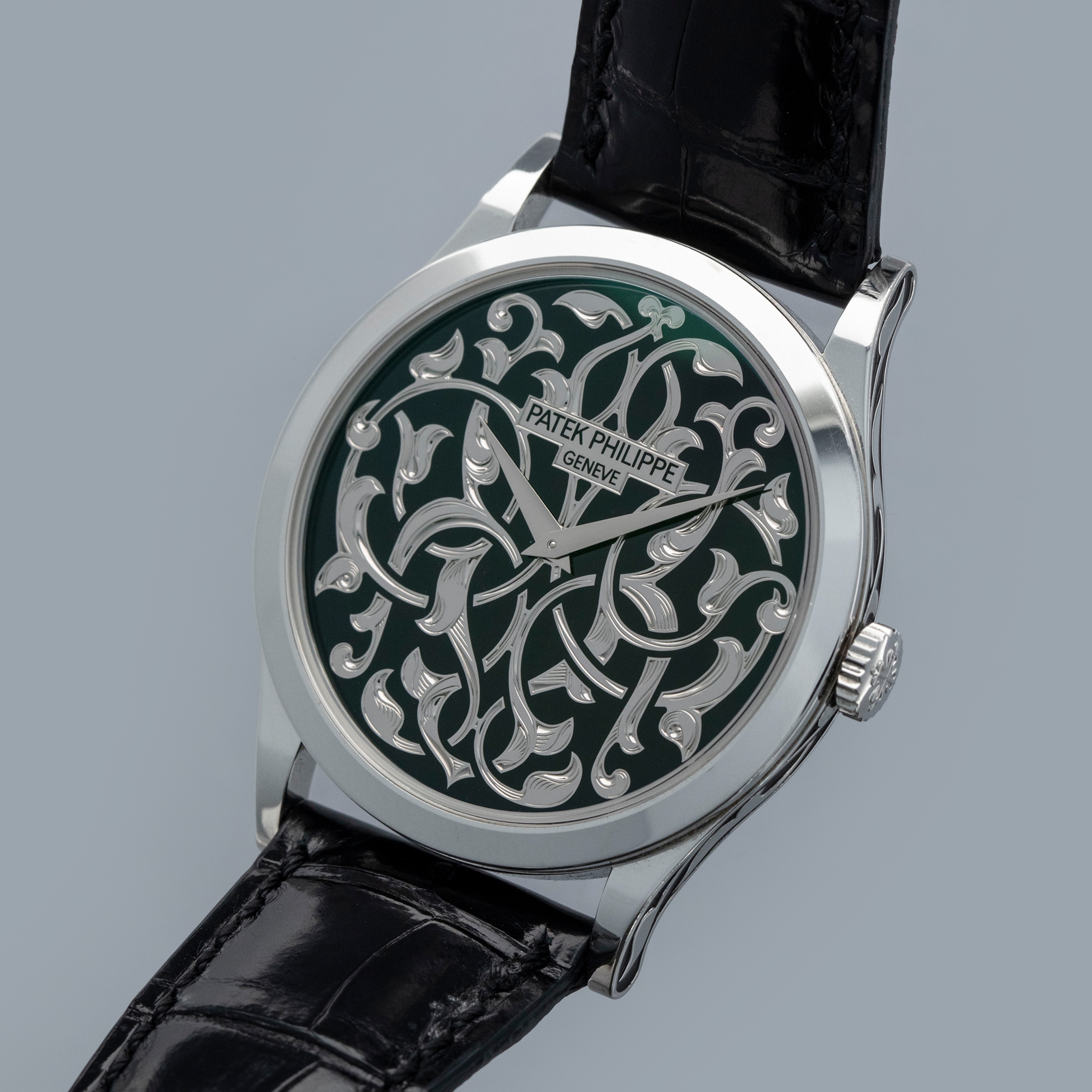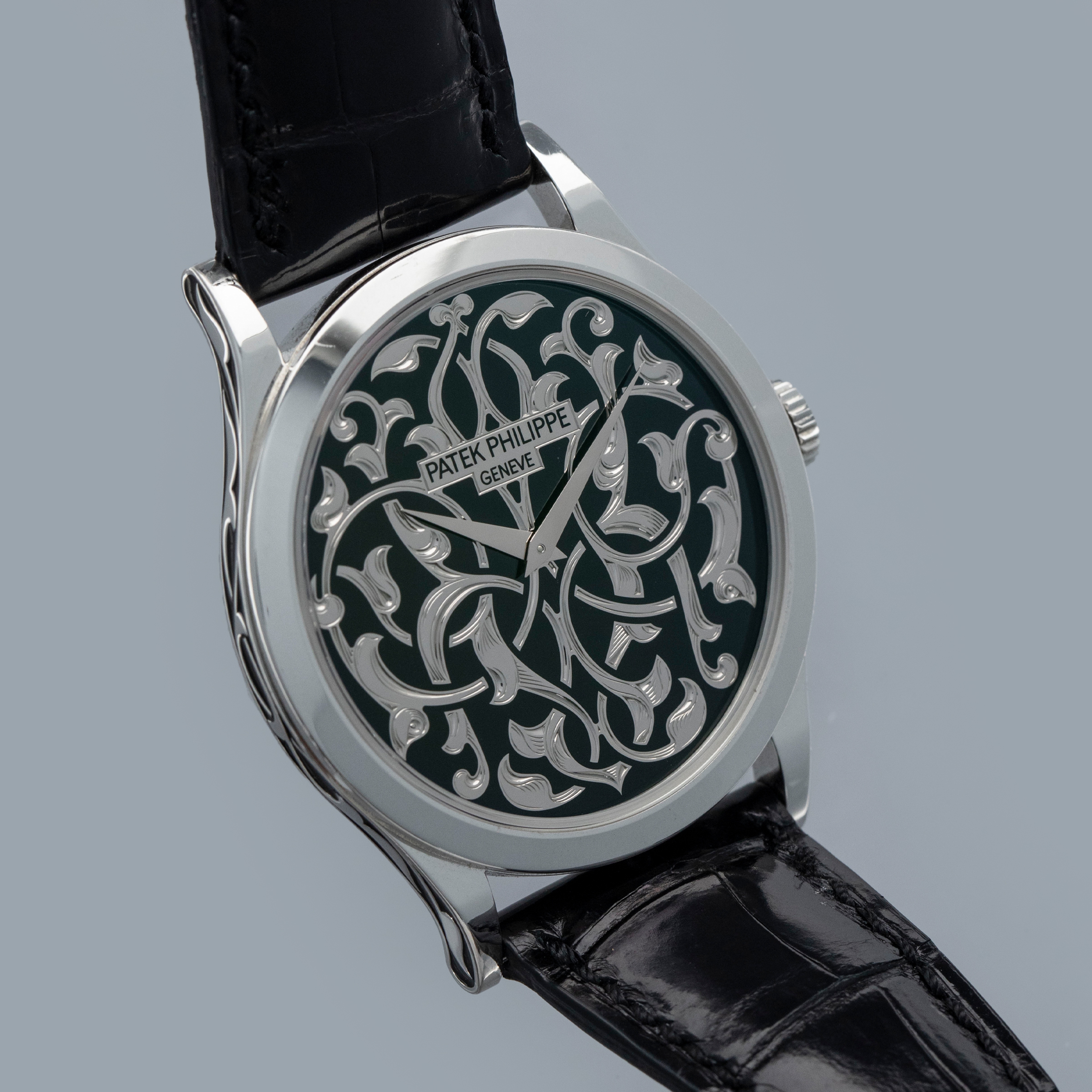 Released in 1932 and named after the cross that the Calatrava Knights paraded around Spain and Portugal during the 12th and 13th centuries, the Patek Philippe Calatrava was released as a simple timepiece with broad appeal that would help secure Patek Philippe's finances following Jean and Charles Henri Stern's investment in the brand in the same year. Designed with a strict Bauhaus-inspired aesthetic in mind, the Calatrava used, and continues to use, simplicity as its means of establishing intrigue around the craftsmanship required to construct such a stunning timepiece. However, not all members of the Calatrava family are born equal, and members of the Rare Handcrafts collection are a testament to that fact, with the ref. 5088/100P-001 that we have here the perfect example of that. Launched in 2014 as part of the brand’s 175th anniversary celebrations, the ref. 5088P is an intensely rare and exceptionally executed exhibition of Patek Philippe’s artisanal capabilities. Boasting a completely polished 38mm case powered by the automatic cal. 240 movement, this example’s piece de resistance is its incredible champlevé black enamel dial with Volutes and Arabesque decoration. Using champlevé enamelling techniques, the dial is hand-engraved from a solid piece of 18ct white gold before the enameller fills the remaining voids with black enamel to complete this piece of pure artisanal excellence. The same technique is used on the ref. 5088’s midcase to create harmony between its physical construction and dial. A rhythmic pattern adorned with foliage and leaves that wrap and twist in and out of one another, the ref. 5088P truly is out of this world.