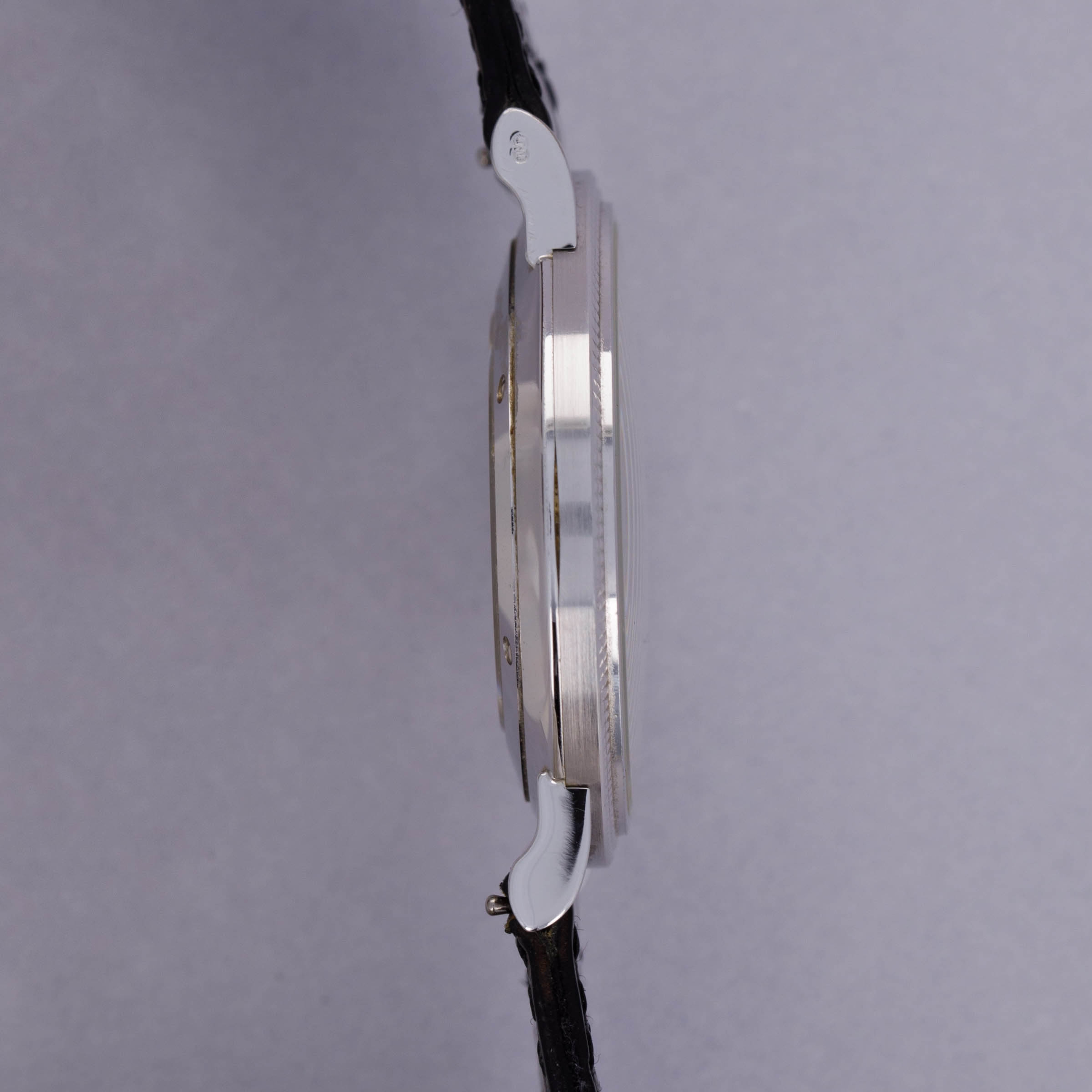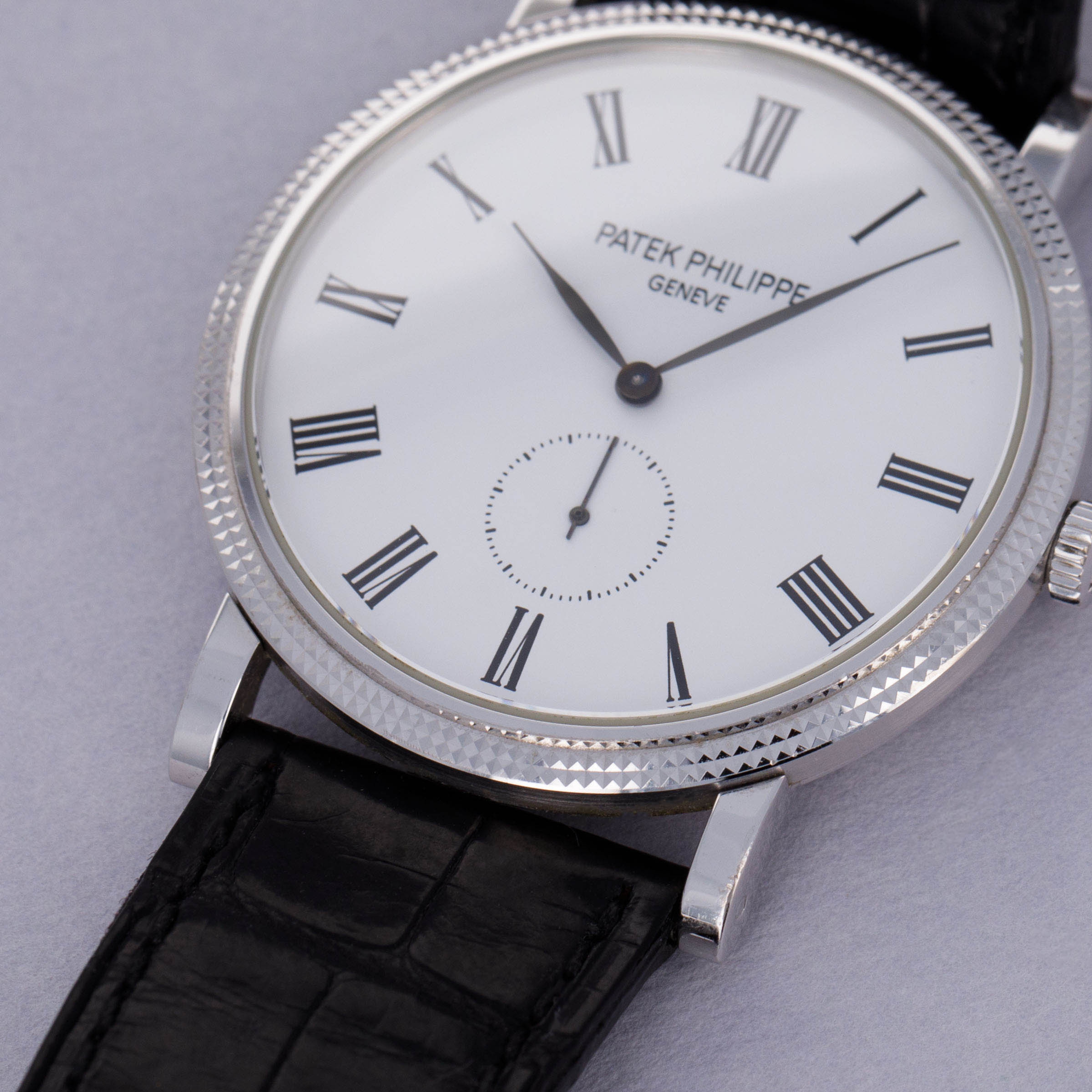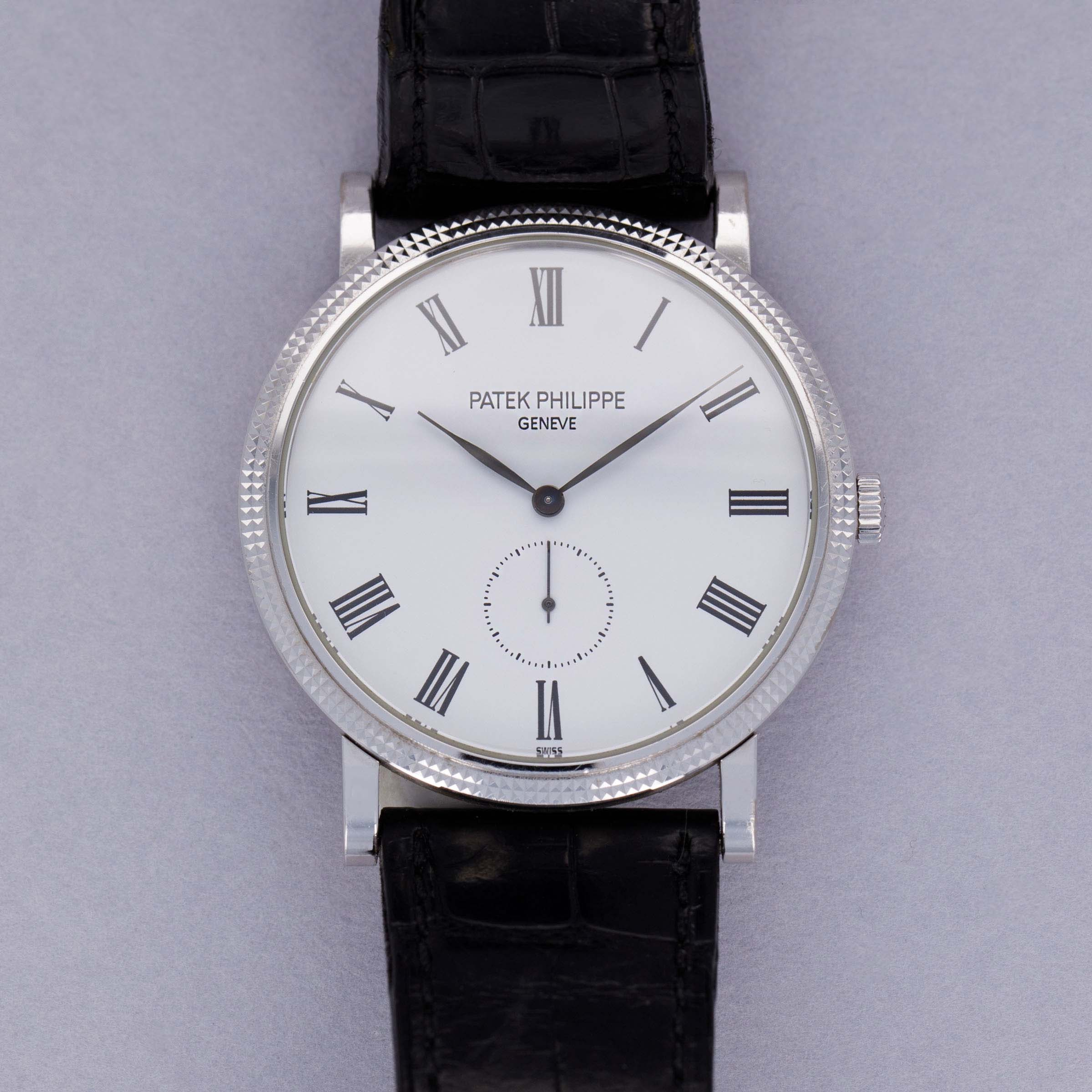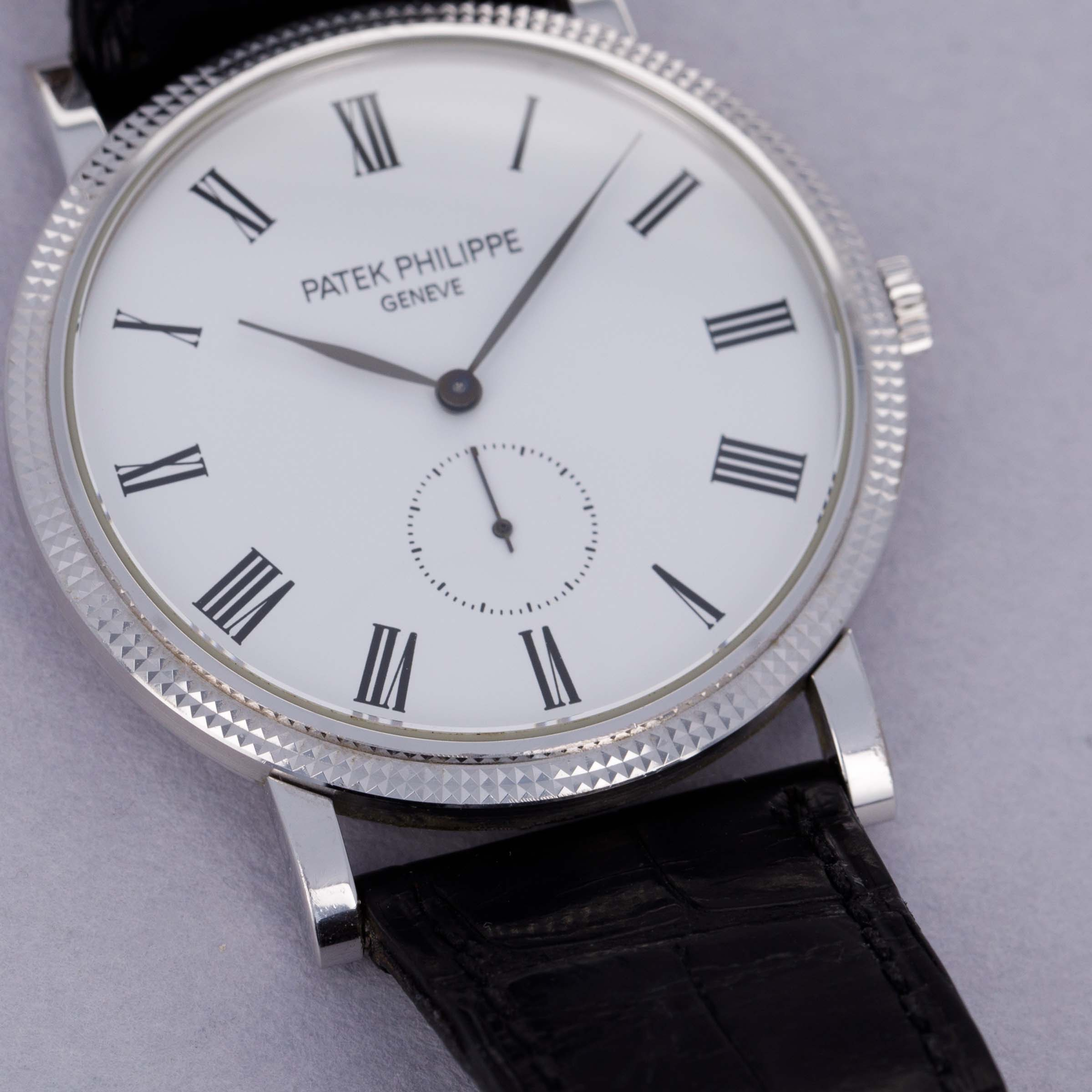 Easily situated amongst the most iconic dress watches ever, the Patek Philippe Calatrava embodies the very essence of what a classically-styled timepiece should look like. Defining the entire market niche in 1932 when it debuted, the Calatrava has become the foundation of Patek Philippe’s elegant dress watch offerings. Available here, we have an 18kt white gold Calatrava ref. 5119G. Launched in 2006 and in production until its discontinuation in 2021, the ref. 5119G maintained plenty of the Calatrava’s design signatures such as its Clous de Paris engraved hobnail texture bezel and stunningly understated white dial which boasts black painted Roman numerals. Sporting an exceptionally clean and elegant look and feel, the ref. 5119G’s perfectly round 36mm 18kt white gold case wears exactly like a traditional dress watch, with its straight curled lugs flowing down the wrist for a thin wearing experience, as provided by the ref. 5119G’s manual-wind movement, the cal. 215 PS. Contrasting its simple white dial, the various textures across the ref. 5119G’s bezel, case, and dial combine to create a truly beautiful watch that still manages to play to the Calatrava’s Bauhaus-derived aesthetic in what is clearly a direct reference to its puritan roots and historical lineage, all while demonstrating Patek Philippe's ability to create some of horology's most stunning timepieces.