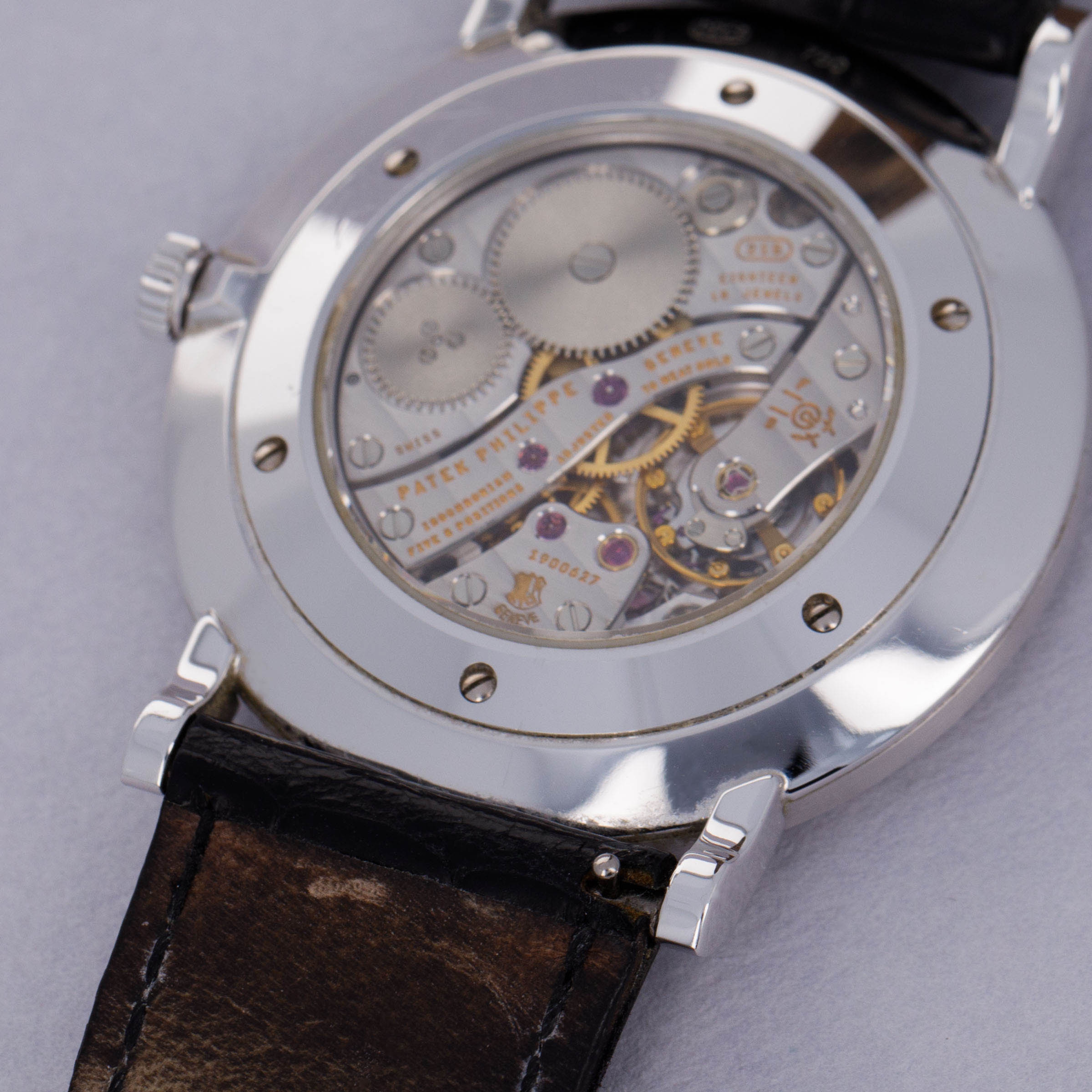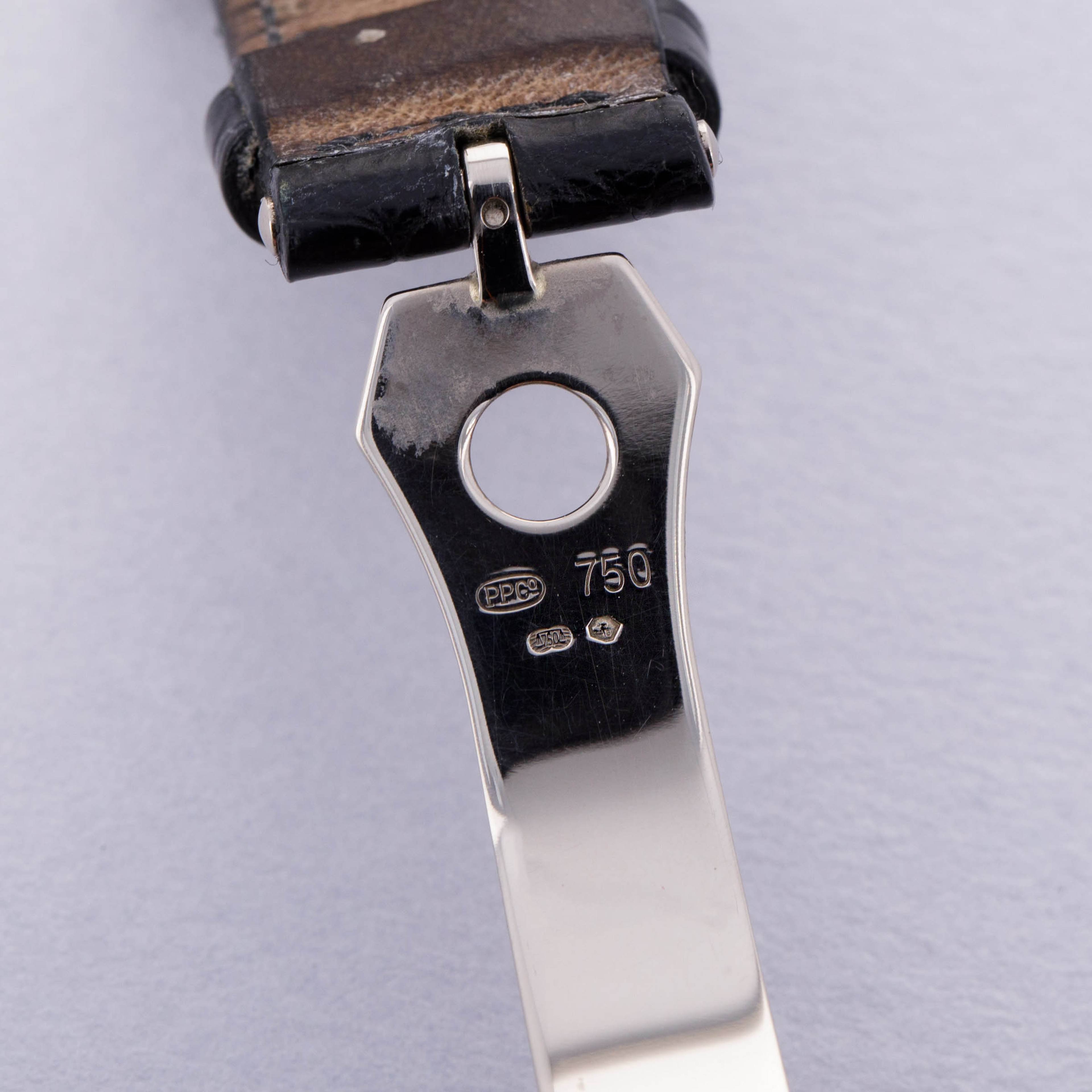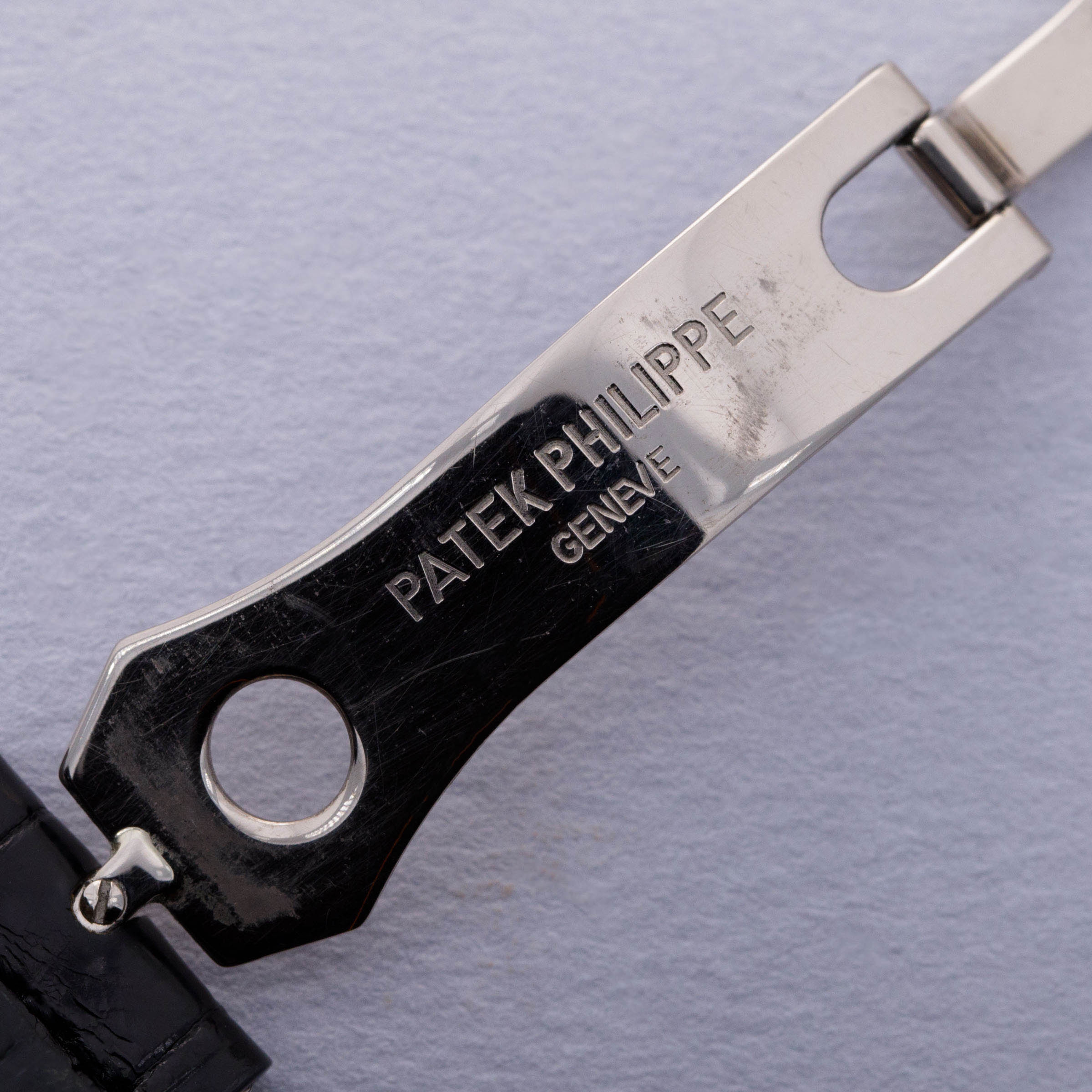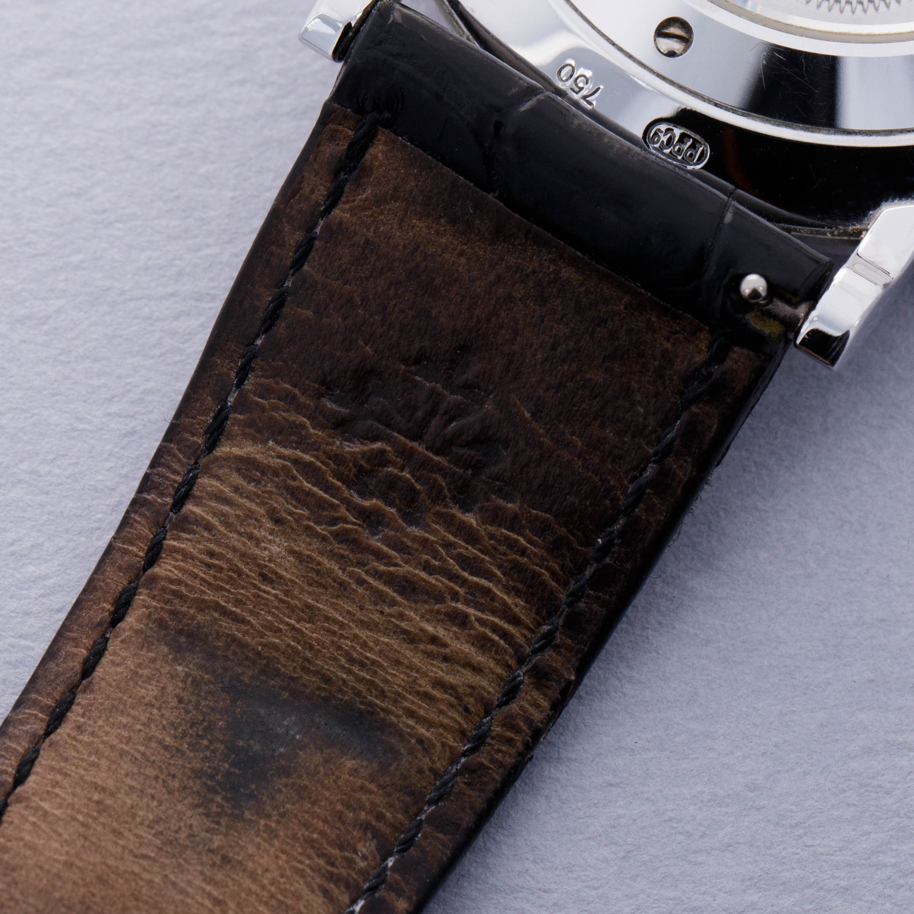 Watch is in excellent overall condition. Case shows wear along the surfaces, with scratches primarily visible on the caseback and mid-case. Hobnail bezel is well defined, with minimal wear. The dial near-mint with no signs of wear or aging. Watch comes on a well worn strap and a modified PP deployant buckle that was purchased by the original owner when new. The deployant buckle outer closure has been removed and the original tang buckle has been retrofitted for a cleaner look. The removed part is not included in the sale. Additionally, the box is missing the inner pillow.