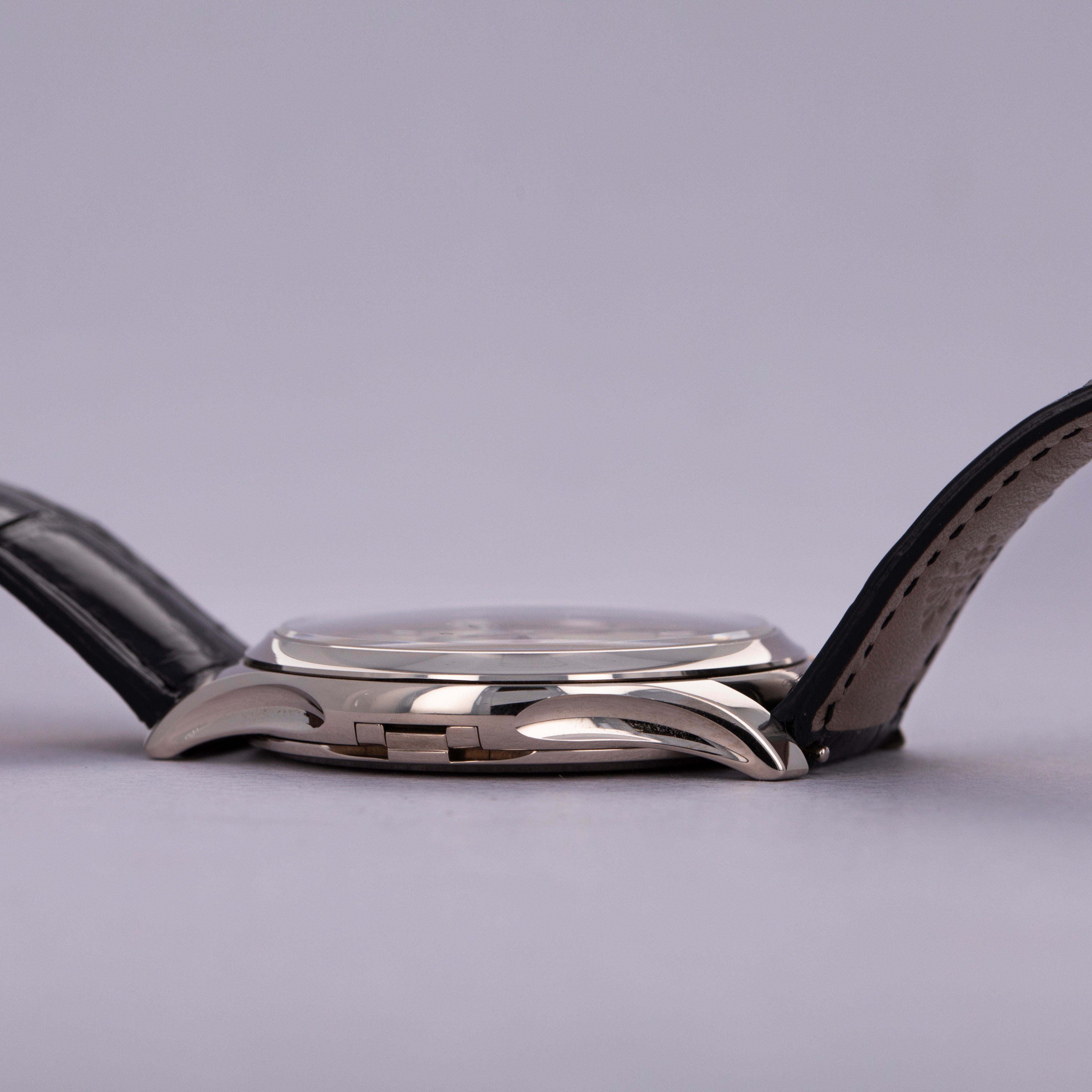 Measuring 39mm in diameter and made of 18kt white gold, the ref. 5227G features a hefty case indeed. However, with its elegant domed bezel, polished surfaces, and thin 9.24mm profile, it wears with a supreme sense of decorum, as one might expect from Patek.
