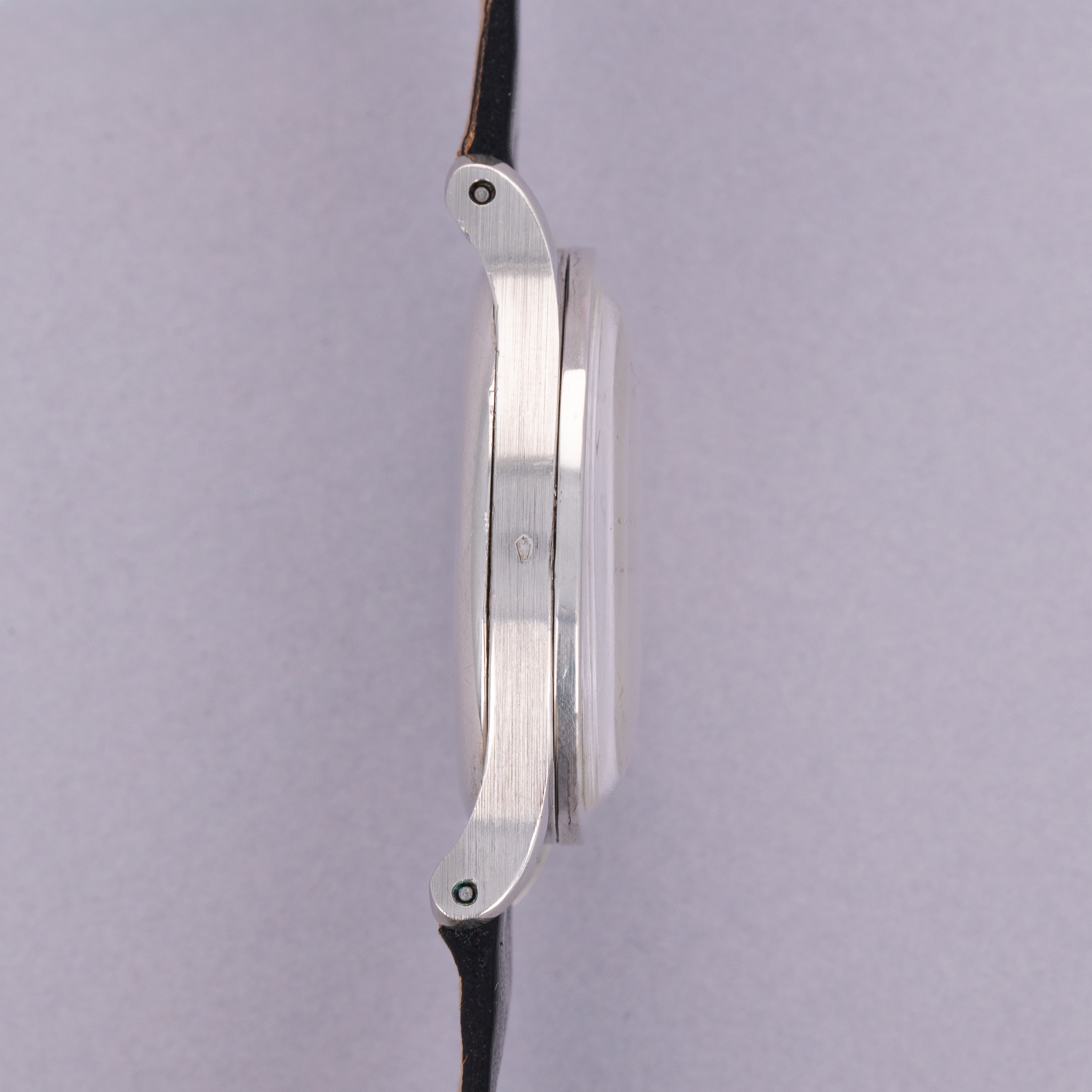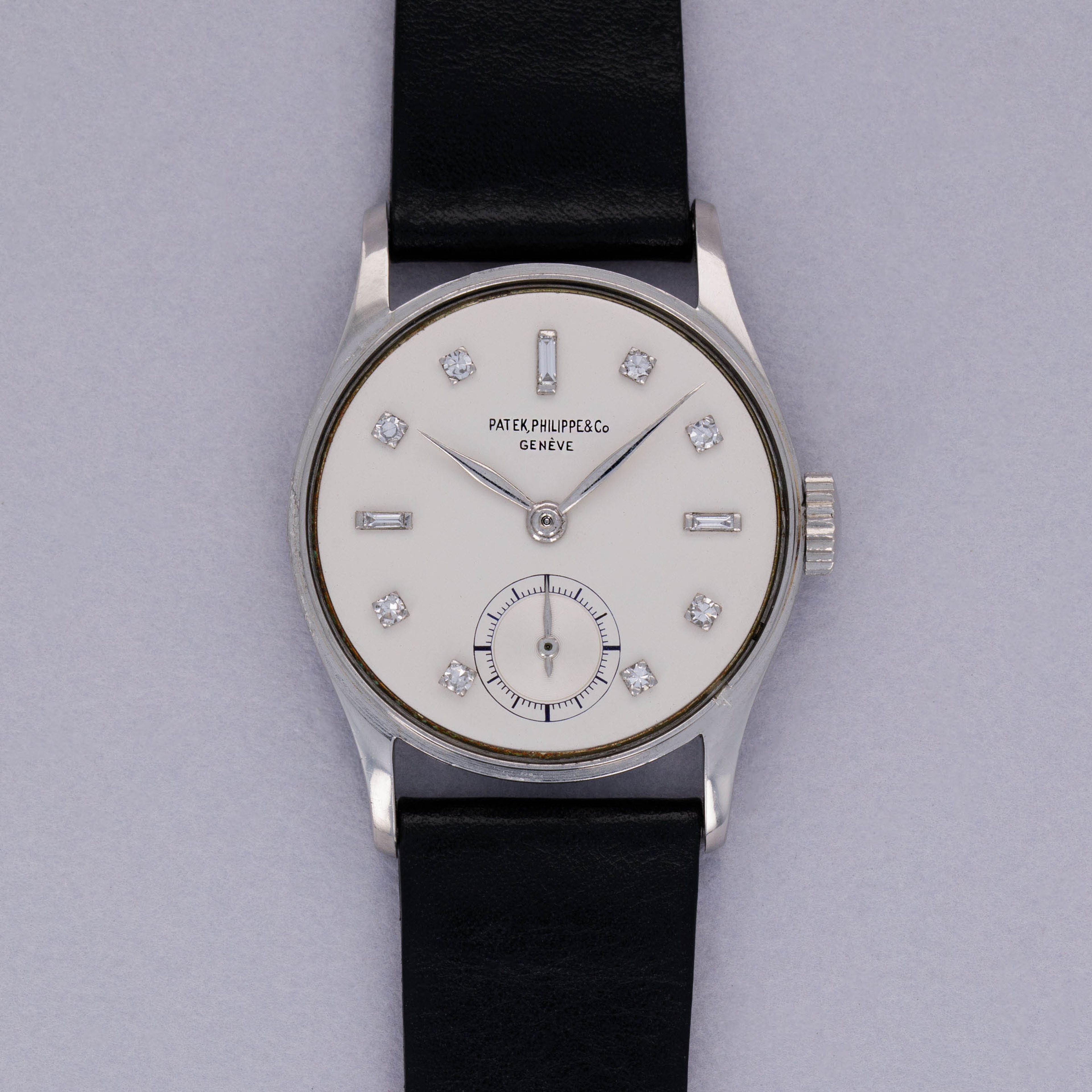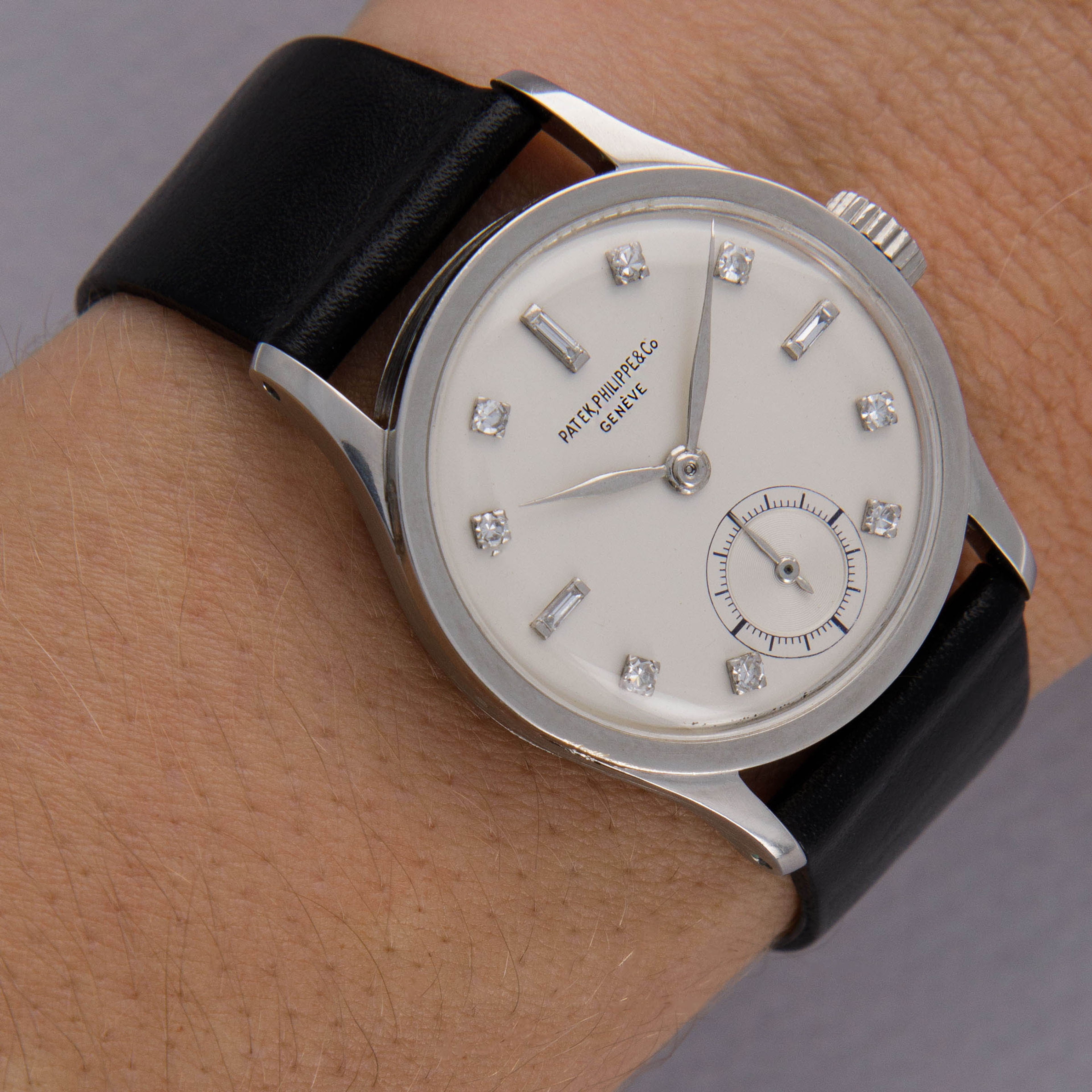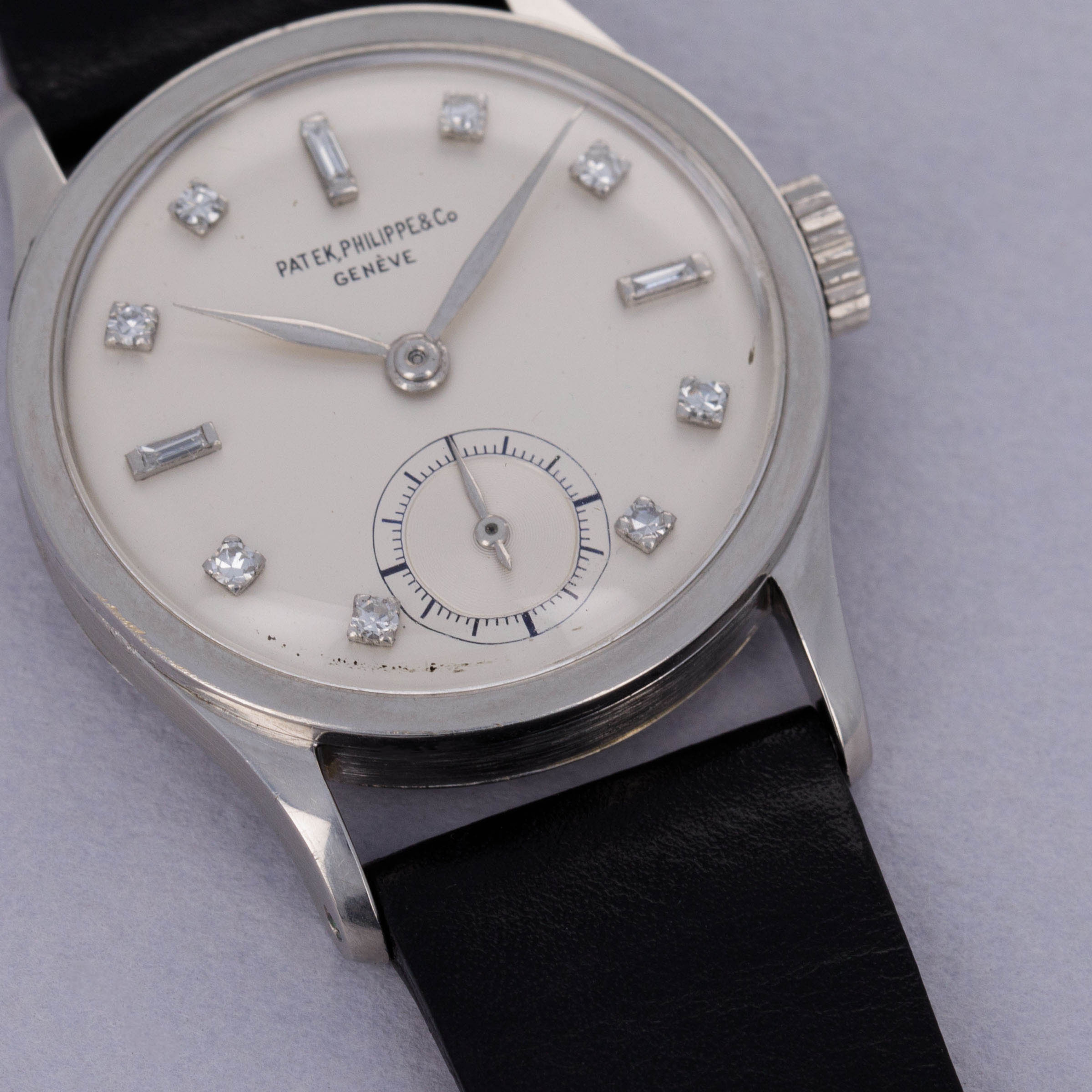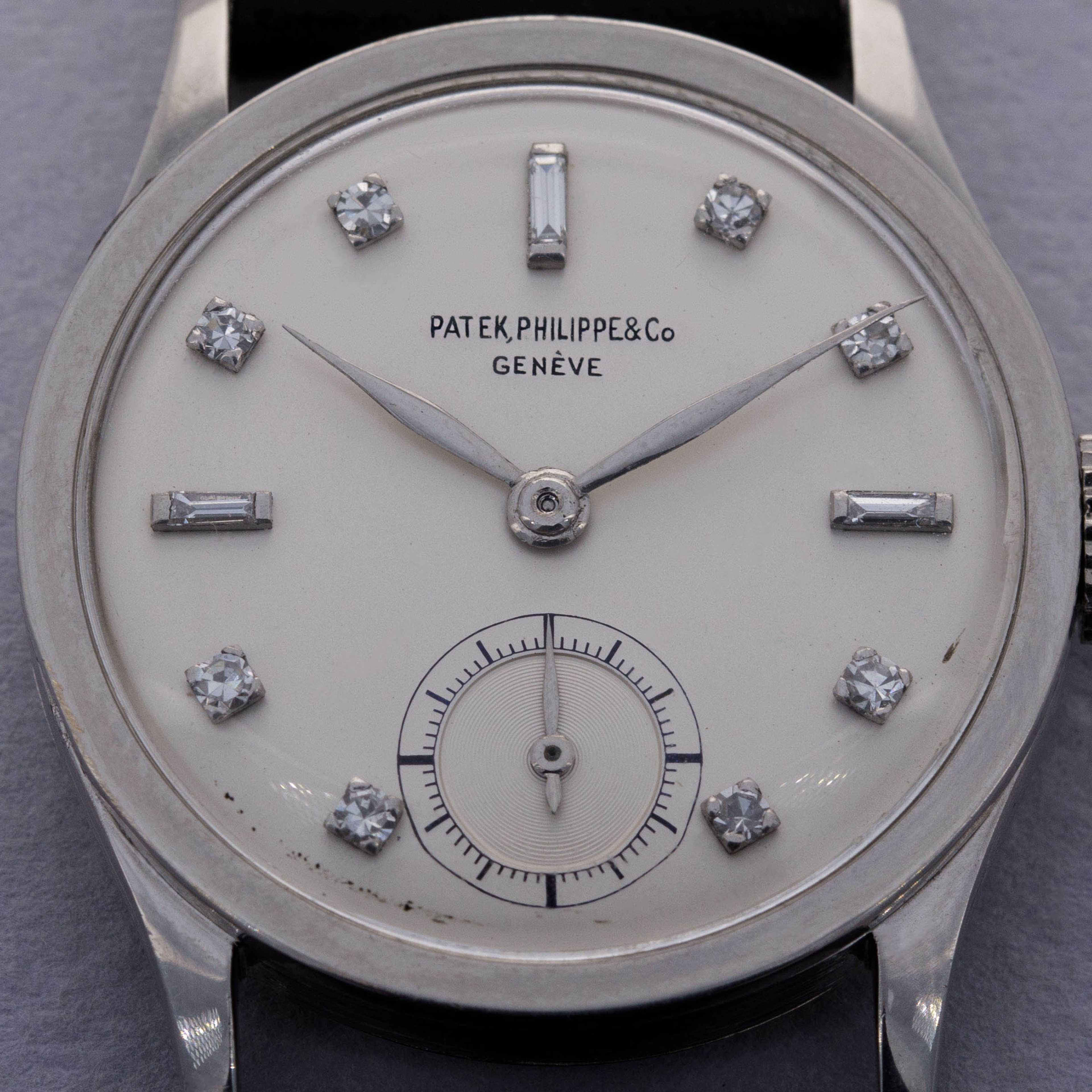 Watch is in excellent overall condition. While the case exhibits some surface marks and scratches, the lugs are full and have sharp edges and retain both original platinum hallmarks. (Visible on the 9 o'clock side and on the backside of the 4 o'clock lug) The original indelible raised enamel dial with diamond indexes is in near-mint condition. It is virtually flawless and one of the best examples we have seen. The text is well defined, with a strong comma after Patek, and a crisp accent above the first E in GENEVE. Watch comes on a generic leather strap and an original PPCo 18k WG Wenger buckle. Watch is accompanied by a Patek Extract of the Archives specifying the dial type as "Diamond hour-markers" and mentioning the date of sale as July 8th, 1948. Please note: the movement is ticking at time of cataloging, but it is keeping poor time and a service is recommended.