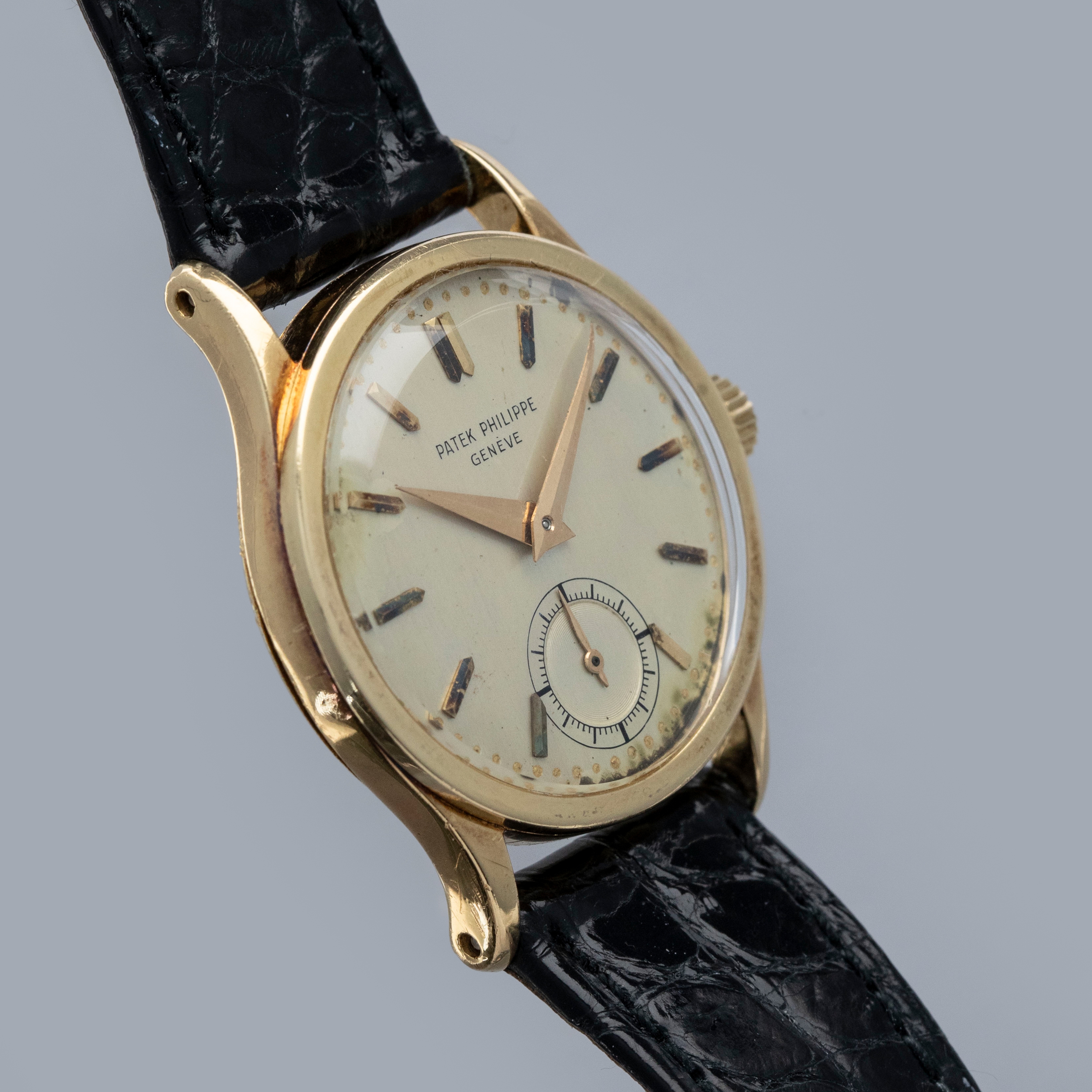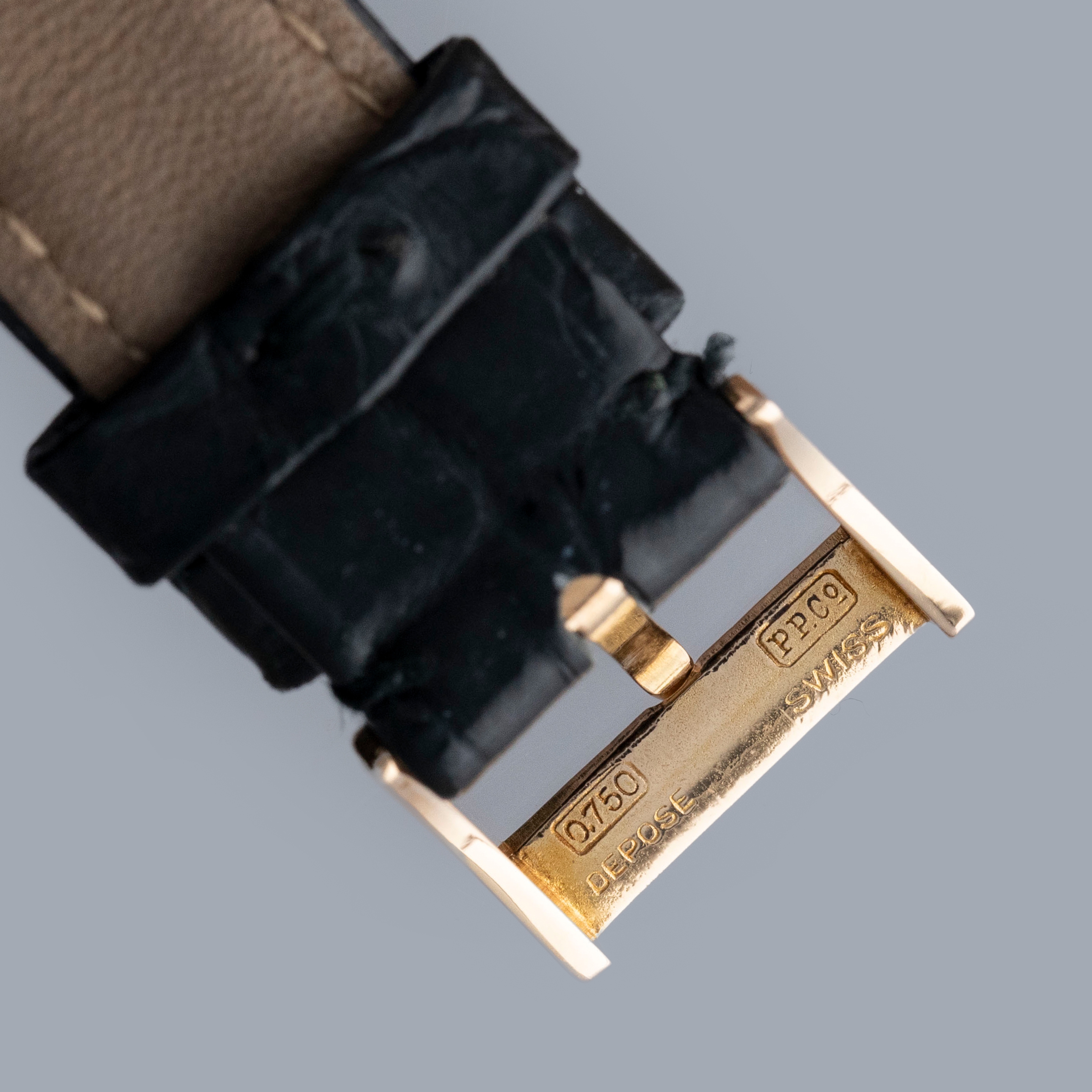 The watch is in overall good condition. The yellow gold case shows scratches and nicks, with some softening around the lug holes. A hallmark on the case side remains visible, and the case back has additional scratches but retains a well-defined stamp. The dial shows damage and degradation around the edges, with visible marks on the surface. The hands are very clean. It is fitted with a black Patek Philippe alligator strap and a yellow gold Patek Philippe buckle in very good condition.