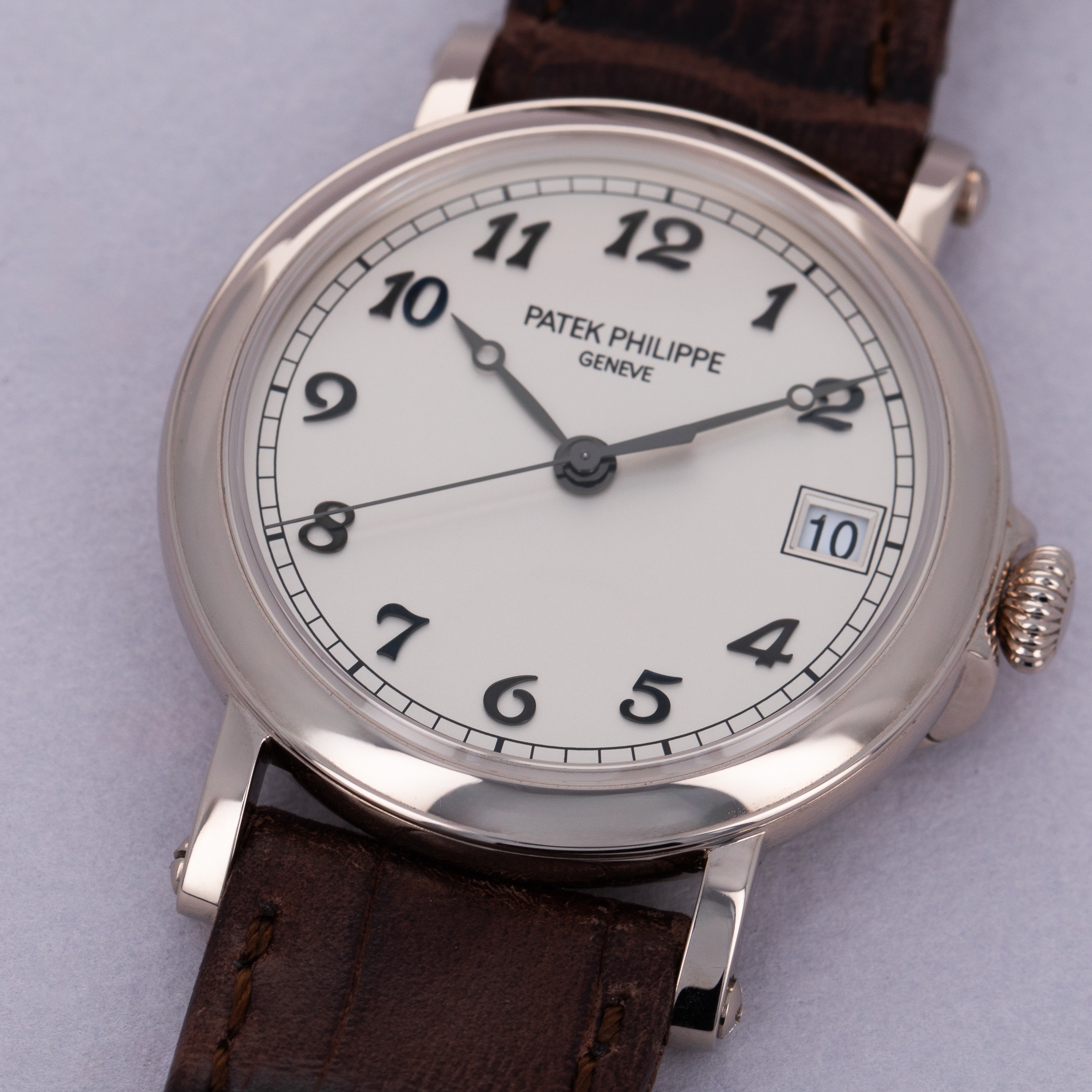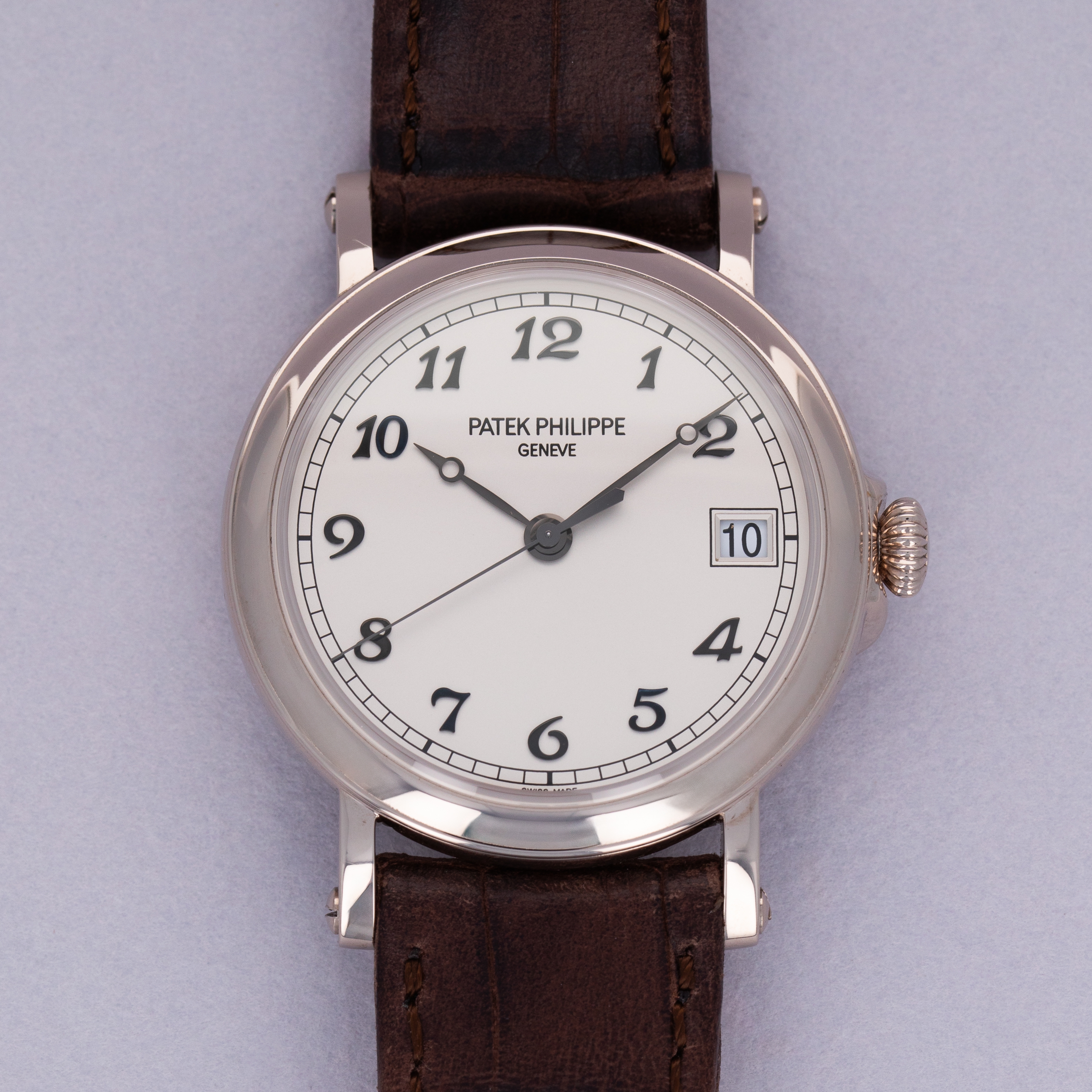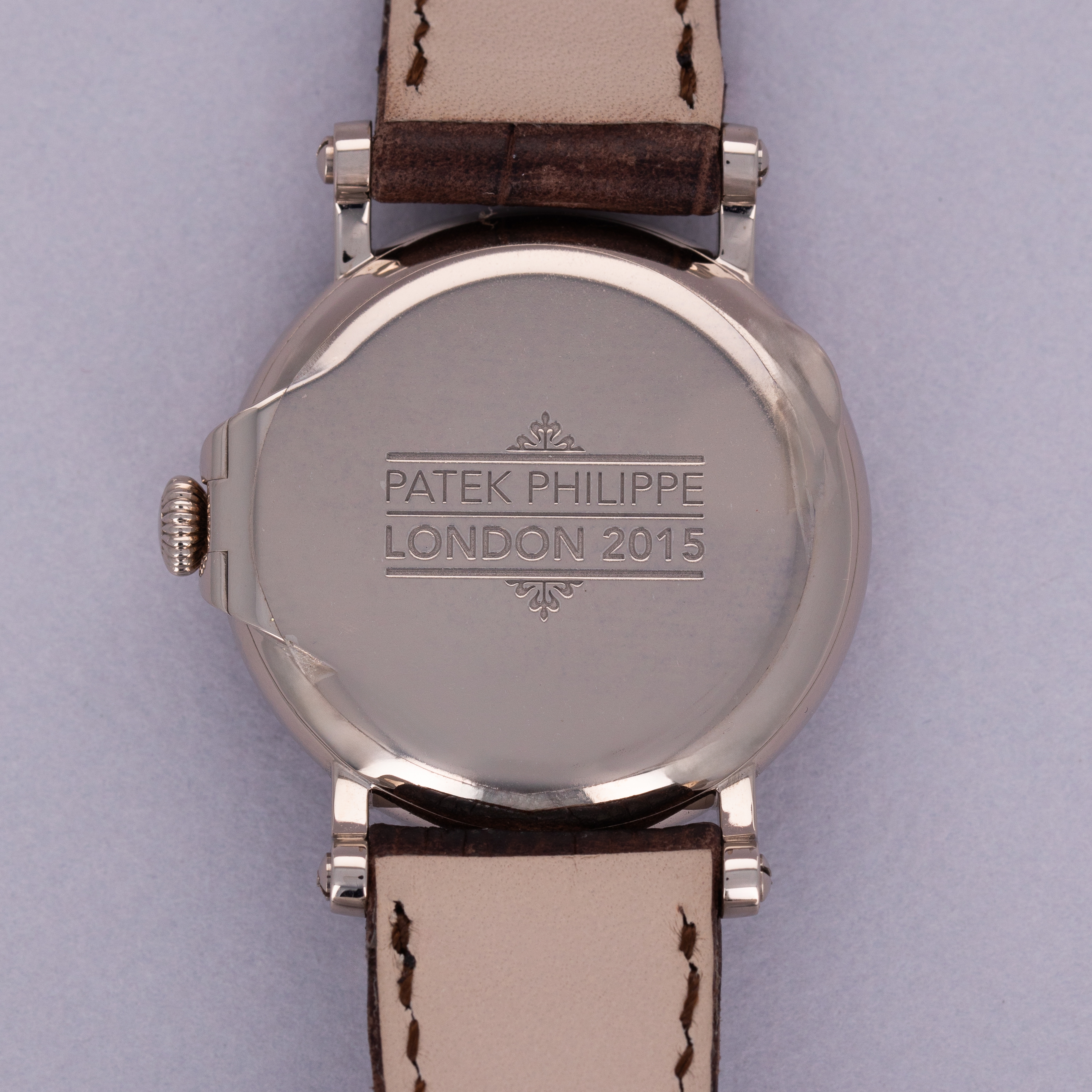 Easily situated amongst the most iconic dress watches ever, the Patek Philippe Calatrava embodies the very essence of what a classically-styled timepiece should look like. Defining the entire market niche in 1932 when it debuted, the Calatrava has become the foundation of Patek Philippe’s elegant offerings, with the collection growing to include a multitude of references of various designs across a variety of dials, materials, complications and more – which the example we present here proves, the Patek Philippe ref. 5153G. A stunning example of an officer watch, the ref. 5153G features the collection’s emblematic round case with a solid hinged caseback which provides a beautiful view of the gorgeously finished automatic cal. 324 movement found beneath it when its opened. With straight soldered lugs featuring screw-in bars further emphasising the historical officer watch aesthetic, the ref. 5153G is a distinctive watch in its unique design as a modern Patek Philippe. Launched a limited edition collection of just 80 pieces available primarily through Patek’s UK partners in 2015 to celebrate the brand’s 175th anniversary, as engraved on its hinged caseback, this ref. 5153G-012 boasts a white dial with blackened gold hands and Breguet numeral indices, which ensure that this rare ref. 5153G variant is a monochromatic beauty that will look immaculate on any wrist and stand proud with its distinctive design language that we seldom see any more in today's horological landscape.