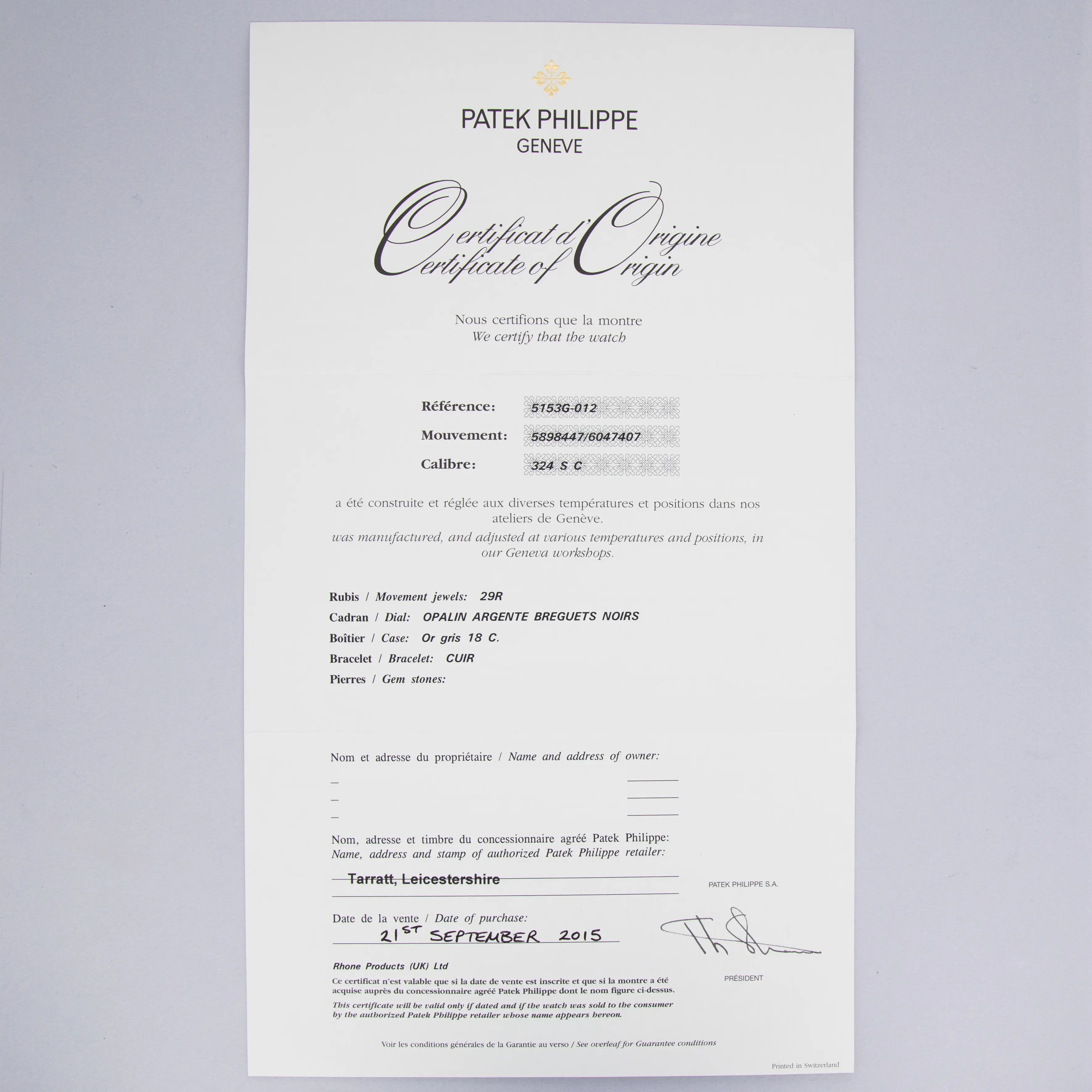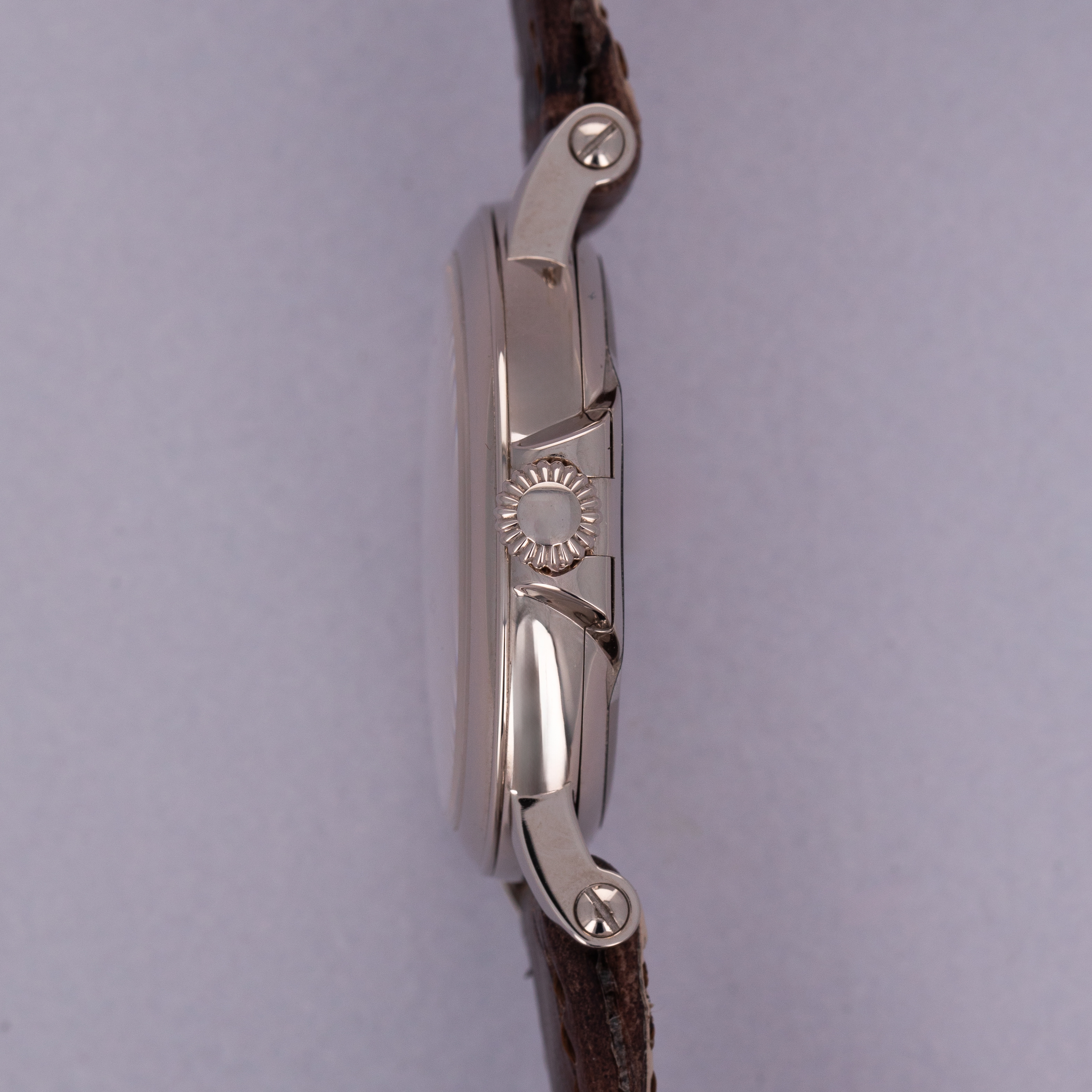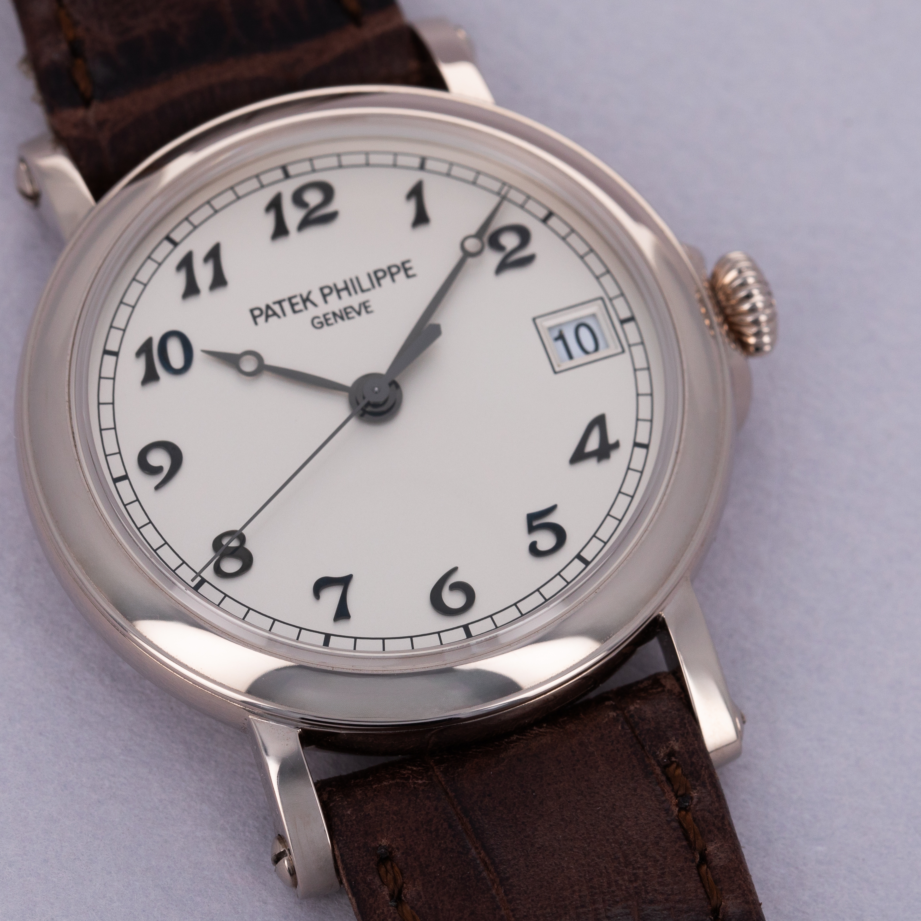 Easily situated amongst the most iconic dress watches ever, the Patek Philippe Calatrava embodies the very essence of what a classically-styled timepiece should look like. Defining the entire market niche in 1932 when it debuted, the Calatrava has become the foundation of Patek Philippe’s elegant offerings, with the collection growing to include a multitude of references of various designs across a variety of dials, materials, complications and more – which the example we present here proves, the Patek Philippe ref. 5153G. A stunning example of an officer watch, the ref. 5153G features the collection’s emblematic round case with a solid hinged caseback which provides a beautiful view of the gorgeously finished automatic cal. 324 movement found beneath it when its opened. With straight soldered lugs featuring screw-in bars further emphasising the historical officer watch aesthetic, the ref. 5153G is a distinctive watch in its unique design as a modern Patek Philippe. Launched a limited edition collection of just 80 pieces available primarily through Patek’s UK partners in 2015 to celebrate the brand’s 175th anniversary, as engraved on its hinged caseback, this ref. 5153G-012 boasts a white dial with blackened gold hands and Breguet numeral indices, which ensure that this rare ref. 5153G variant is a monochromatic beauty that will look immaculate on any wrist and stand proud with its distinctive design language that we seldom see any more in today's horological landscape.