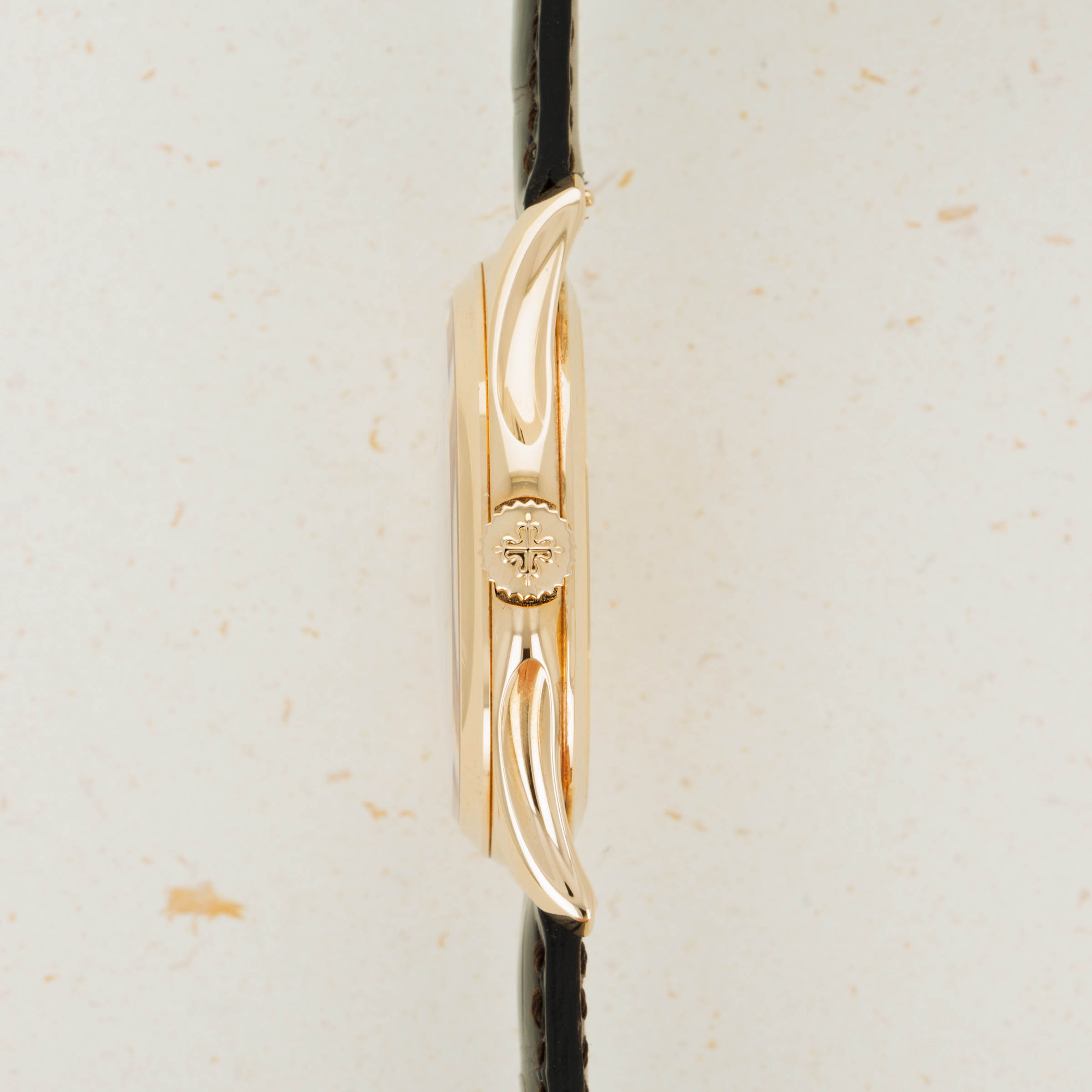 Easily situated amongst the most iconic dress watches ever, the Patek Philippe Calatrava embodies the very essence of what a classically-styled timepiece should look like. Defining the entire market niche in 1932 when it debuted, the Calatrava has become the foundation of Patek Philippe’s elegant offerings, with the collection growing to include a multitude of references of various designs across a variety of dials, materials, complications and more. Offered here we have the Calatrava ref. 5227R, which builds upon the Calatrava collection's history as one of Patek Philippe's best-known and best-looking dress watches. Boasting Patek's esteemed design language, the ref. 5227R features an 18kt red gold case with polished surfaces, a domed bezel and a gorgeous golden dial that houses gold dauphine hour hands and applied indices. An exercise in minimalism, as per the Calatrava’s Bauhaus-inspired design language, the Calatrava’s clean aesthetic has been the bedrock of its offering for decades, on which the ref. 5227R builds upon.