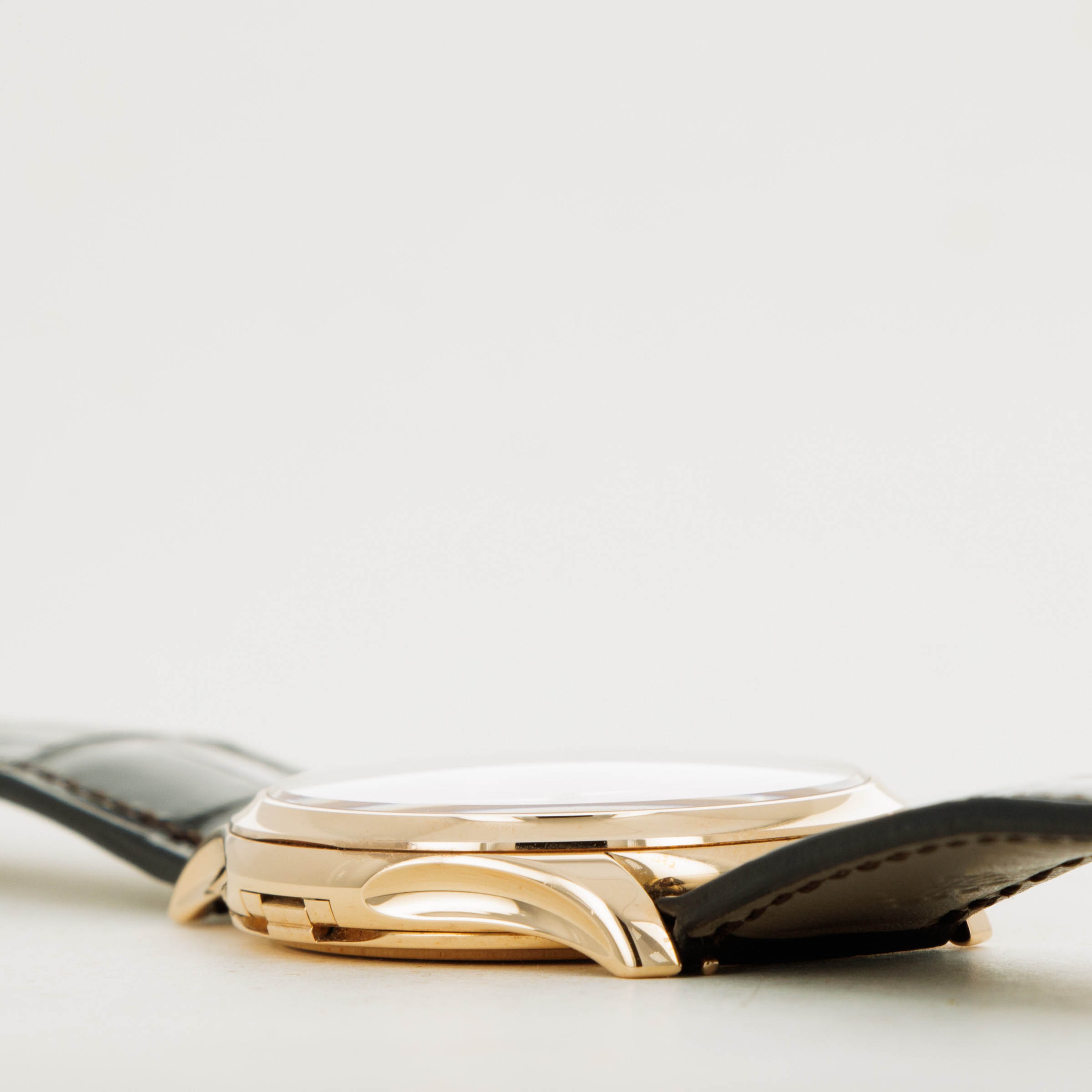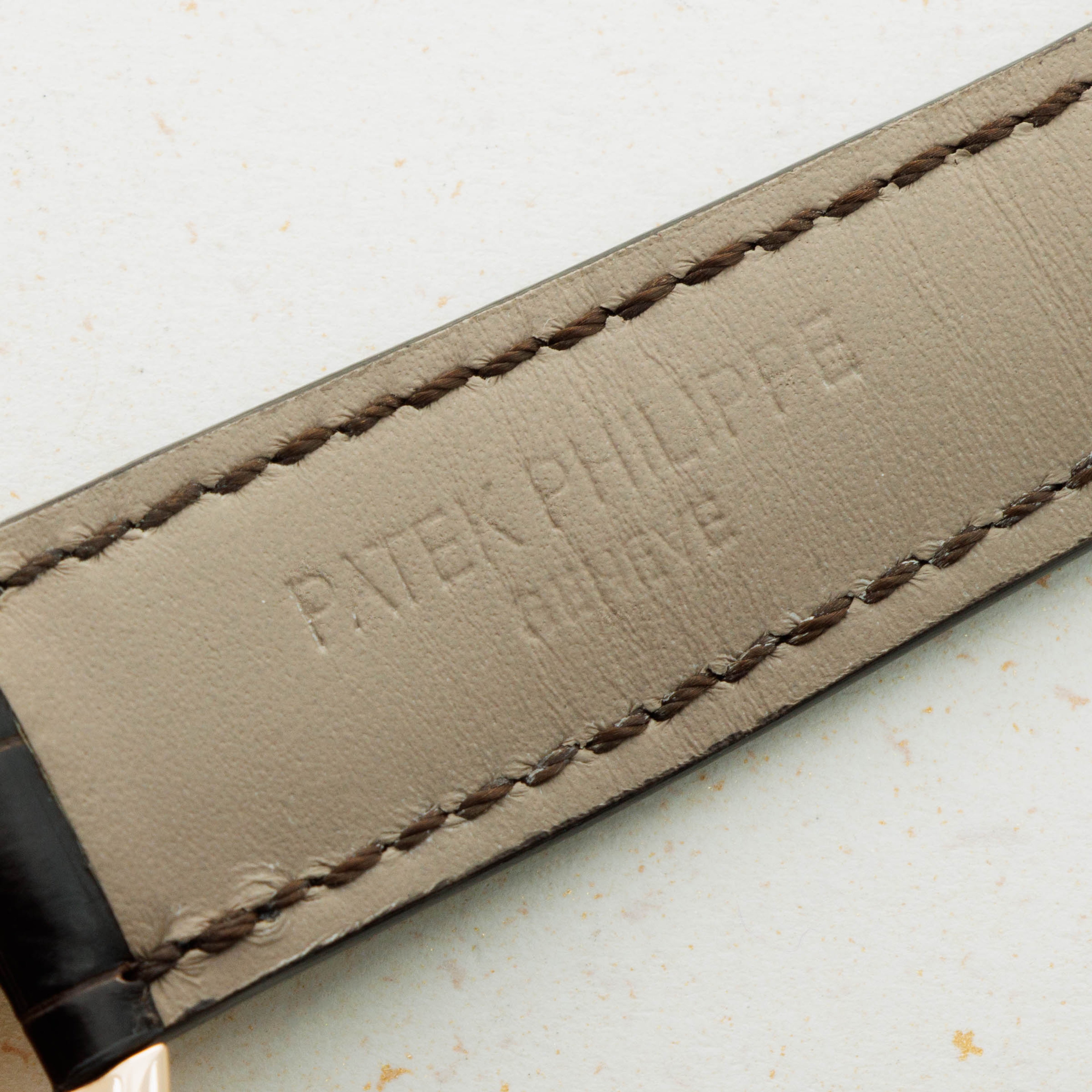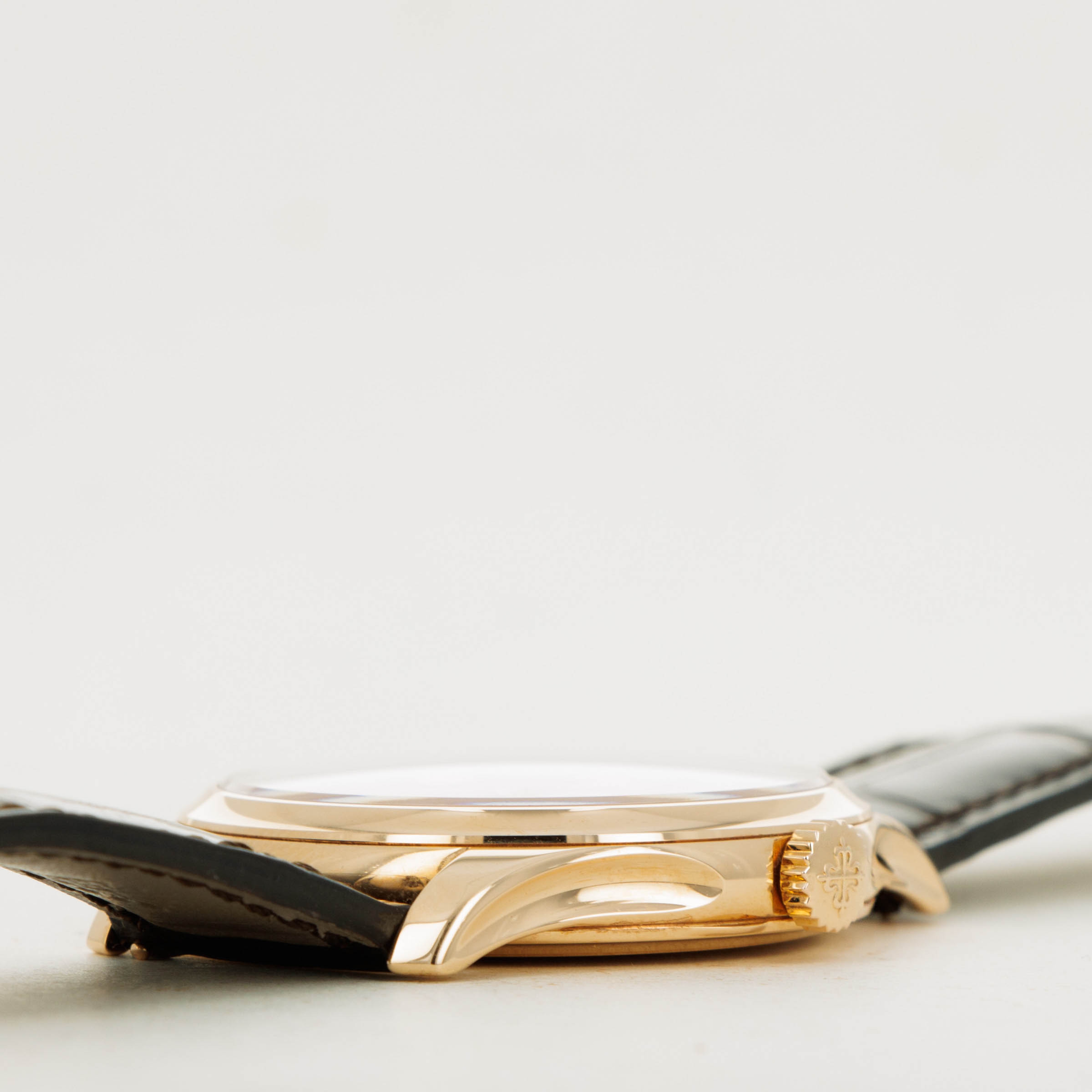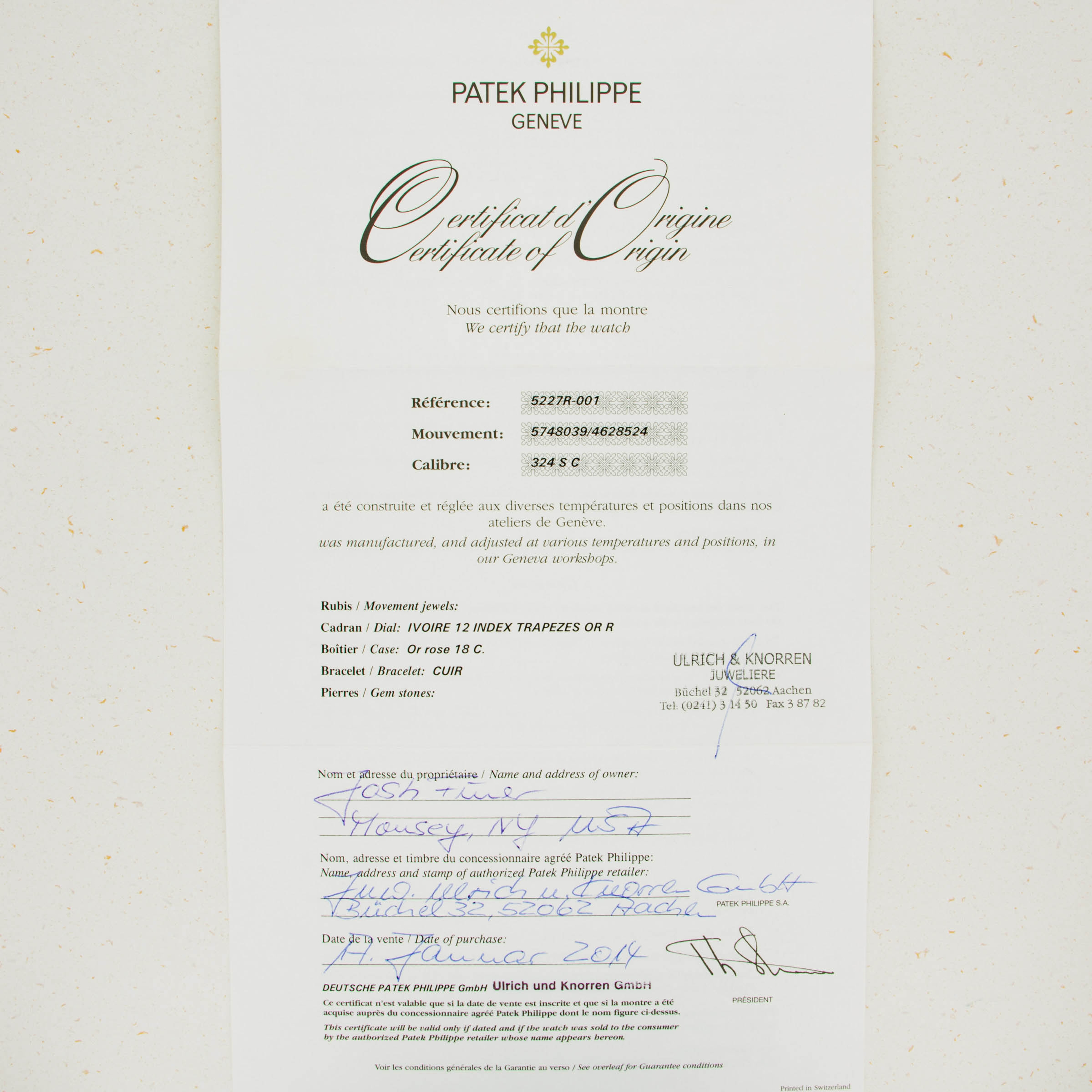 Measuring 39mm in diameter and made of 18kt rose gold, the ref. 5227R features a hefty case indeed. However, with its elegant domed bezel, polished surfaces, and thin 9.24mm profile, it wears with a supreme sense of decorum, as one might expect from Patek.