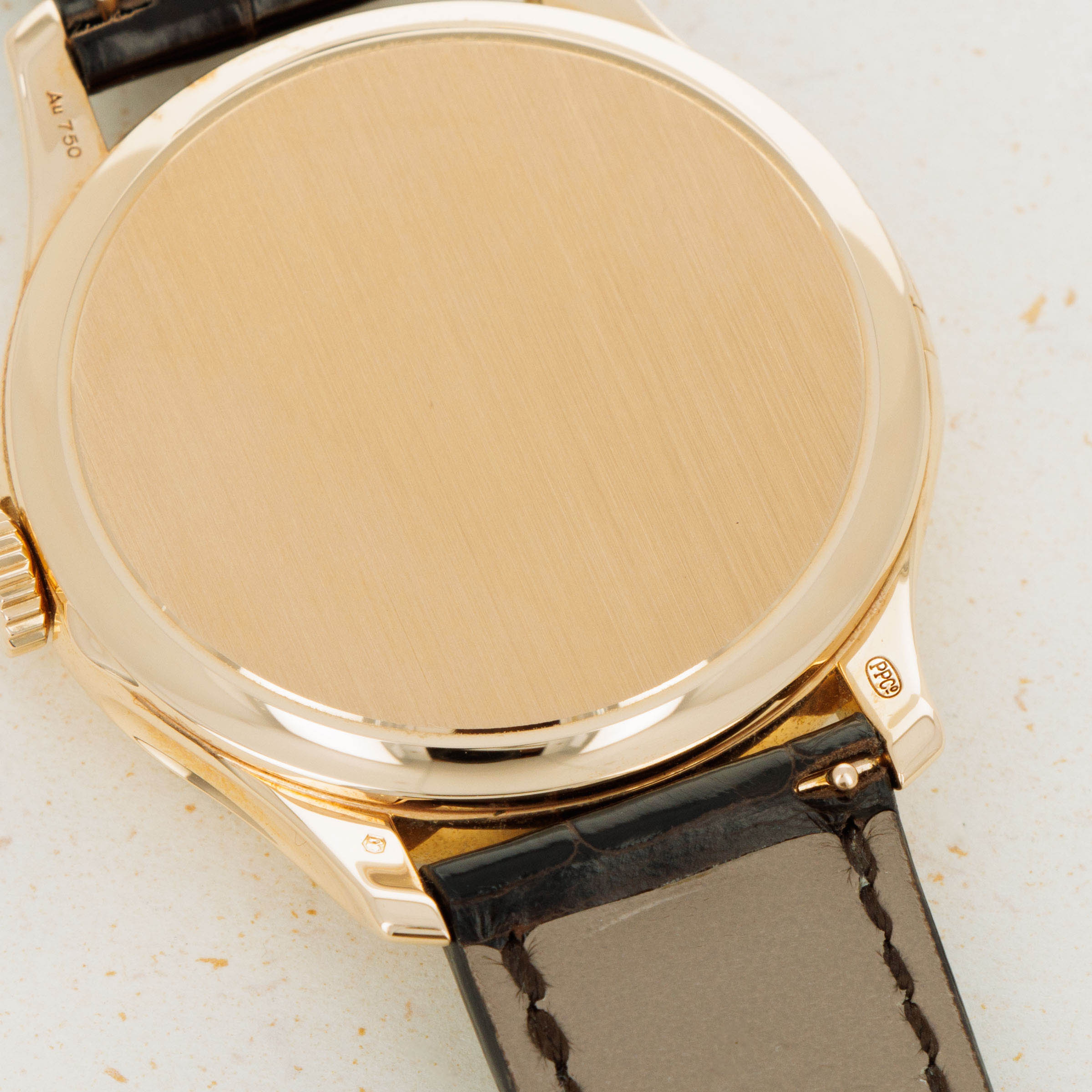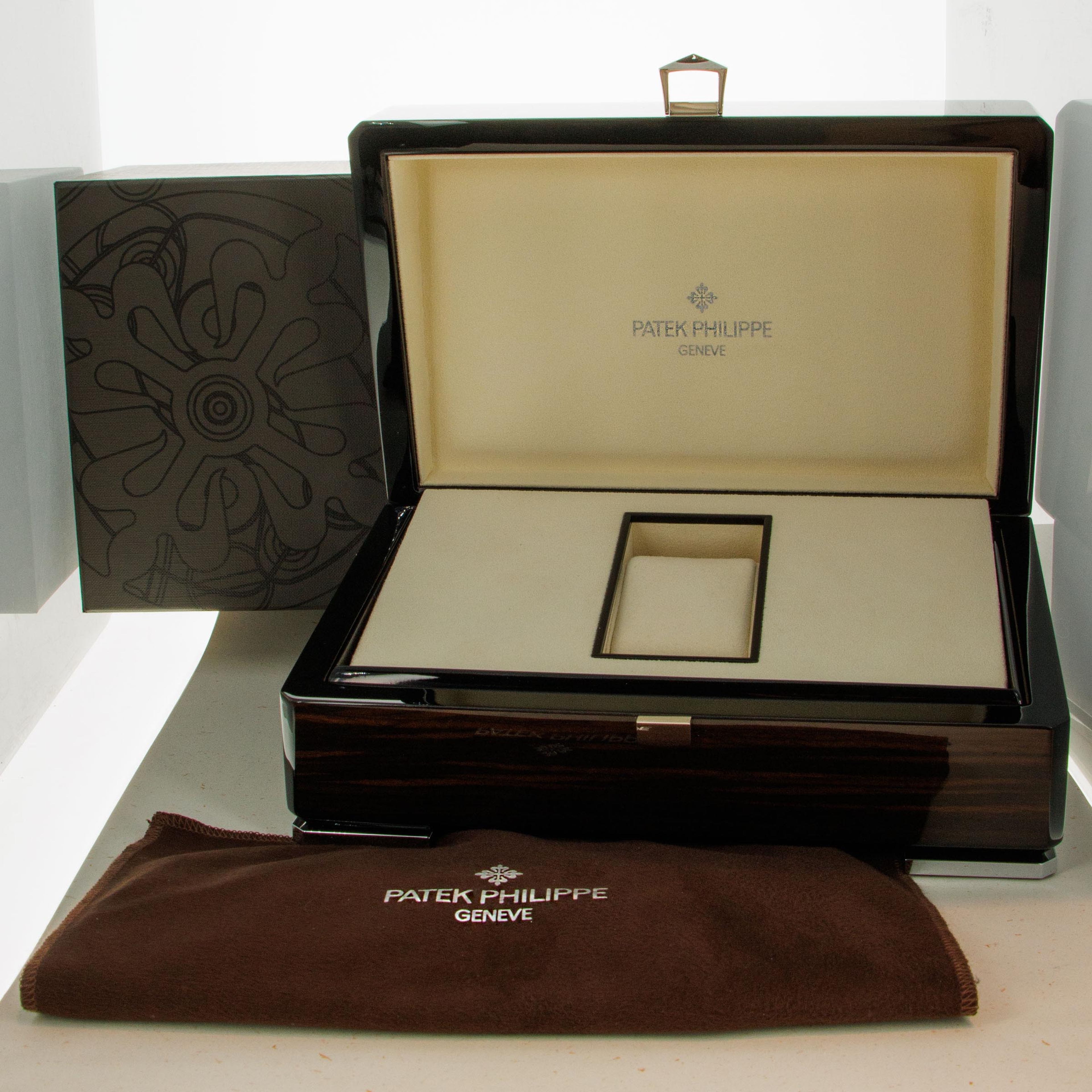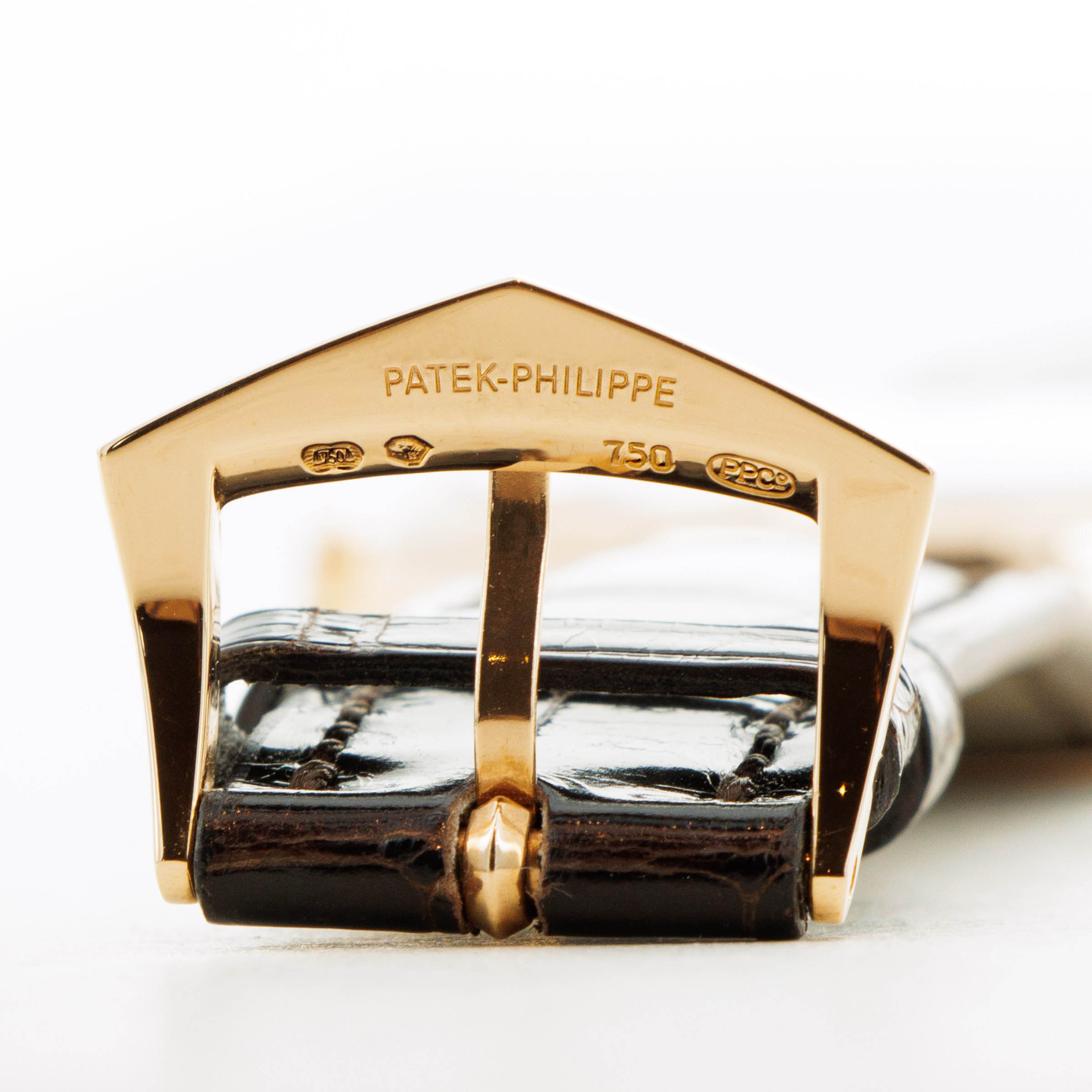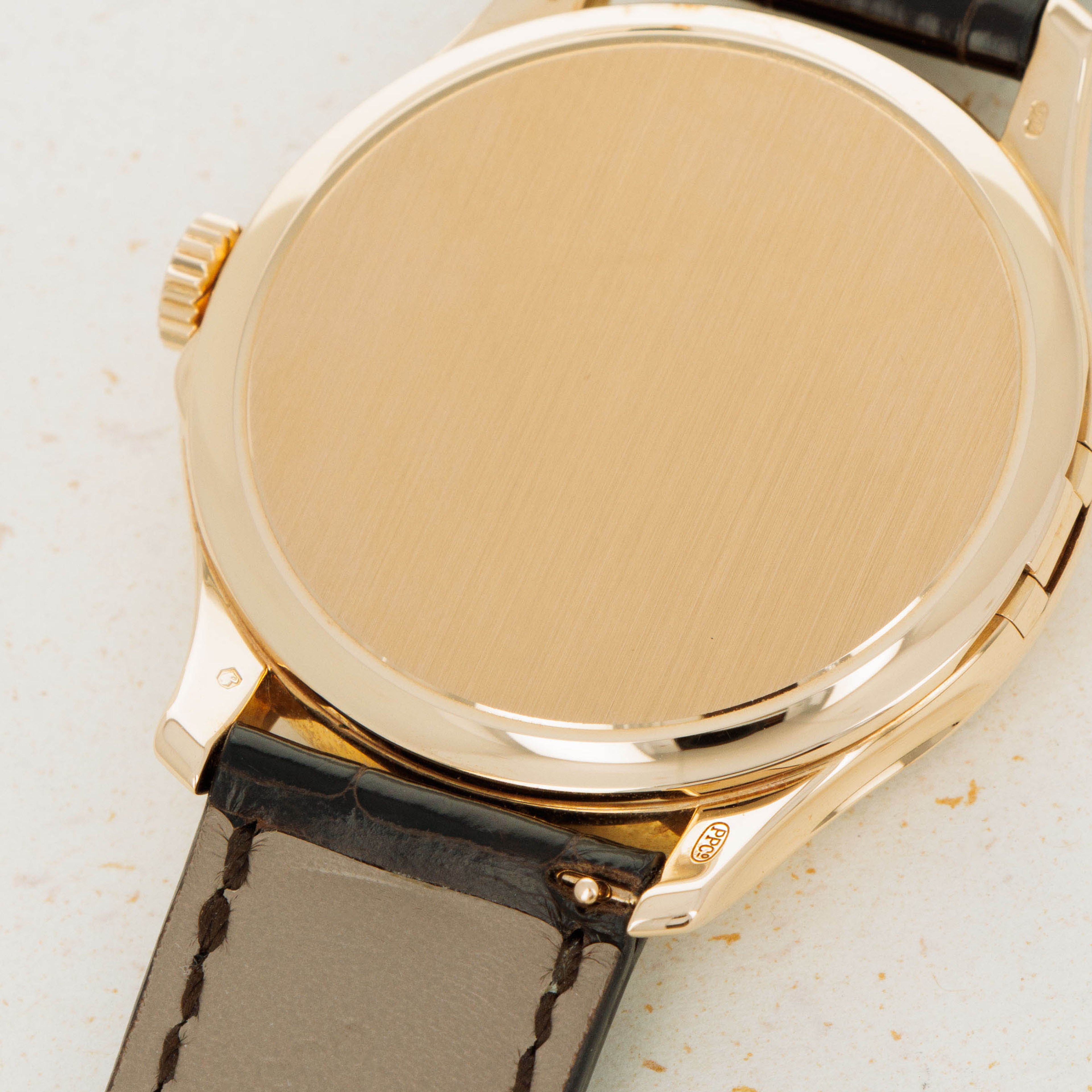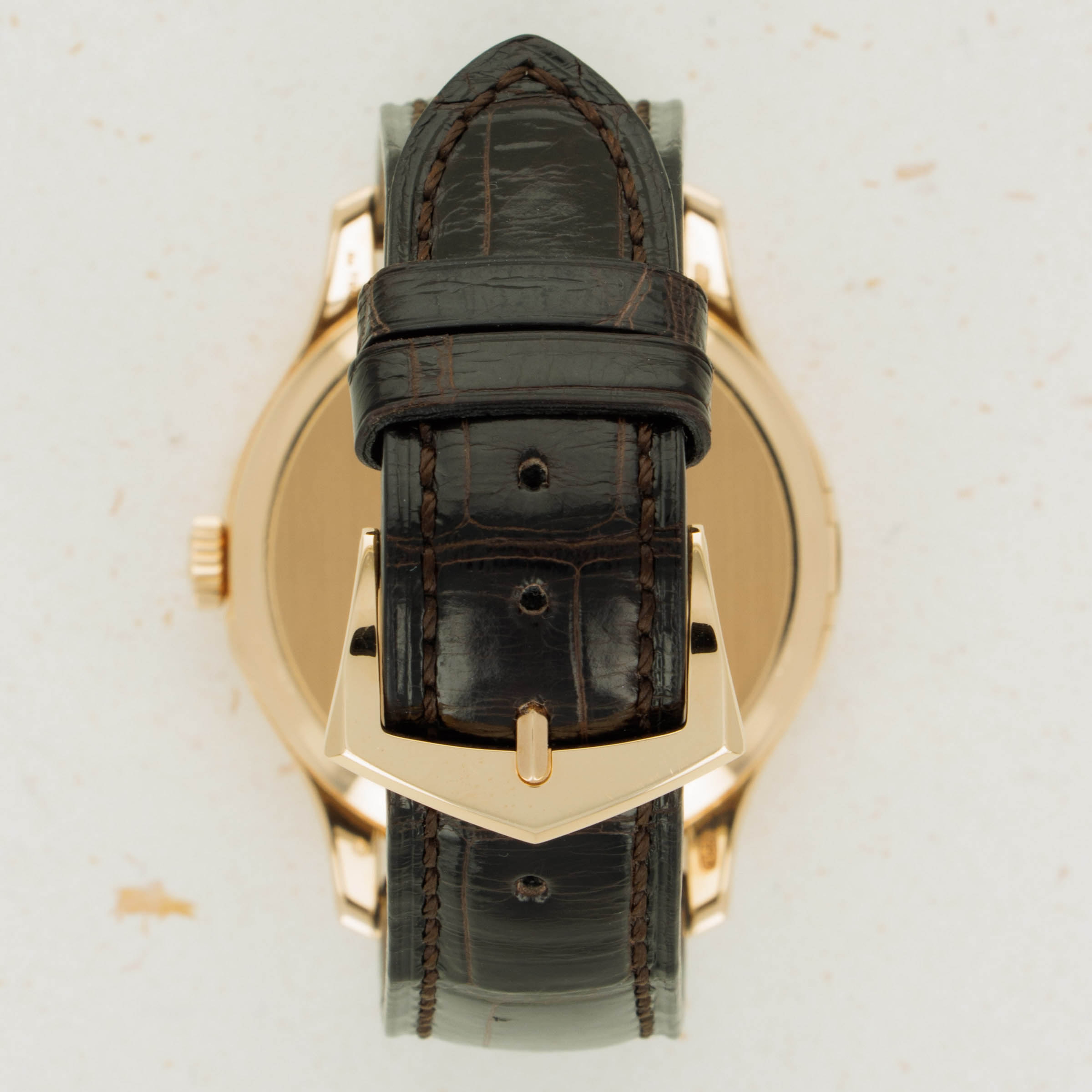 Measuring 39mm in diameter and made of 18kt rose gold, the ref. 5227R features a hefty case indeed. However, with its elegant domed bezel, polished surfaces, and thin 9.24mm profile, it wears with a supreme sense of decorum, as one might expect from Patek.