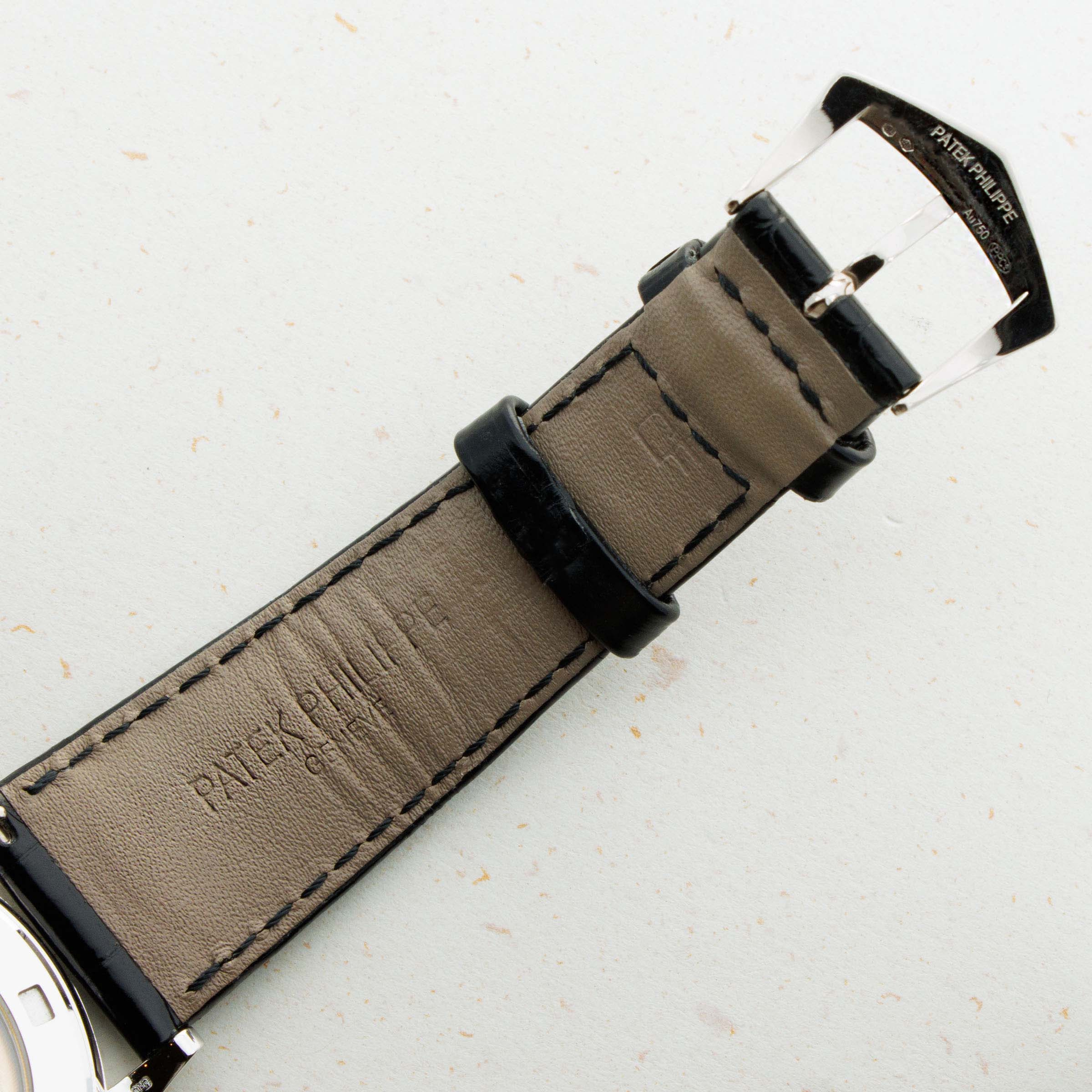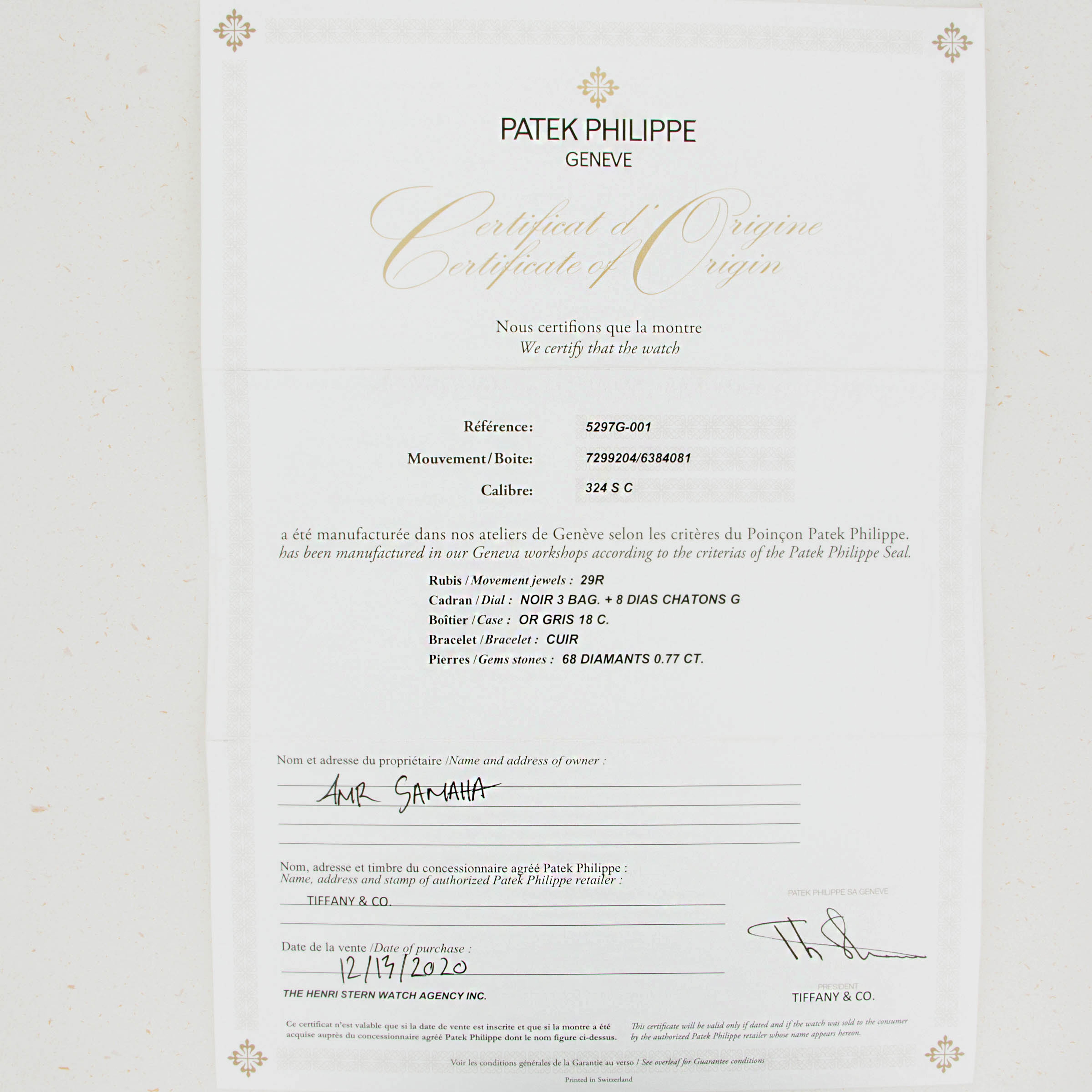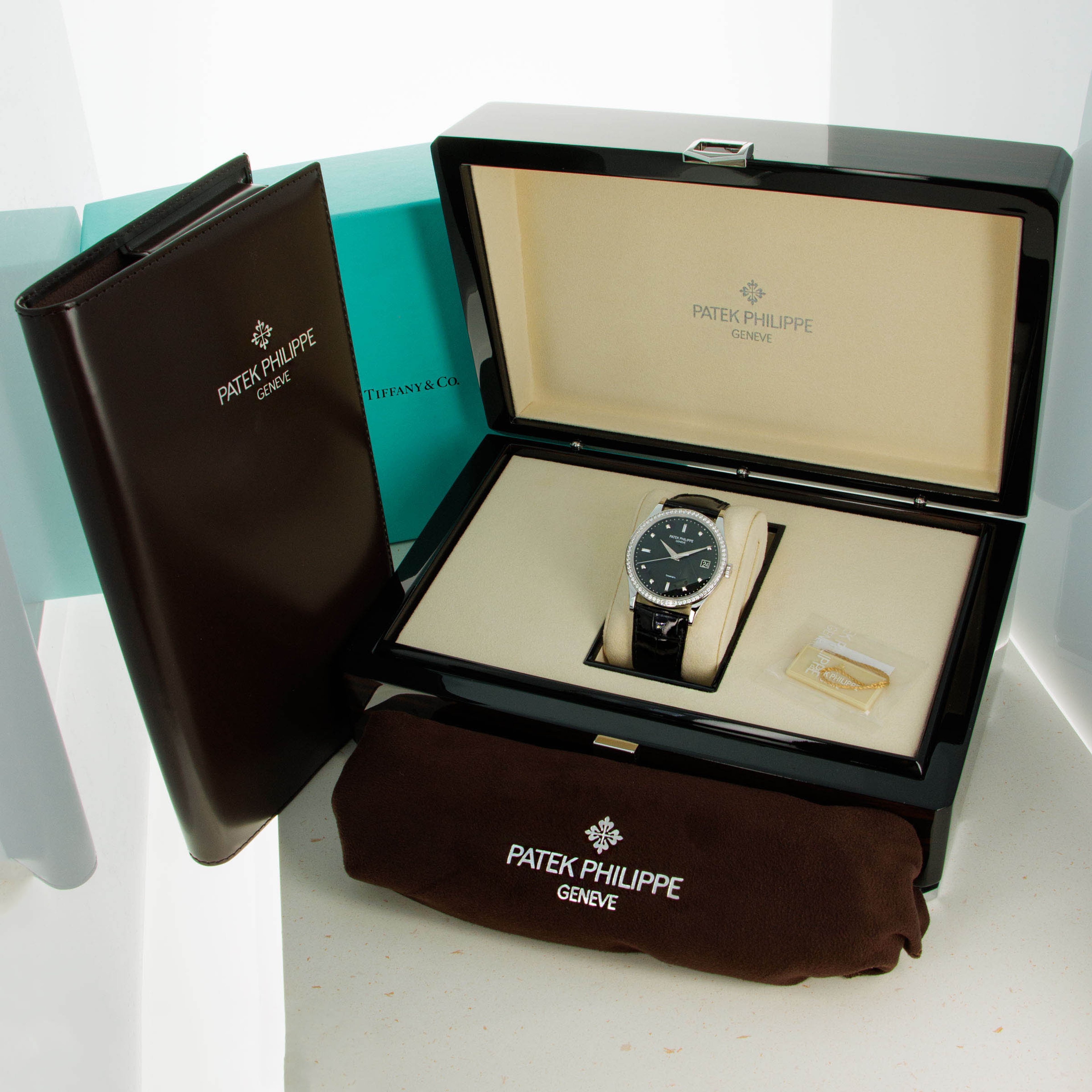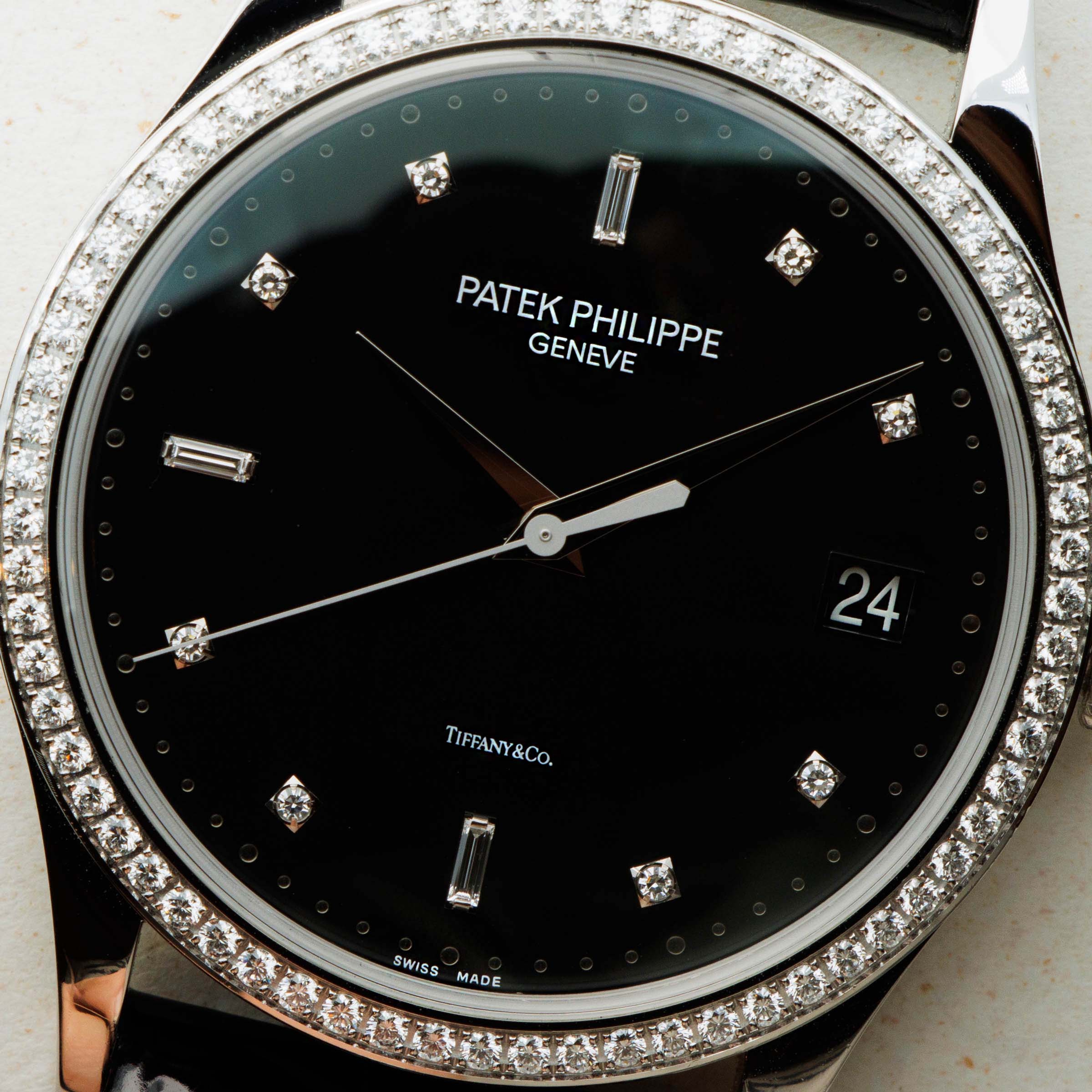 Featuring a beautiful jet black dial that is encircled by a diamond-set bezel with diamond hour markers, this ref. 5297G's true jewel is its rare and elusive Tiffany & Co. stamp.