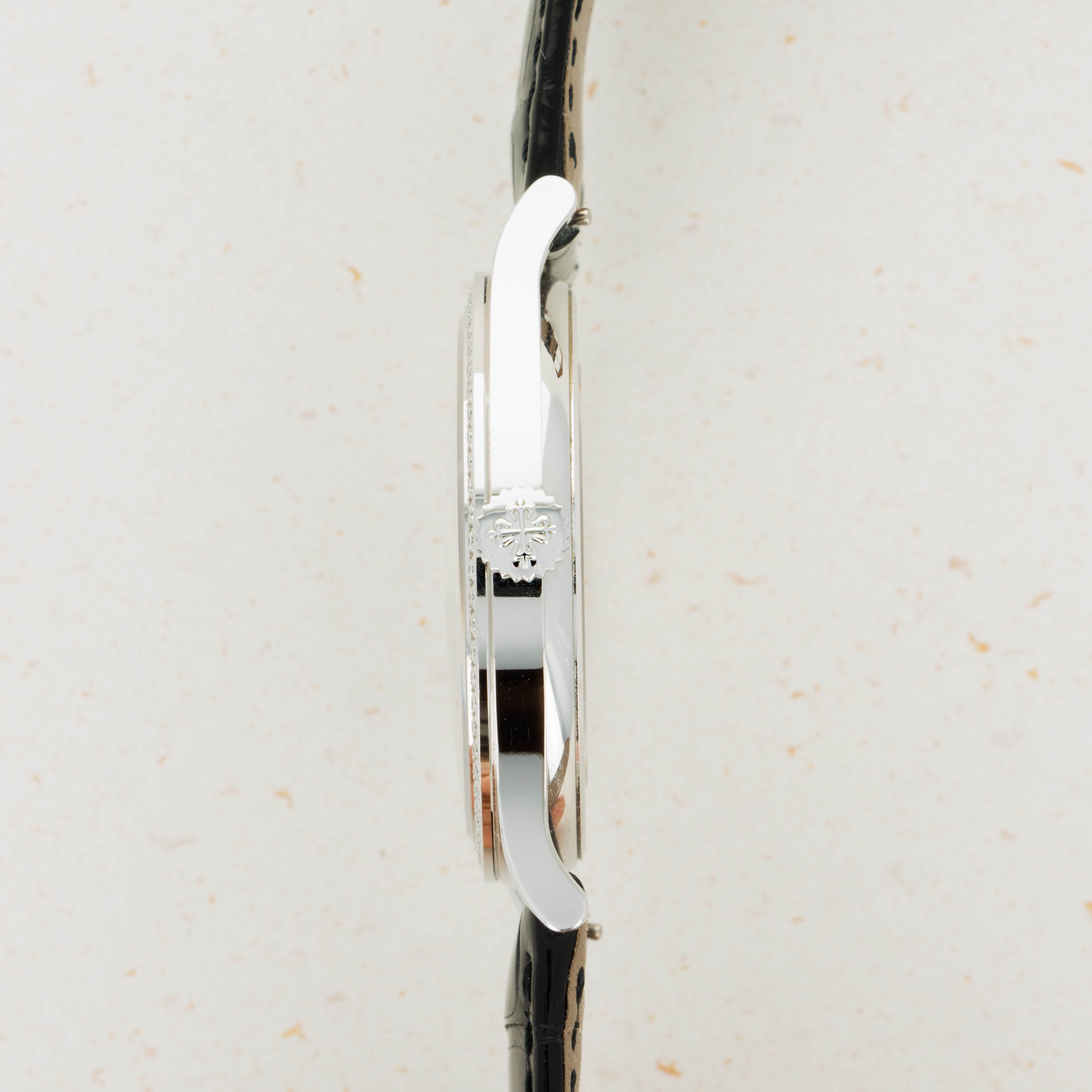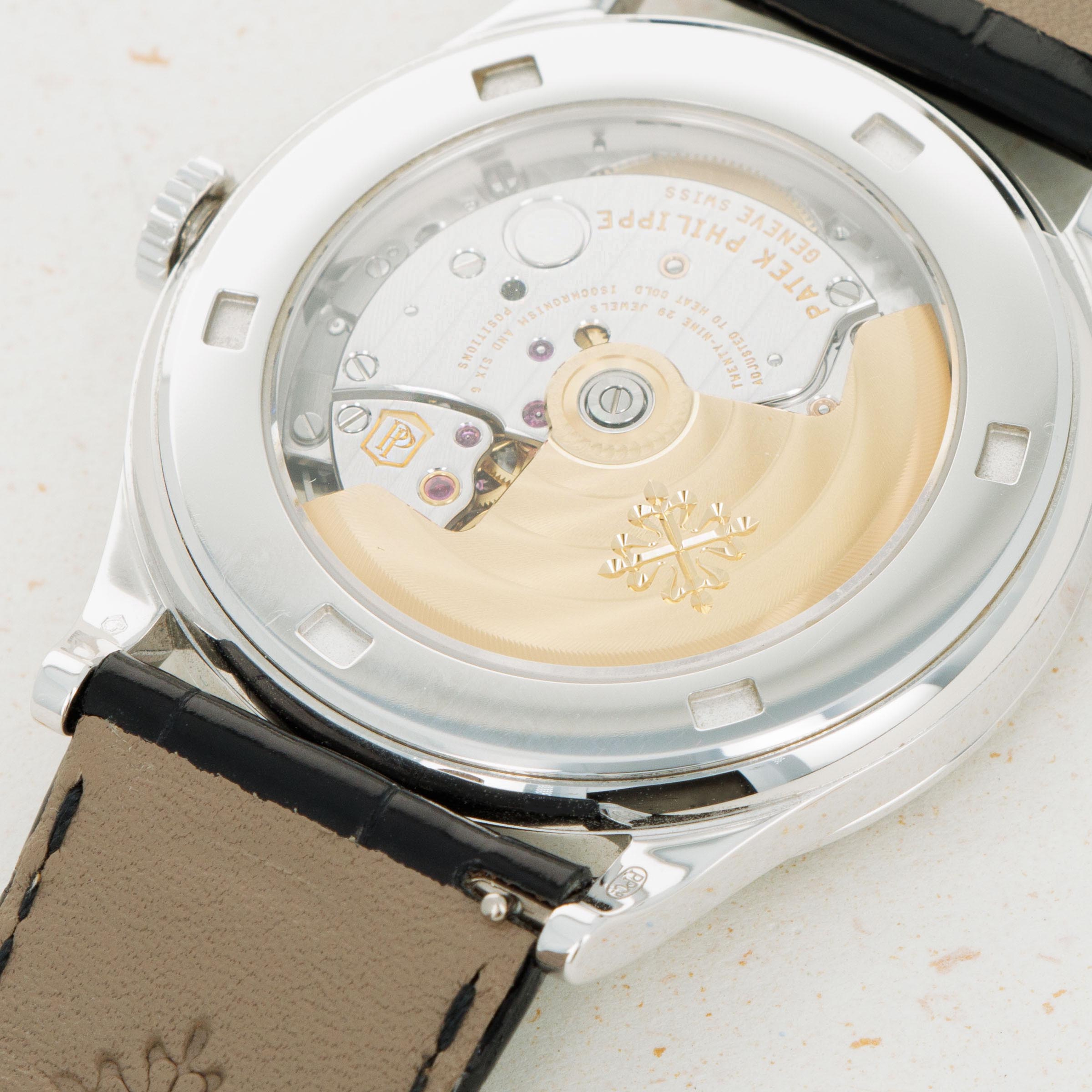 First released in 1932 and named after the cross that the Calatrava Knights paraded around Spain and Portugal during the 12th and 13th centuries, the Patek Philippe Calatrava was released as a simple timepiece with broad appeal that would help secure Patek Philippe's finances following Jean and Charles Henri Stern's investment in the brand in the same year. Designed with a strict Bauhaus-inspired aesthetic in mind, the Calatrava used, and continues to use, simplicity as its means of establishing intrigue around the craftsmanship required to construct such a stunning timepiece. Without a complicated movement or a busy design, collectors gravitate towards the Calatrava's clean aesthetic and practicality. The ref. 5297G that we have here plays on this elegant design while also featuring a diamond-set bezel and a diamond-set dial that elevate its aesthetic into the realm of exclusive luxury. Consgructed of 18kt white gold and featuring a black dial, the ref. 5297G is monochromatic with its diamonds providing a pop of opulence that sets it as a truly spectacular timepiece. However, while the ref. 5297G is already incredibly exclusive and luxurious, the example we have here was not only retailed by Tiffany & Co., the famed US jewelers, it is also co-signed with their branding at 6 o’clock, a truly elusive detail that very few examples boast.