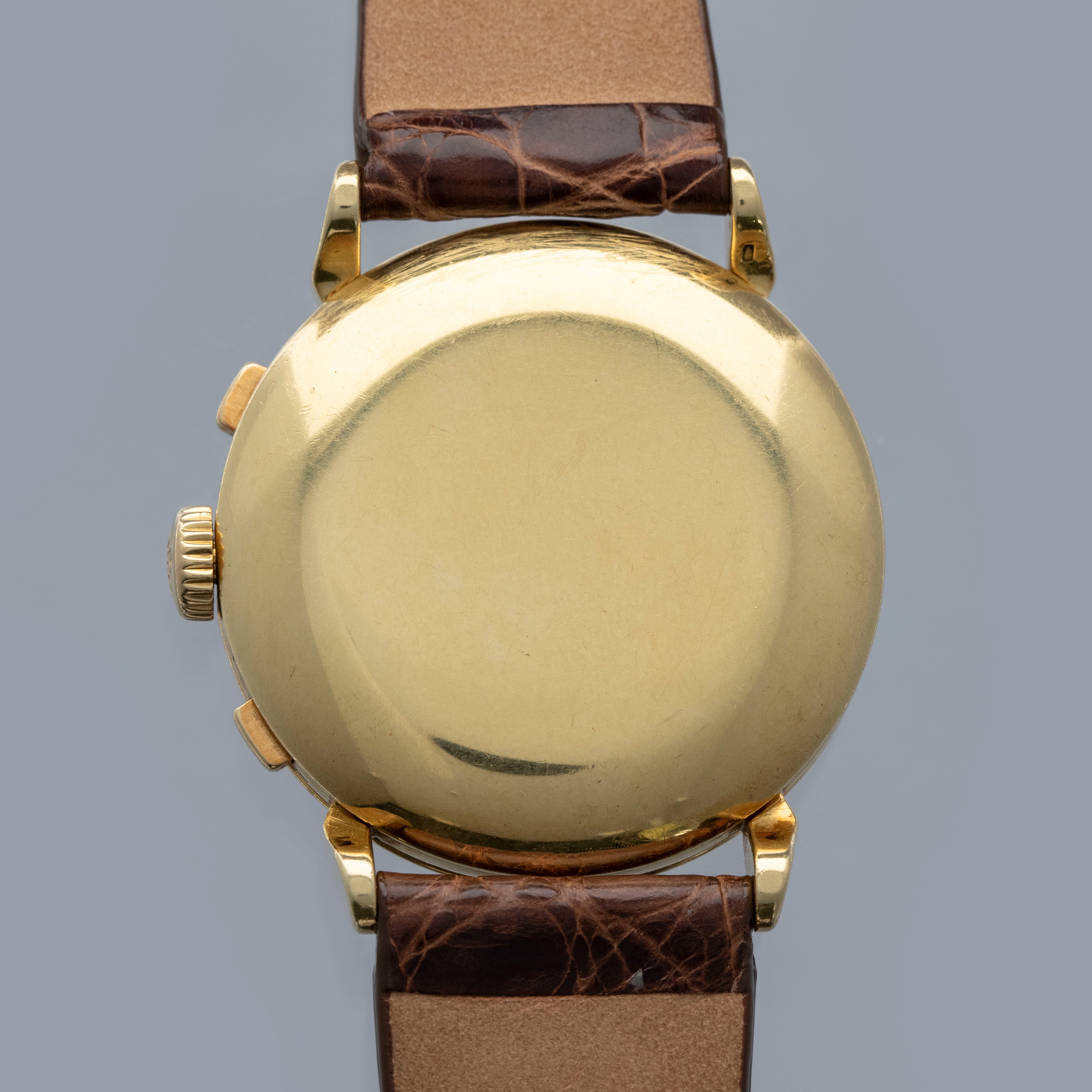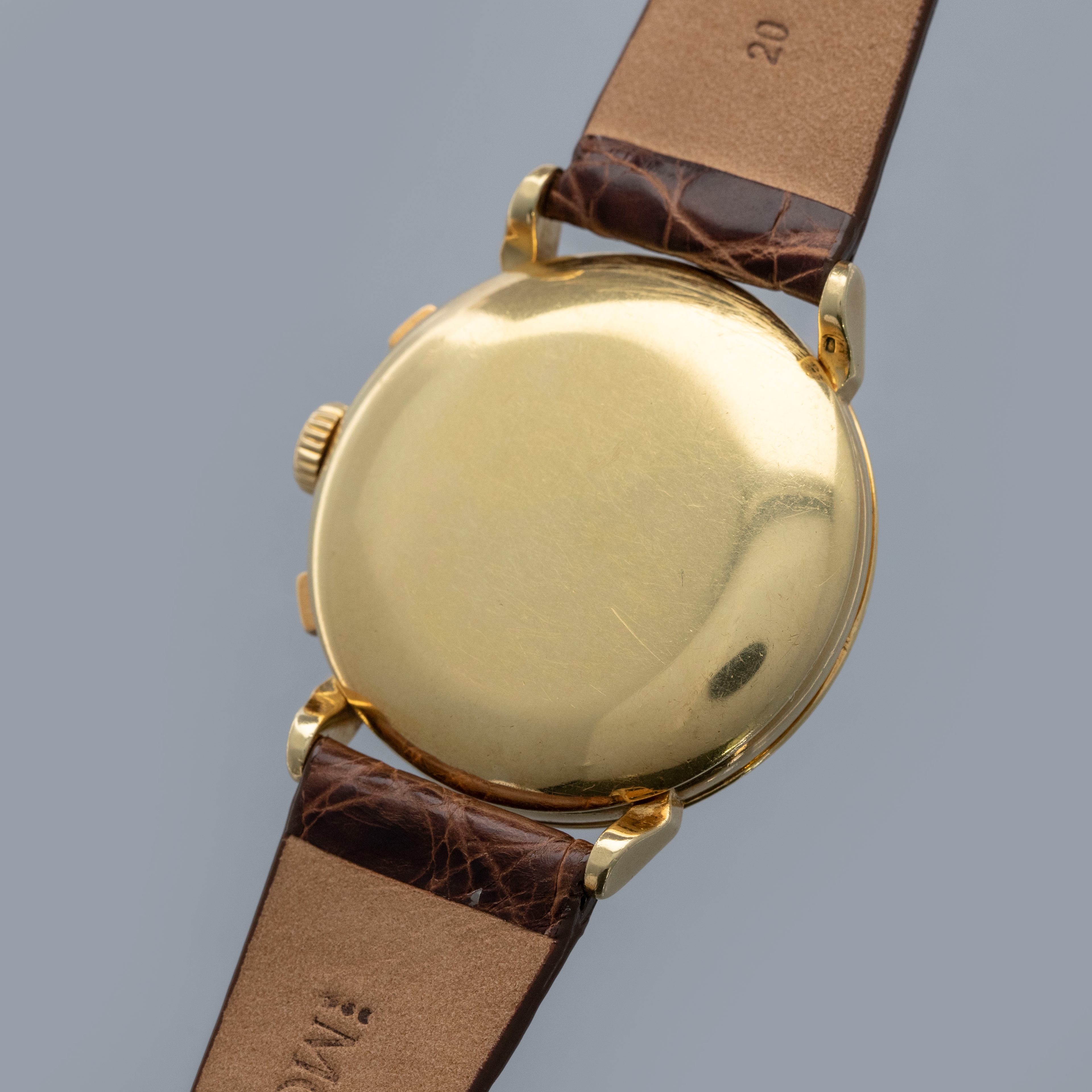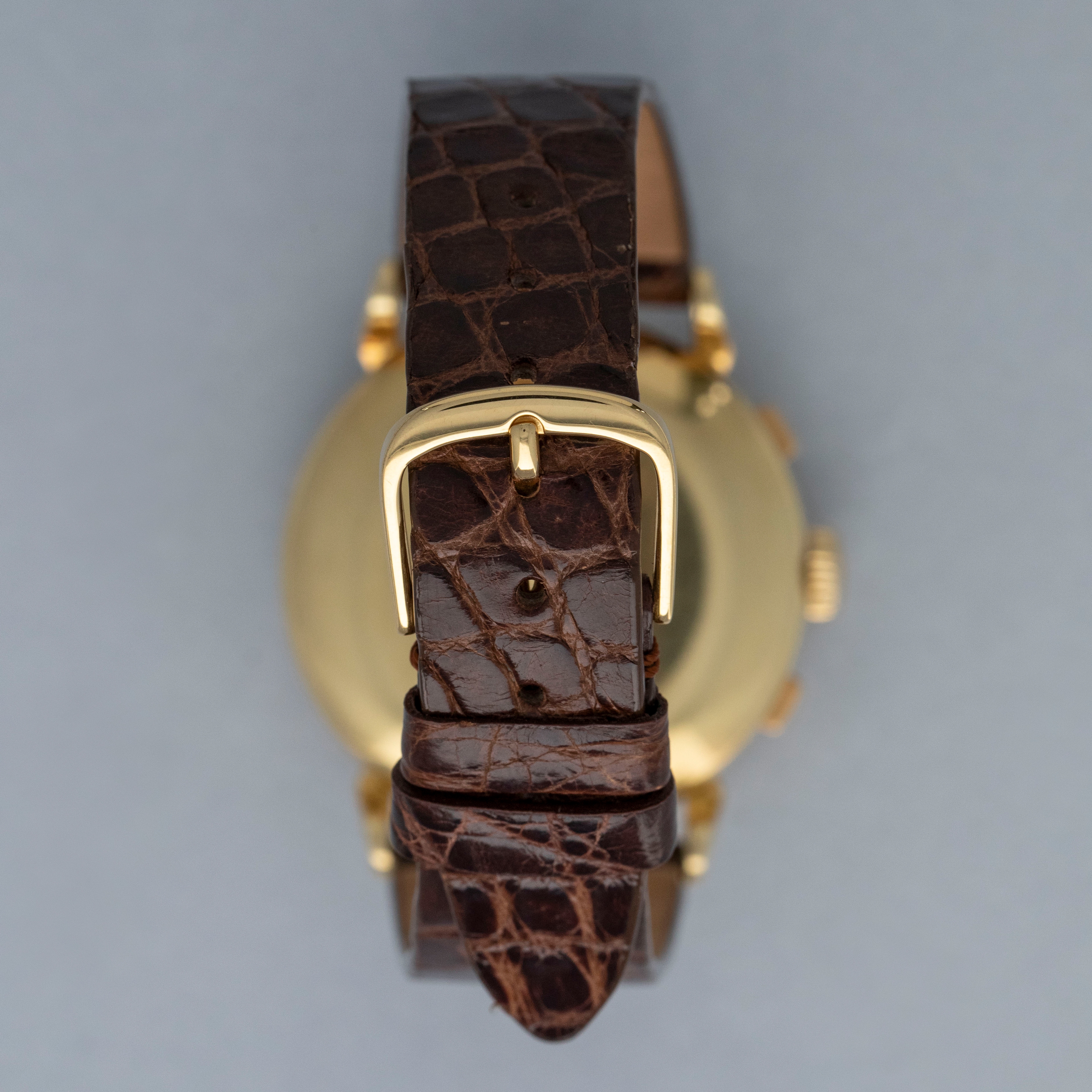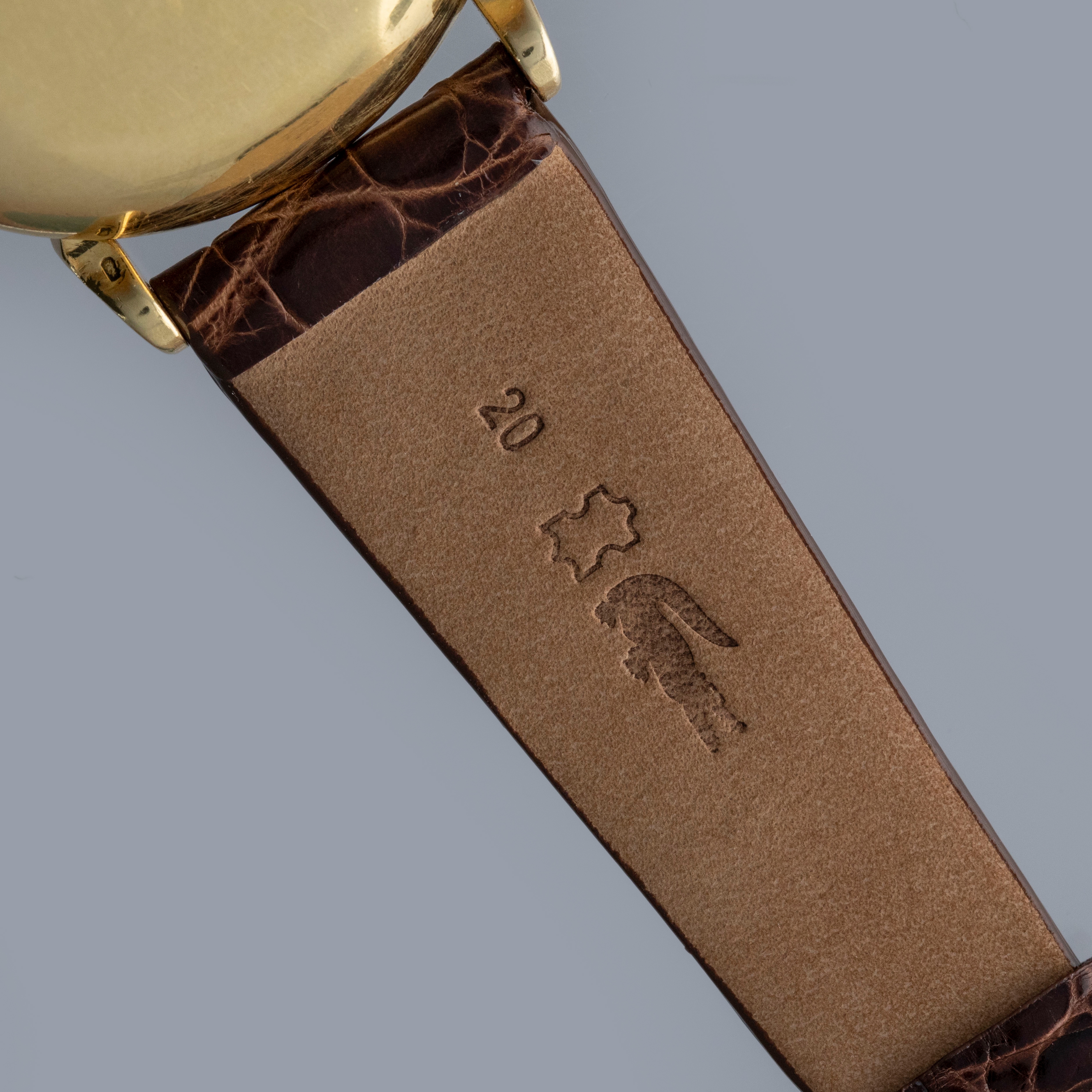 Watch is in overall excellent condition. The yellow gold case shows some scratches and small nicks, with a well-defined hallmark on the back of the lug. The winding crown and pushers show light wear. The dial is near mint, with only a couple of minor surface marks and very clean hands. Enameling is raised, and the signature on the dial is strong and well defined. Fitted with a brown crocodile strap with yellow gold-plated pin buckle. Please note that the watch ticks at time of cataloguing, but timekeeping is poor and a service is recommended.