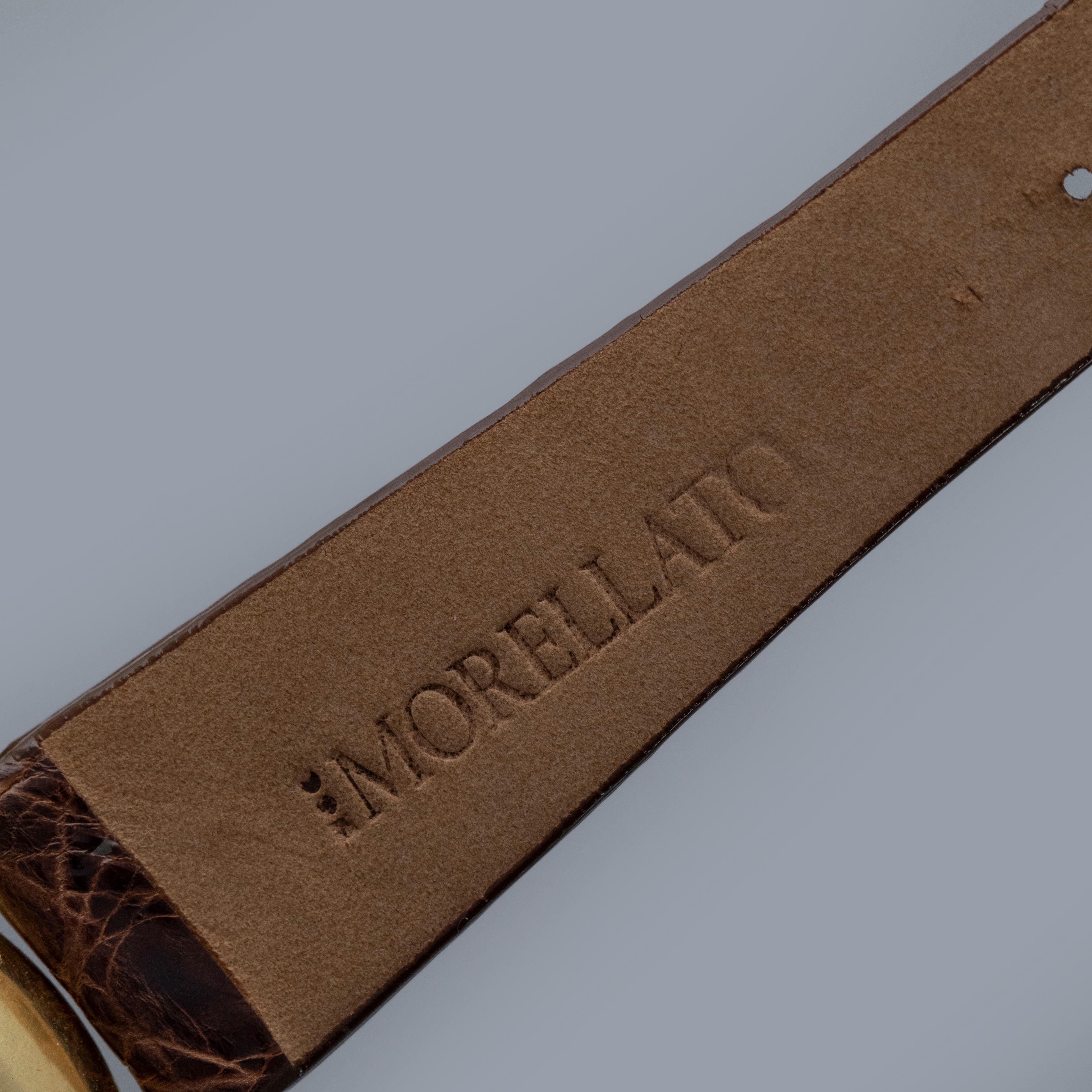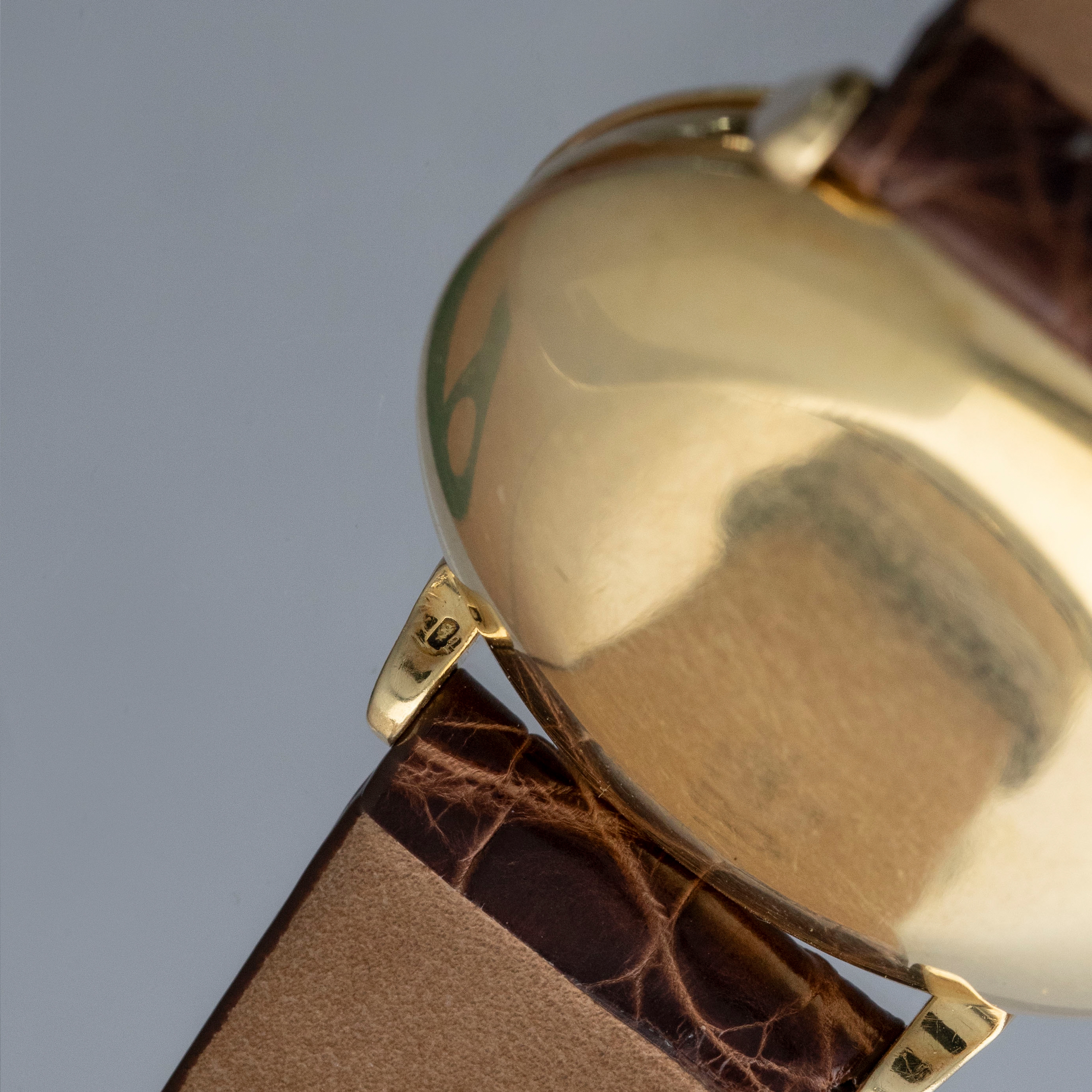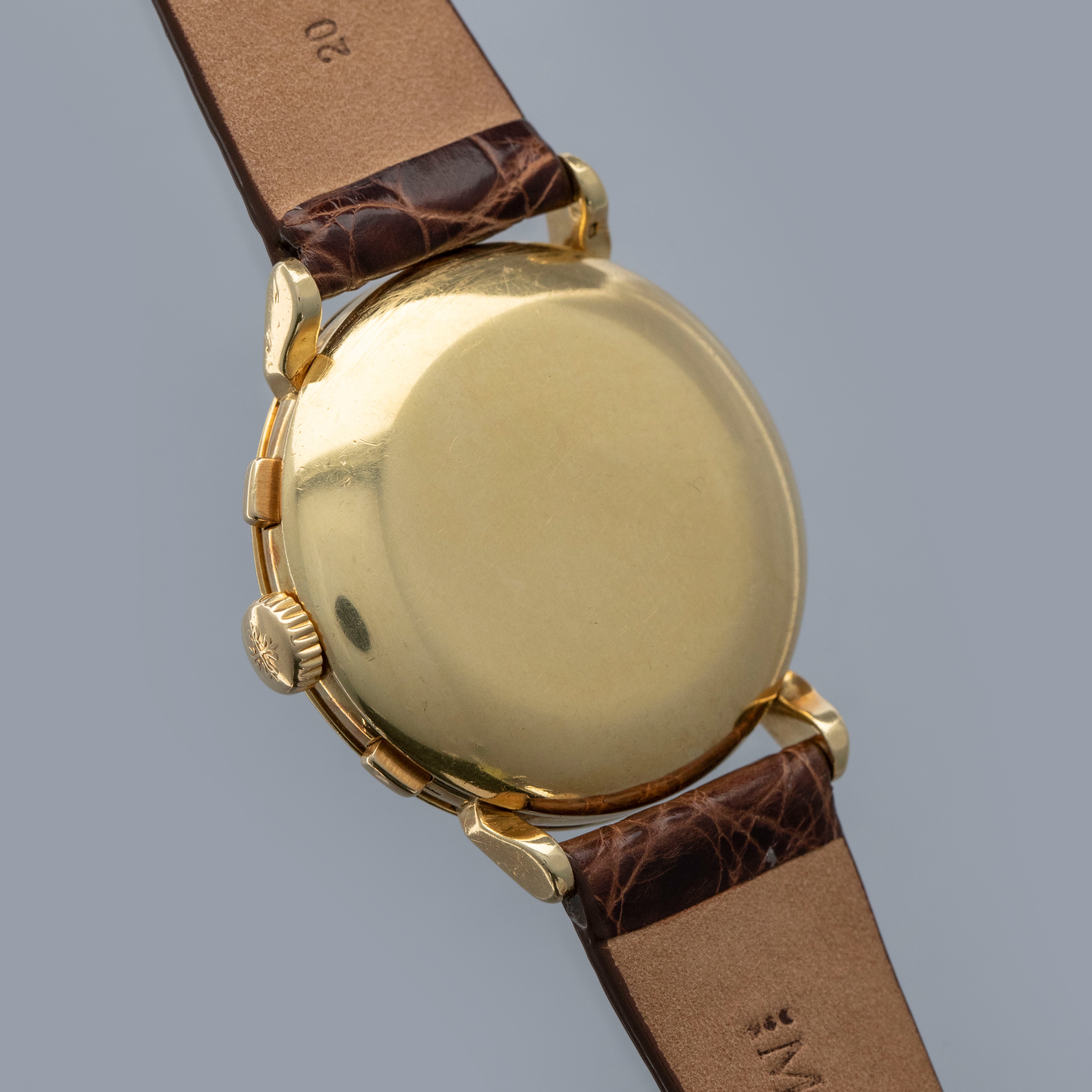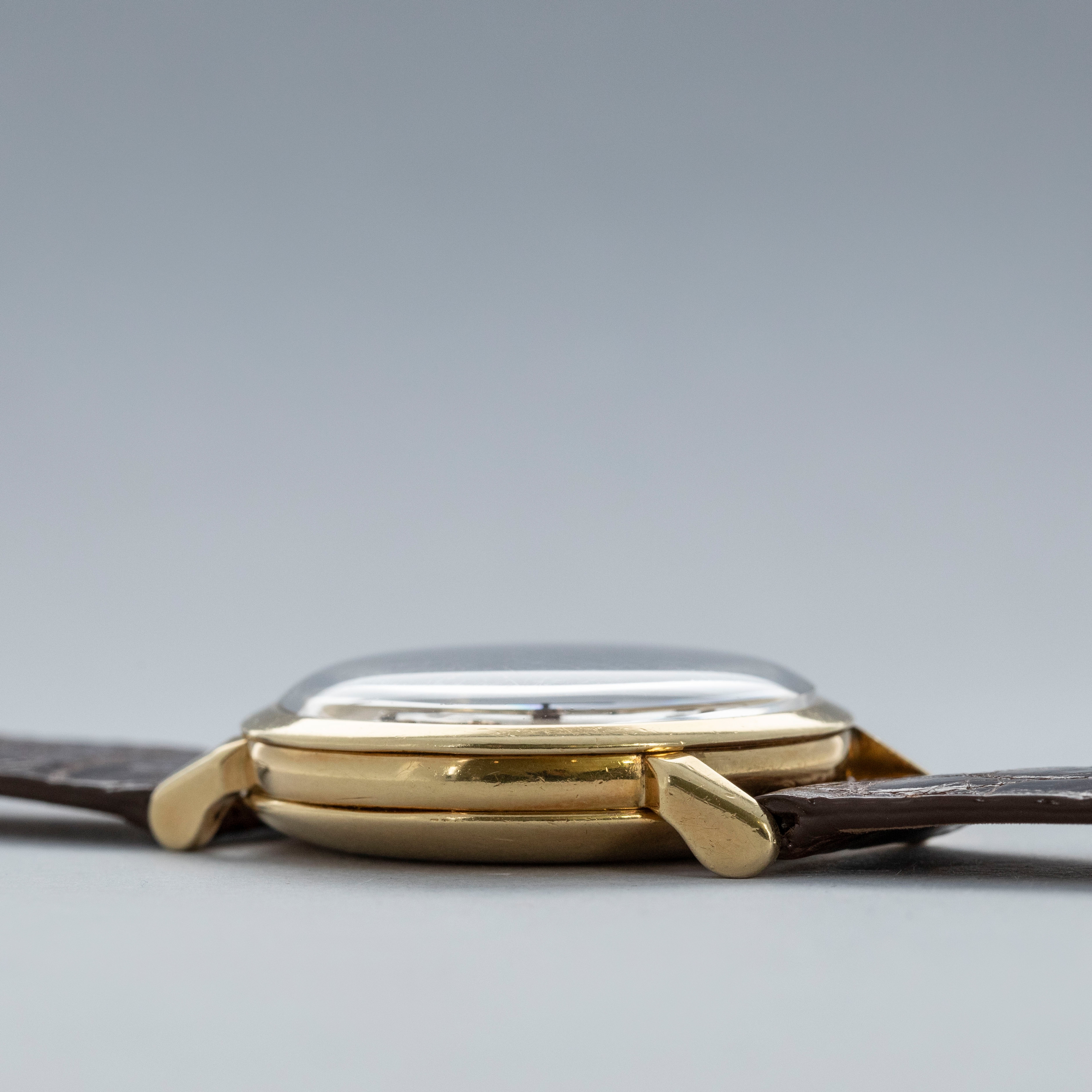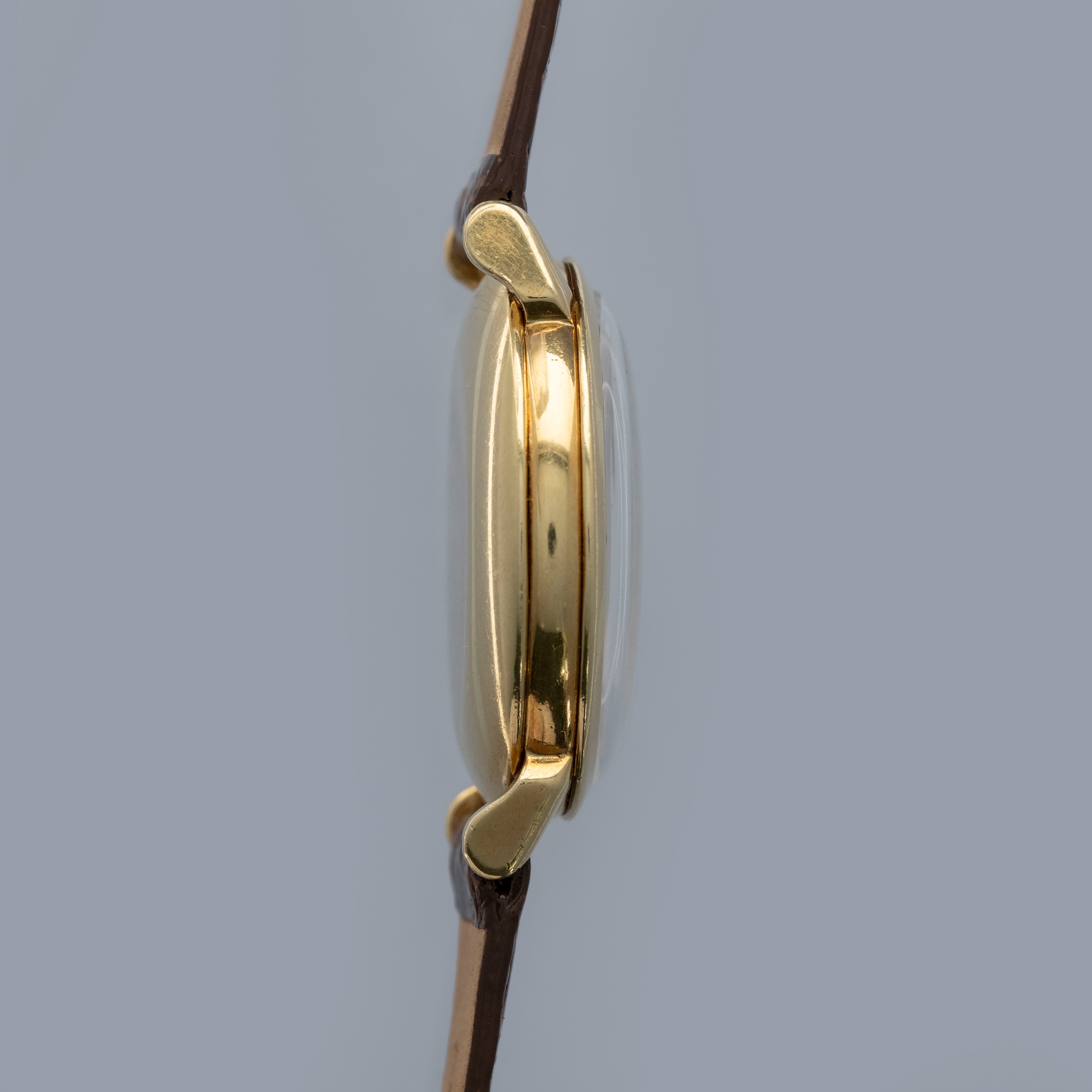 Watch is in overall excellent condition. The yellow gold case shows some scratches and small nicks, with a well-defined hallmark on the back of the lug. The winding crown and pushers show light wear. The dial is near mint, with only a couple of minor surface marks and very clean hands. Enameling is raised, and the signature on the dial is strong and well defined. Fitted with a brown crocodile strap with yellow gold-plated pin buckle. Please note that the watch ticks at time of cataloguing, but timekeeping is poor and a service is recommended.
