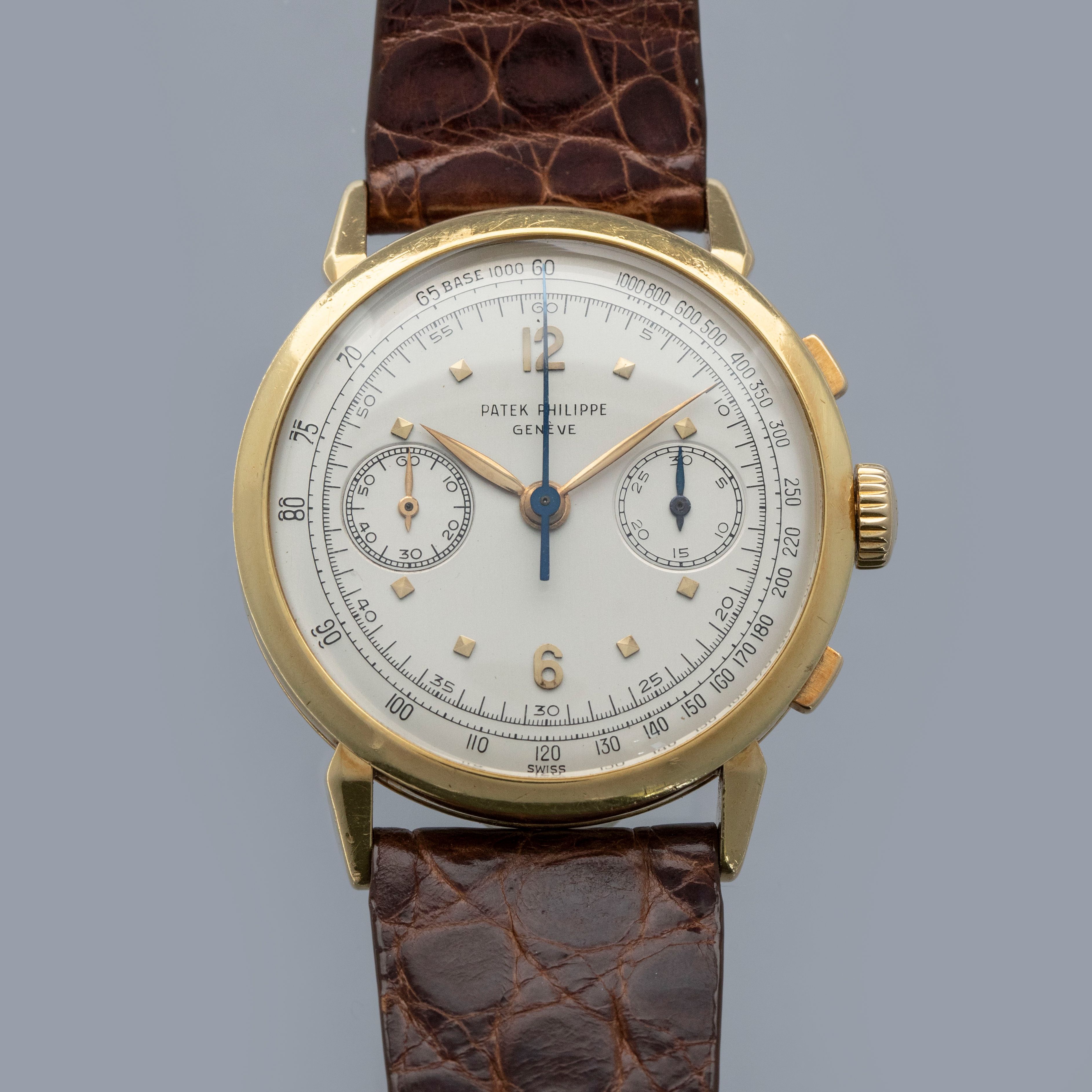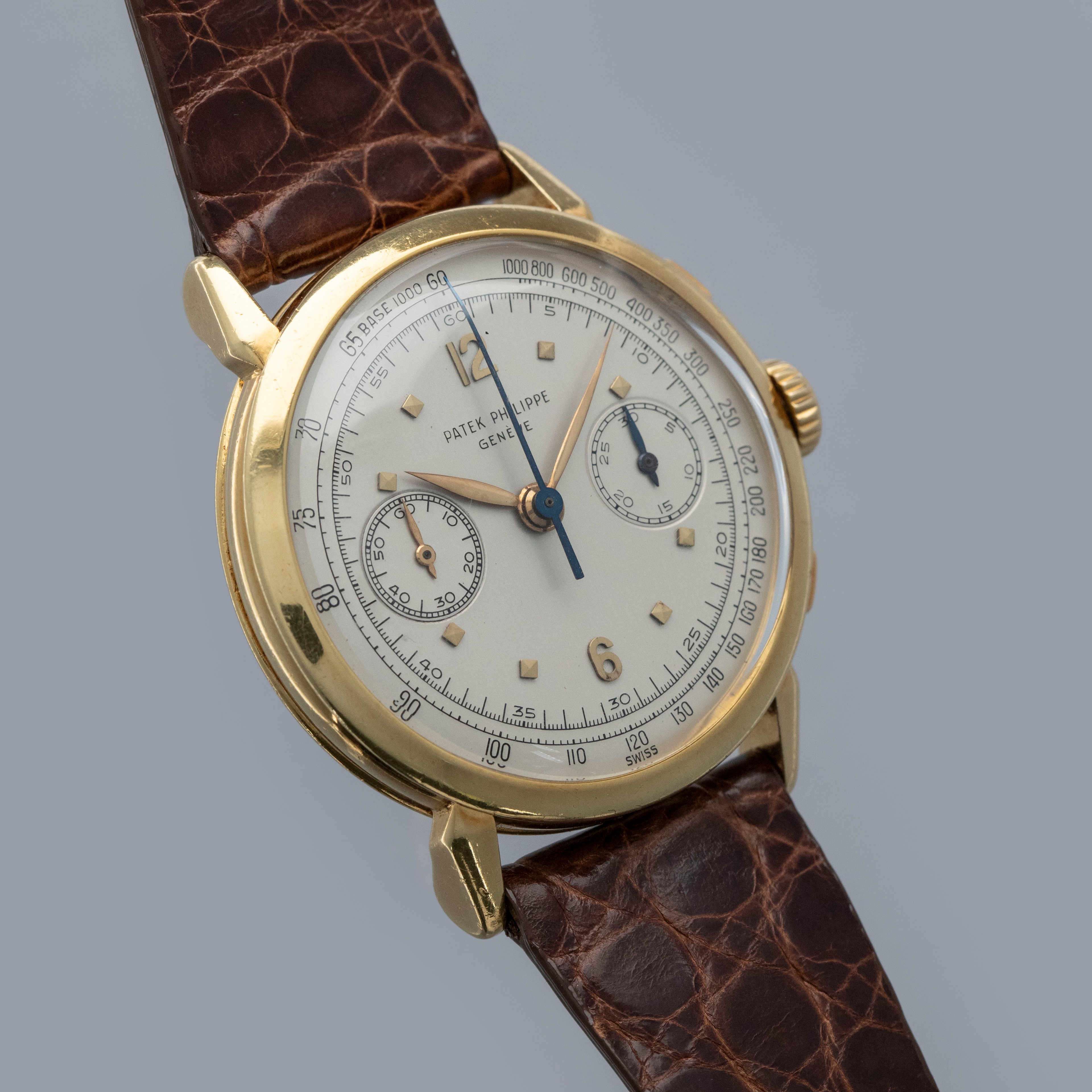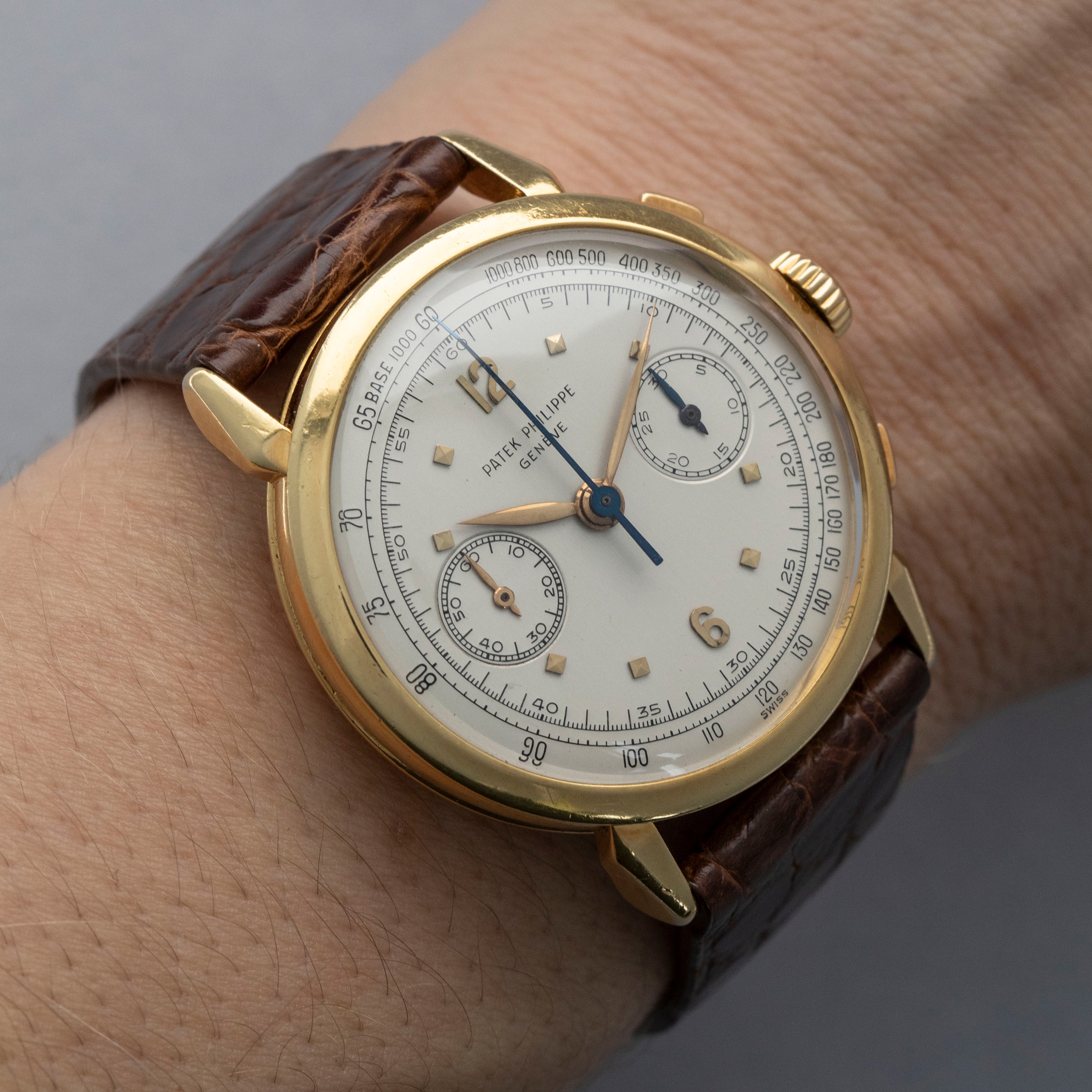 There are very few names in the world of watch collecting that get seasoned watch collectors as excited as Patek Philippe, and that's for a good reason. With one of the most influential histories in all of watchmaking, Patek Philippe is genuinely beyond their peers, and offered here we have one of their most historically significant chronograph models, the ref. 1579. Released in 1943, the ref. 1579 was one of Patek's largest chronograph models at 36mm in diameter and remained in Patek's catalog until it was discontinued in 1964. The ref. 1579 is iconic for its unusual briolette lug shape, incredibly open and legible dial, and thick flat bezel that surrounds the crystal. These downturned angular lugs are known as "spider" lugs and frame the ref. 1579's round dial nicely by breaking up the flow of the perfectly circular case. While the ref. 1579 was in production for 21 years; it is still an incredibly rare watch. Made predominately in yellow gold, only a few hundred examples are known to exist. Released in two series, the first series was produced from 1943 to 1949 and features Arabic and baton numerals and either baton or Feuille hands. The second series was produced from 1950 to 1964 and featured Arabic and square numerals and Feuille hands, as feature on our beautiful silver dialled example.