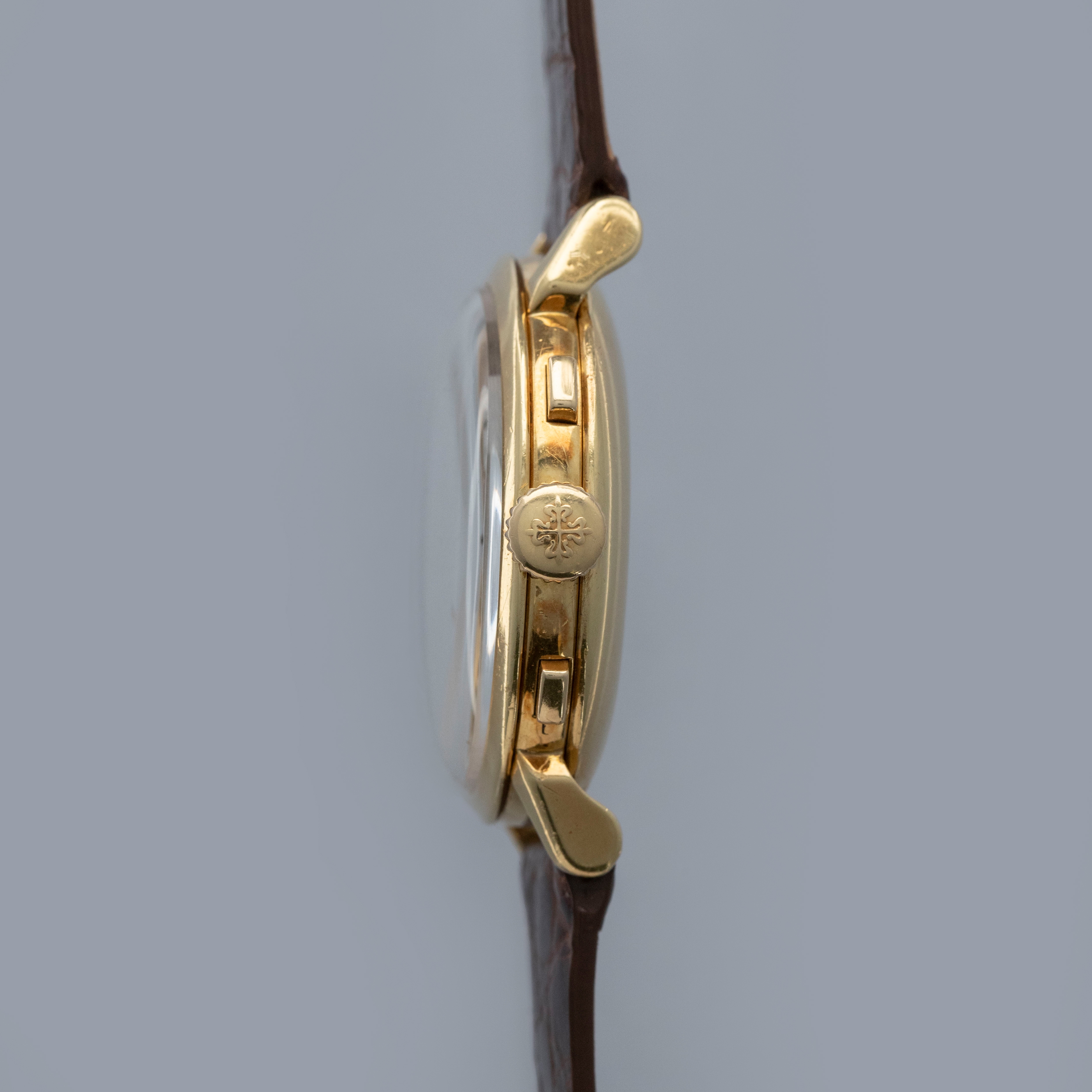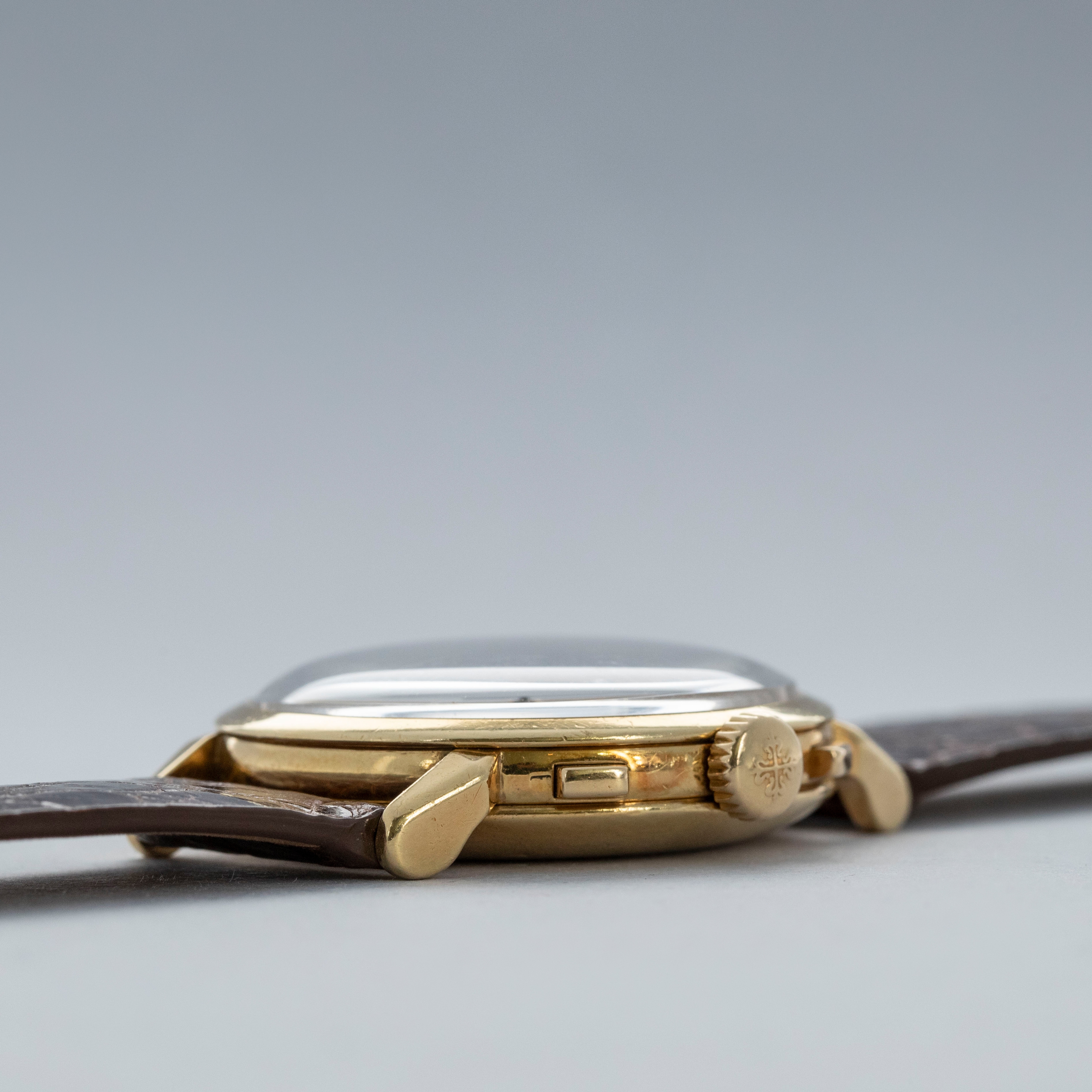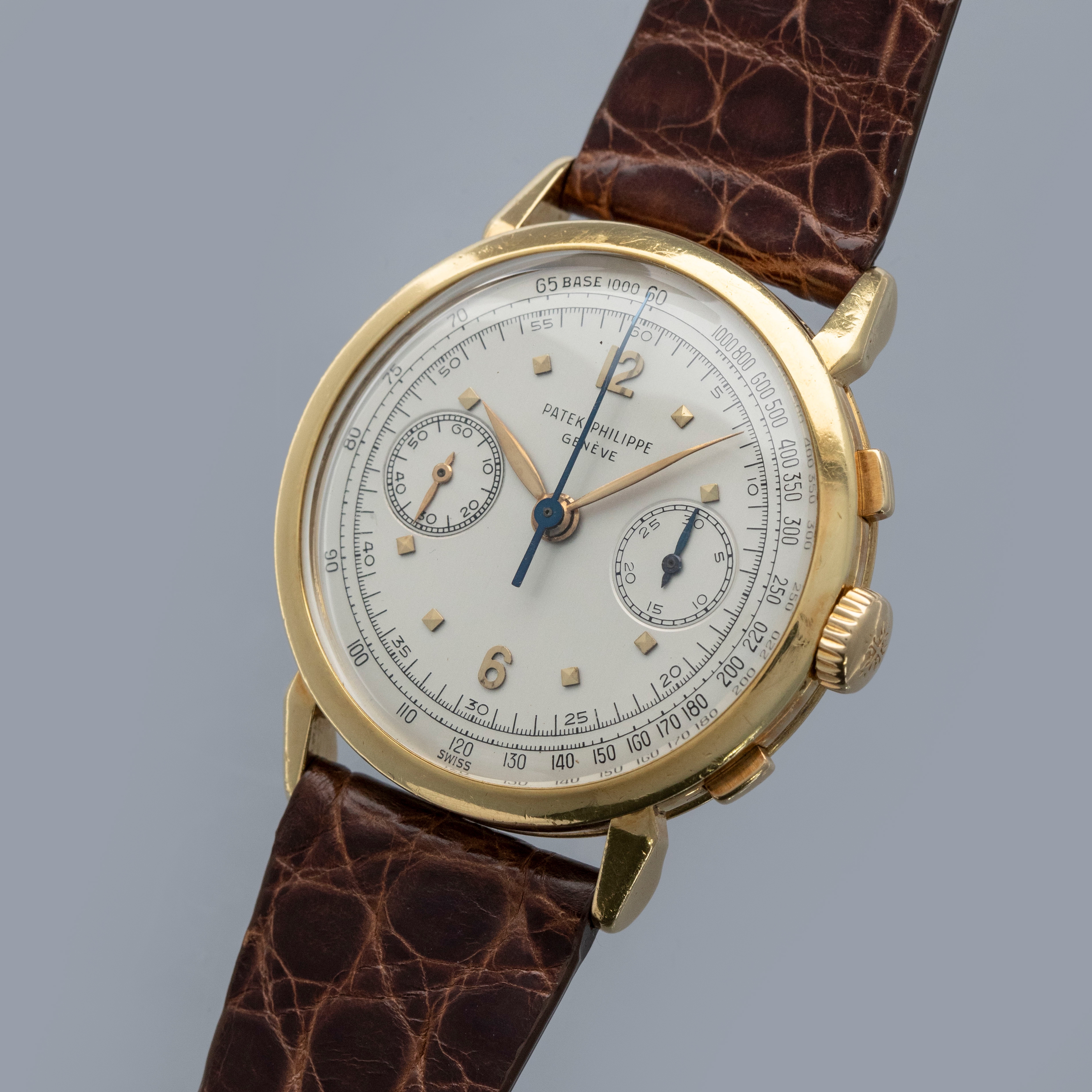 There are very few names in the world of watch collecting that get seasoned watch collectors as excited as Patek Philippe, and that's for a good reason. With one of the most influential histories in all of watchmaking, Patek Philippe is genuinely beyond their peers, and offered here we have one of their most historically significant chronograph models, the ref. 1579. Released in 1943, the ref. 1579 was one of Patek's largest chronograph models at 36mm in diameter and remained in Patek's catalog until it was discontinued in 1964. The ref. 1579 is iconic for its unusual briolette lug shape, incredibly open and legible dial, and thick flat bezel that surrounds the crystal. These downturned angular lugs are known as "spider" lugs and frame the ref. 1579's round dial nicely by breaking up the flow of the perfectly circular case. While the ref. 1579 was in production for 21 years; it is still an incredibly rare watch. Made predominately in yellow gold, only a few hundred examples are known to exist. Released in two series, the first series was produced from 1943 to 1949 and features Arabic and baton numerals and either baton or Feuille hands. The second series was produced from 1950 to 1964 and featured Arabic and square numerals and Feuille hands, as feature on our beautiful silver dialled example.