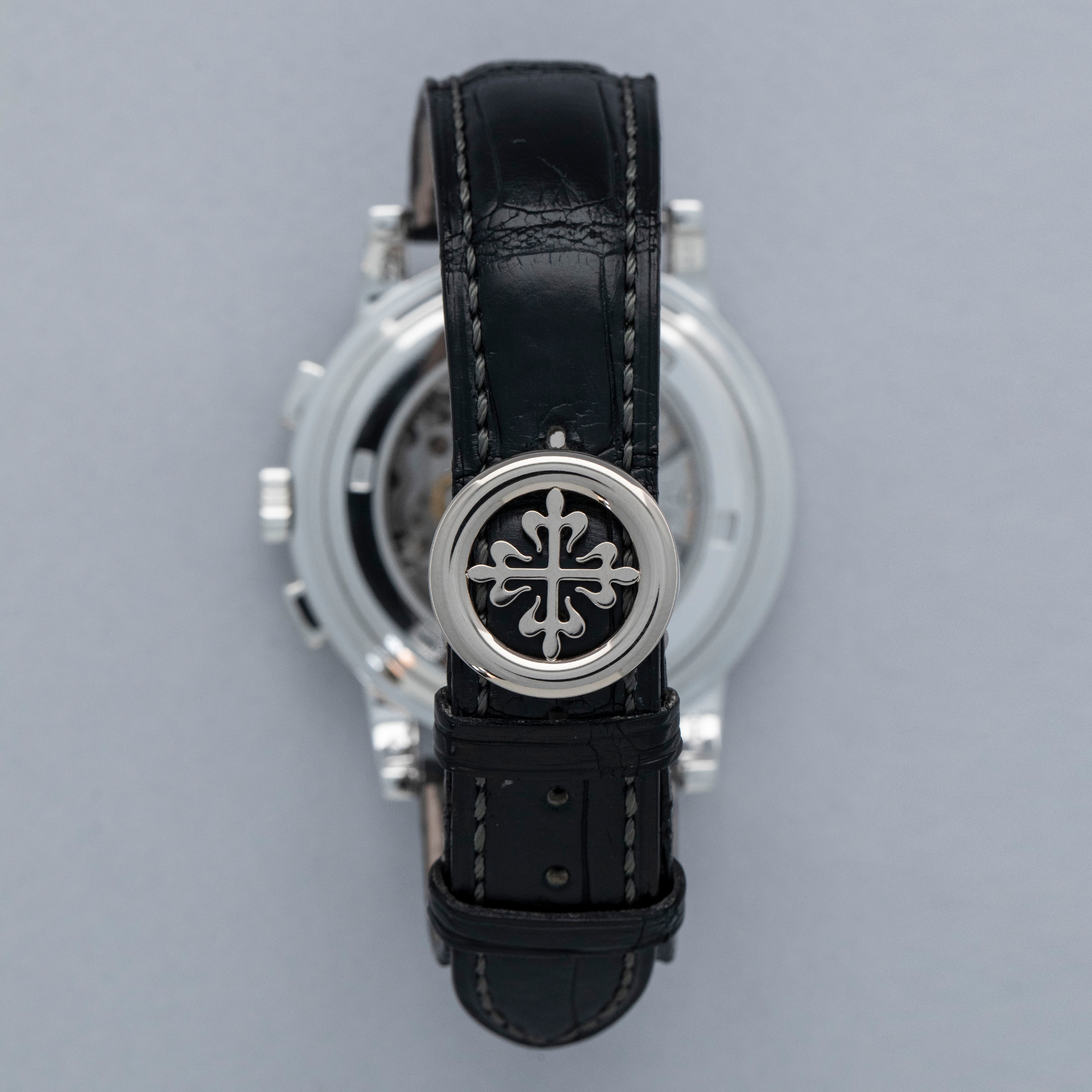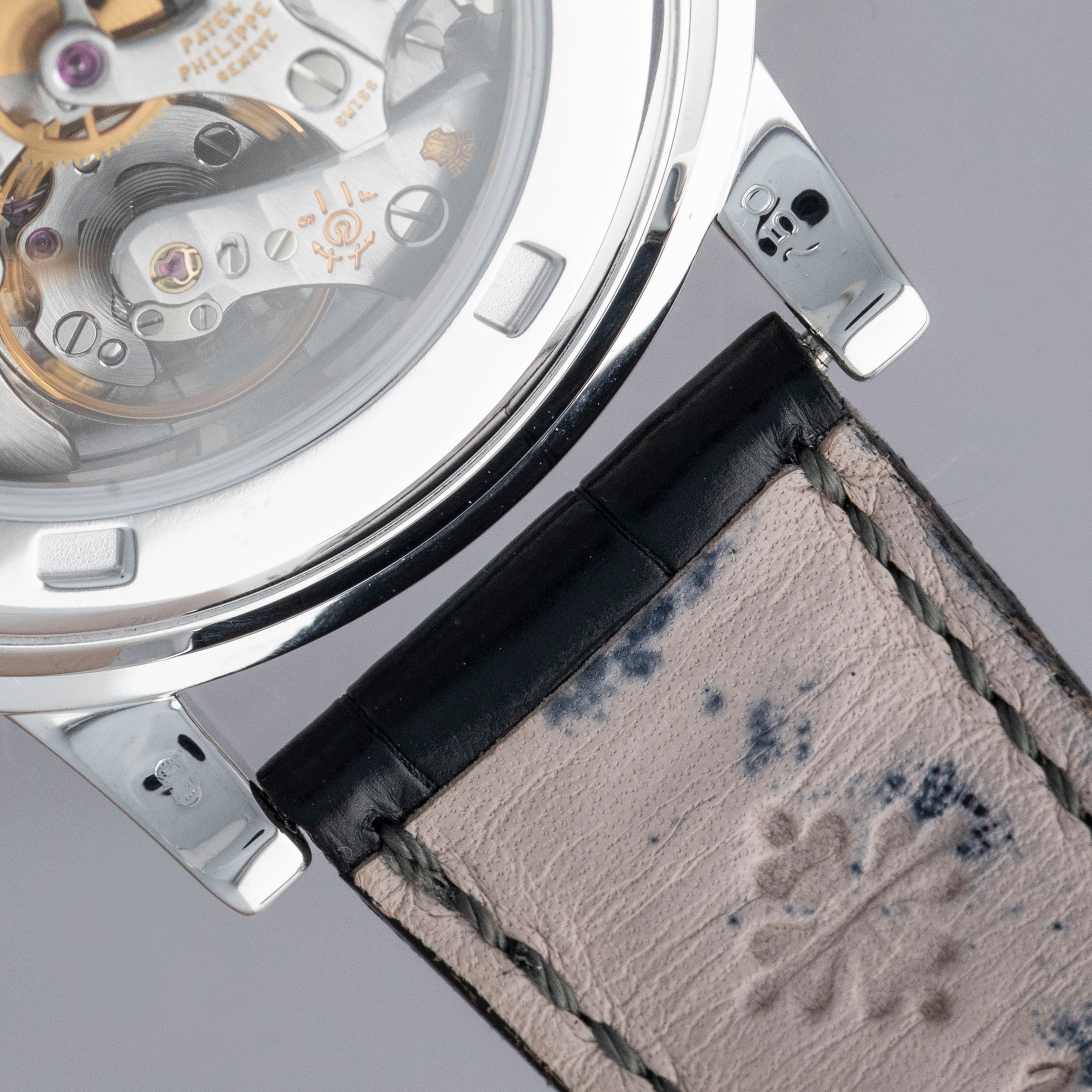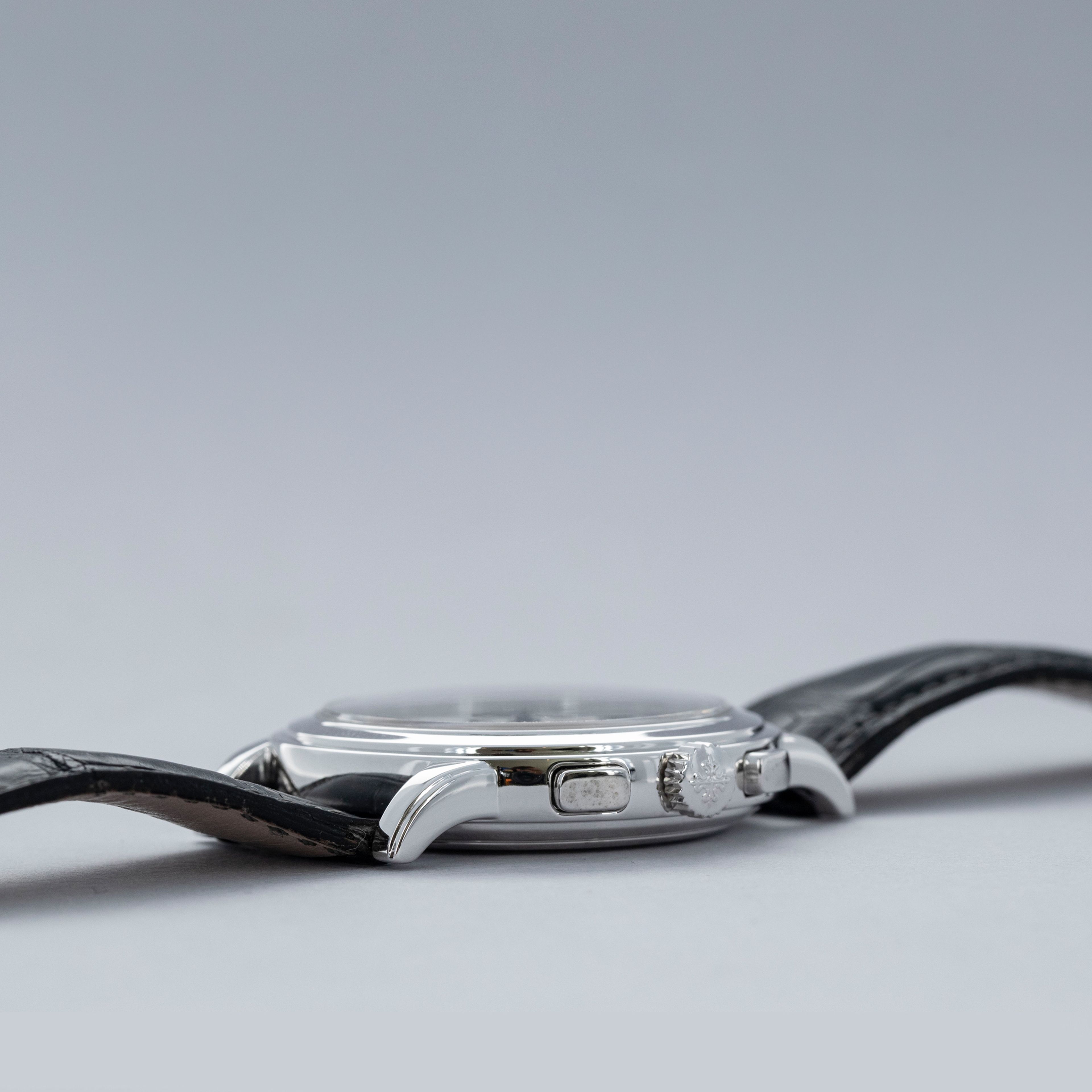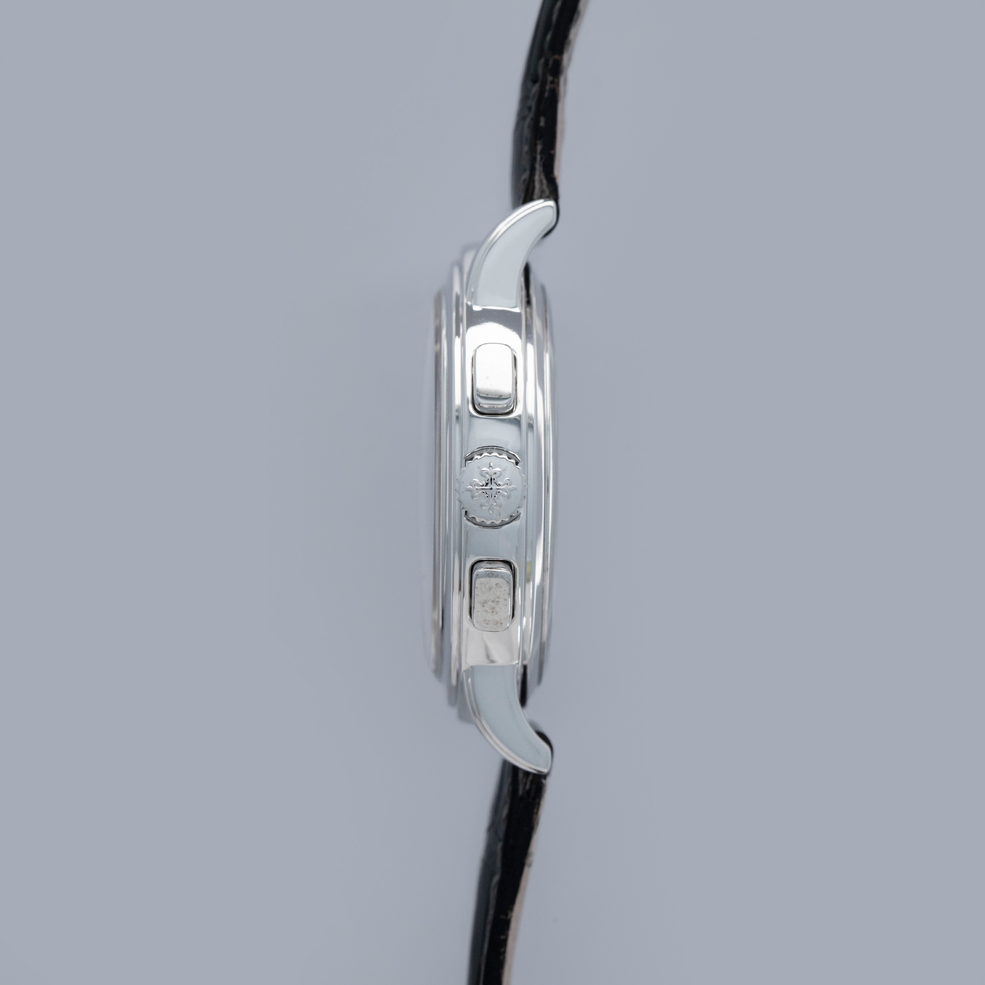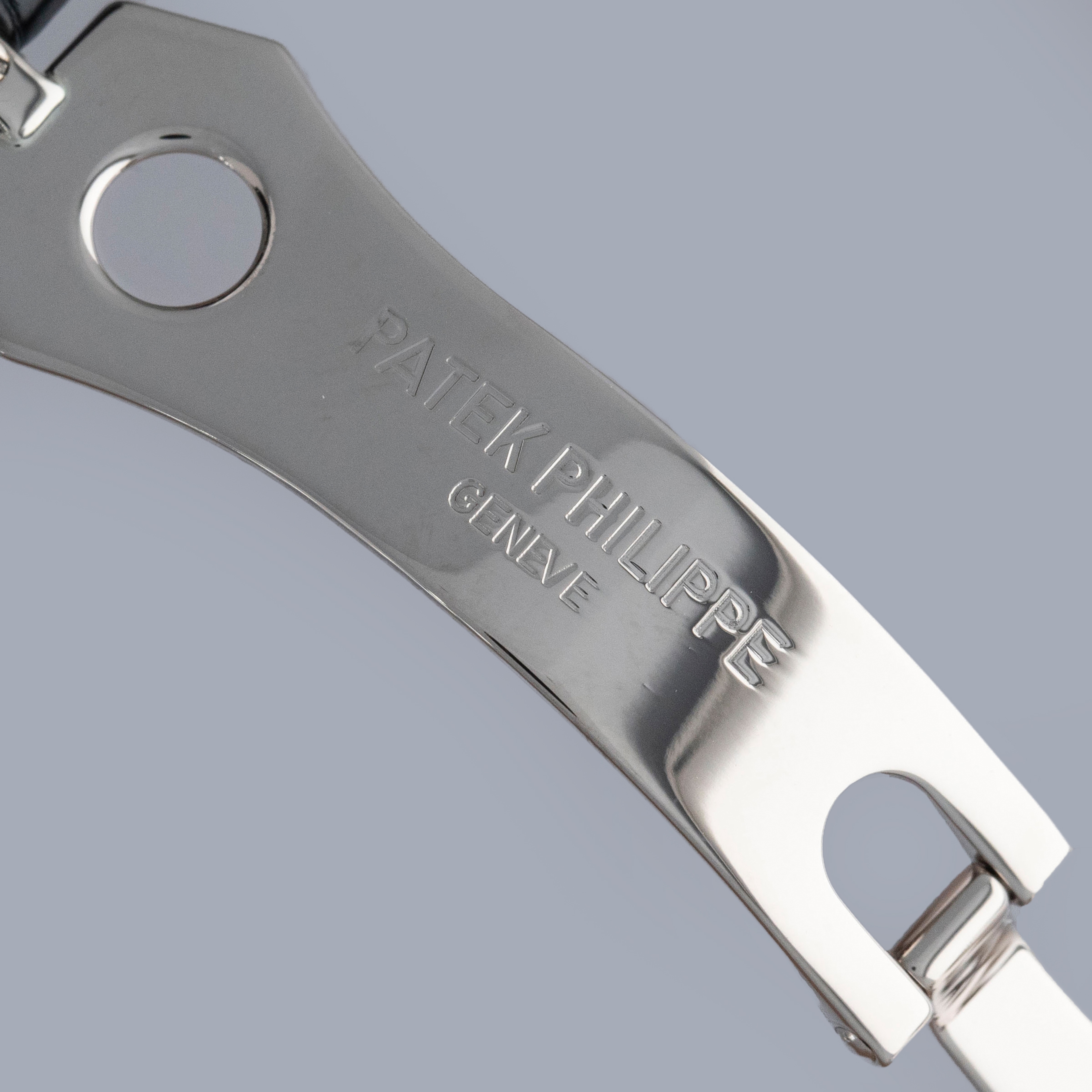 The watch is in near-mint condition. The white gold case shows very light signs of wear, with crisp hallmarks on the backs of the lugs. There is some oxidation visible on the pushers. The dial and hands are like new. It is fitted with a black alligator Patek Philippe strap and a white gold deployant clasp, and is accompanied by a spare brown Patek Philippe alligator strap, inner and outer boxes, original certificate, booklets, wallet, and hangtag. Please note that the front of the box shows some minor damage.
