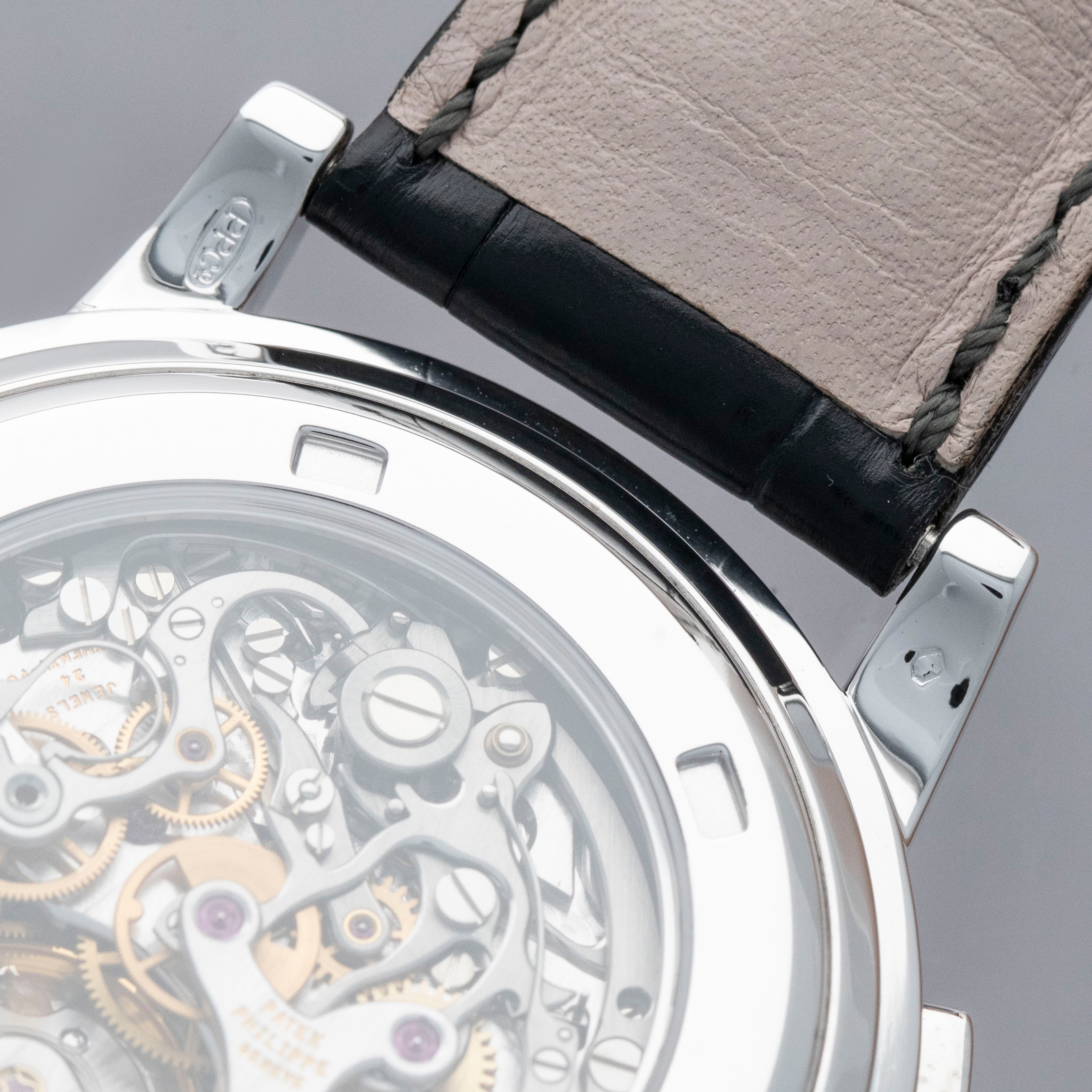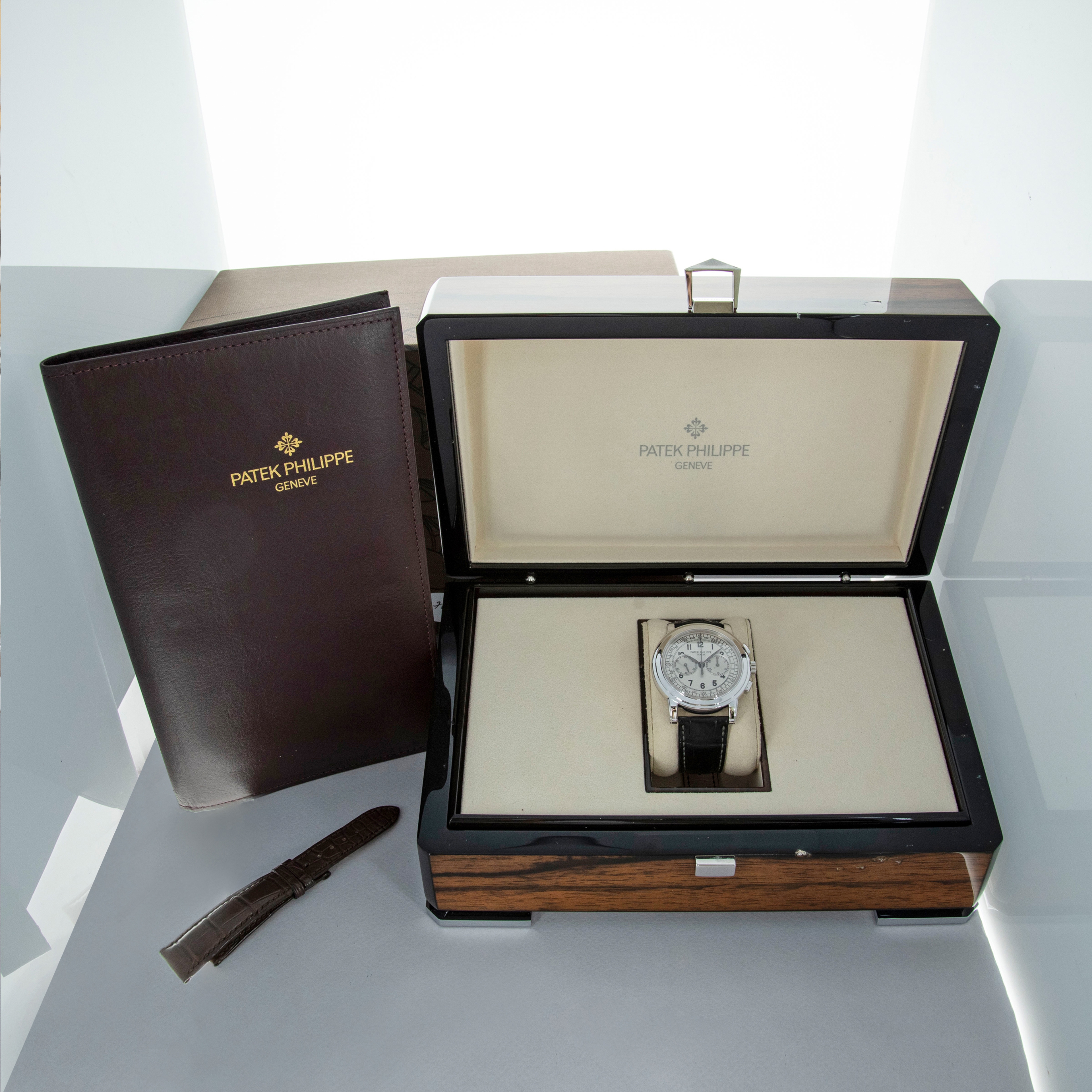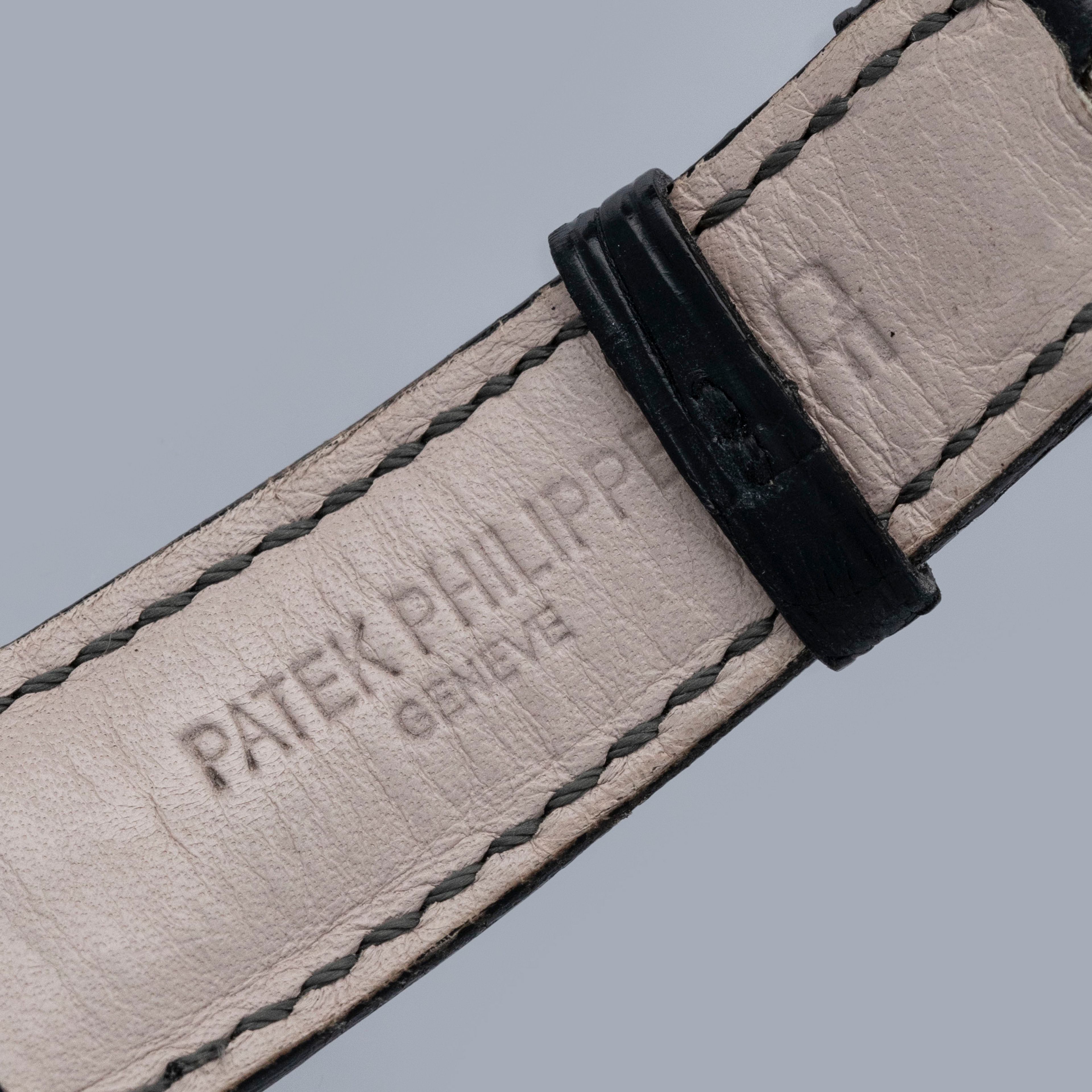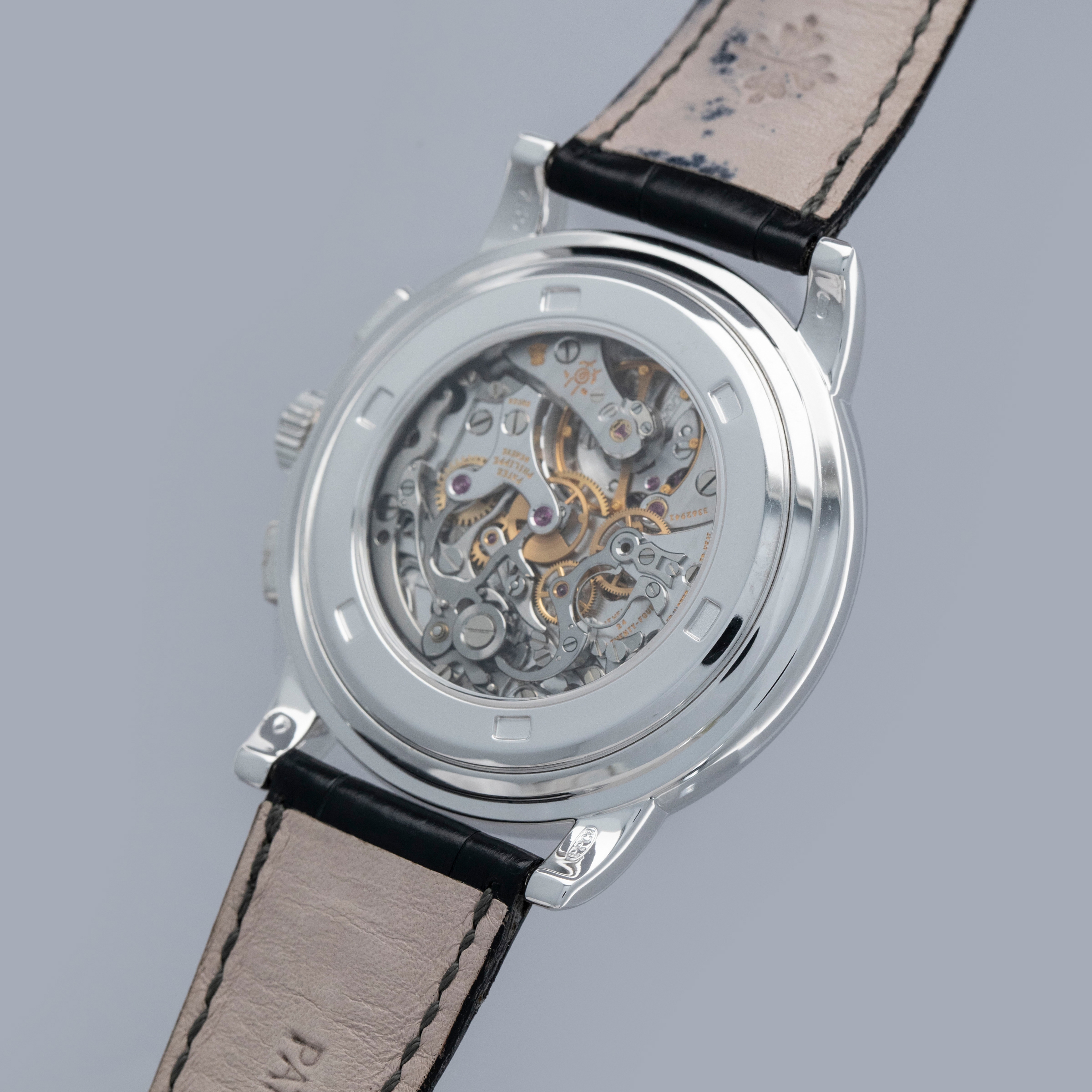 The watch is in near-mint condition. The white gold case shows very light signs of wear, with crisp hallmarks on the backs of the lugs. There is some oxidation visible on the pushers. The dial and hands are like new. It is fitted with a black alligator Patek Philippe strap and a white gold deployant clasp, and is accompanied by a spare brown Patek Philippe alligator strap, inner and outer boxes, original certificate, booklets, wallet, and hangtag. Please note that the front of the box shows some minor damage.