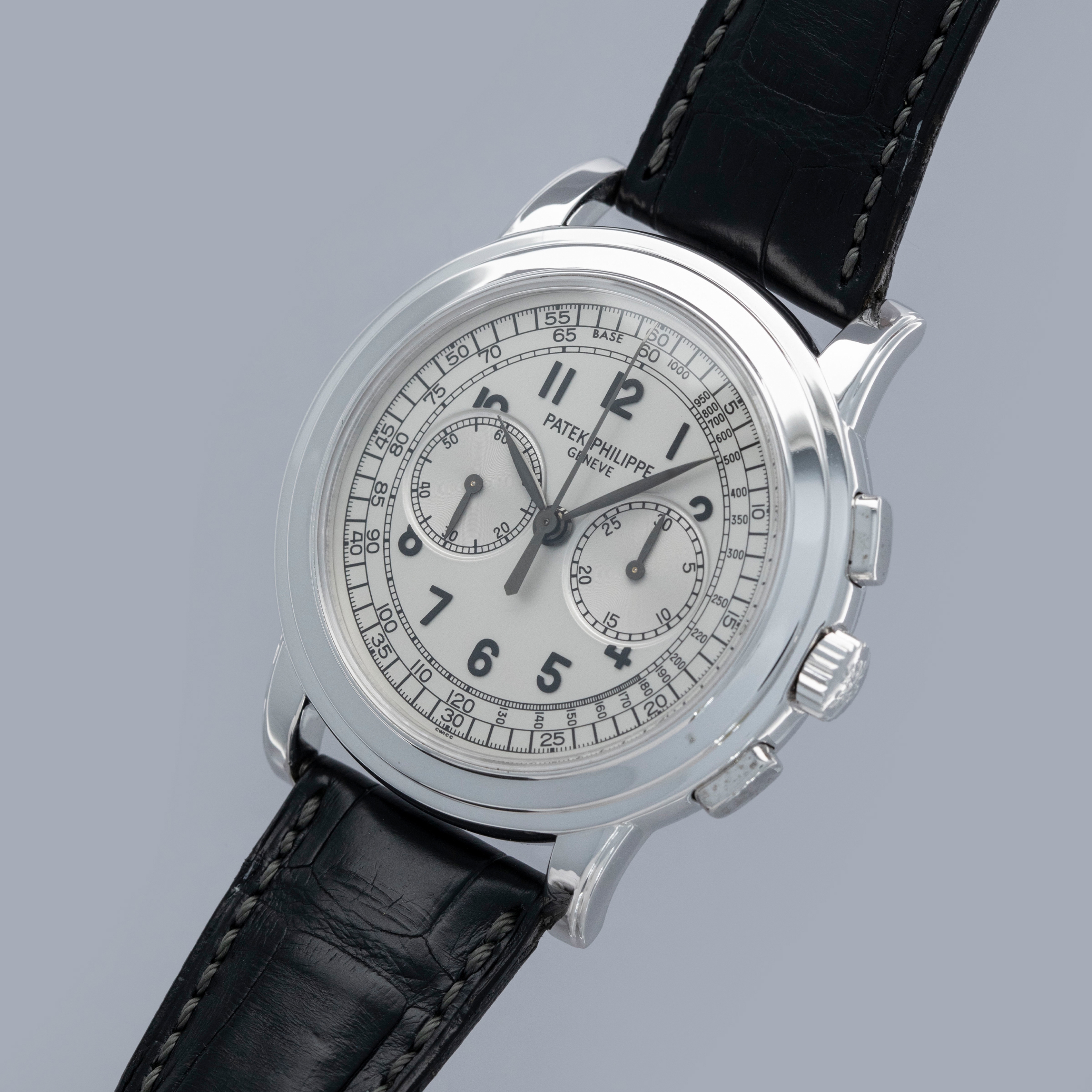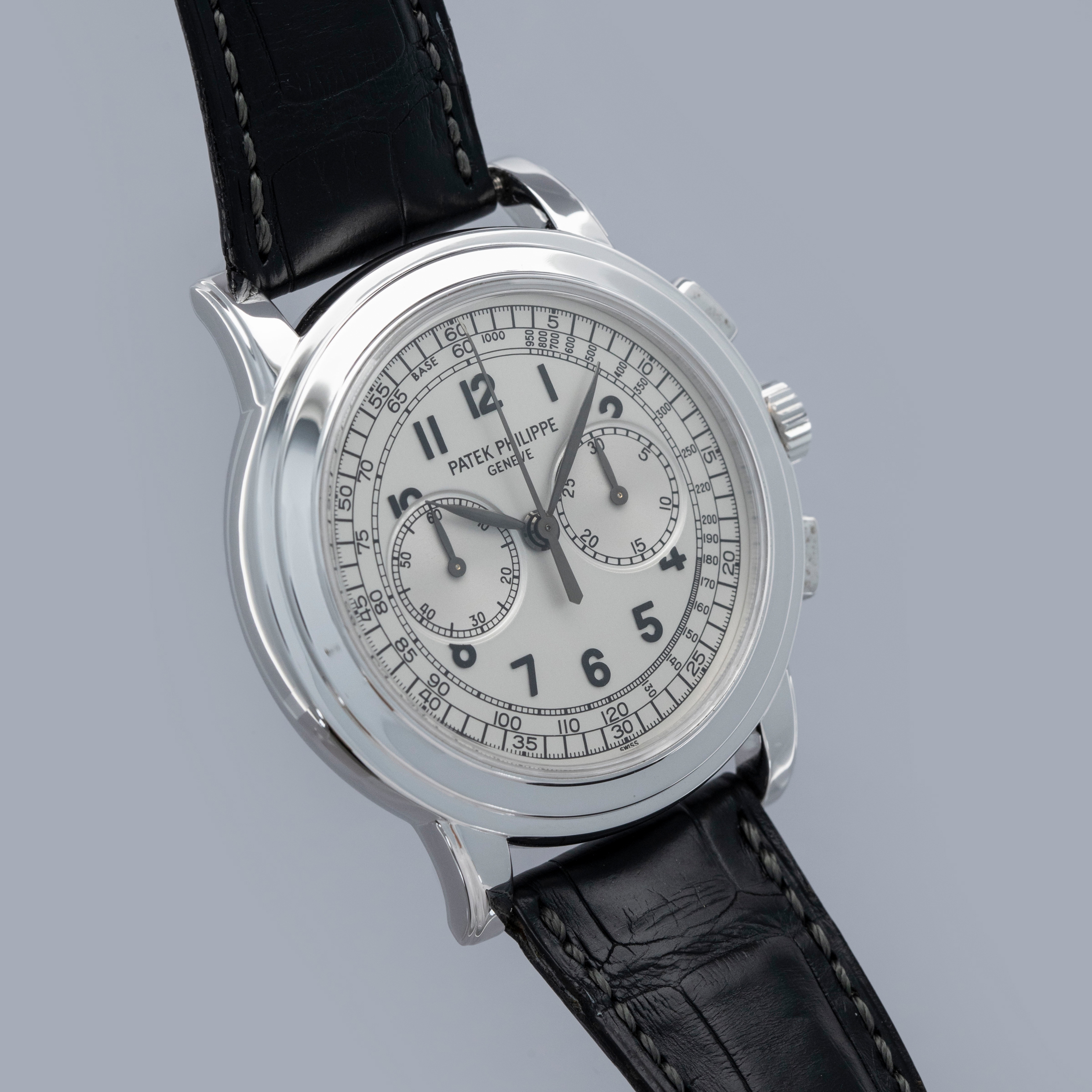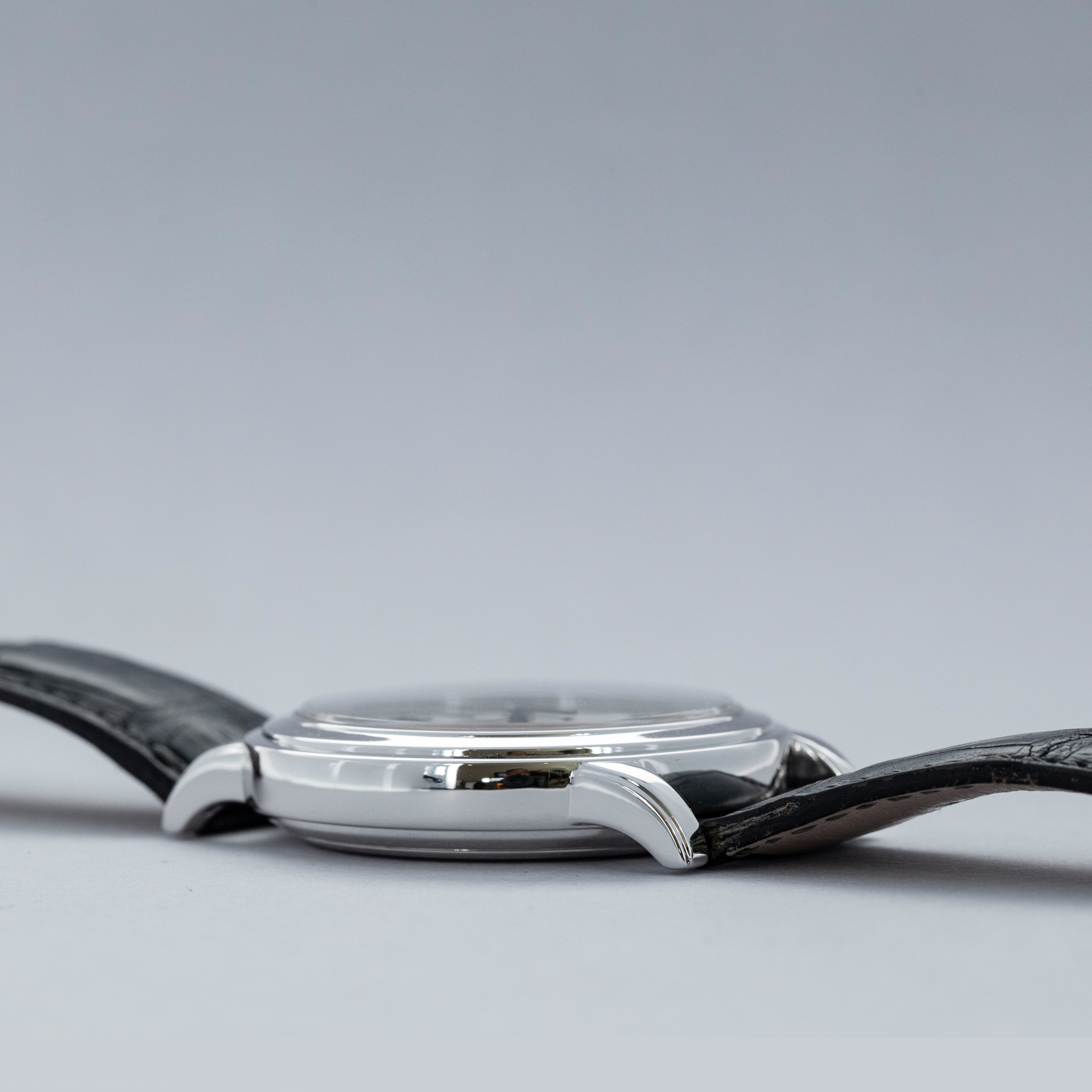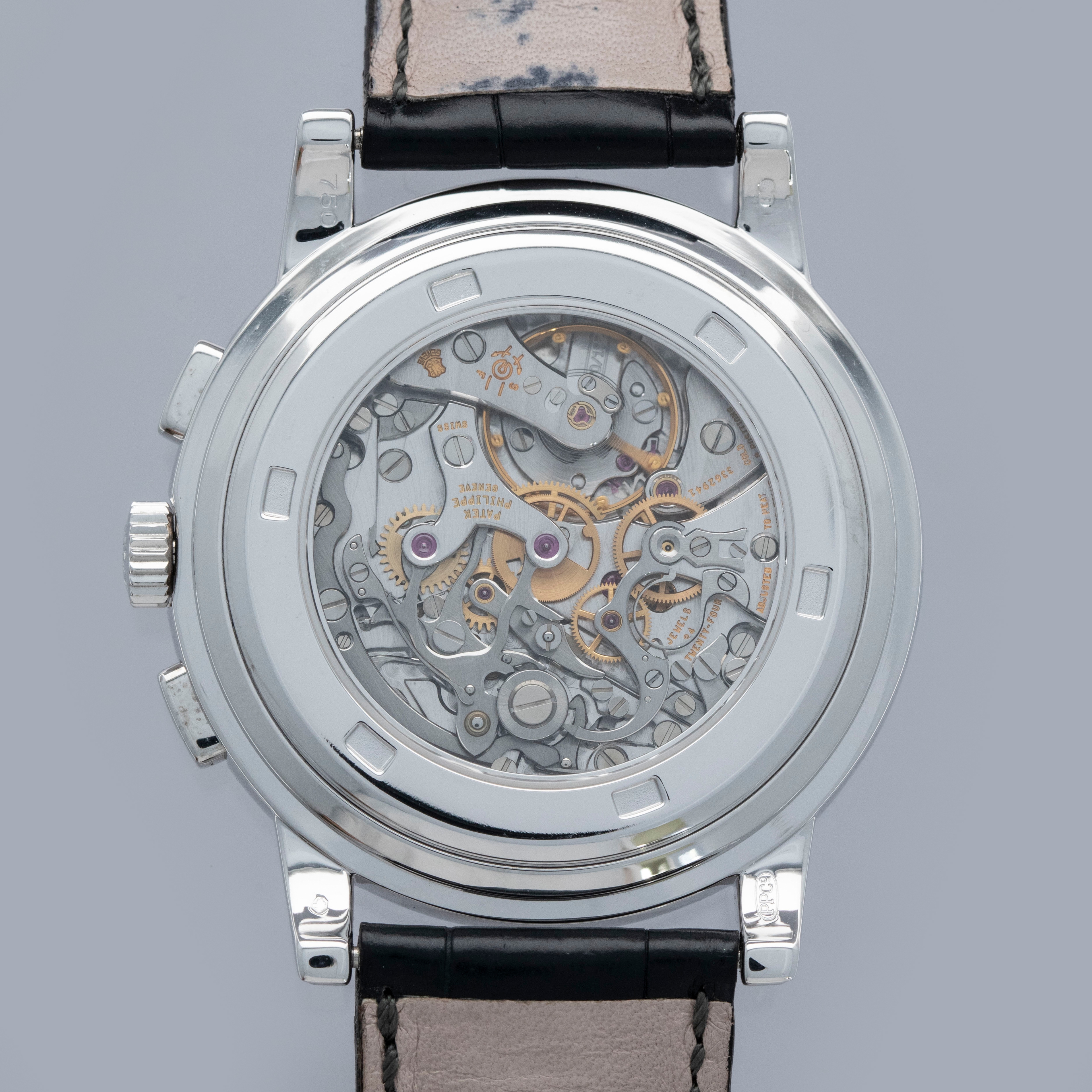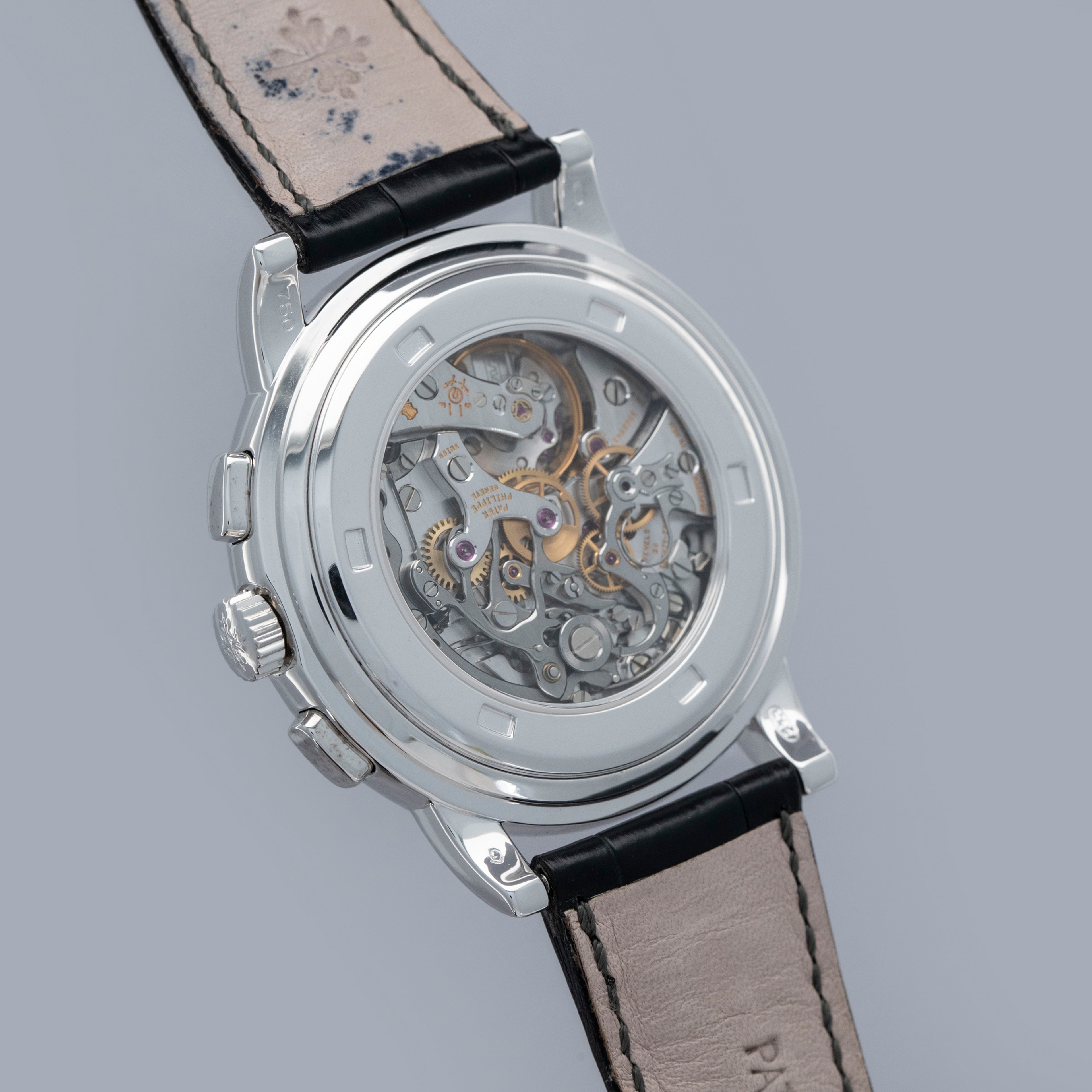 The watch is in near-mint condition. The white gold case shows very light signs of wear, with crisp hallmarks on the backs of the lugs. There is some oxidation visible on the pushers. The dial and hands are like new. It is fitted with a black alligator Patek Philippe strap and a white gold deployant clasp, and is accompanied by a spare brown Patek Philippe alligator strap, inner and outer boxes, original certificate, booklets, wallet, and hangtag. Please note that the front of the box shows some minor damage.