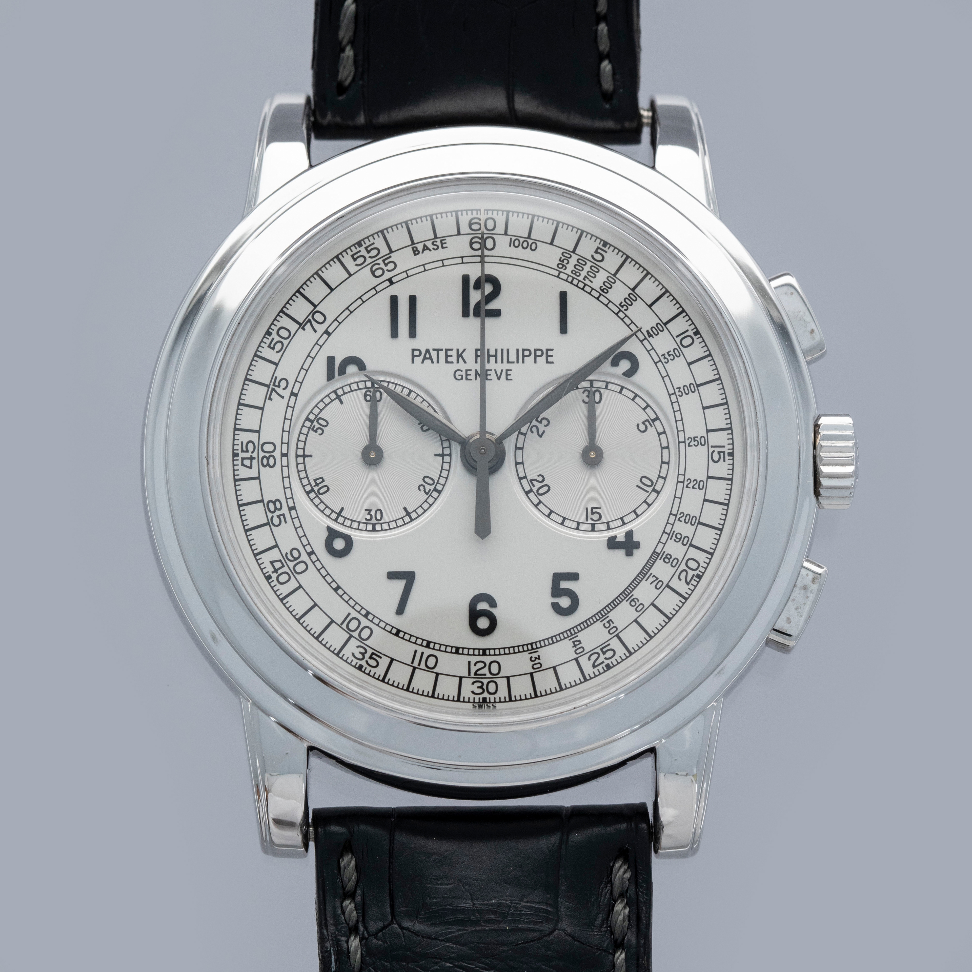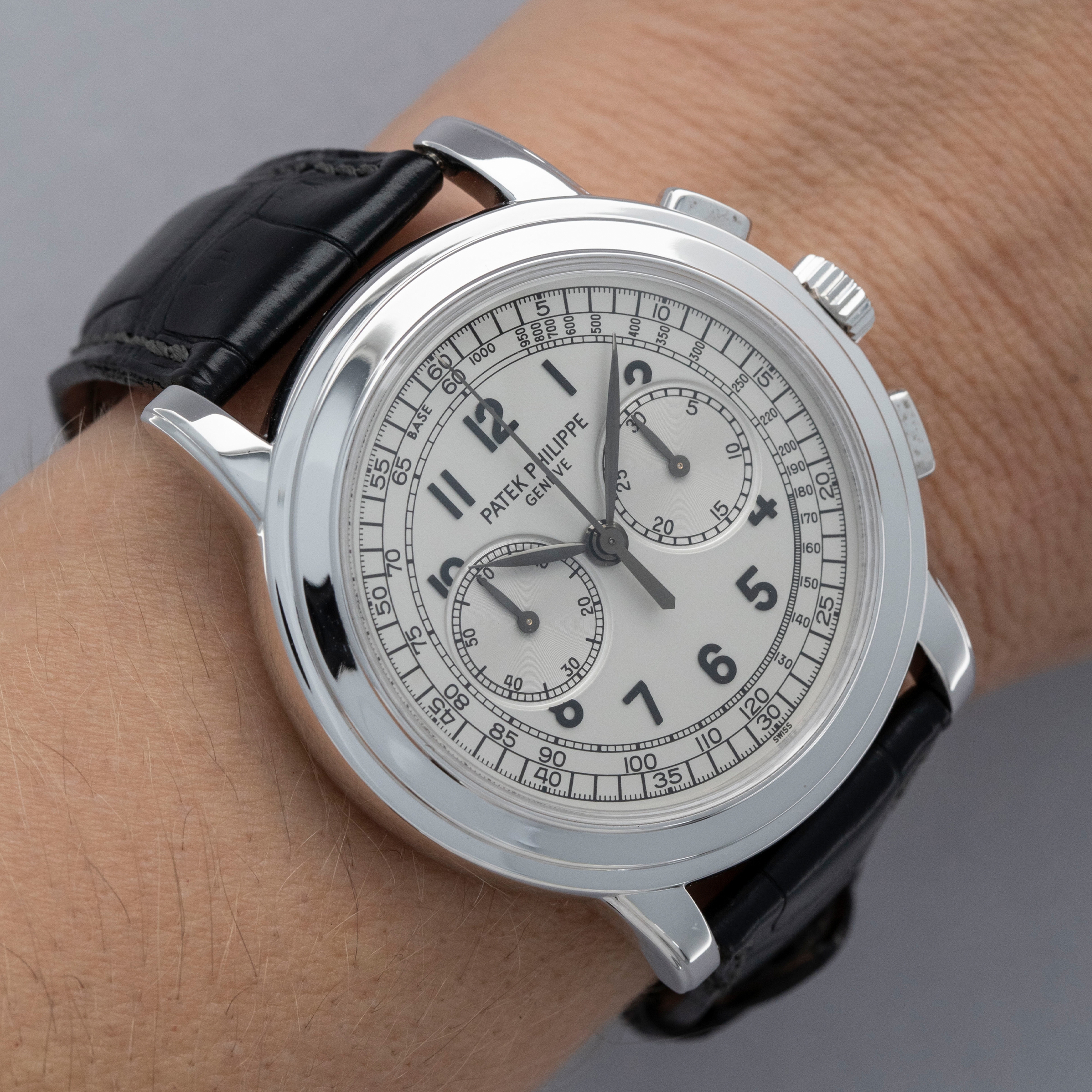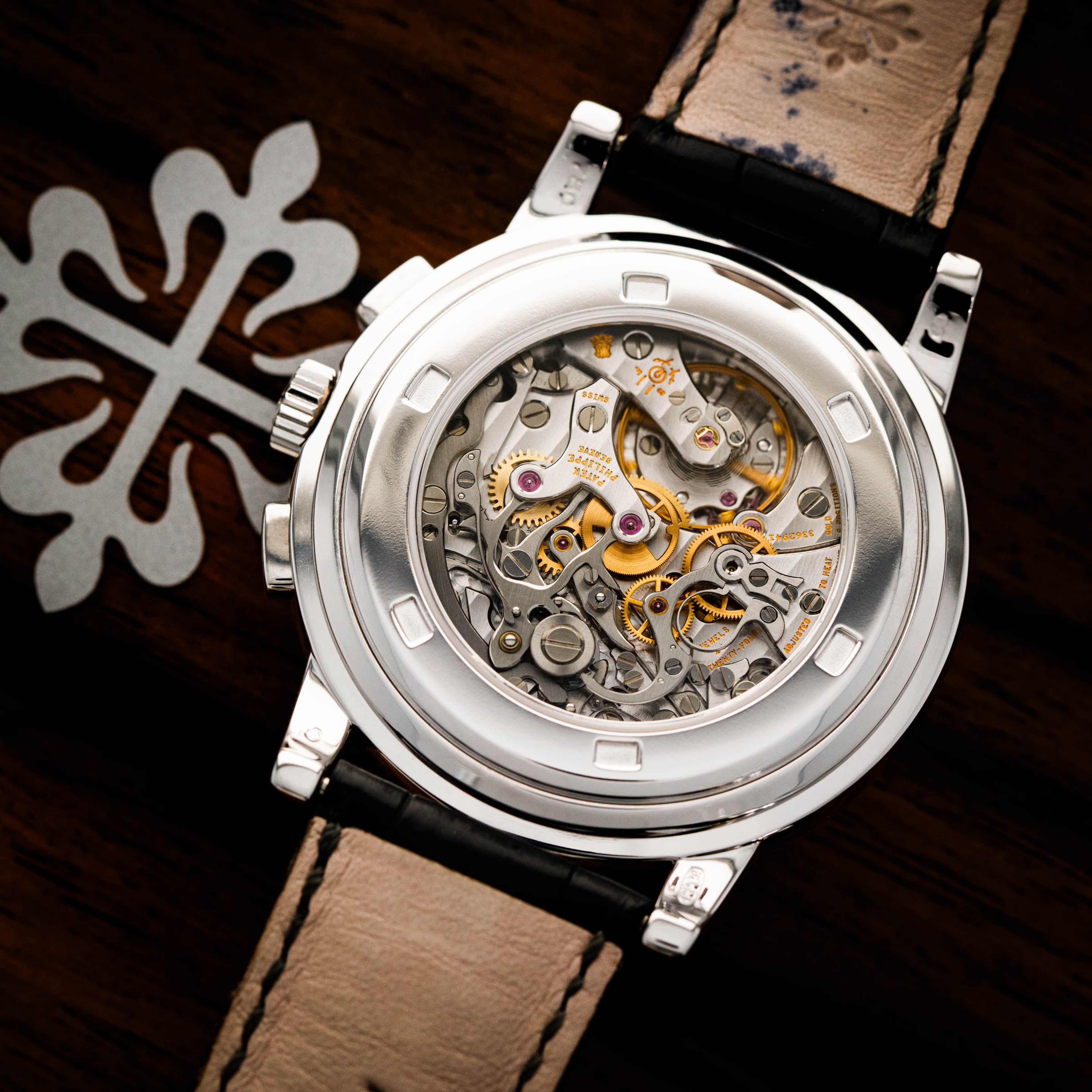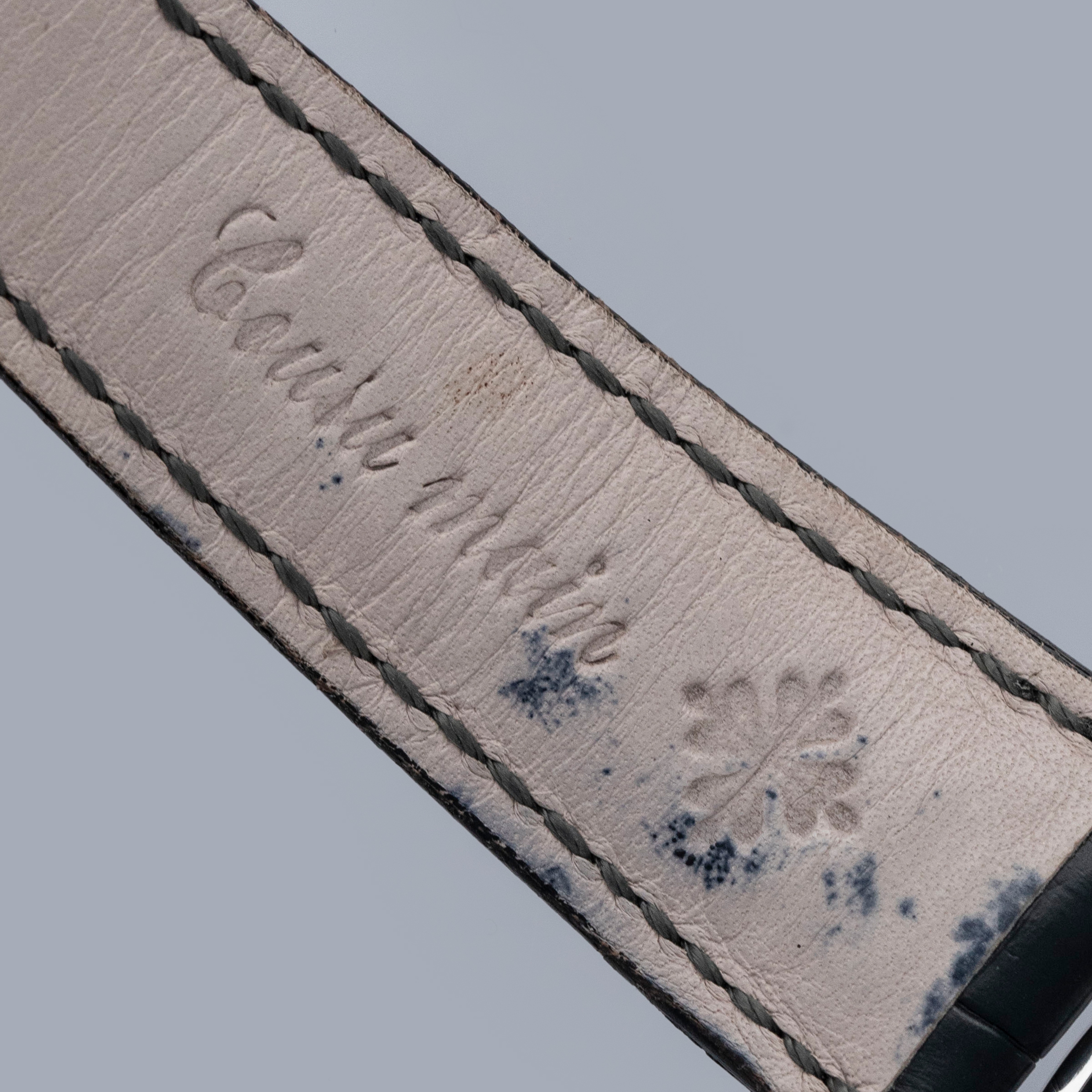 The watch is in near-mint condition. The white gold case shows very light signs of wear, with crisp hallmarks on the backs of the lugs. There is some oxidation visible on the pushers. The dial and hands are like new. It is fitted with a black alligator Patek Philippe strap and a white gold deployant clasp, and is accompanied by a spare brown Patek Philippe alligator strap, inner and outer boxes, original certificate, booklets, wallet, and hangtag. Please note that the front of the box shows some minor damage.