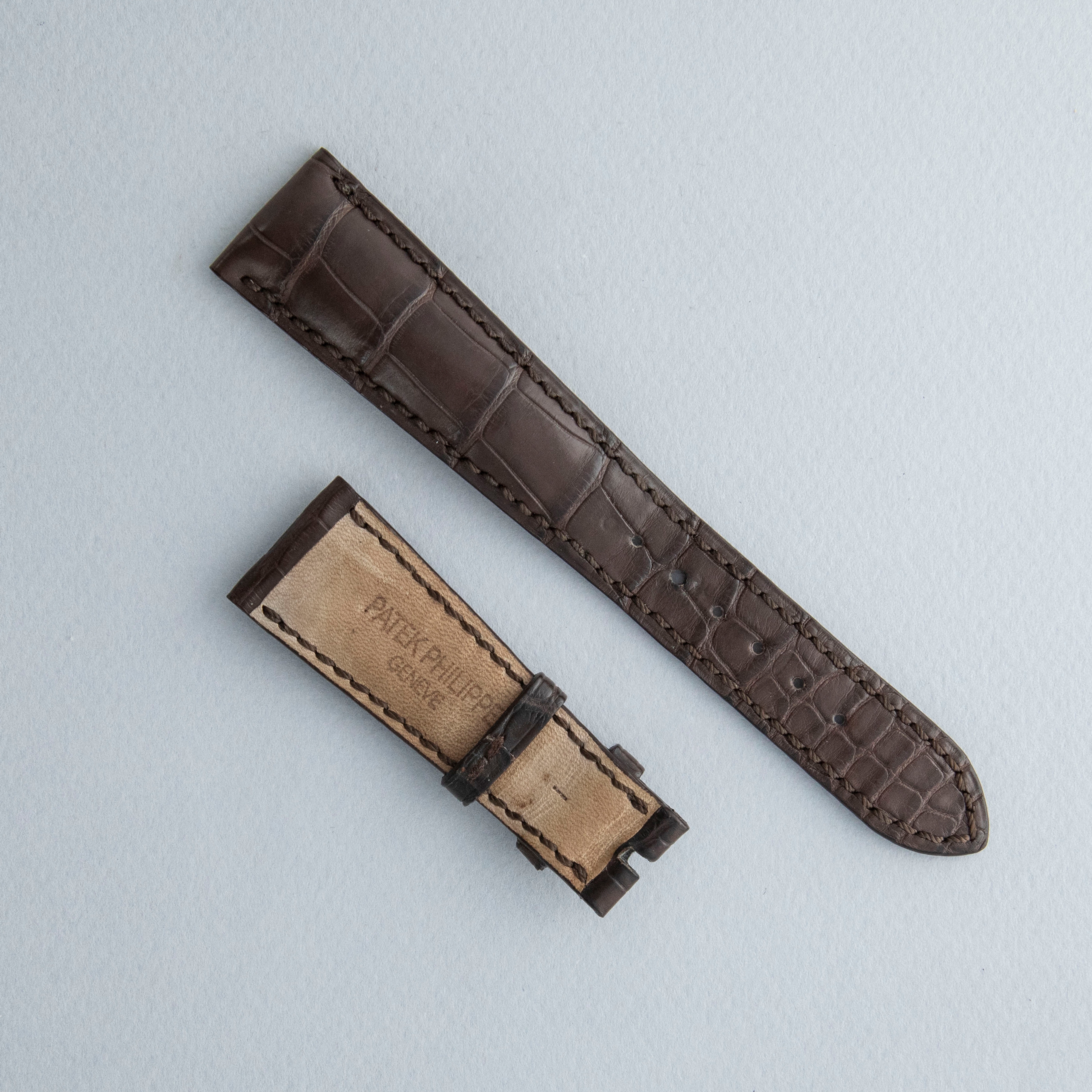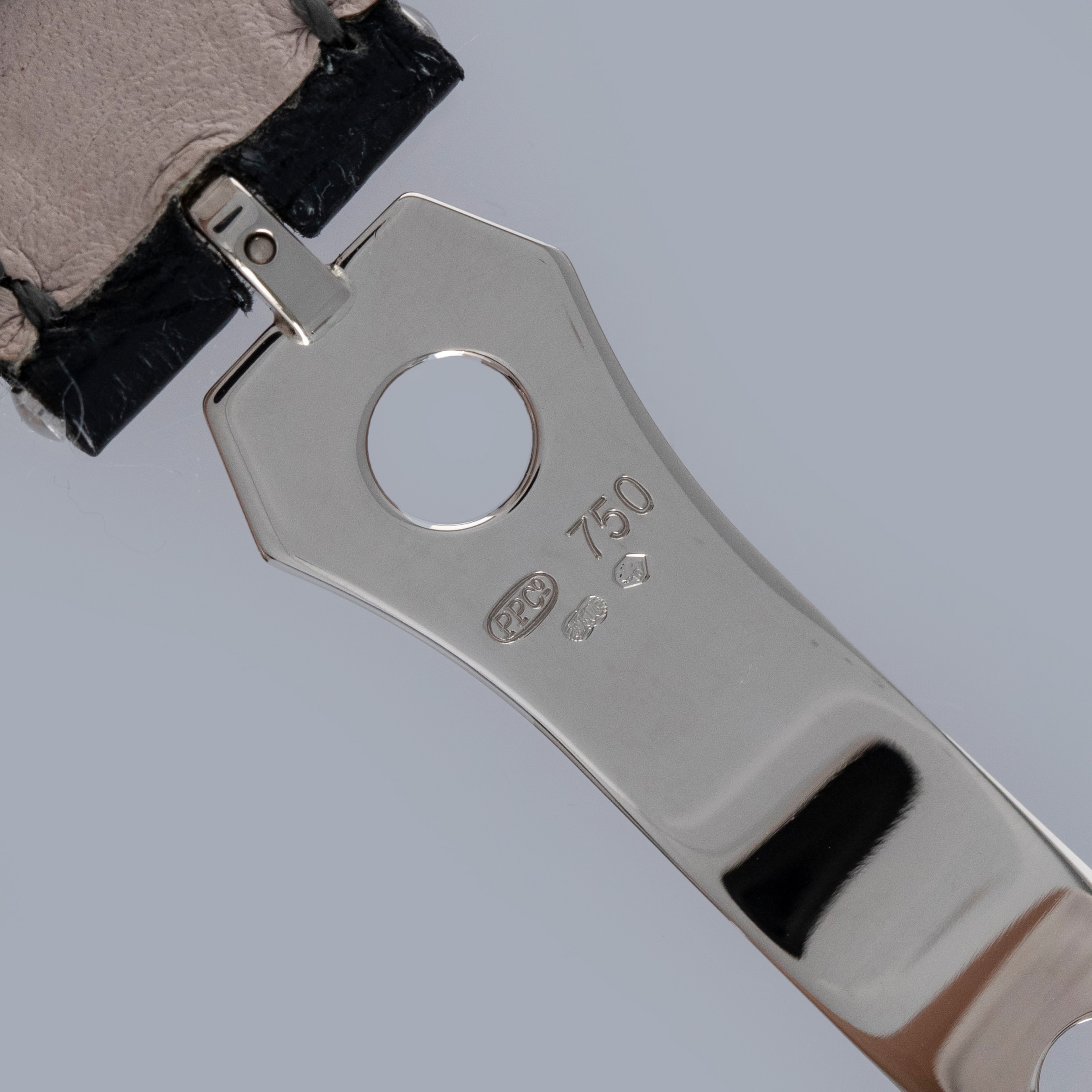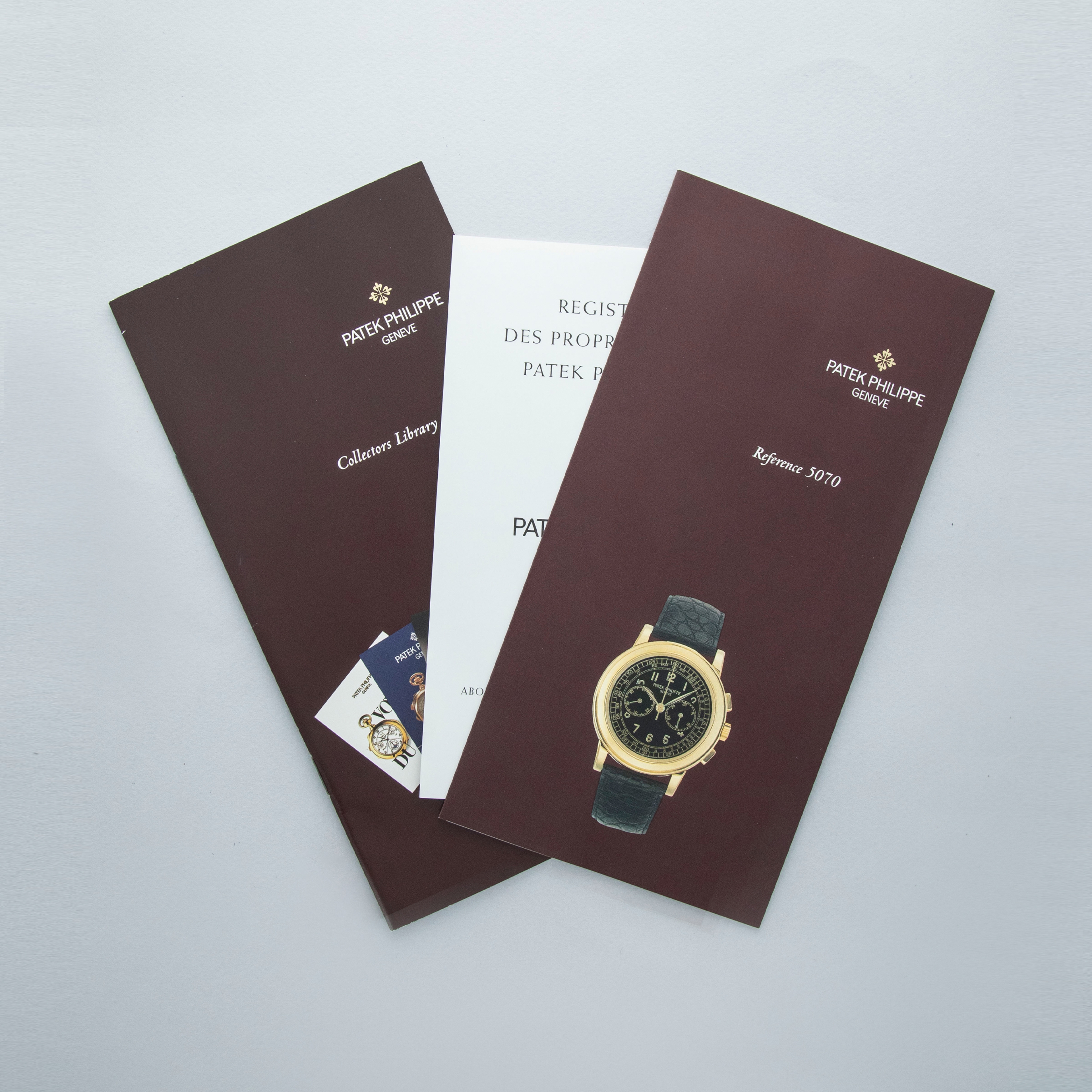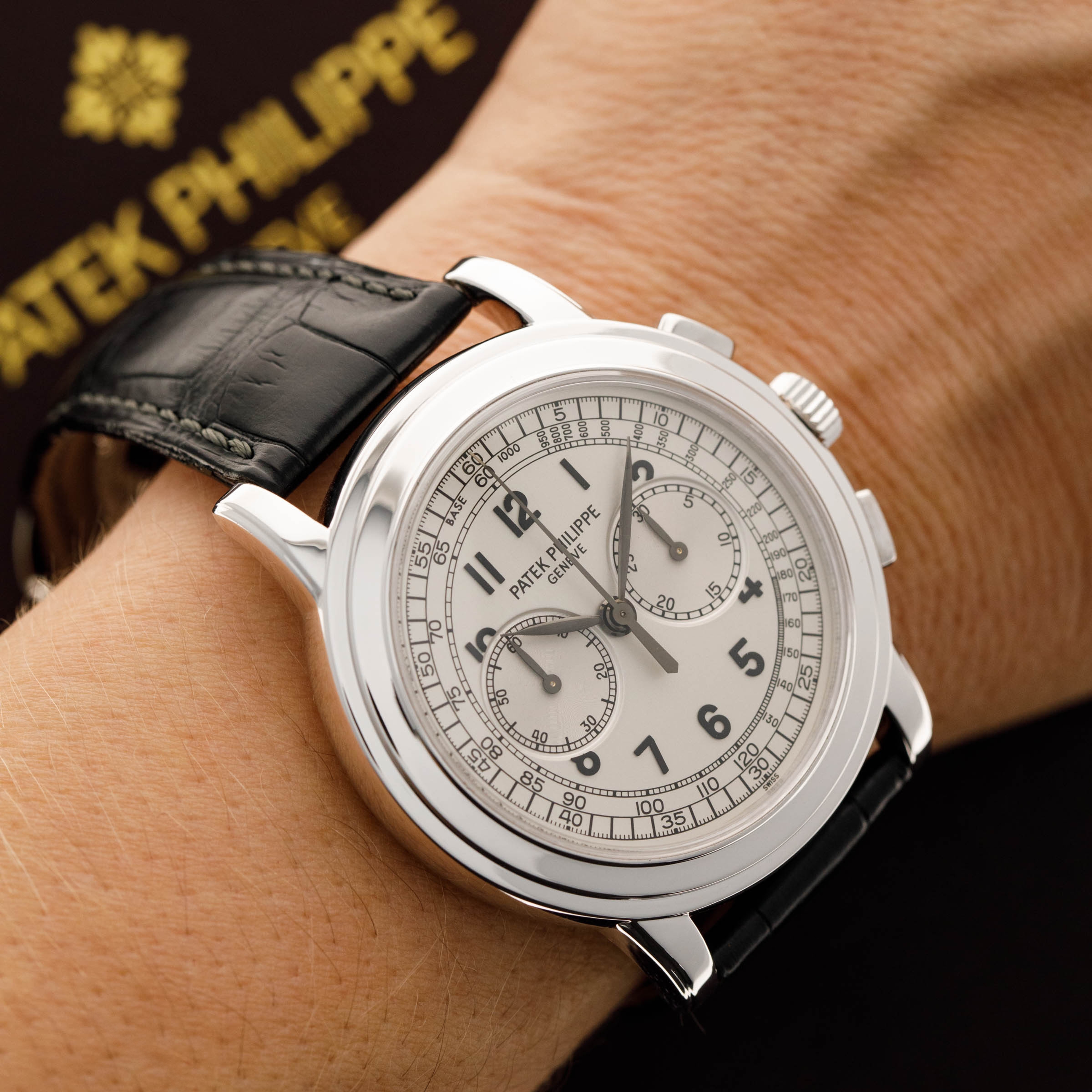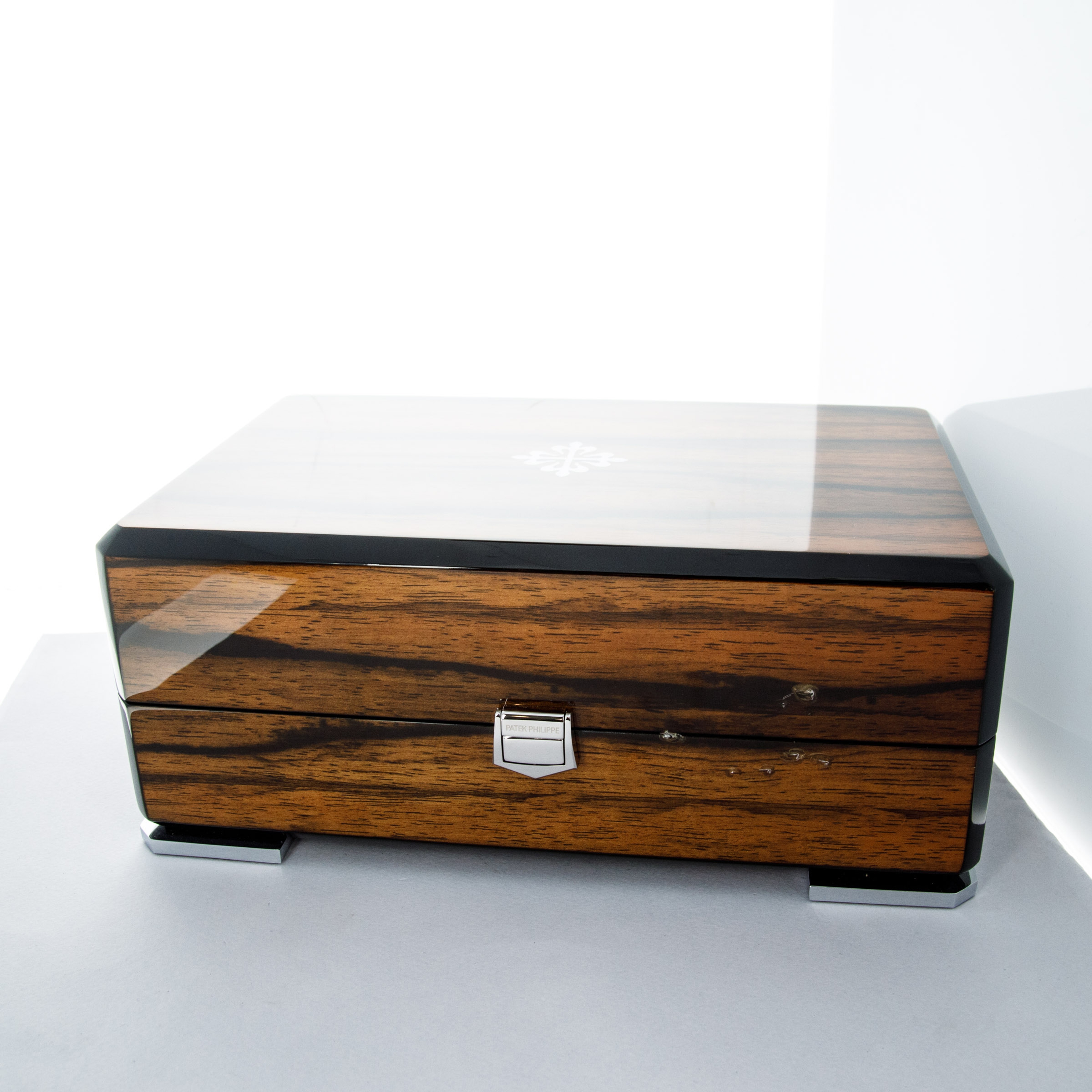 The watch is in near-mint condition. The white gold case shows very light signs of wear, with crisp hallmarks on the backs of the lugs. There is some oxidation visible on the pushers. The dial and hands are like new. It is fitted with a black alligator Patek Philippe strap and a white gold deployant clasp, and is accompanied by a spare brown Patek Philippe alligator strap, inner and outer boxes, original certificate, booklets, wallet, and hangtag. Please note that the front of the box shows some minor damage.