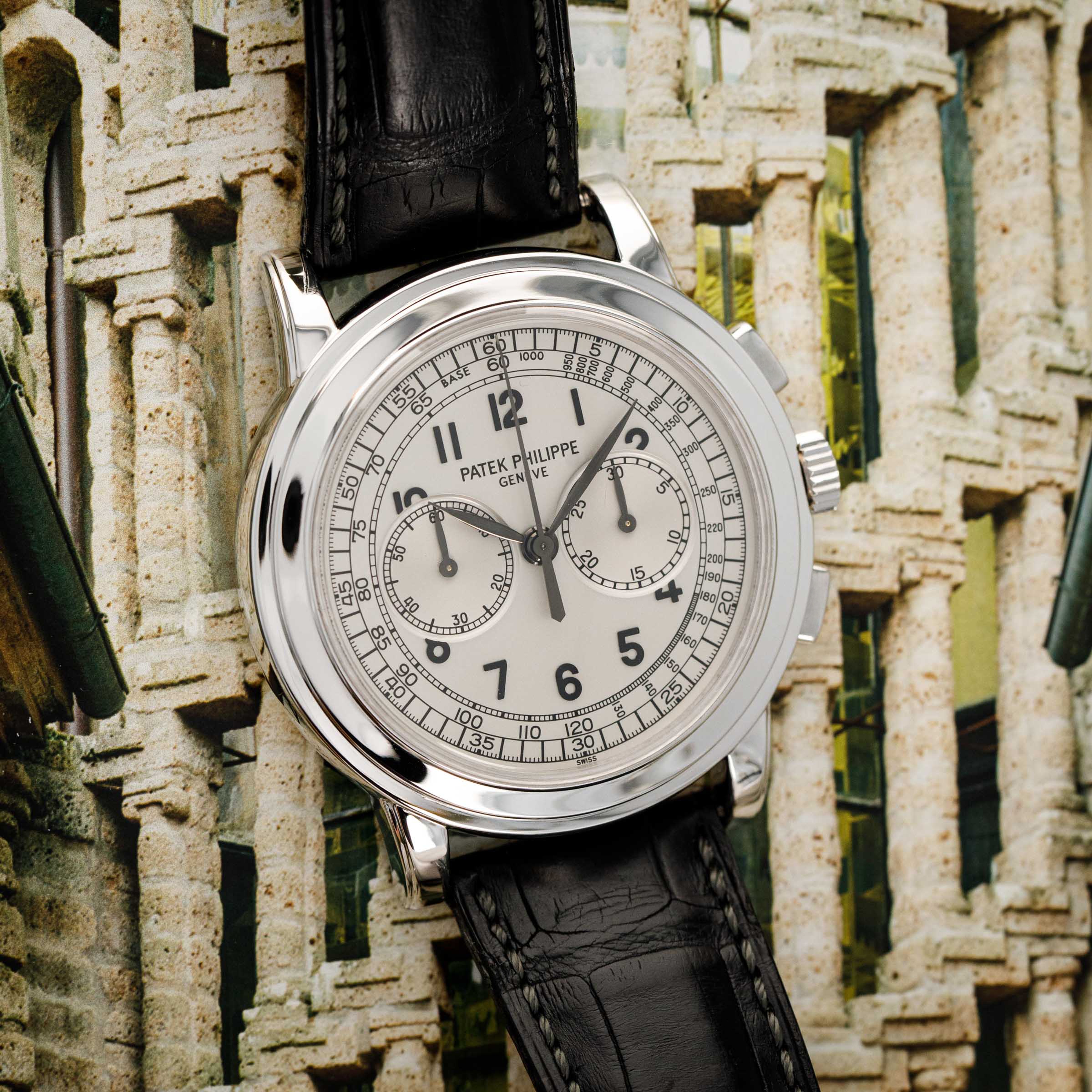 Featuring a silver dial with applied Arabic numerals and a bi-compax layout with two sunken subdials at 3 and 9 o'clock, the ref. 5070's display is thoughtfully designed, much like its large 42mm white gold case that continues the dial's stepped design across its bezel and lugs.