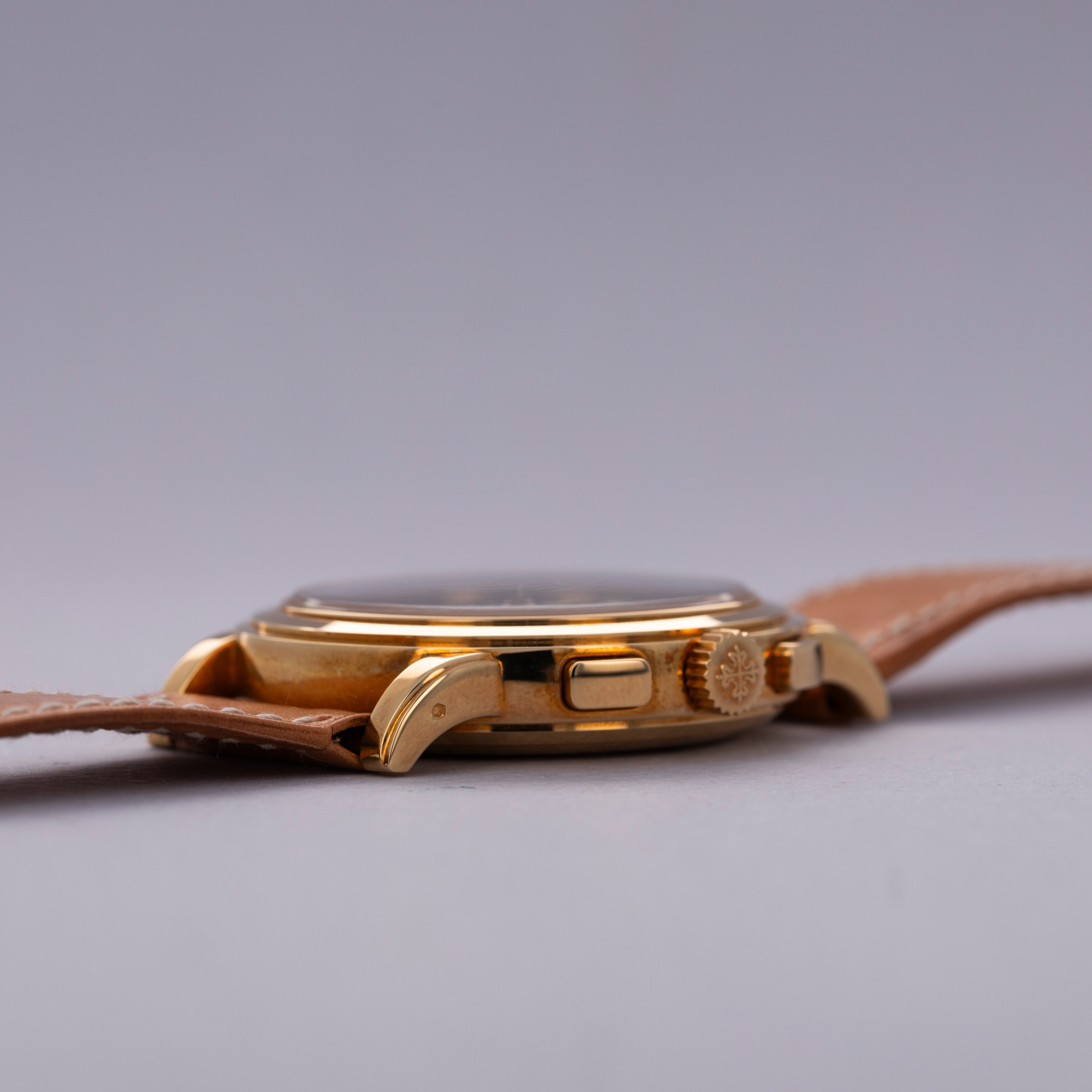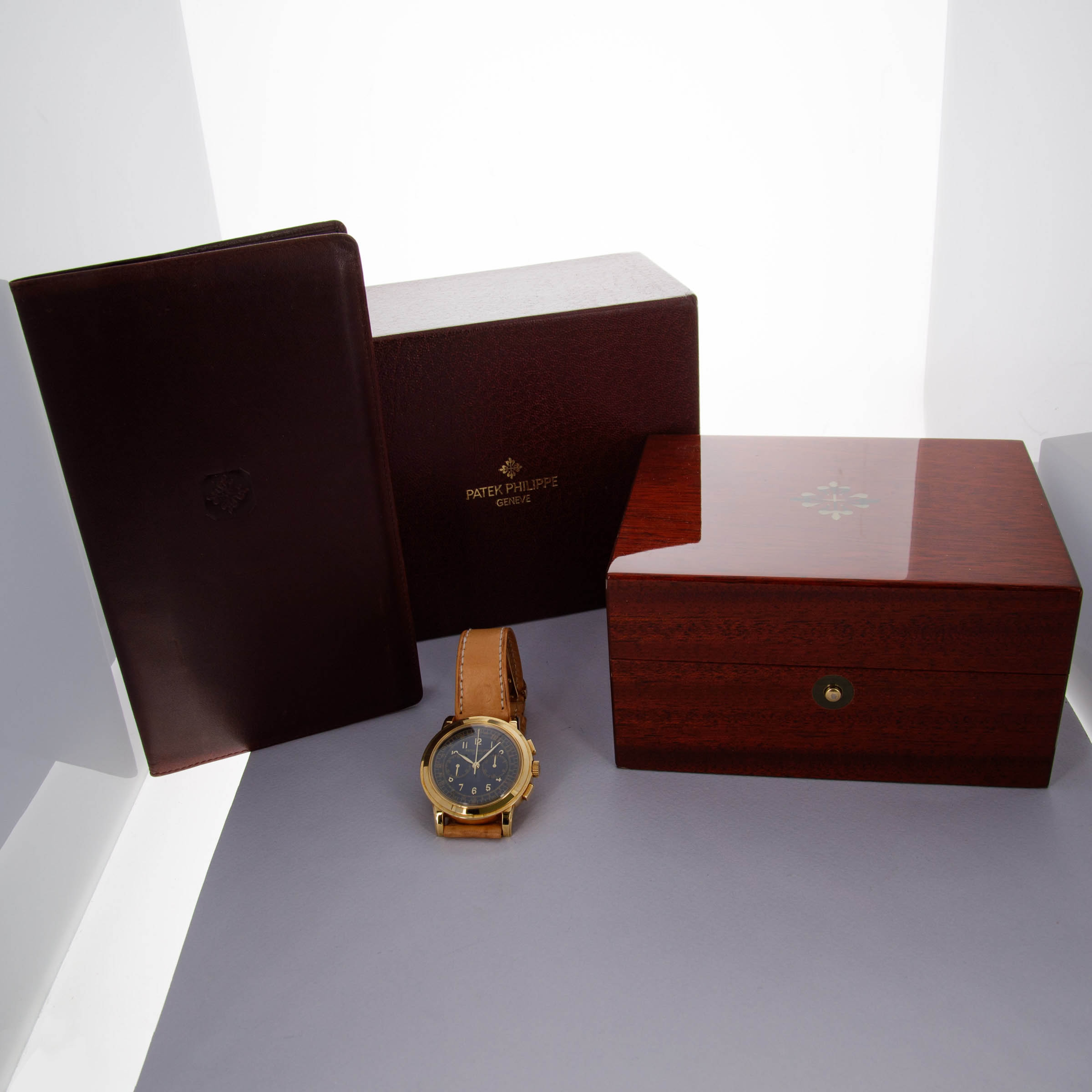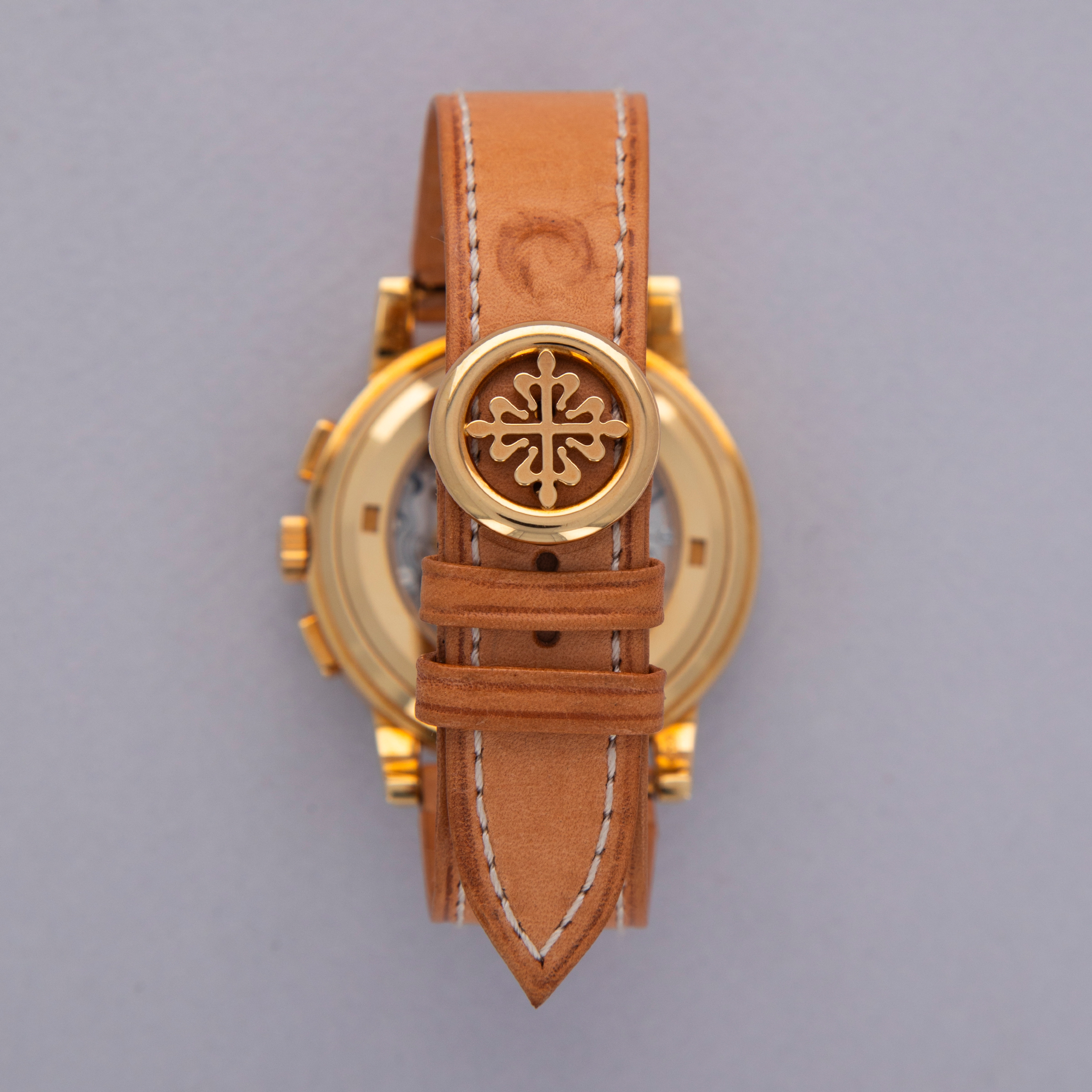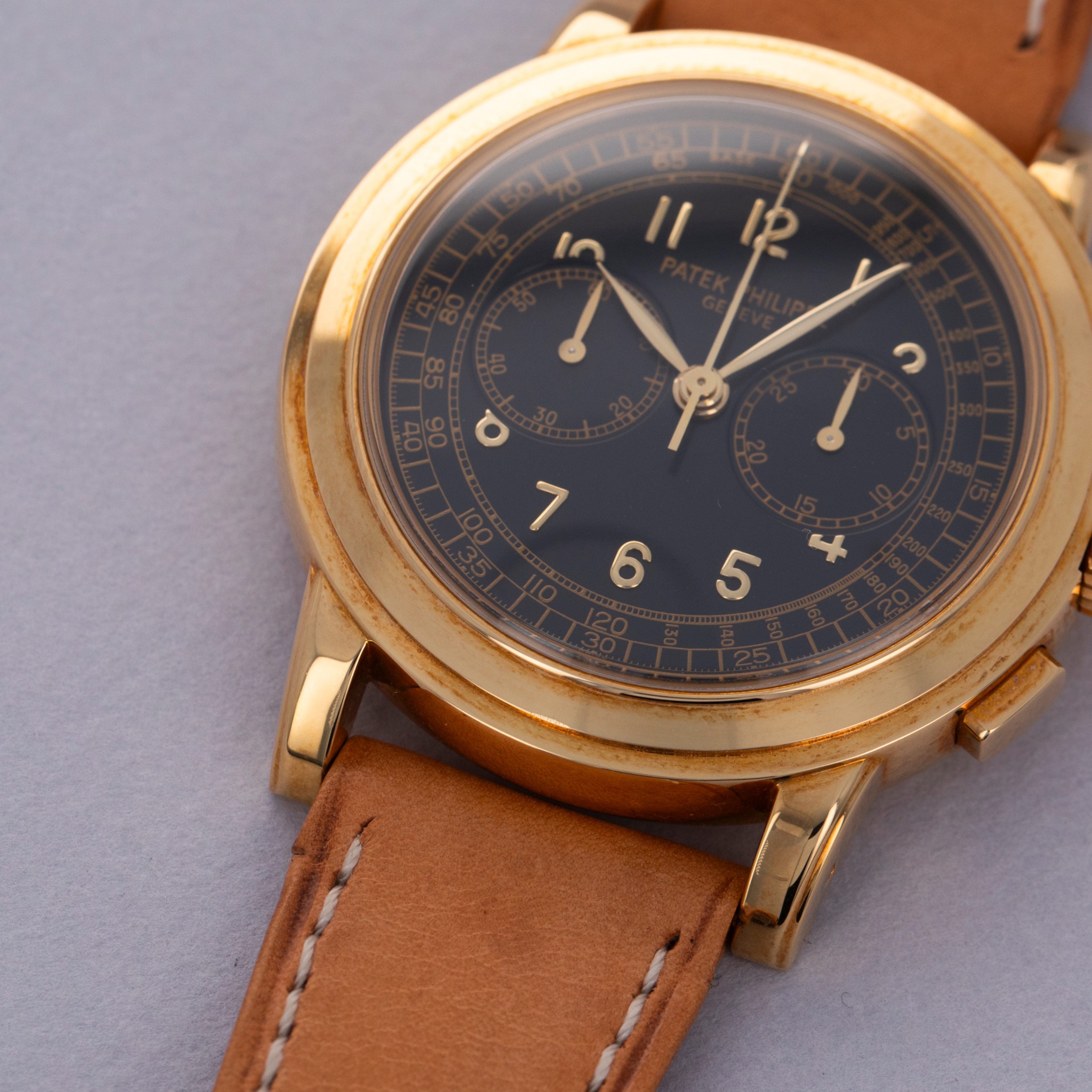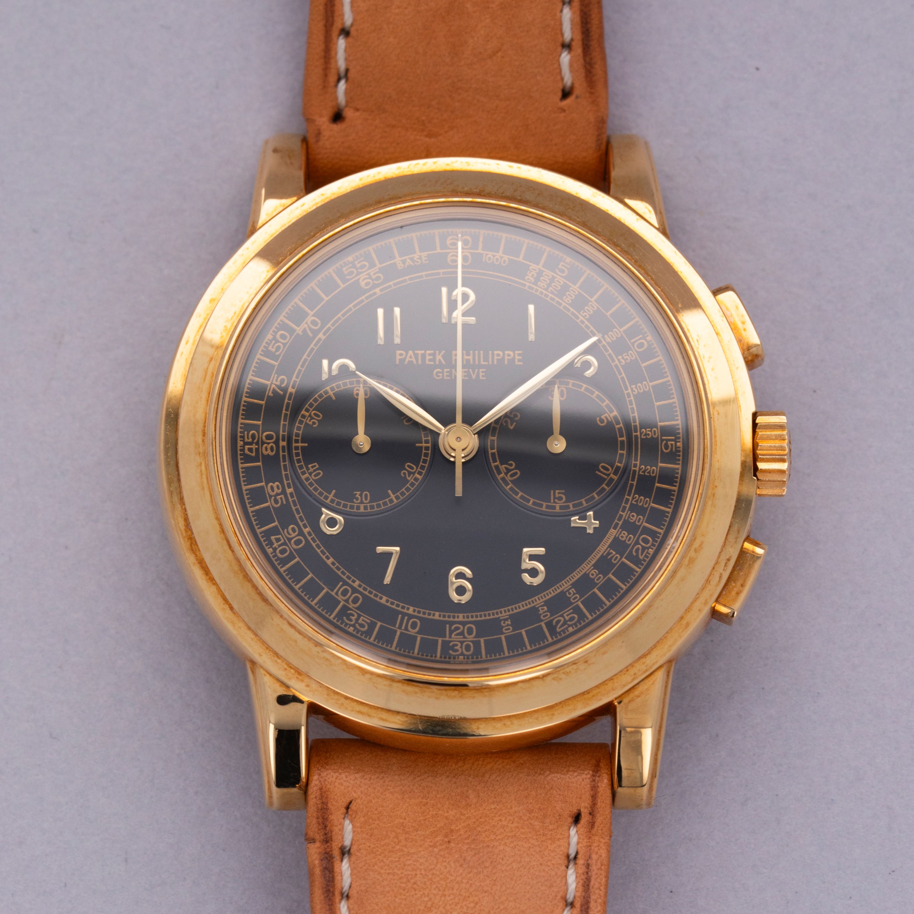 Watch is in like-new condition, with little to no signs of use. Case has developed a warm patina along its surfaces. Watch is accompanied by original box and papers, and certificate of origin. Watch comes on a rare natural finish calf leather strap made by Klotzl for Patek Philippe.