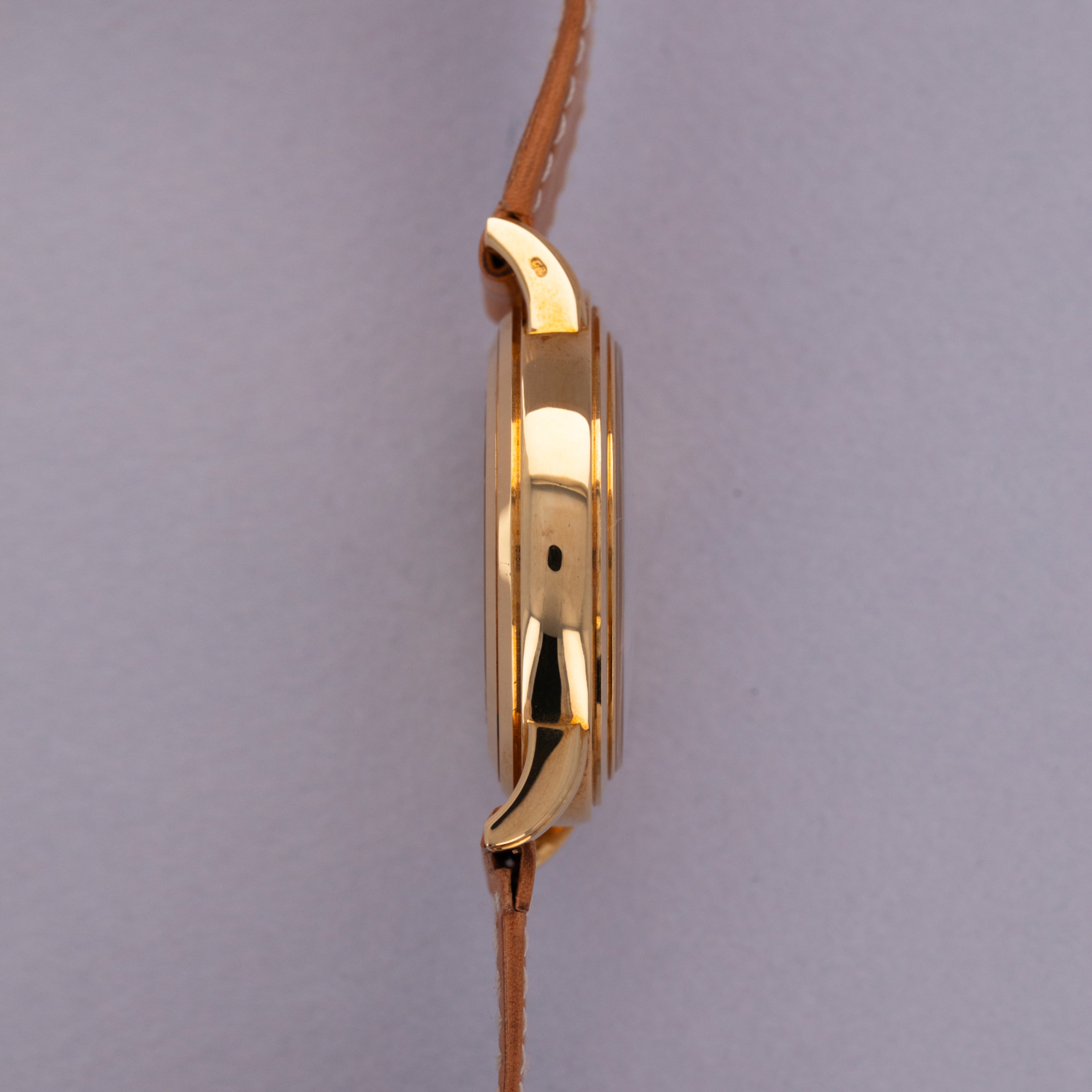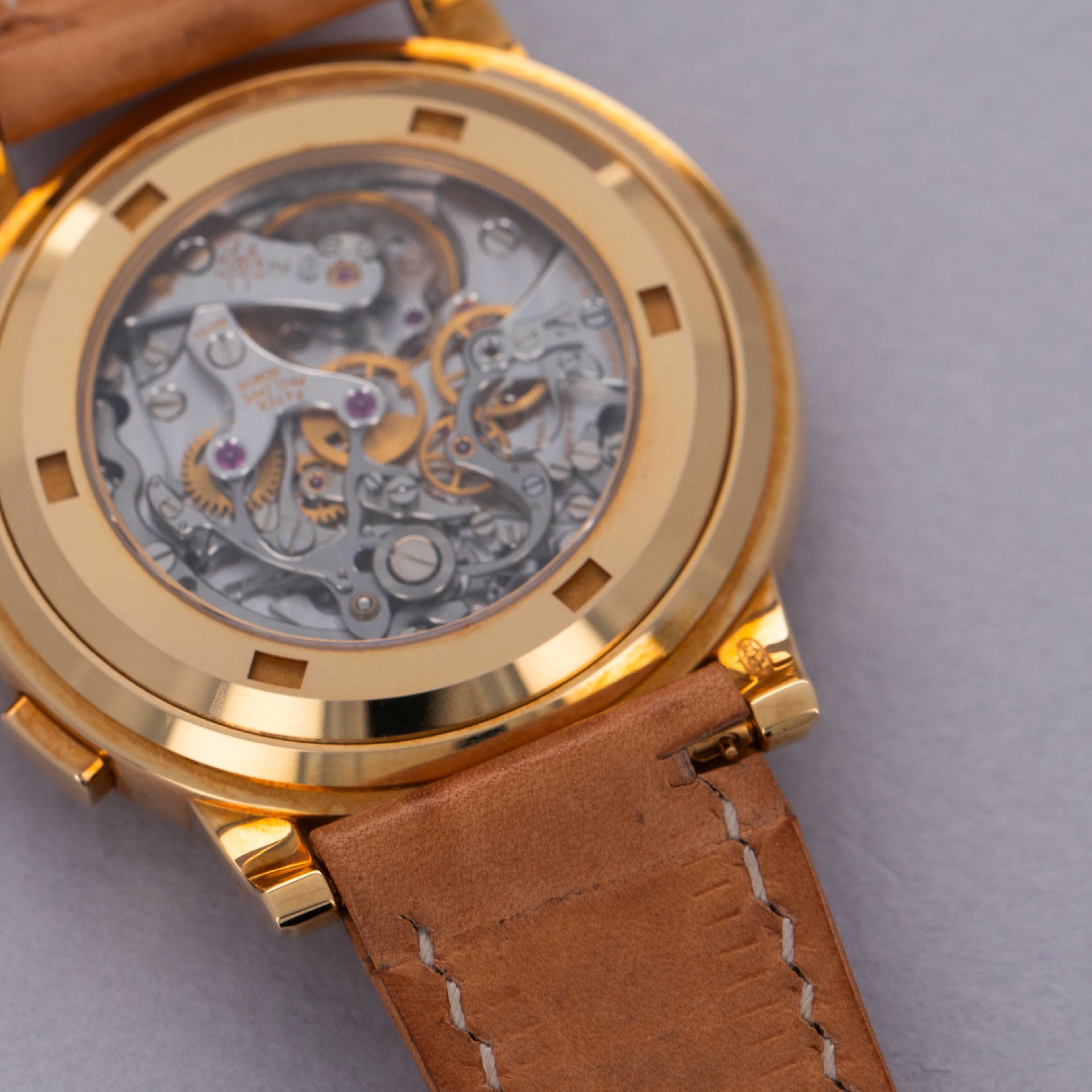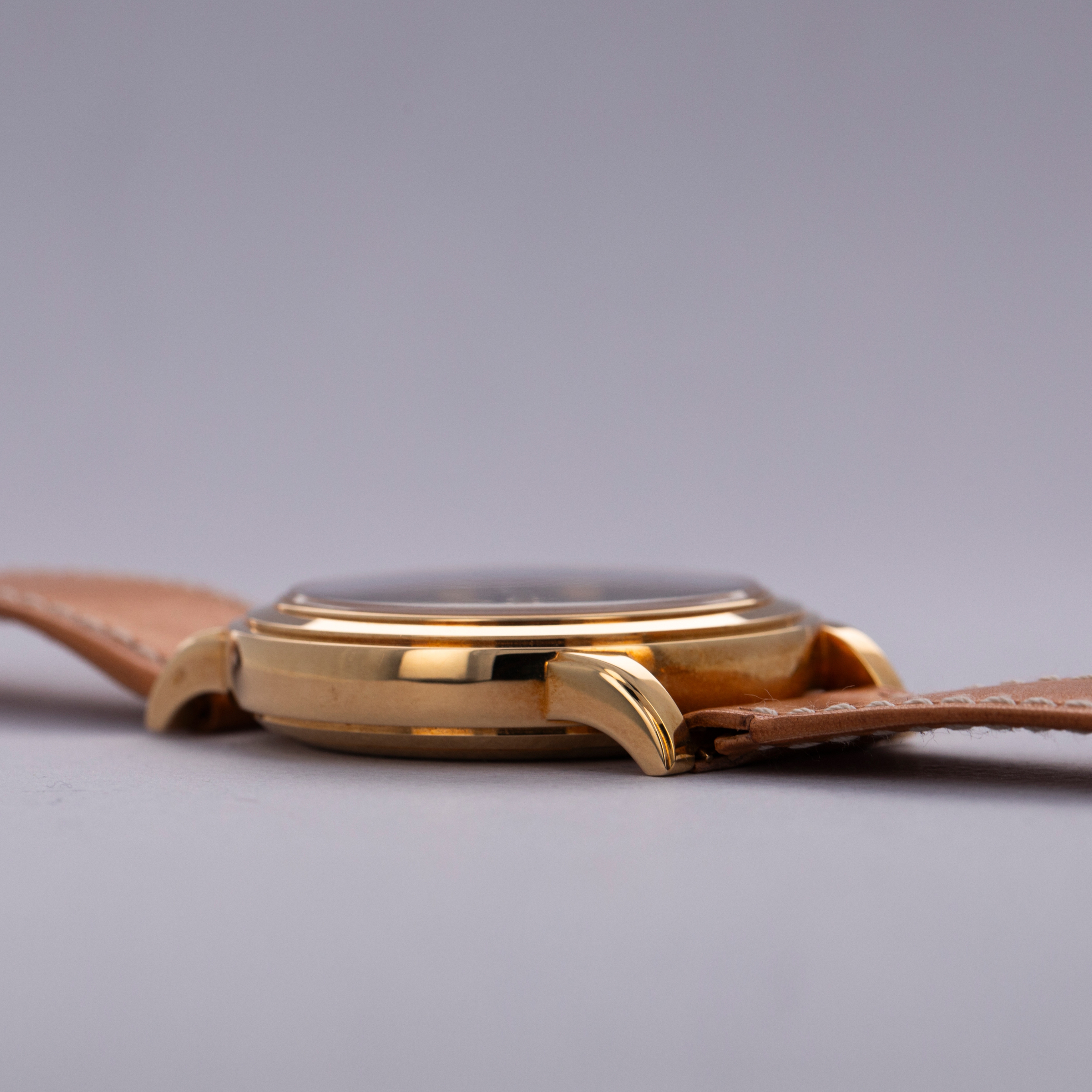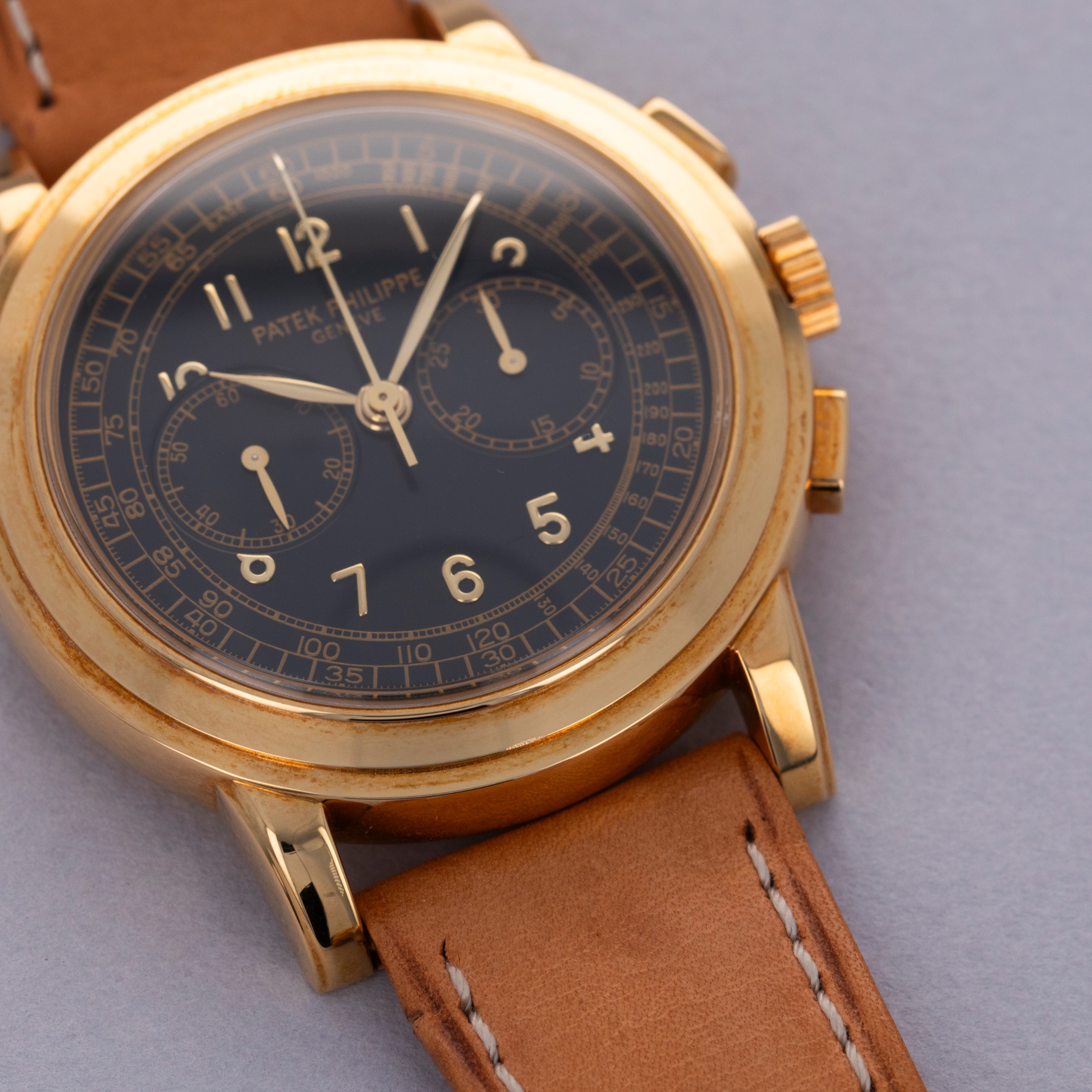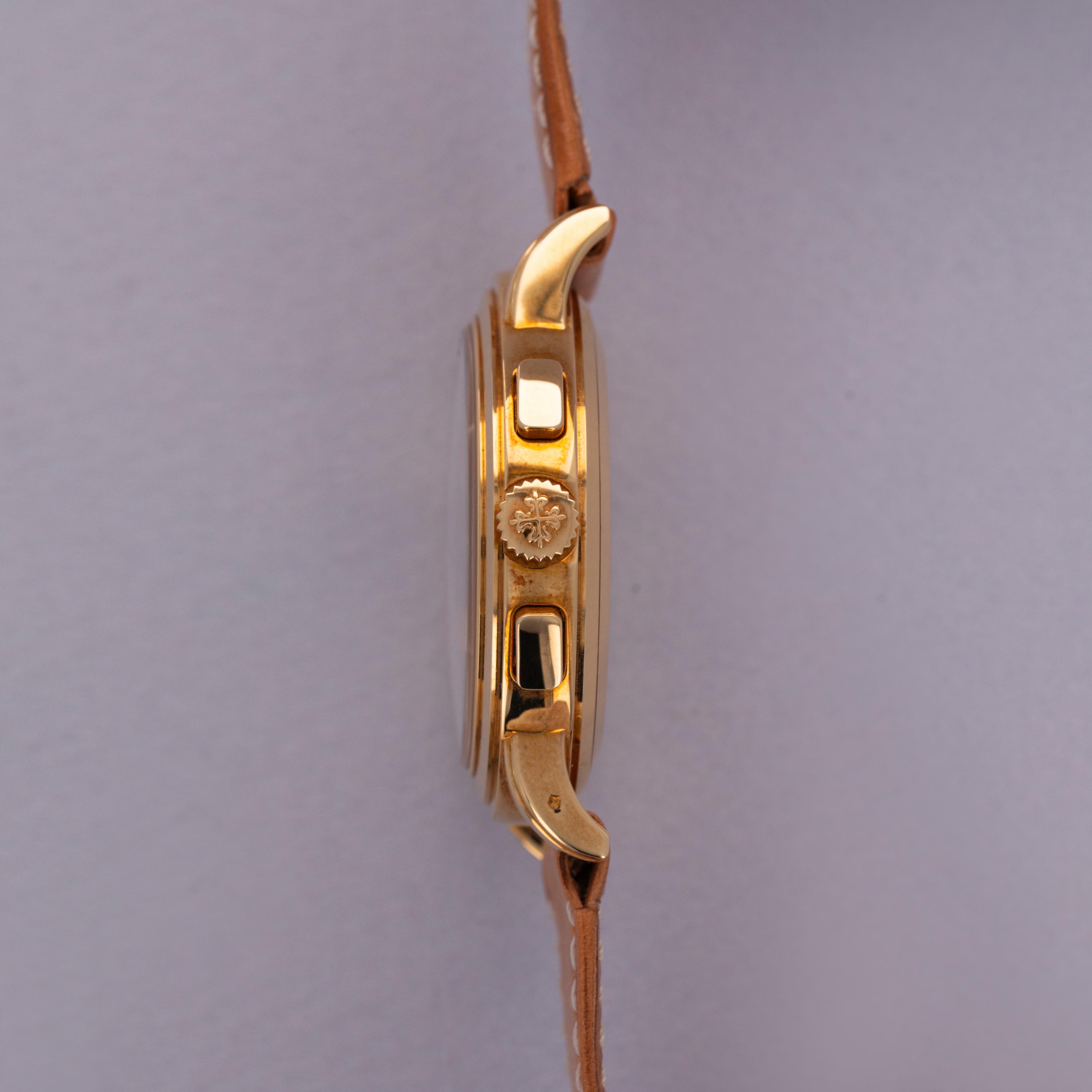 Watch is in like-new condition, with little to no signs of use. Case has developed a warm patina along its surfaces. Watch is accompanied by original box and papers, and certificate of origin. Watch comes on a rare natural finish calf leather strap made by Klotzl for Patek Philippe.