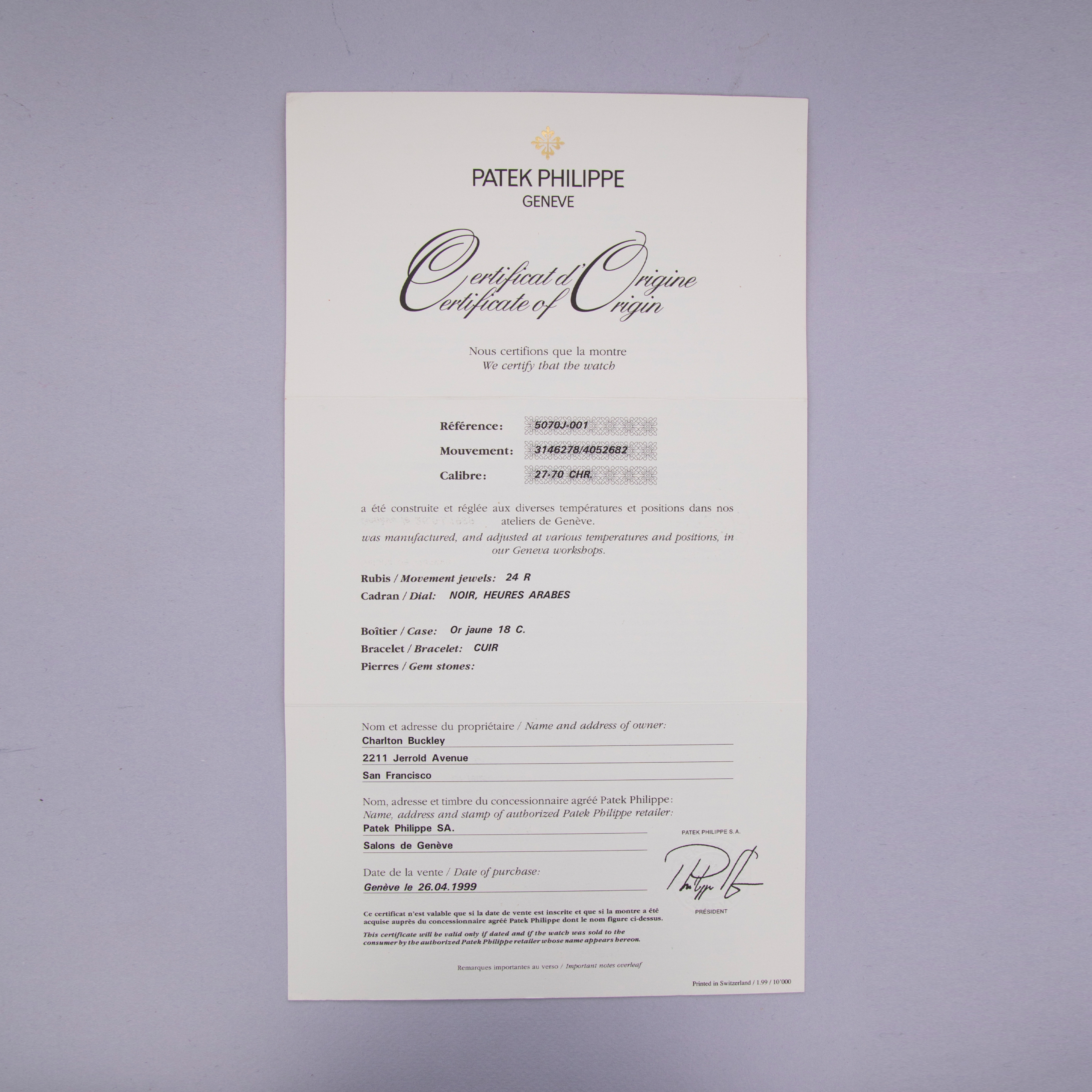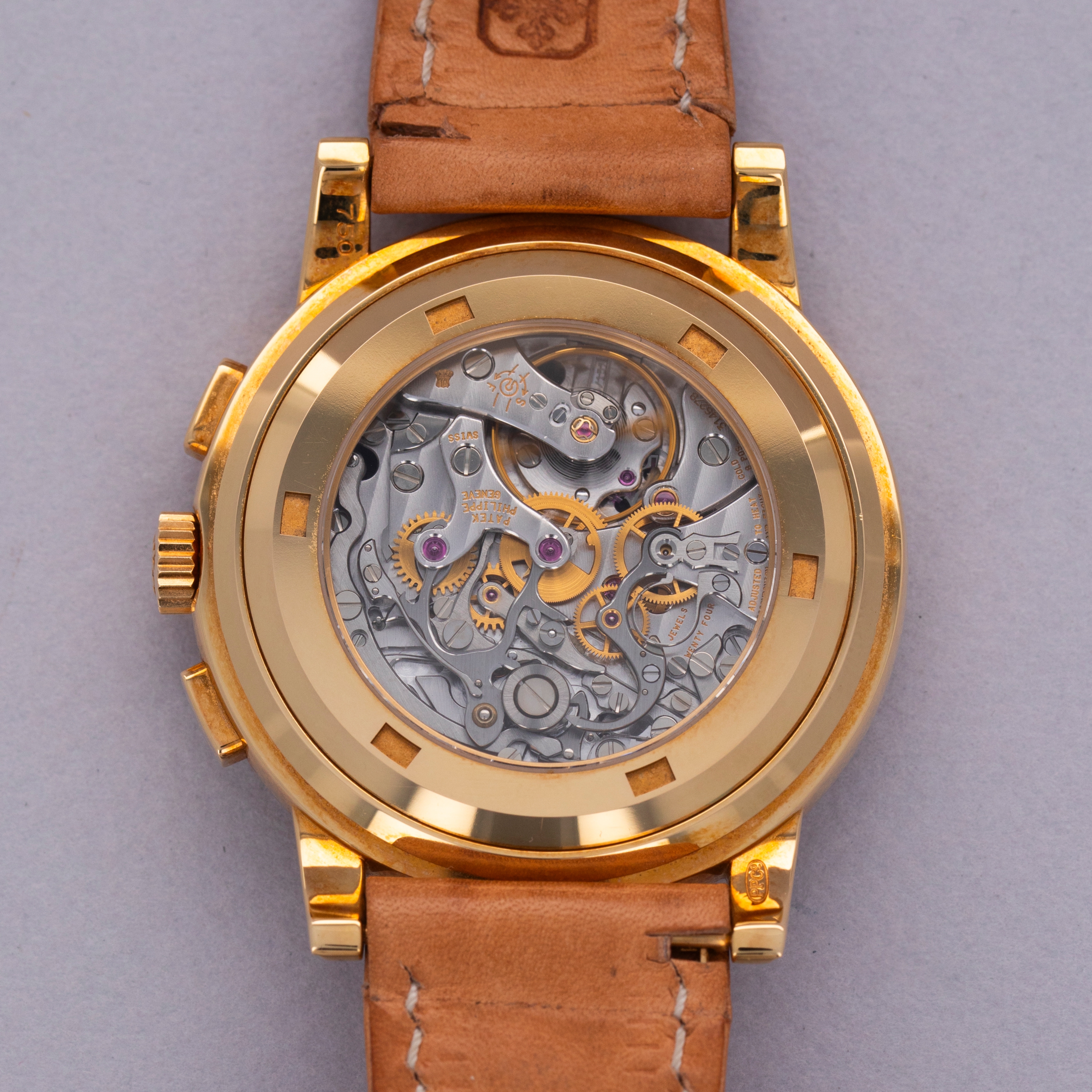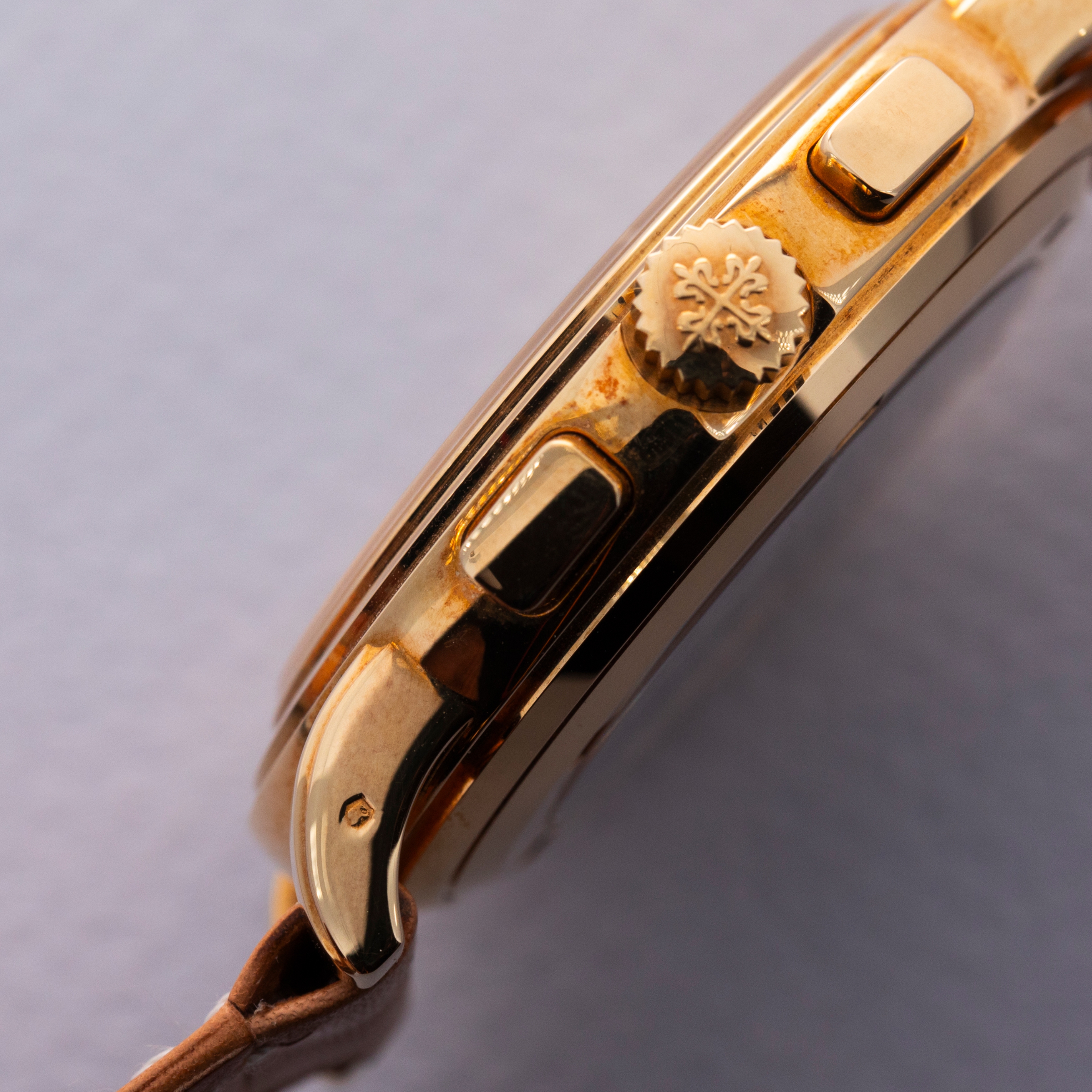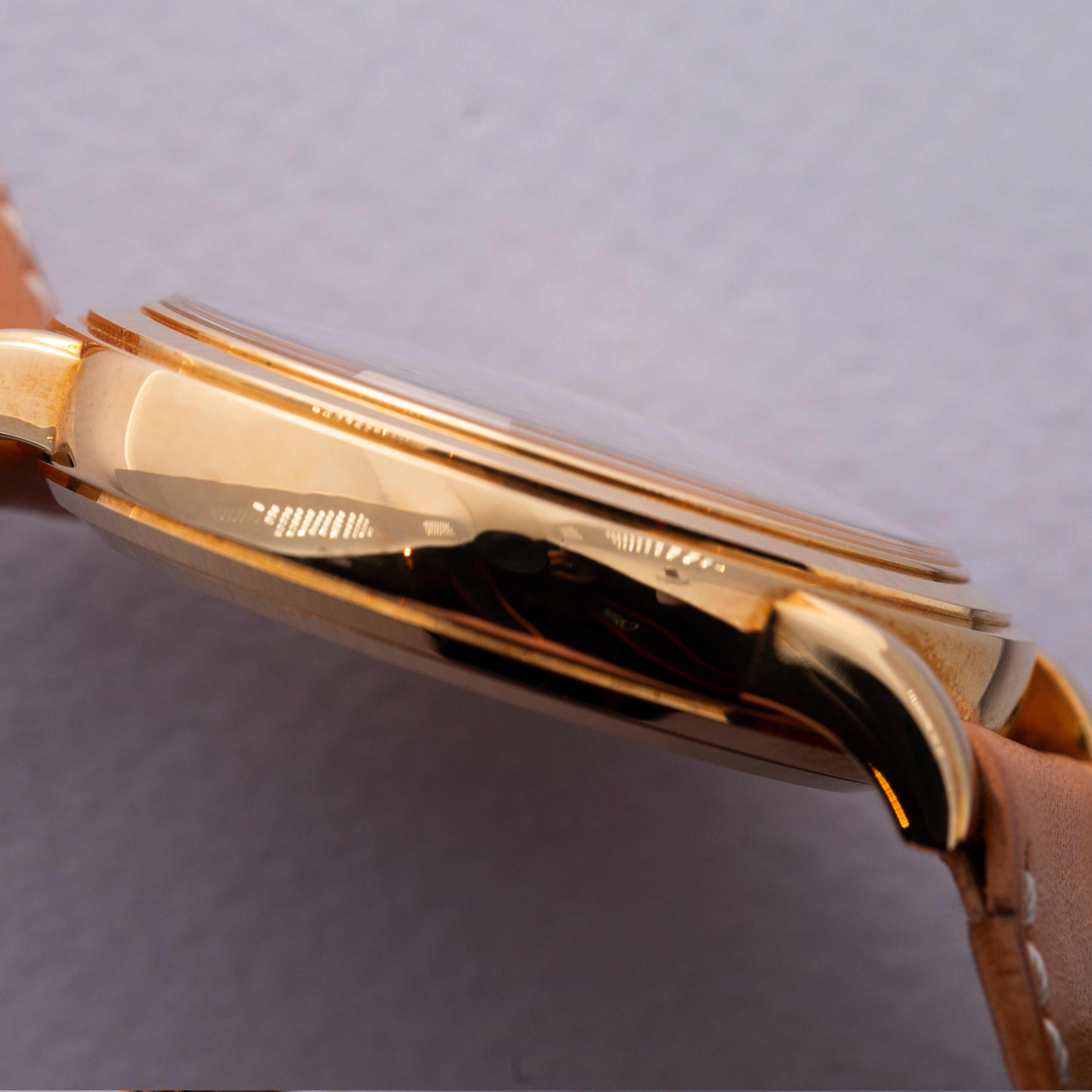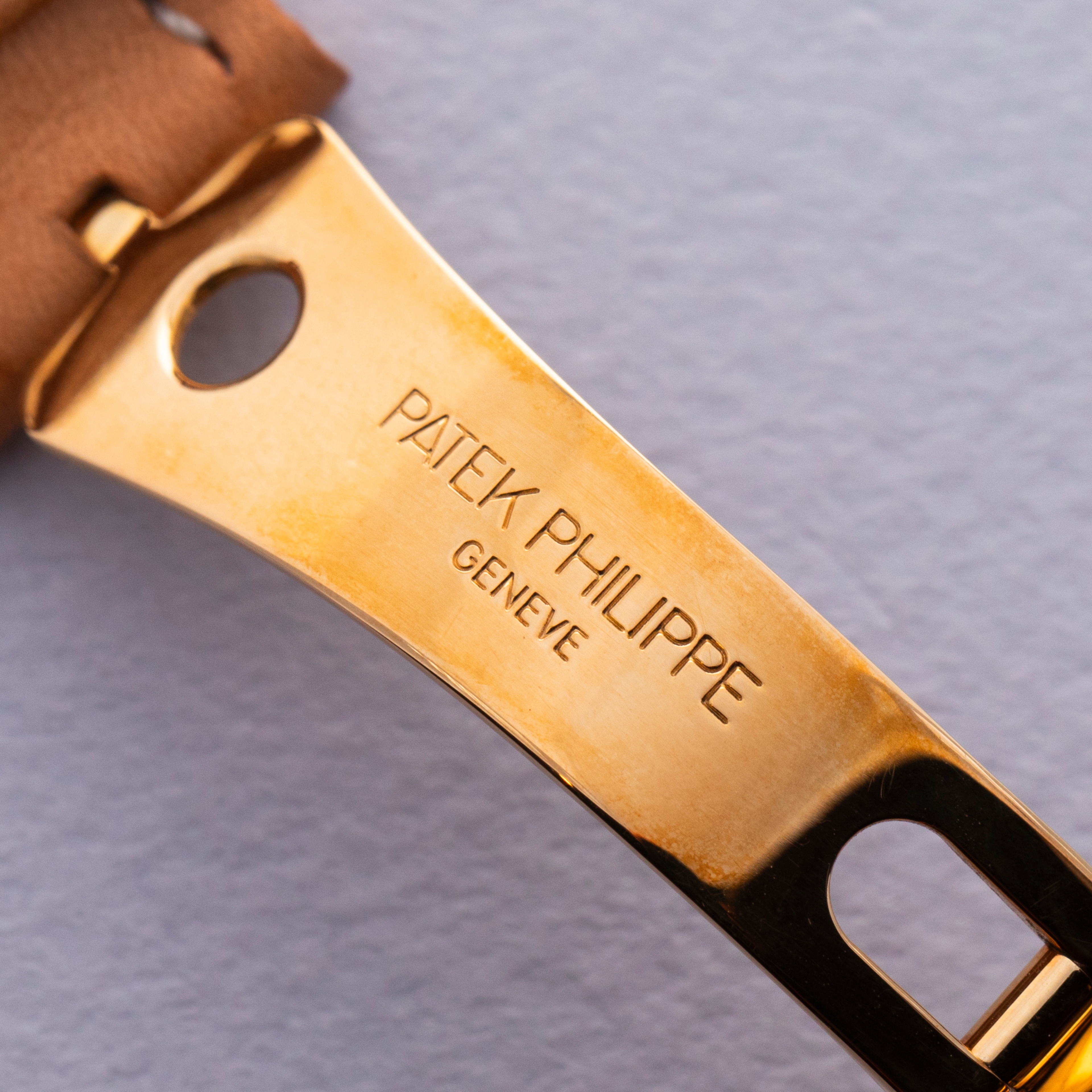 Watch is in like-new condition, with little to no signs of use. Case has developed a warm patina along its surfaces. Watch is accompanied by original box and papers, and certificate of origin. Watch comes on a rare natural finish calf leather strap made by Klotzl for Patek Philippe.