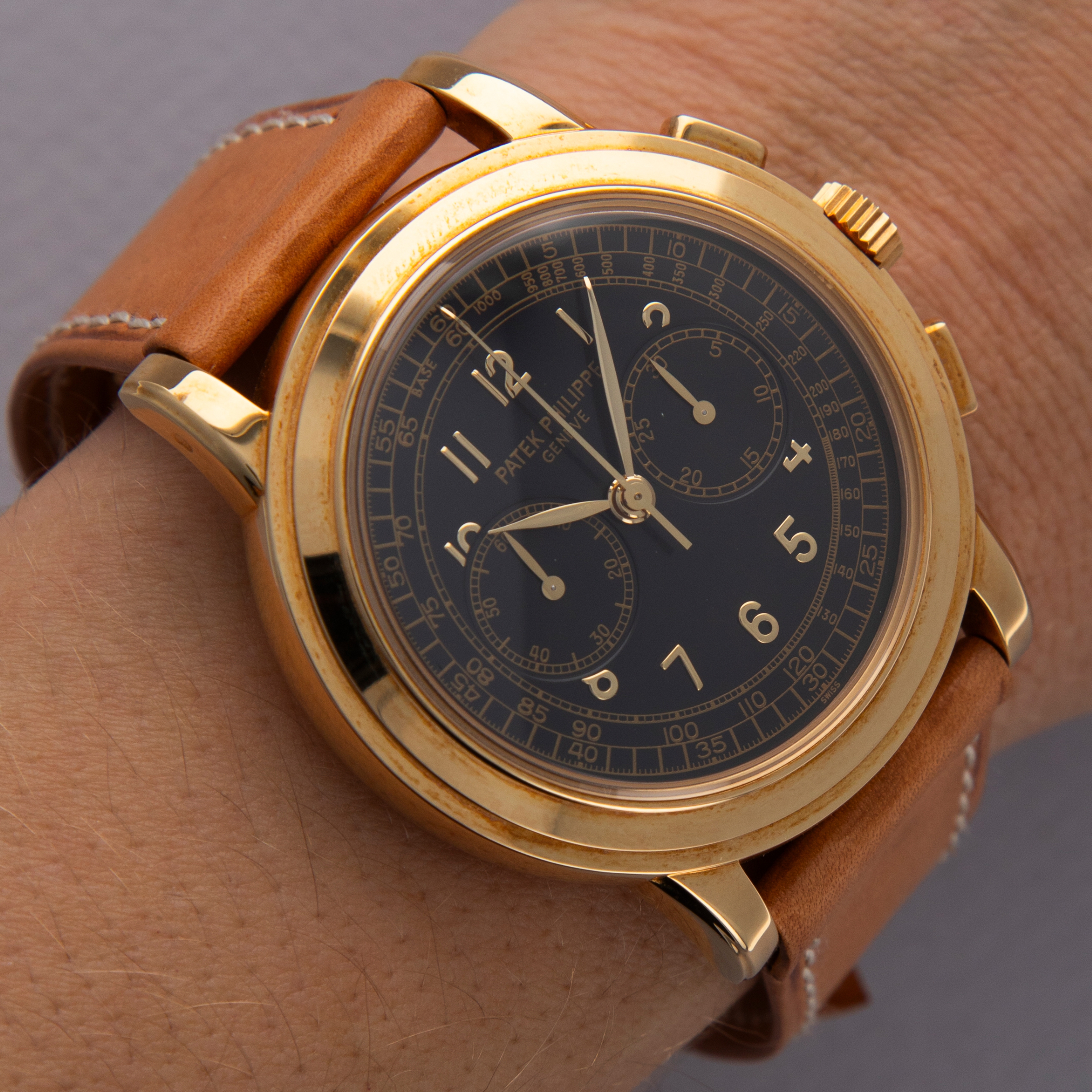 Featuring a black dial with applied Arabic numerals and a bi-compax layout with two sunken subdials at 3 and 9 o'clock, the ref. 5070's display is thoughtfully designed, much like its large 42mm yellow gold case that continues the dial's stepped design across its bezel and lugs.