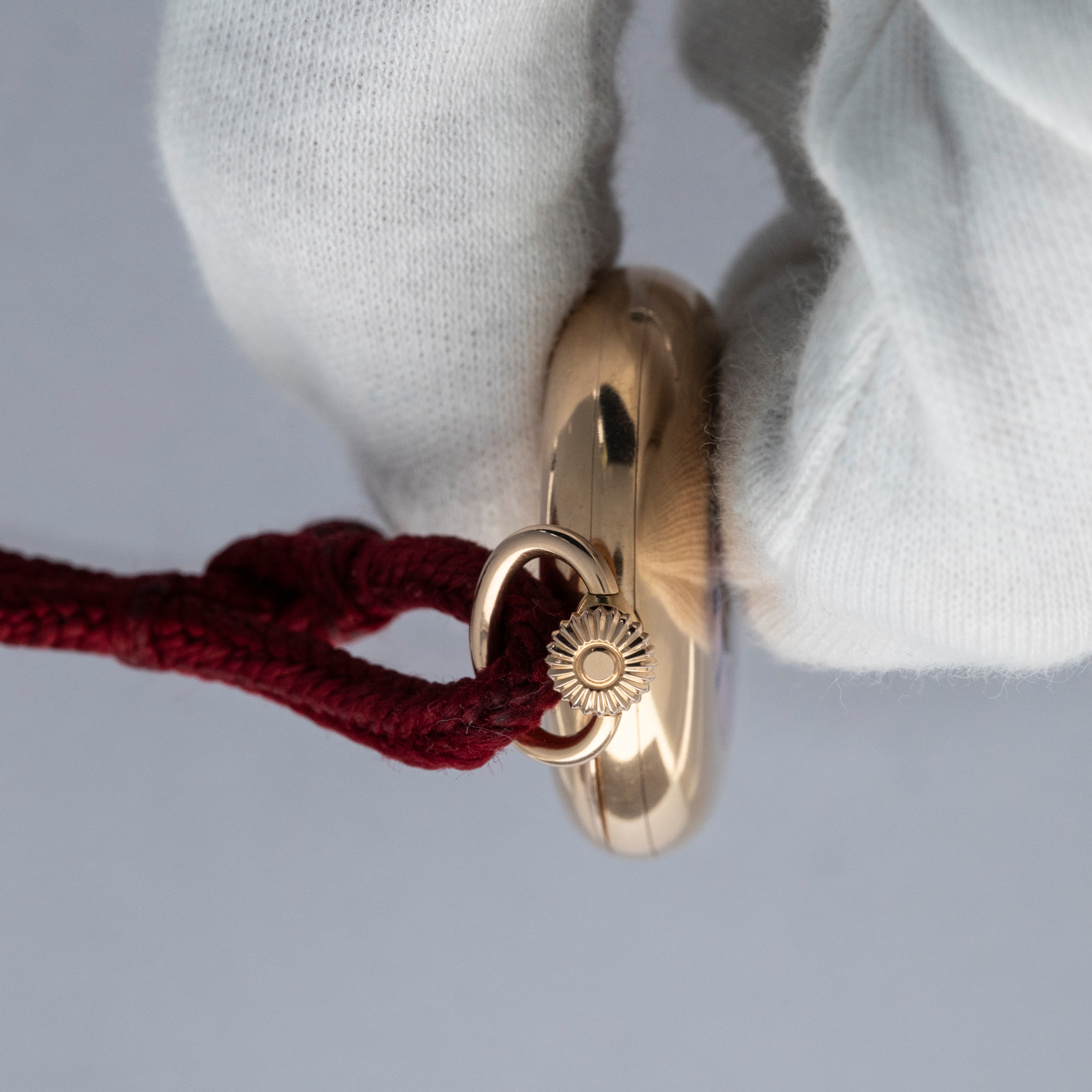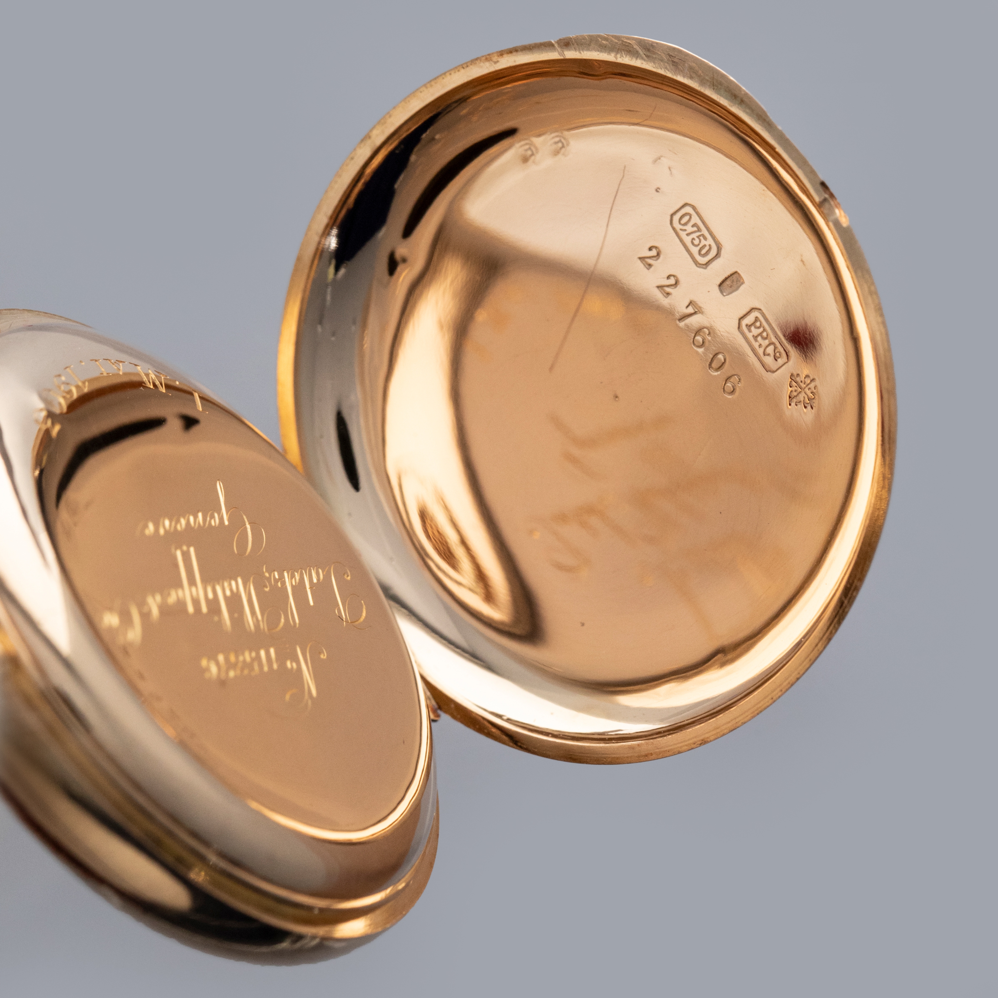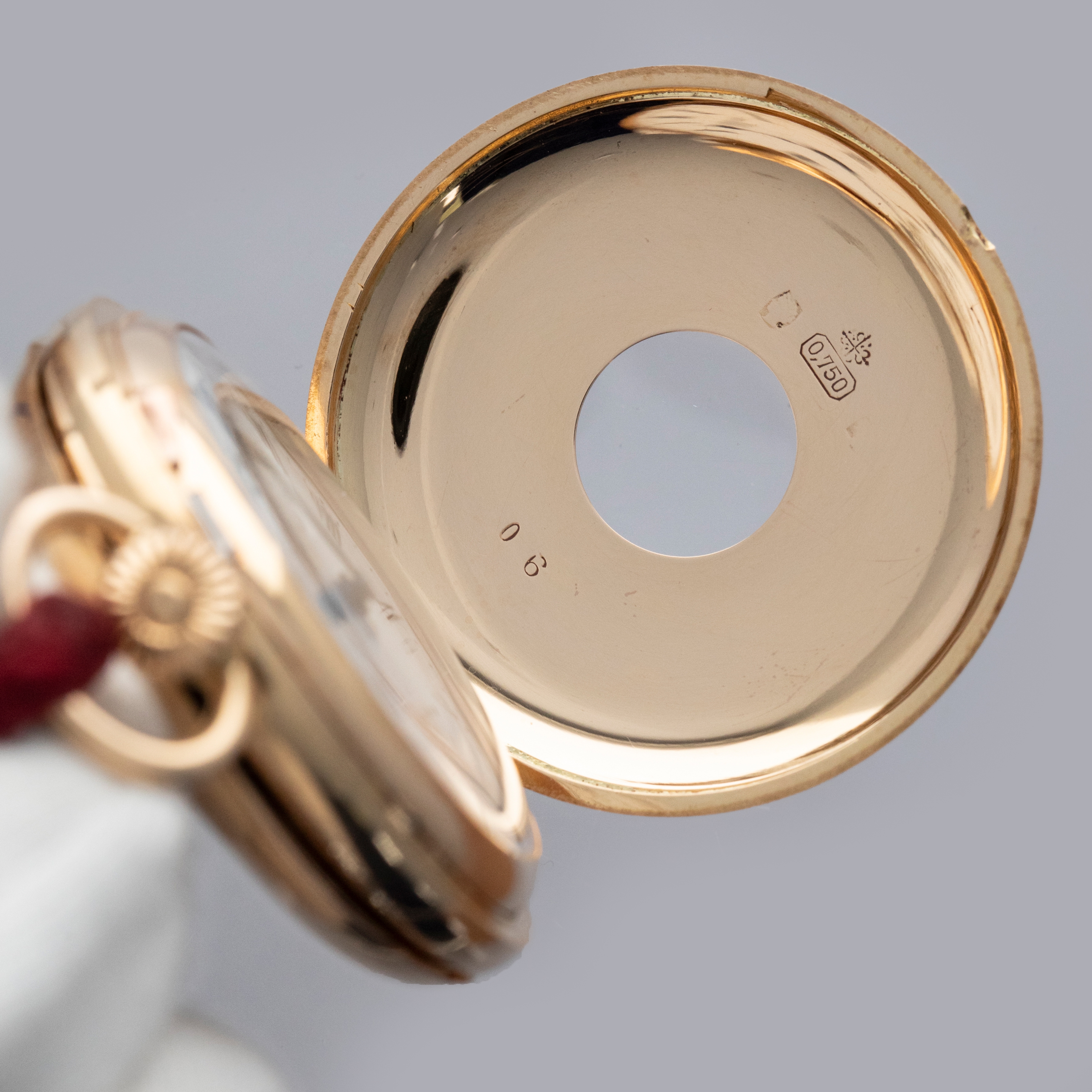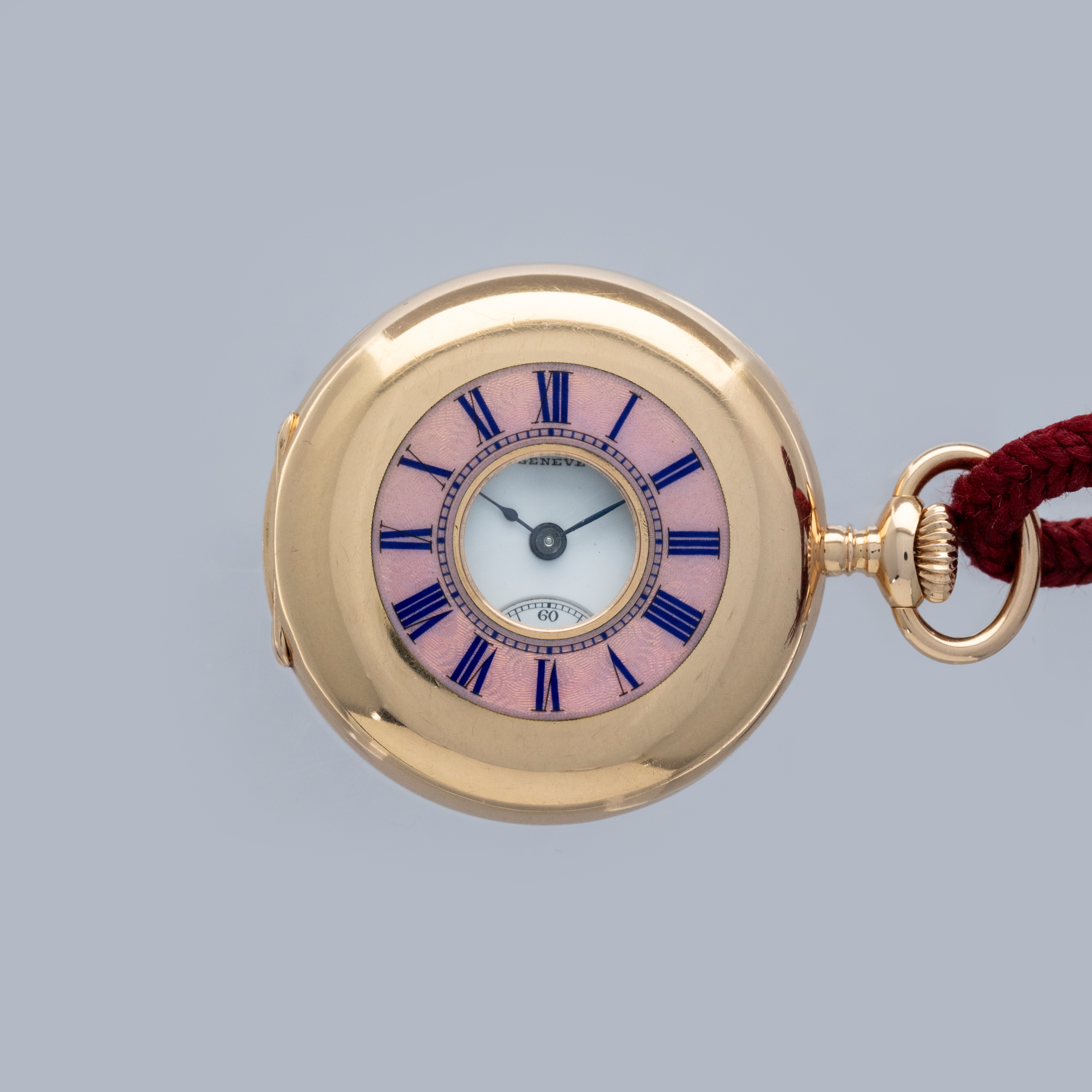 Boasting an enamel-filled chapter ring surrounding its clear window to the dial with blue Roman numerals set in pink, this example's demi-hunter cover serves as an aesthetic flourish and a functional one.