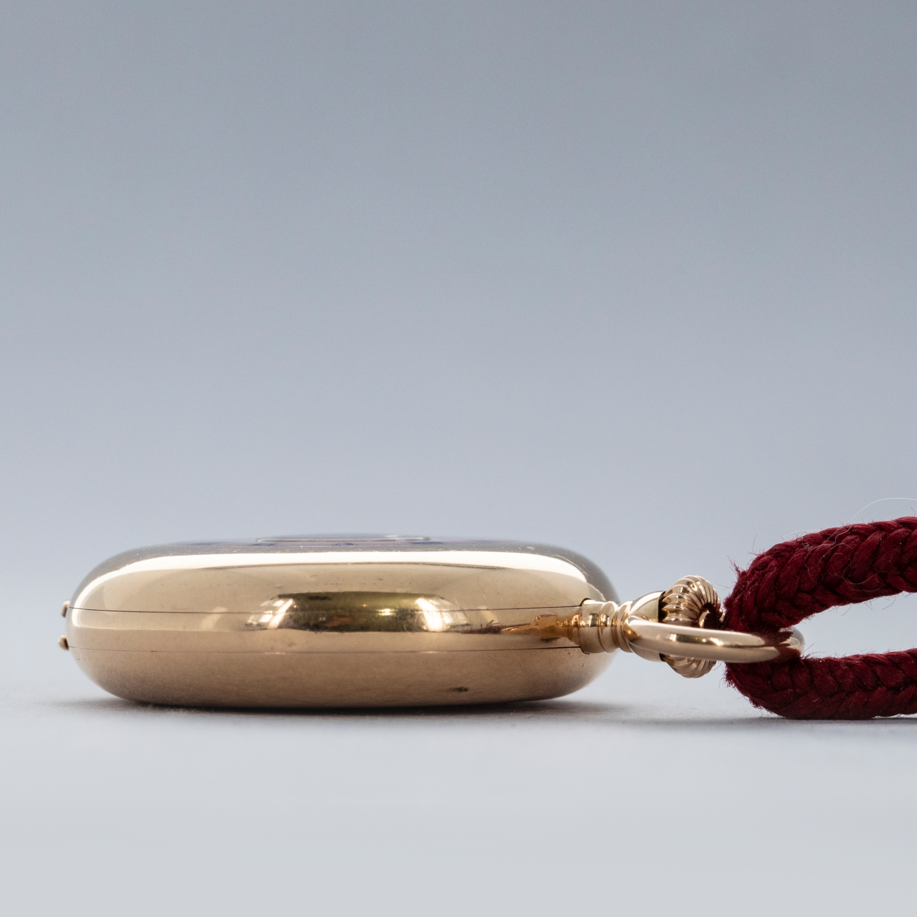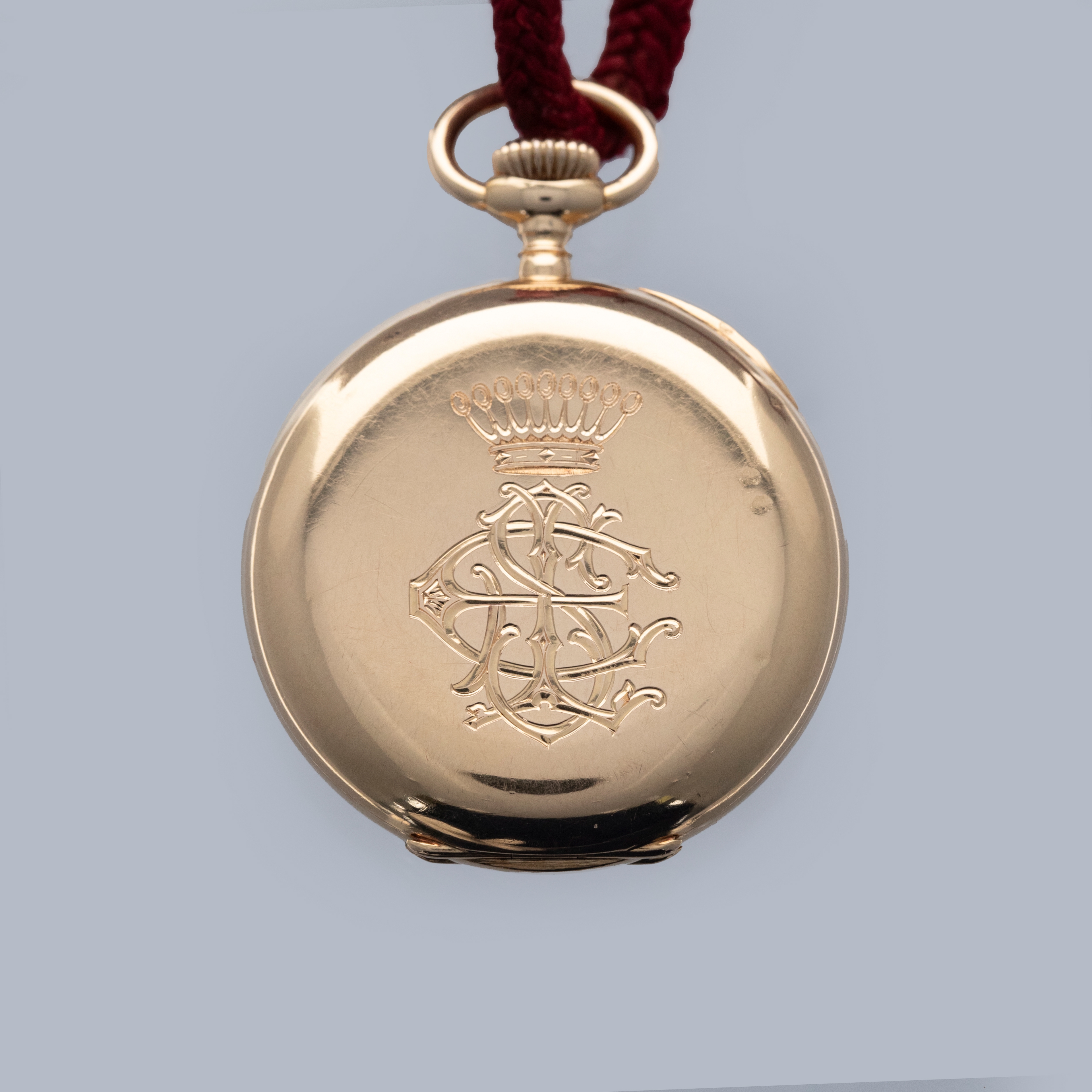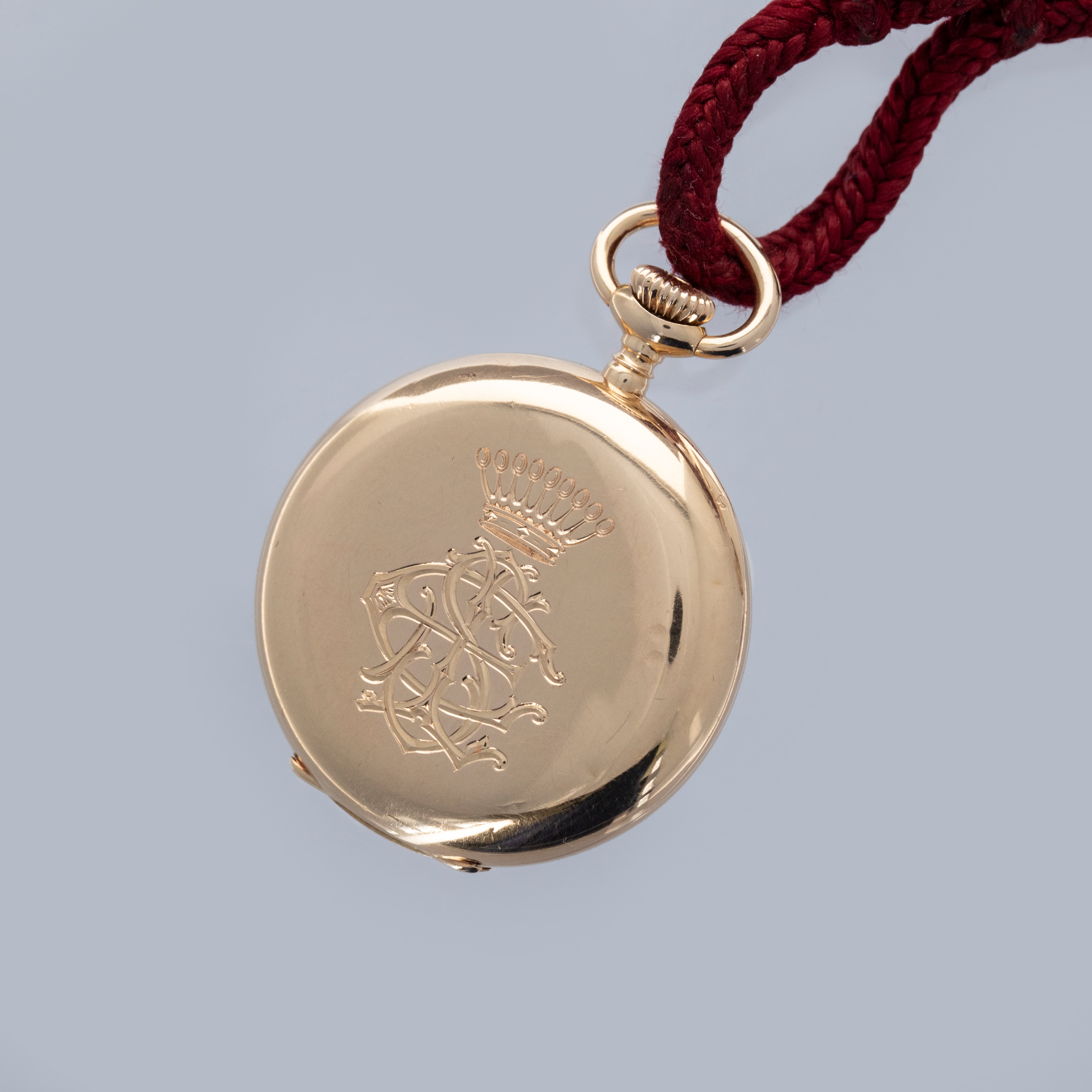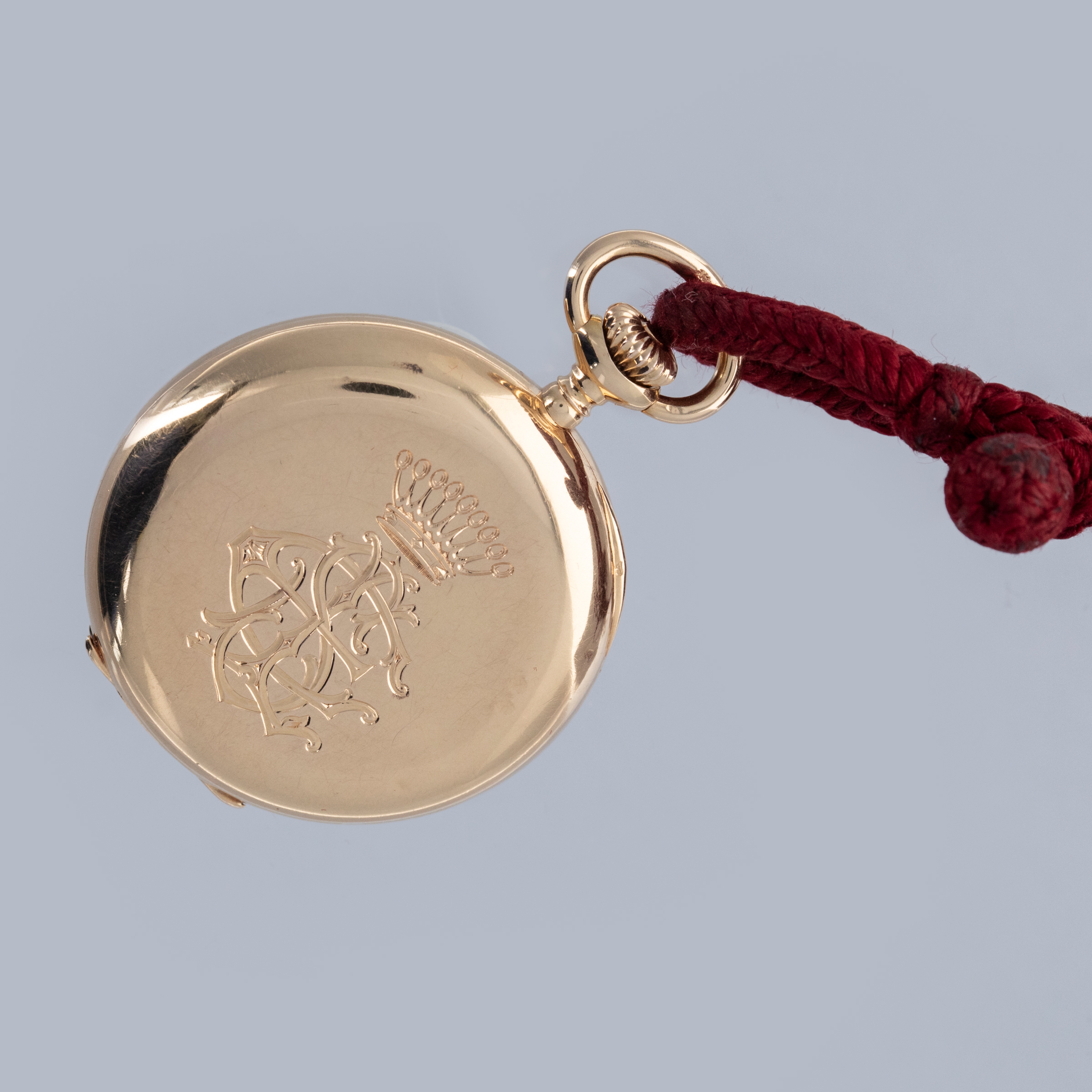 The yellow gold case is in excellent condition, with some light scratches and marks, as expected for a watch of this vintage. The outer case back features a very well-preserved engraving, while the inner case back retains well-defined engravings and hallmarks. The hinged front demi-savonnette cover is in excellent condition, with a well-preserved guilloché pattern and enamel chapter ring around the viewing window. The white enamel dial is in excellent condition, with no visible hairline cracks. The delicate blued hands are very clean. Caseback is monogramed and has a nine-point French Count's coronet.