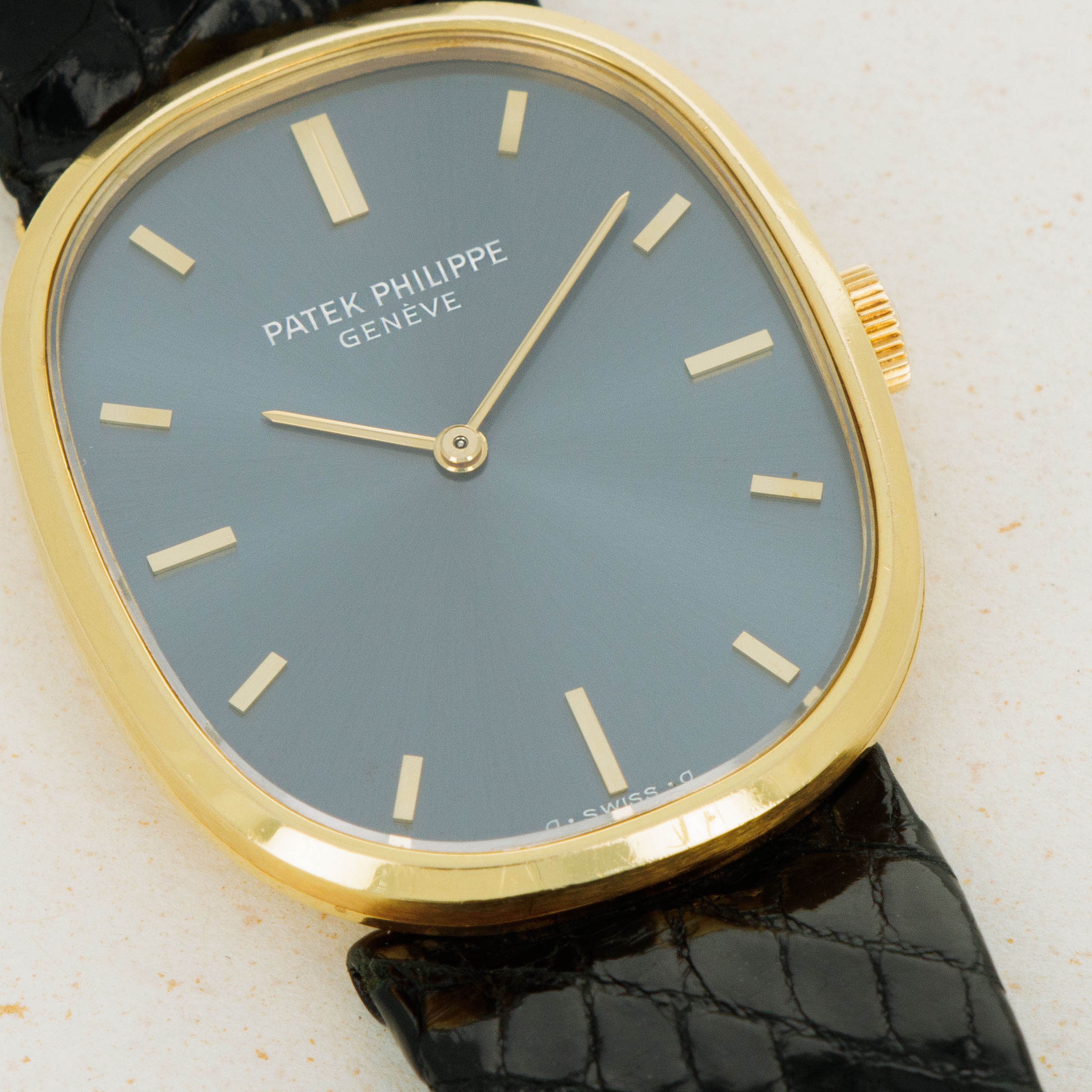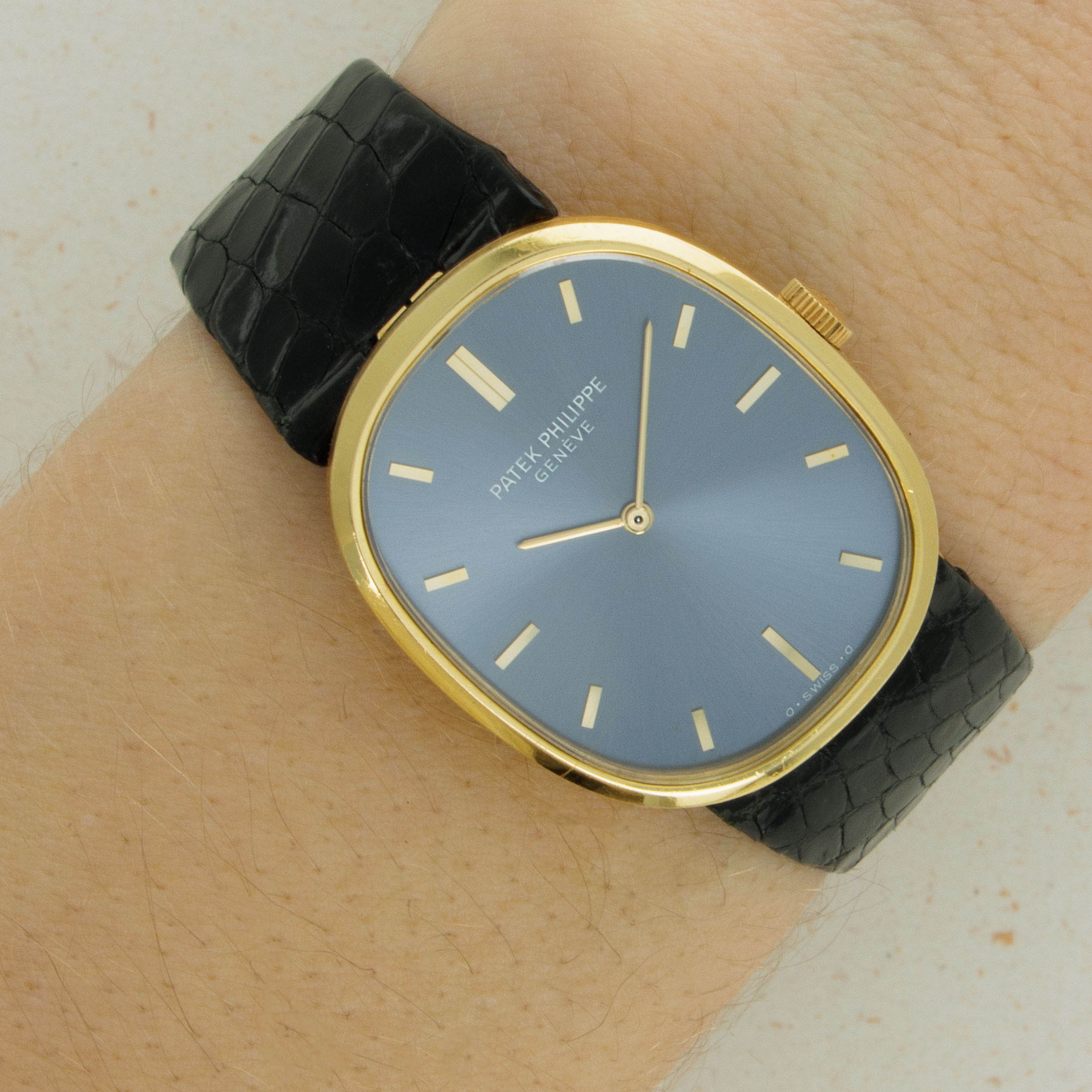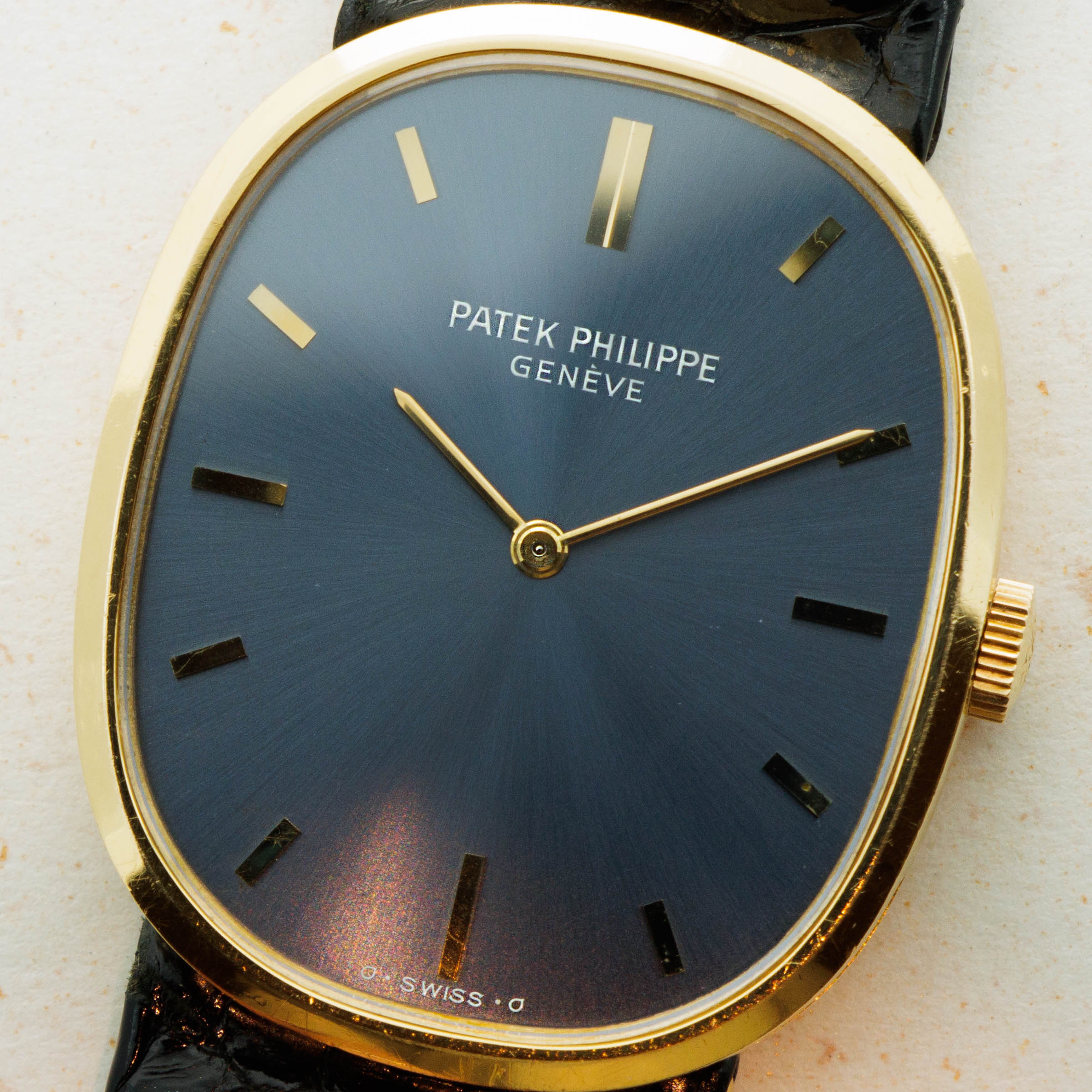 Launched in 1968, then Patek Philippe Golden Ellipse collection marked a significant shift for Patek as they embraced the constantly changing world that was the 1960's. With the dawn quartz technology on its way, Patek sought a watch that was both unisex in its design and also immediately 'Patek' in its aesthetic. With that design brief, Patek debuted the Golden Ellipse to immediate success as a result of its novel and forward-thinking design and luxurious construction. Made from 18k yellow gold and powered by a manual-wind movement, the ref. 3748 that we have here celebrates classical watchmaking's techniques while also retaining a forward-thinking design in the form of its thin oval-shaped case, understated blue dial, lug-less design, and elegant unisex proportions. Over the years Patek Philippe have produced several other Golden Ellipse variants that have proved to be just as successful as the ref. 3748 and thus contributed to the collection being able to remaine within Patek's catalog and earn a position as an immediately recognizable icon.
