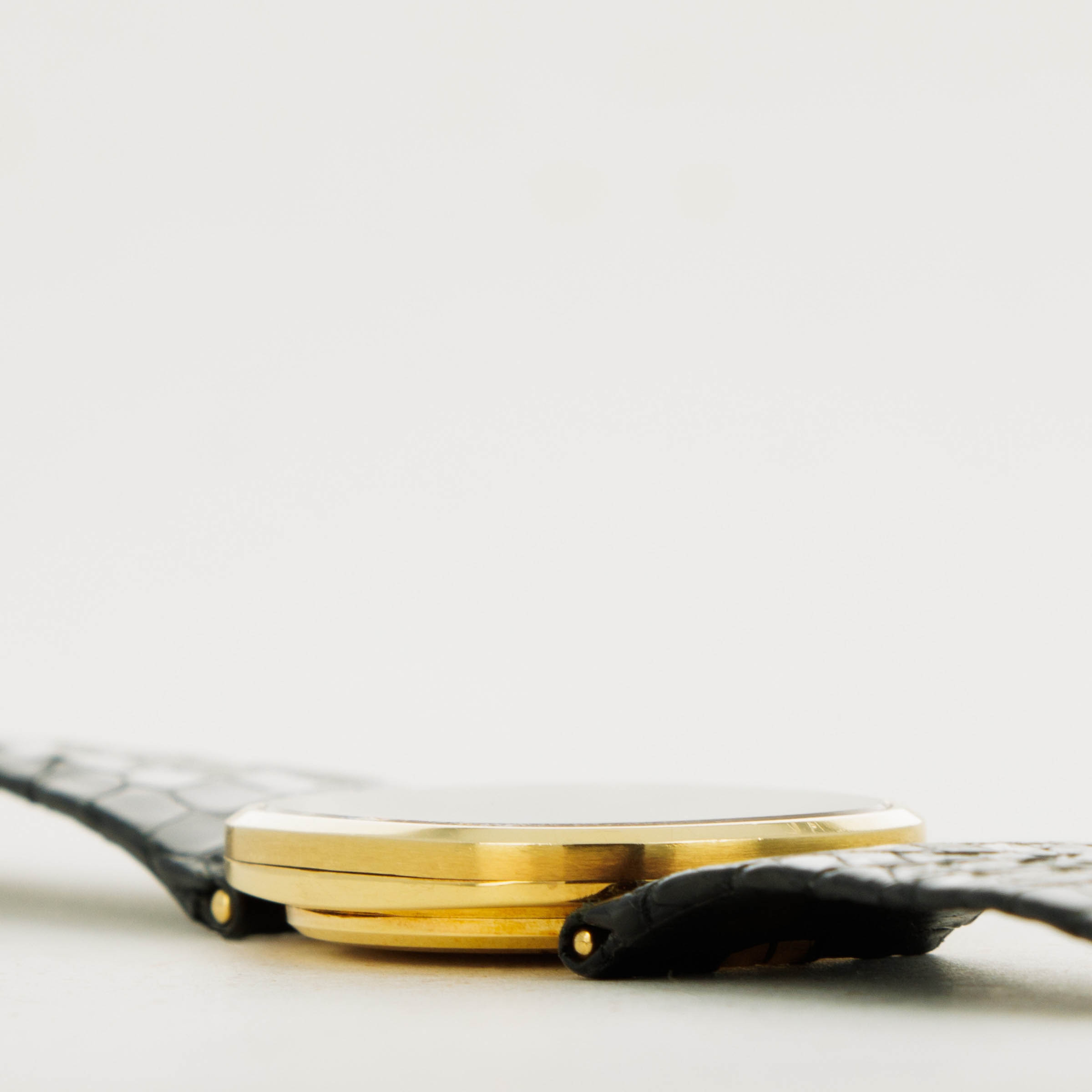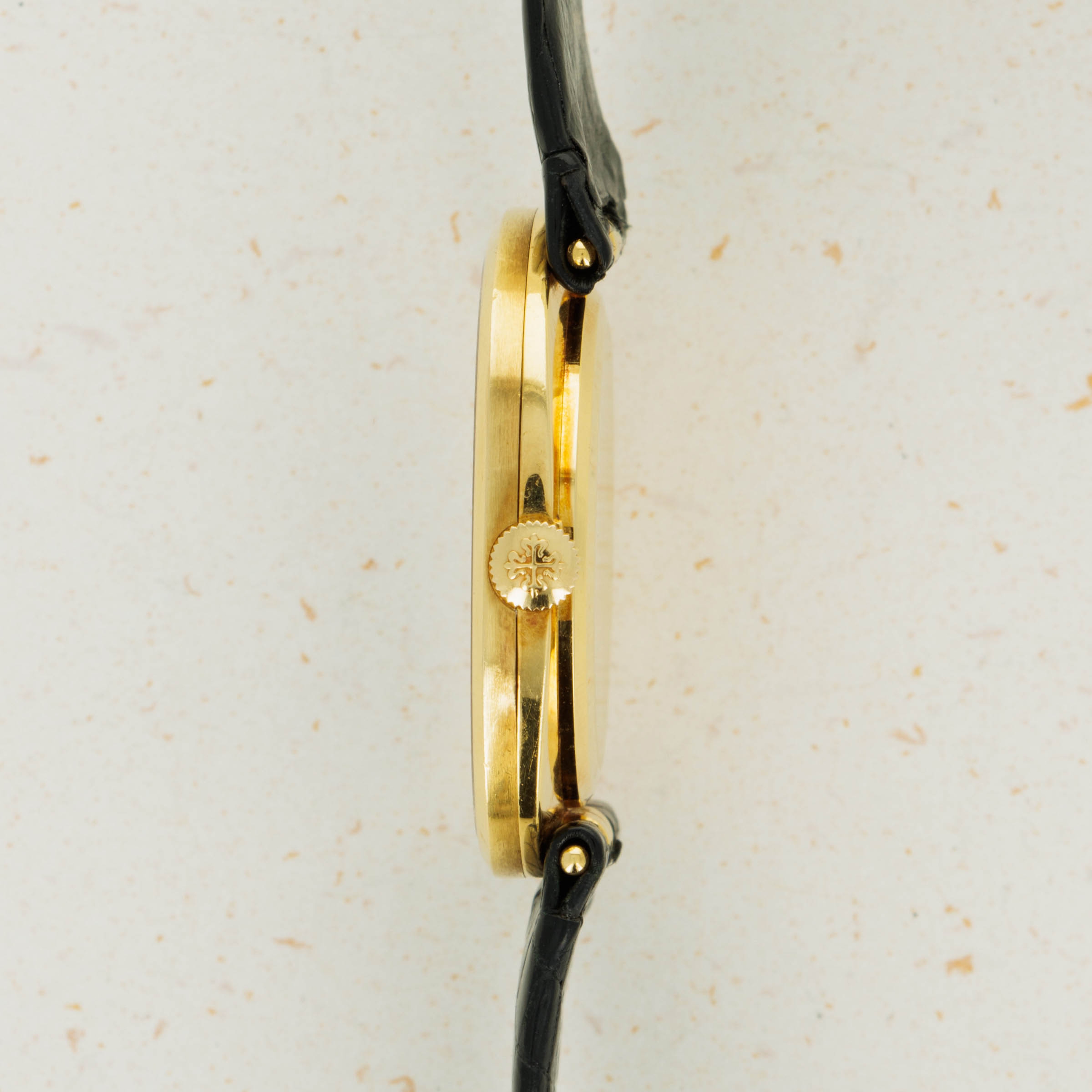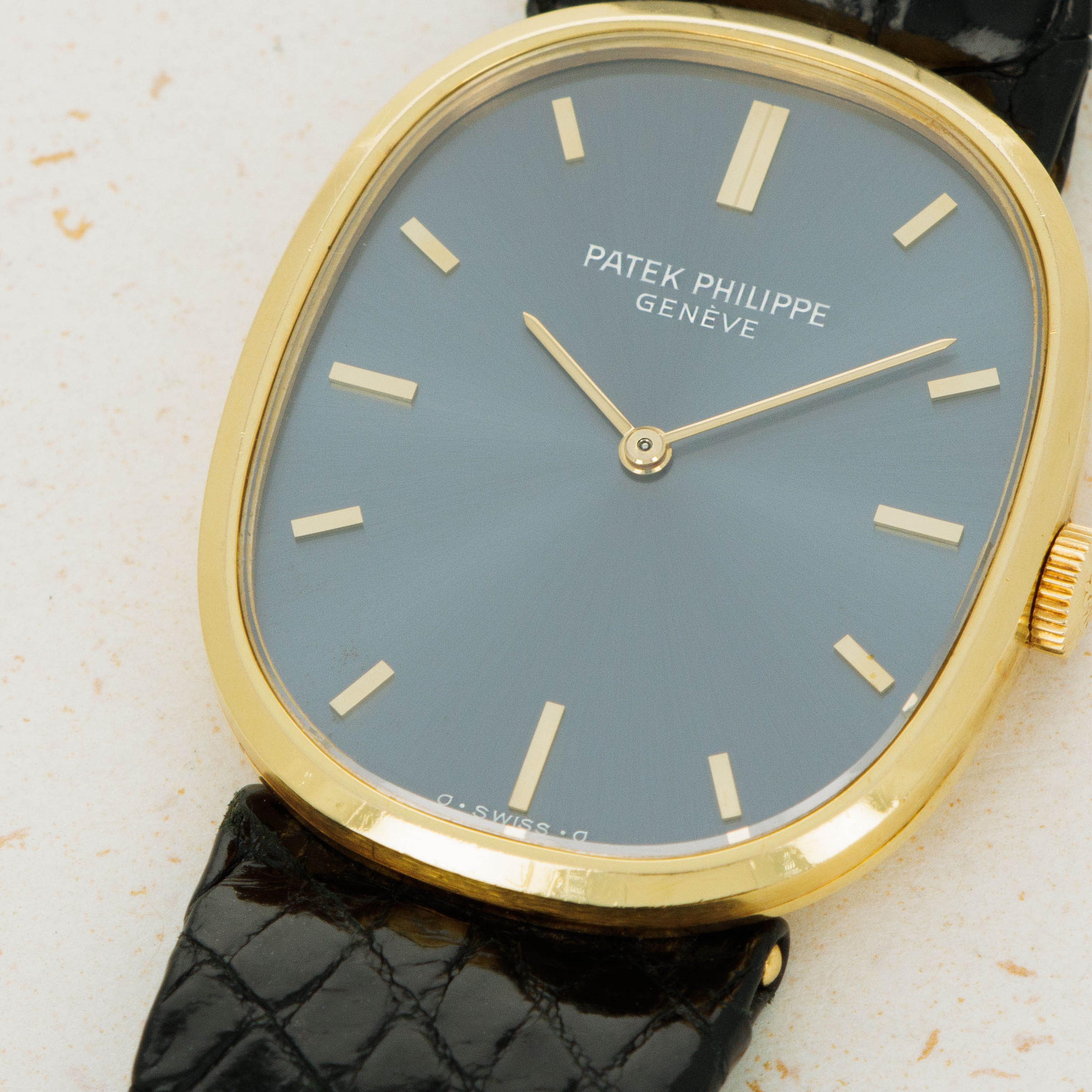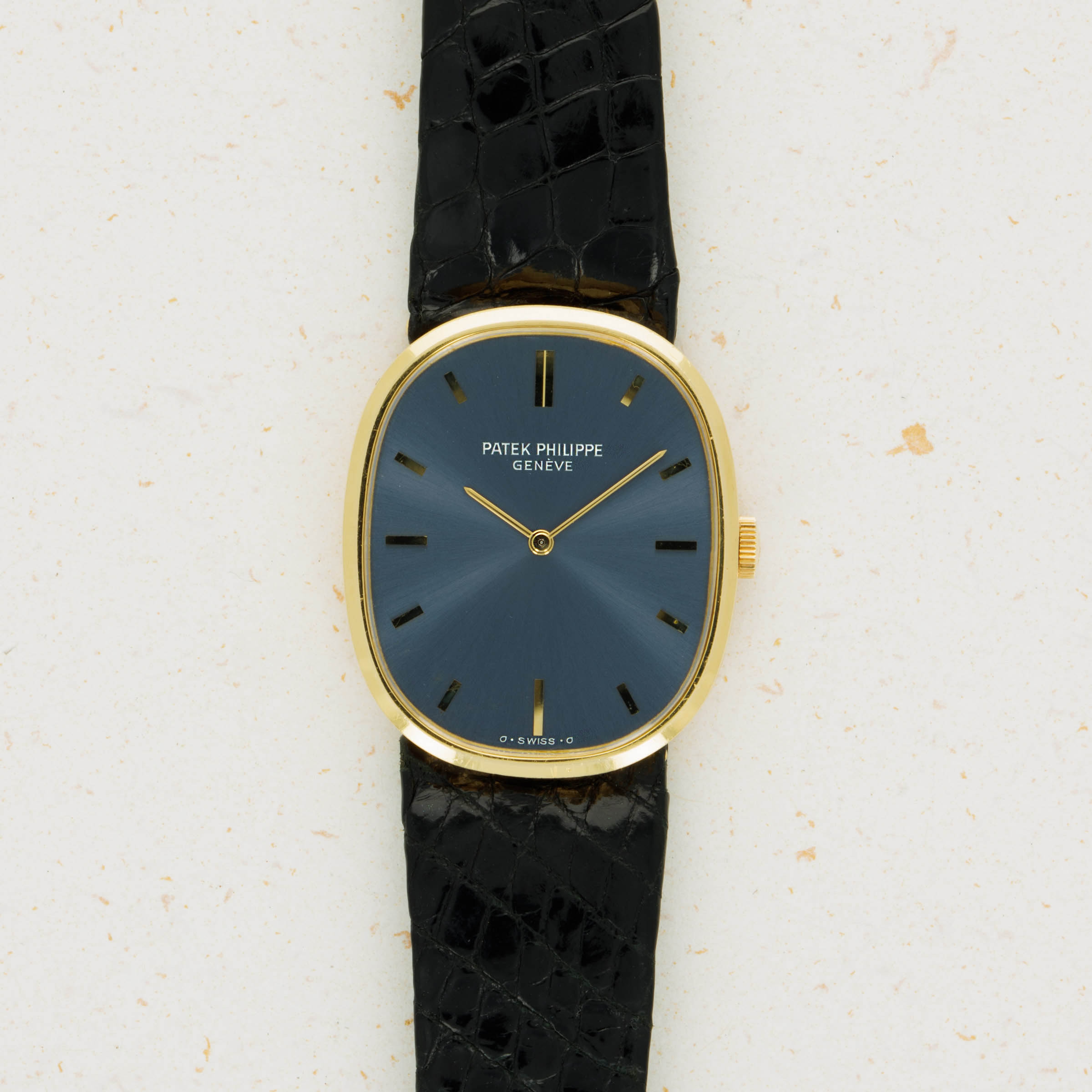 Launched in 1968, then Patek Philippe Golden Ellipse collection marked a significant shift for Patek as they embraced the constantly changing world that was the 1960's. With the dawn quartz technology on its way, Patek sought a watch that was both unisex in its design and also immediately 'Patek' in its aesthetic. With that design brief, Patek debuted the Golden Ellipse to immediate success as a result of its novel and forward-thinking design and luxurious construction. Made from 18k yellow gold and powered by a manual-wind movement, the ref. 3748 that we have here celebrates classical watchmaking's techniques while also retaining a forward-thinking design in the form of its thin oval-shaped case, understated blue dial, lug-less design, and elegant unisex proportions. Over the years Patek Philippe have produced several other Golden Ellipse variants that have proved to be just as successful as the ref. 3748 and thus contributed to the collection being able to remaine within Patek's catalog and earn a position as an immediately recognizable icon.