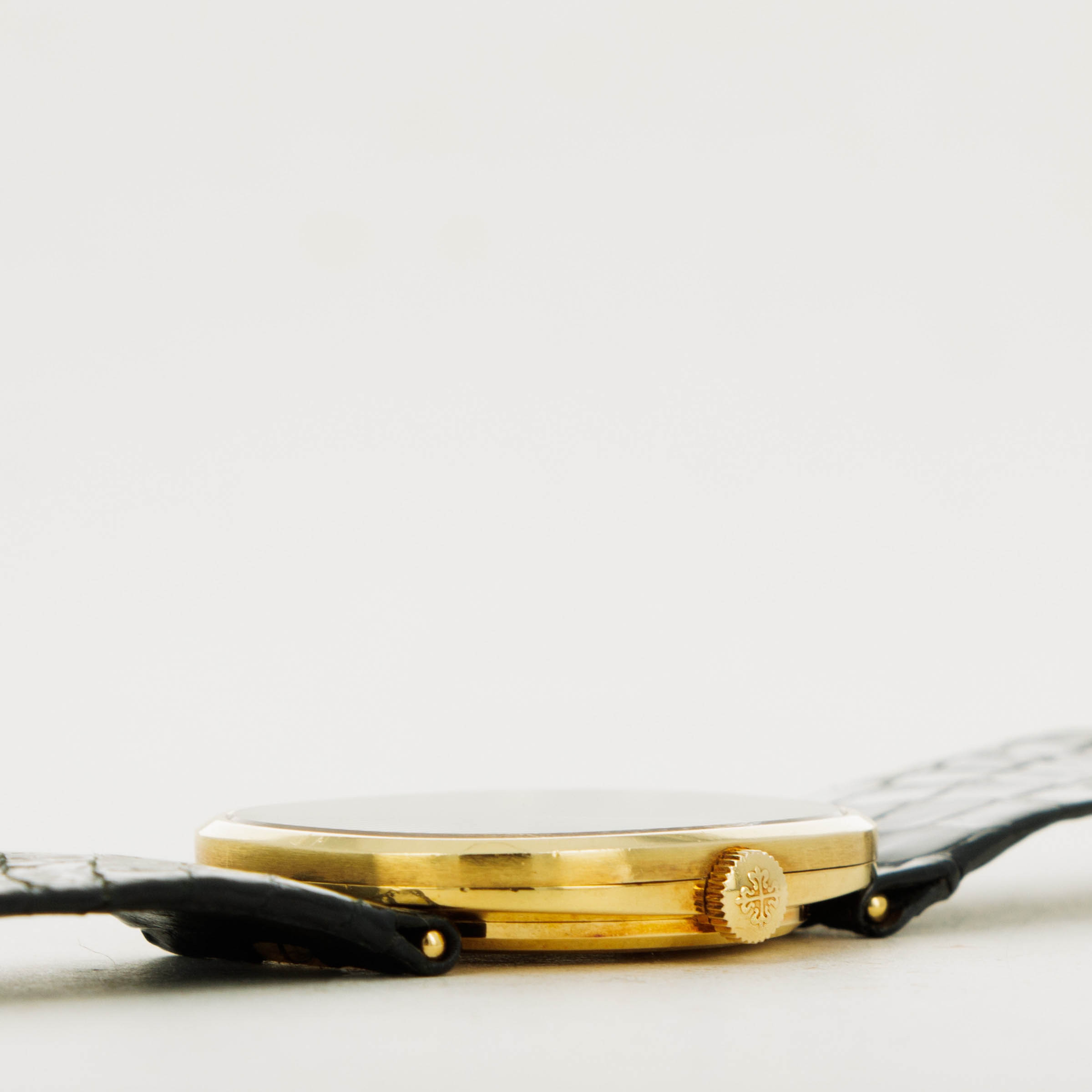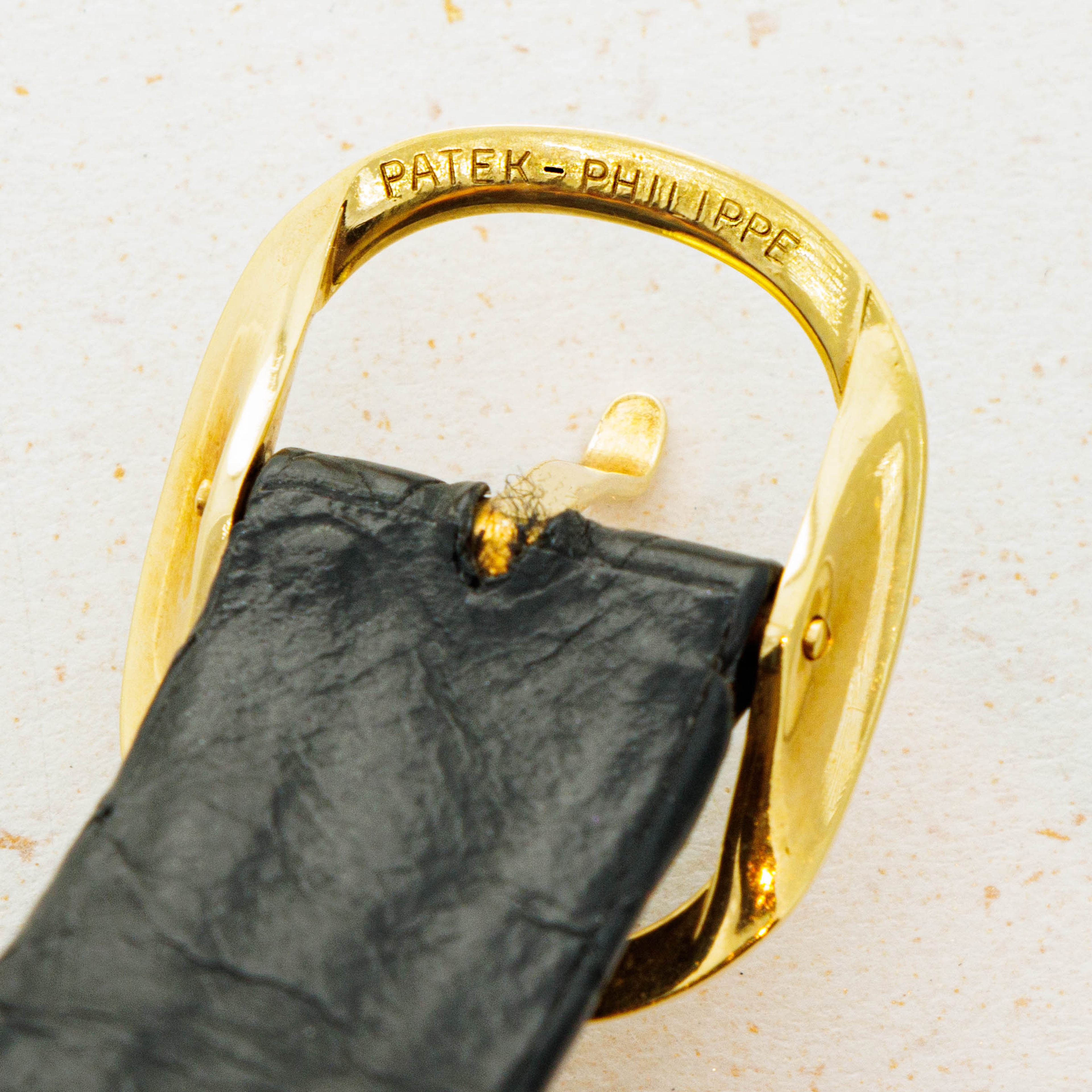 Watch is in excellent condition. There are some minor scratches and marks along the surface of the watch, but they are minor in nature. Caseback is crisp and has a very nice edge where the brushed center meets the polished lip. Dial near-mint without any visible marks. The color has faded to a slate blue color. Watch comes with its original oval PP signed buckle.