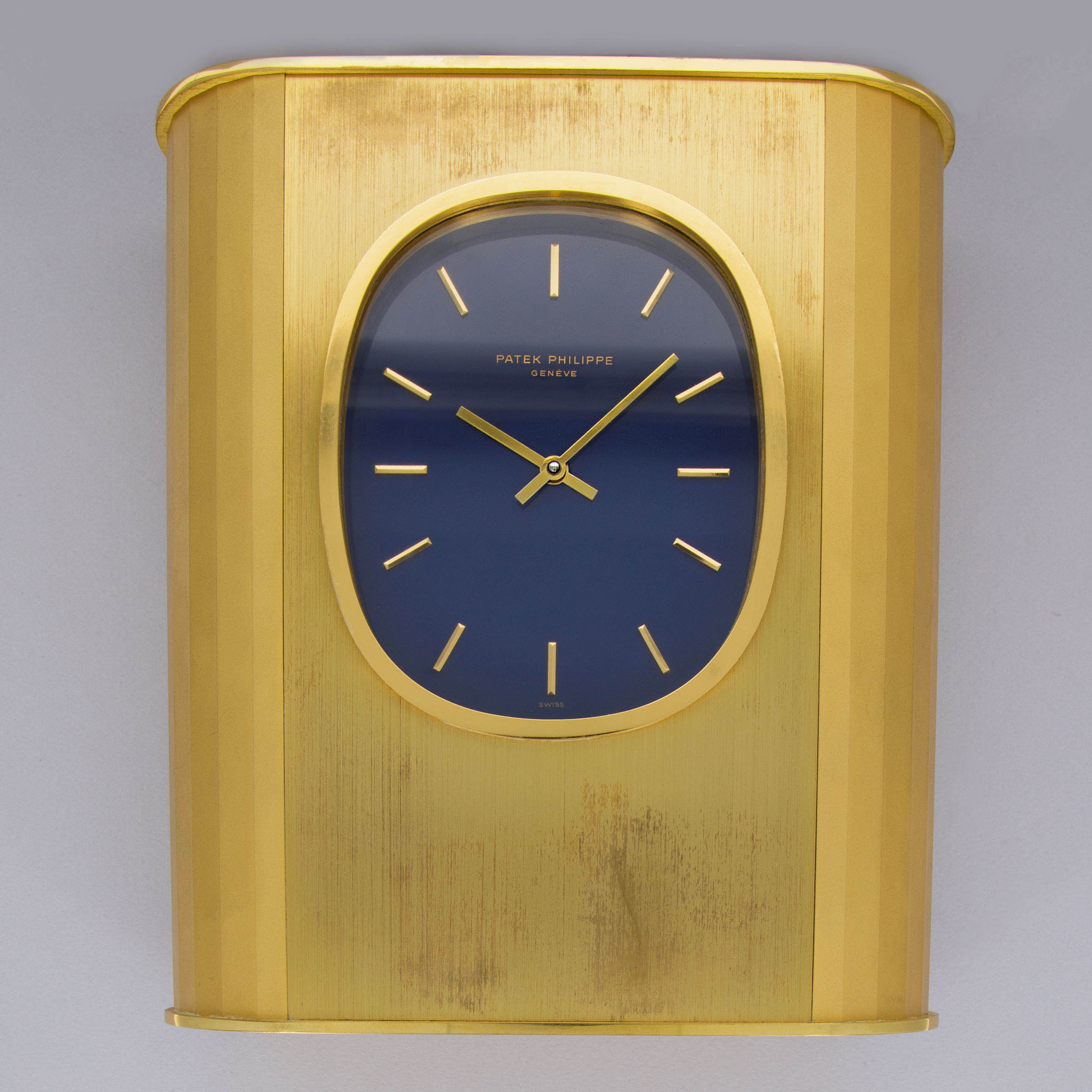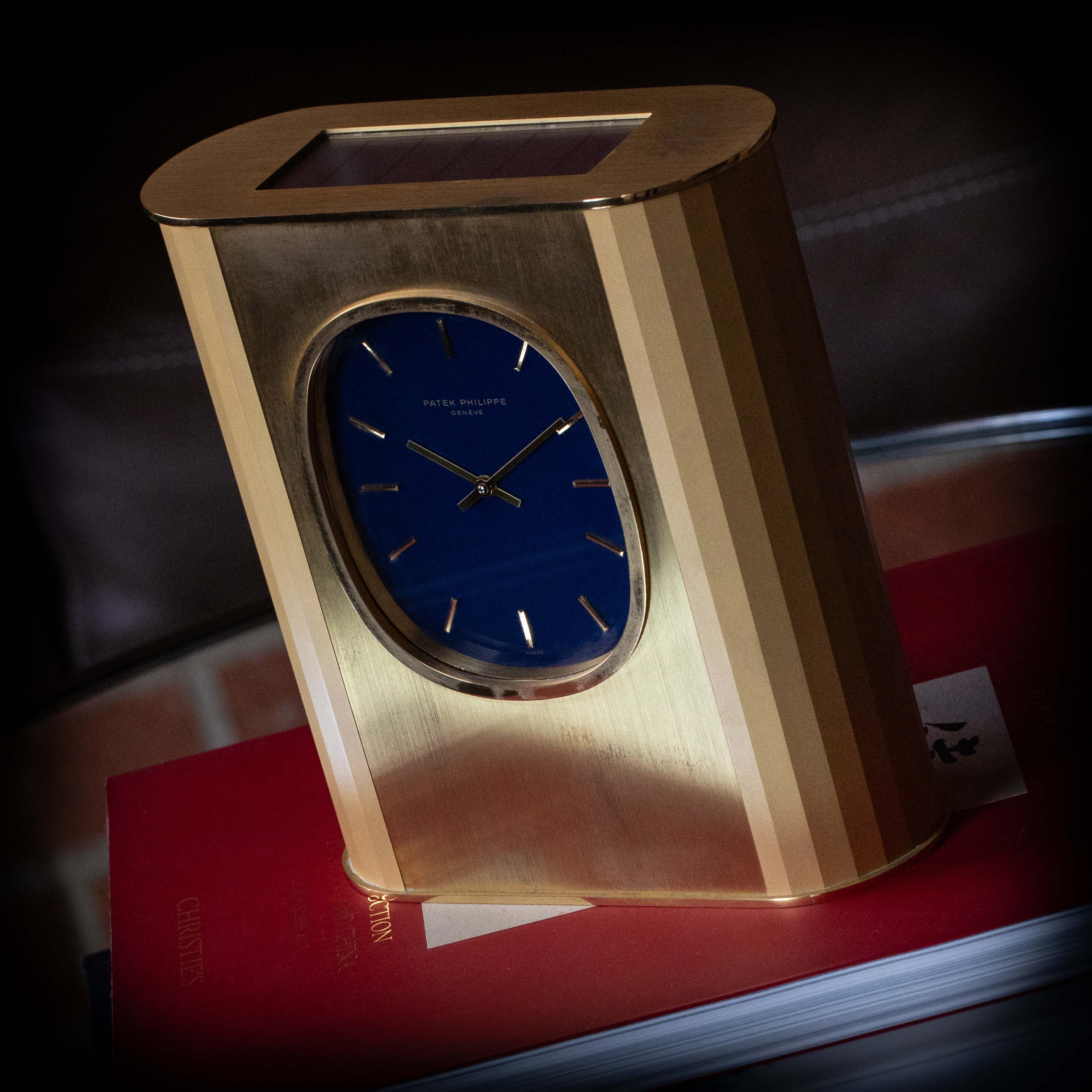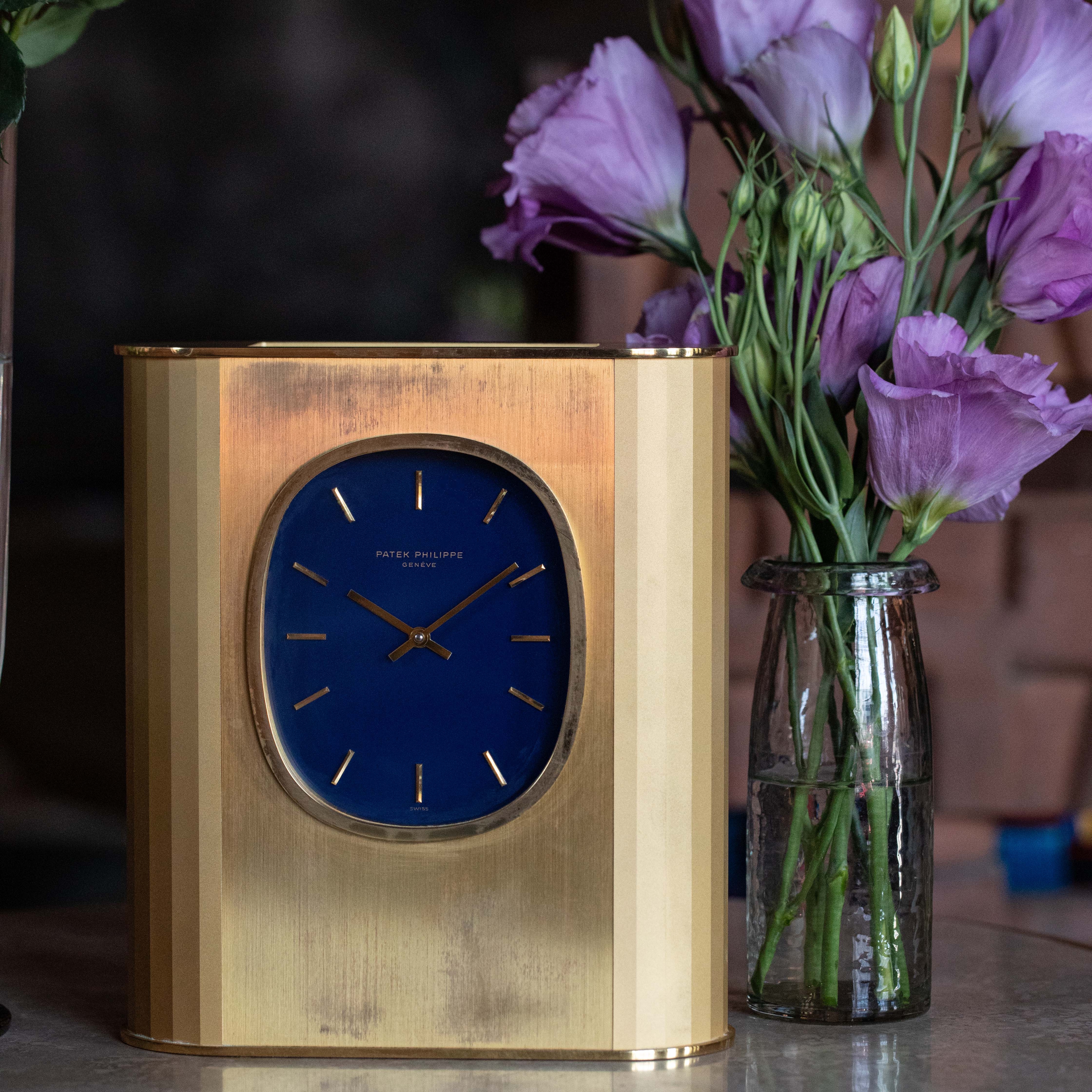 During the 1950s, Patek Philippe developed solar clocks as a means to demonstrate their innovative nature following the creation of their Electronics Division in 1948 as the brand sought alternate forms of timekeeping, such as nuclear, electronic and photoelectric. Launched in the 1970s and inspired by the Golden Ellipse, a dress wristwatch, the Ellipse Solar Clock was both an expansion of that technology and a strategic response to the Quartz Crisis, a period when the watch industry faced intense competition from inexpensive, mass-produced quartz watches which pushed mechanical watchmaking to the edge of extinction. To remain at the forefront of innovation, Patek Philippe continued to embrace solar technology, integrating it into their exquisite desk clocks such as the example we have here, the reference 1505. Made of gilded brass, this is a desk clock that exemplifies Patek Philippe's commitment to luxury and technical prowess. Featuring a striking oval-shaped blue dial, echoing the aesthetic of the renowned Golden Ellipse collection, the ref. 1505 showcases the brand's ability to blend traditional elegance with modern technology. The use of solar power not only demonstrated Patek Philippe's adaptability but also reinforced their reputation for precision and sustainability, securing their position as a leader in the horological world amidst the rapidly changing landscape of the 1970s.