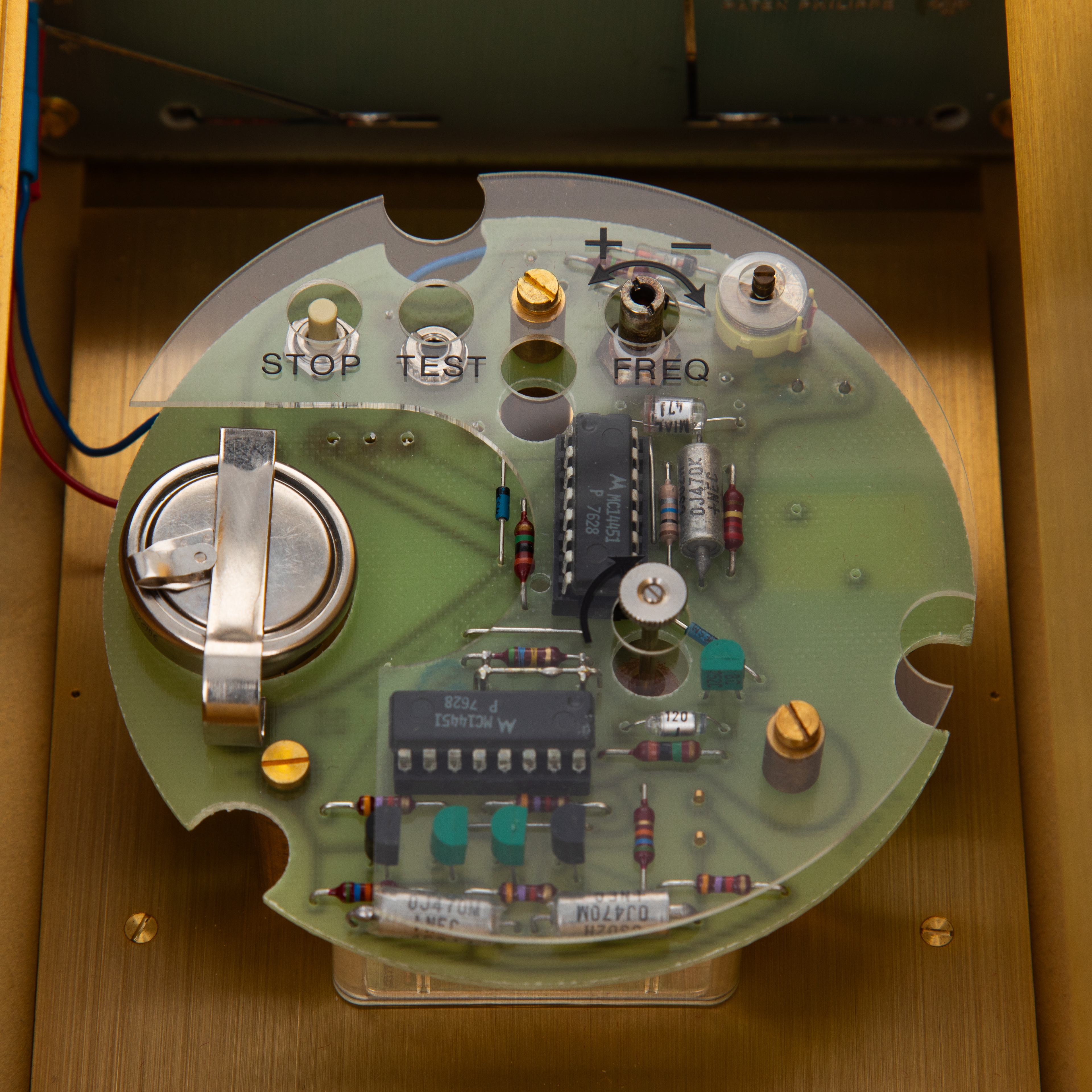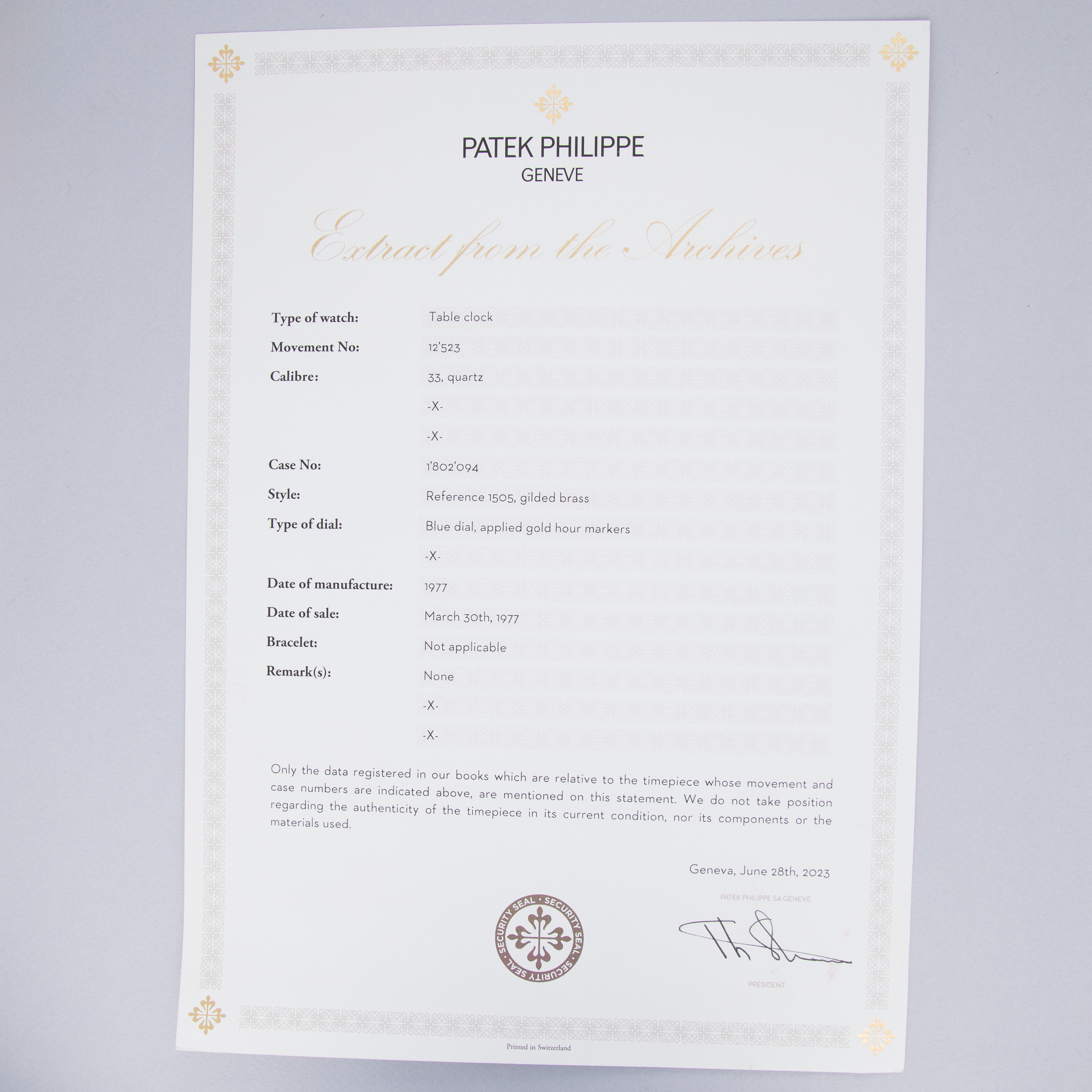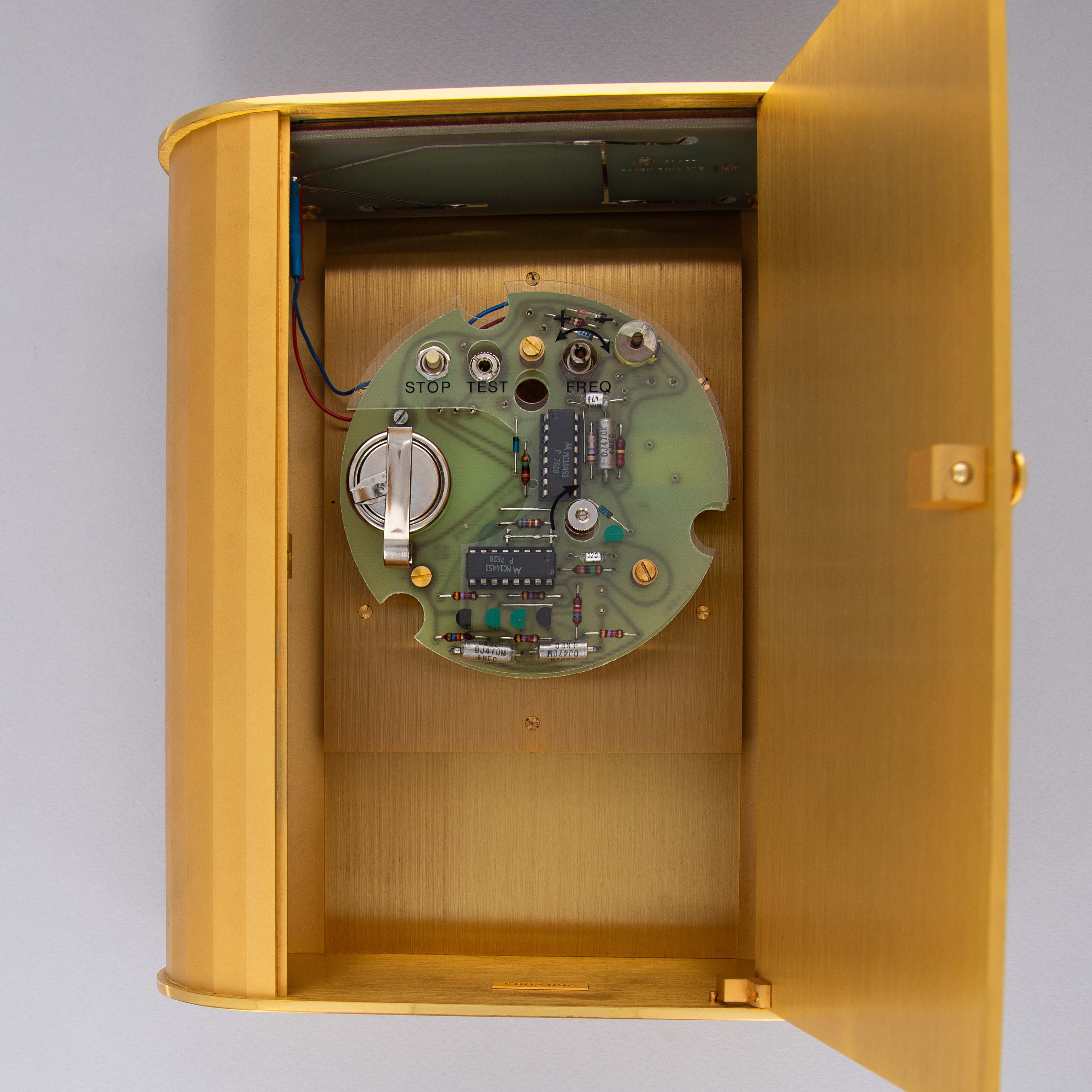 Clock is in excellent overall condition. Surface shows minor oxidation and light signs of wear. Dial shows little to no signs of aging. Clock is running at time of cataloging, but unsure of the age of the battery. Clock comes with an Extract of the Archives.
