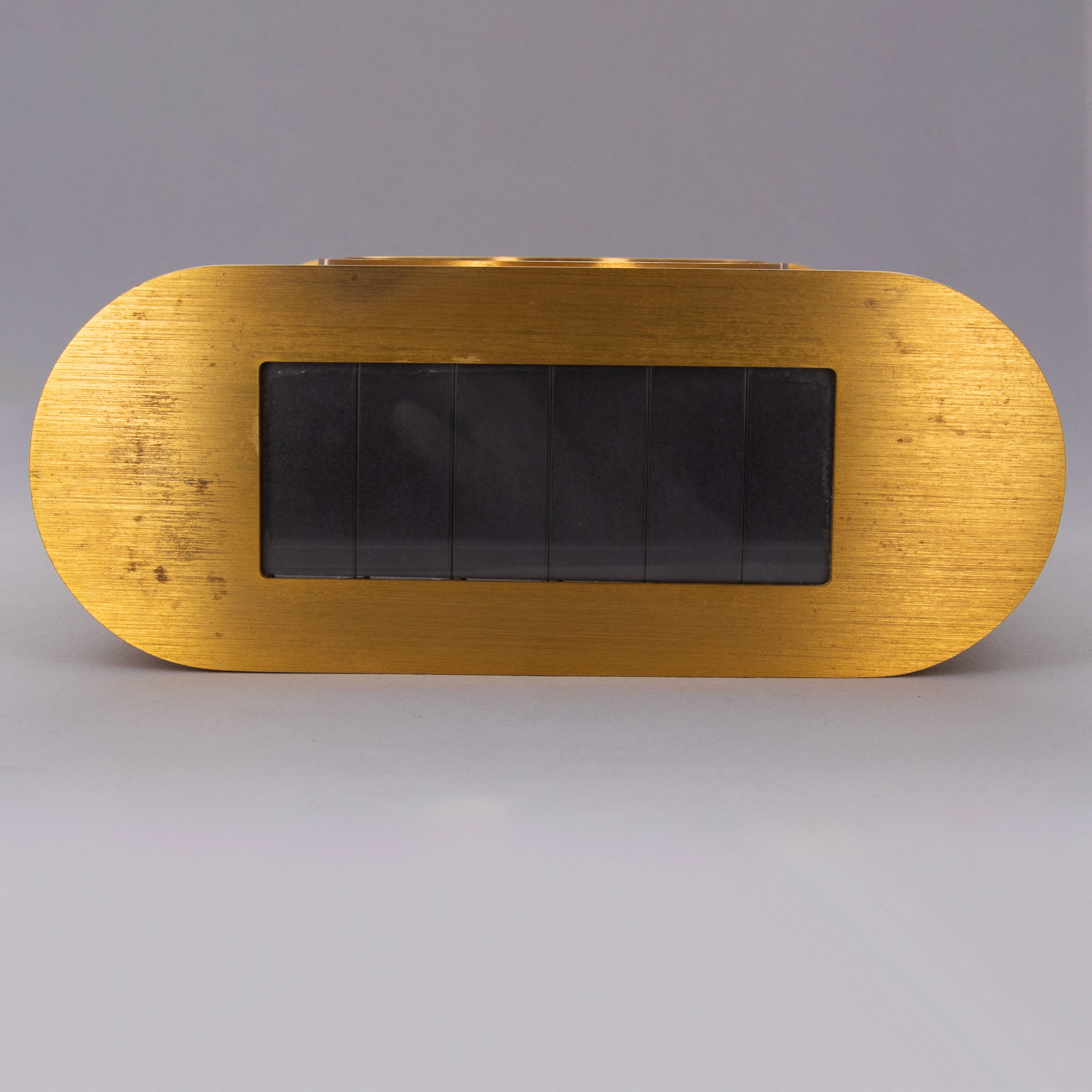 Made of gold-plated brass, the Ellipse Solar Clock translates the Golden Ellipse's oval-shaped construction into its own design with its oval profile matching its oval display.