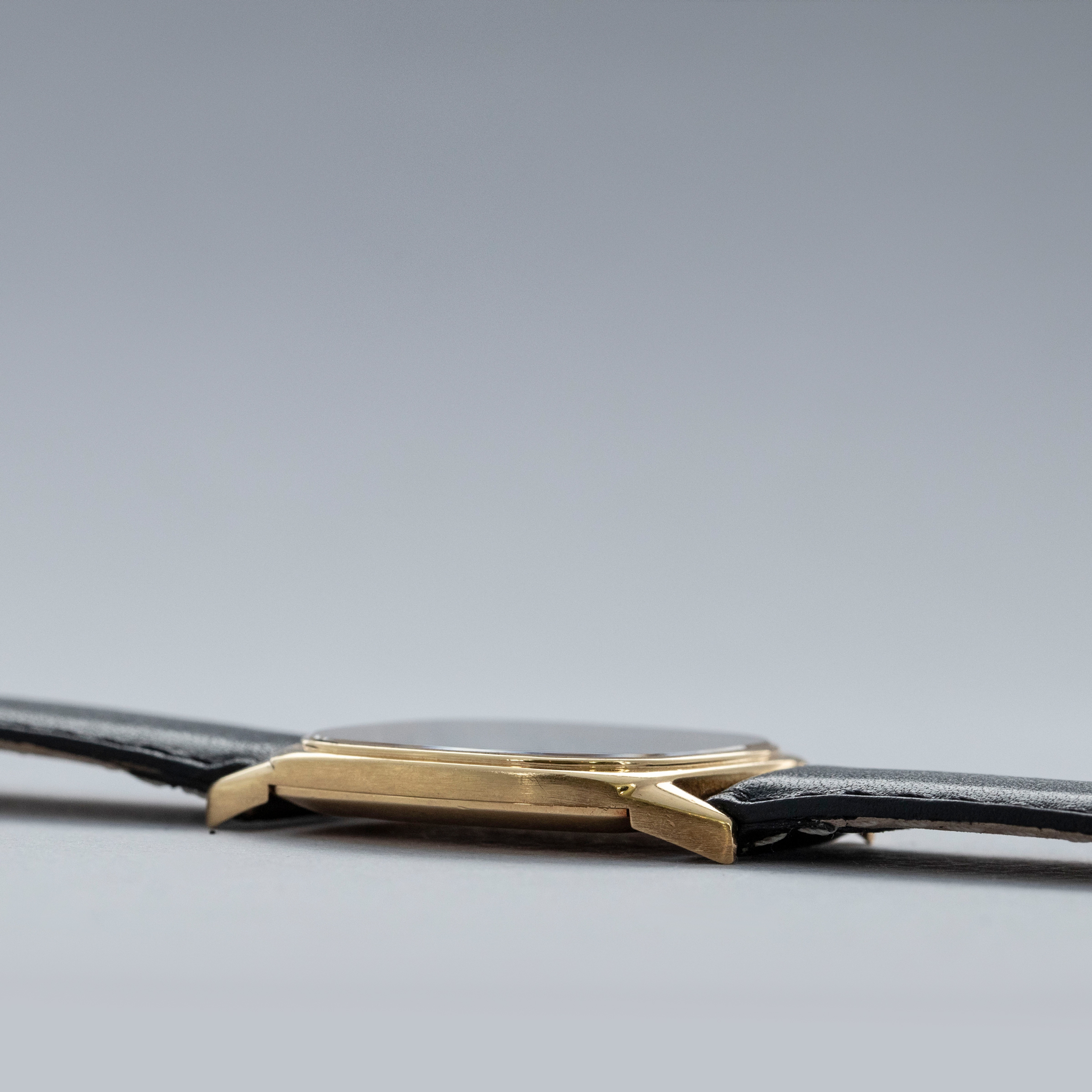 Featuring a white dial with black painted Roman numerals and matching black hands and inscriptions, including the co-signature of its original retailer, Beyer, the ref. 3666's dial is perfectly monochromatic and the best possible fit for its 18kt yellow gold case.