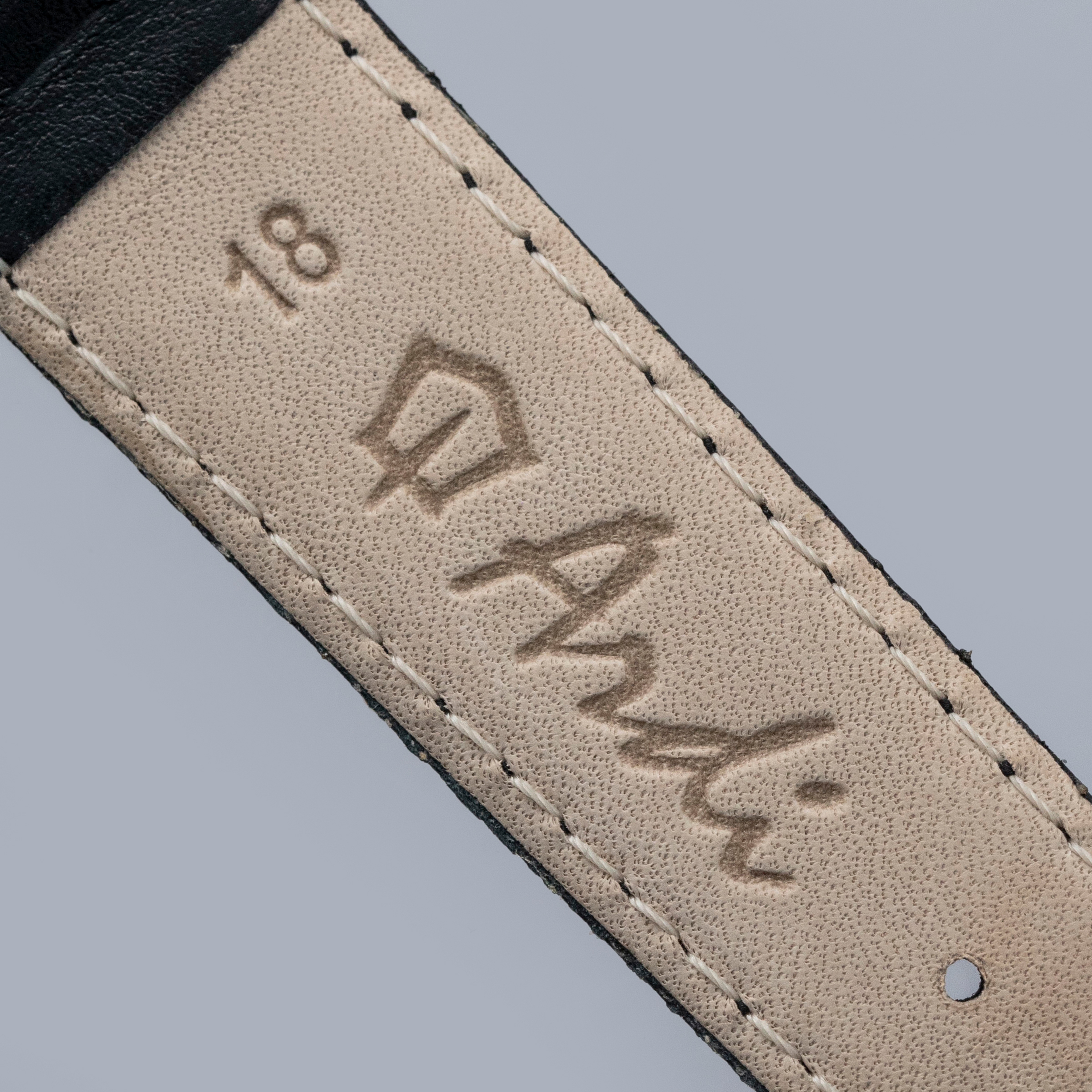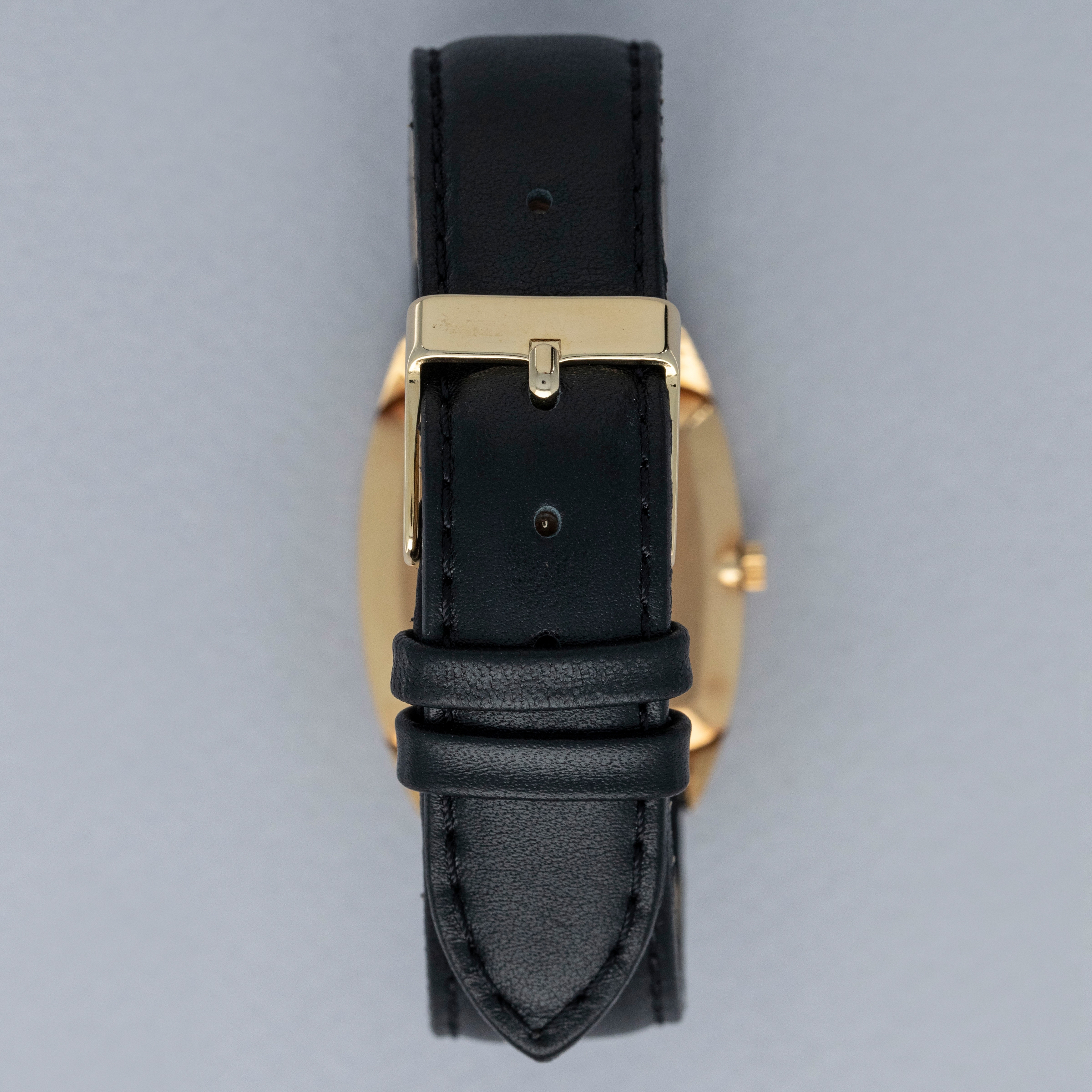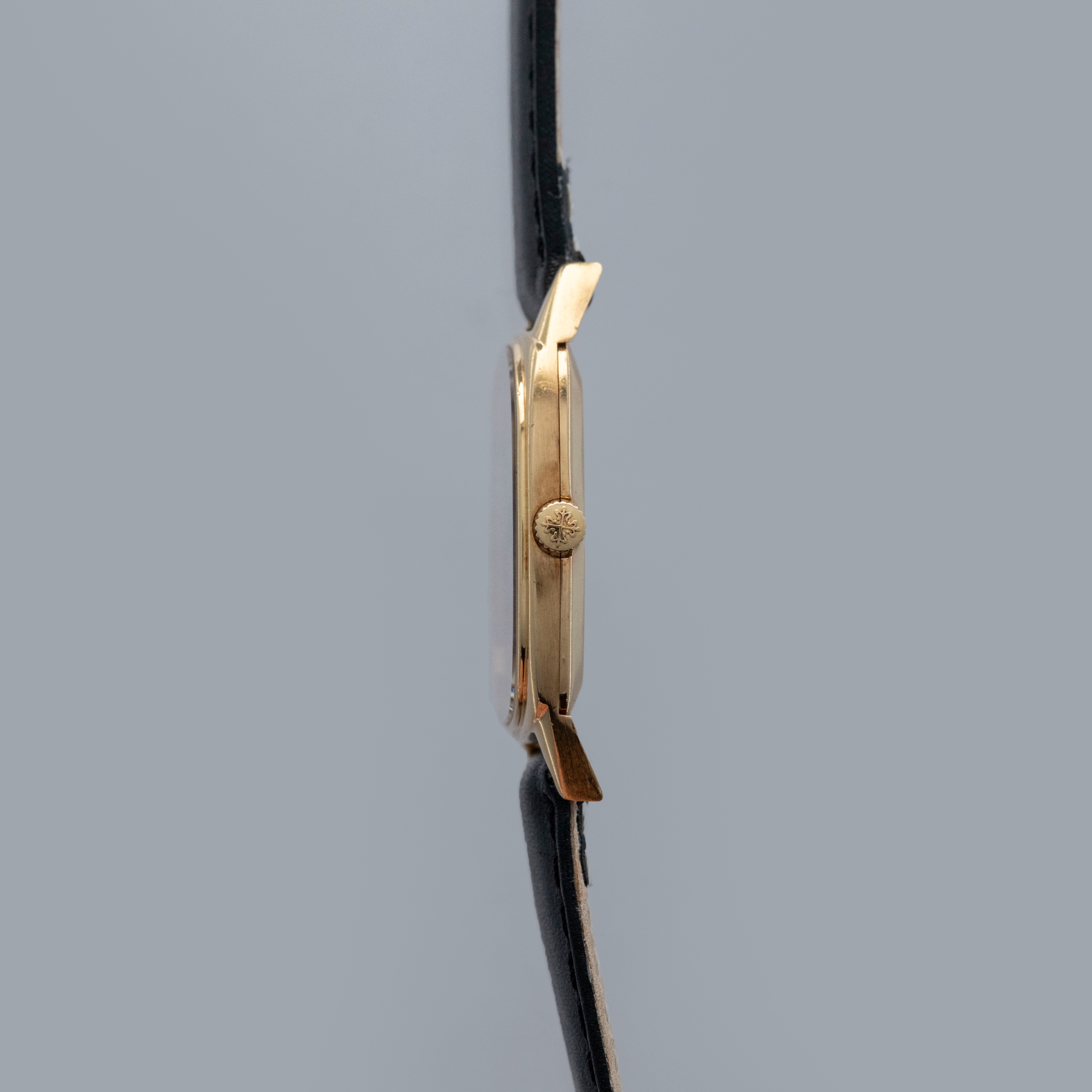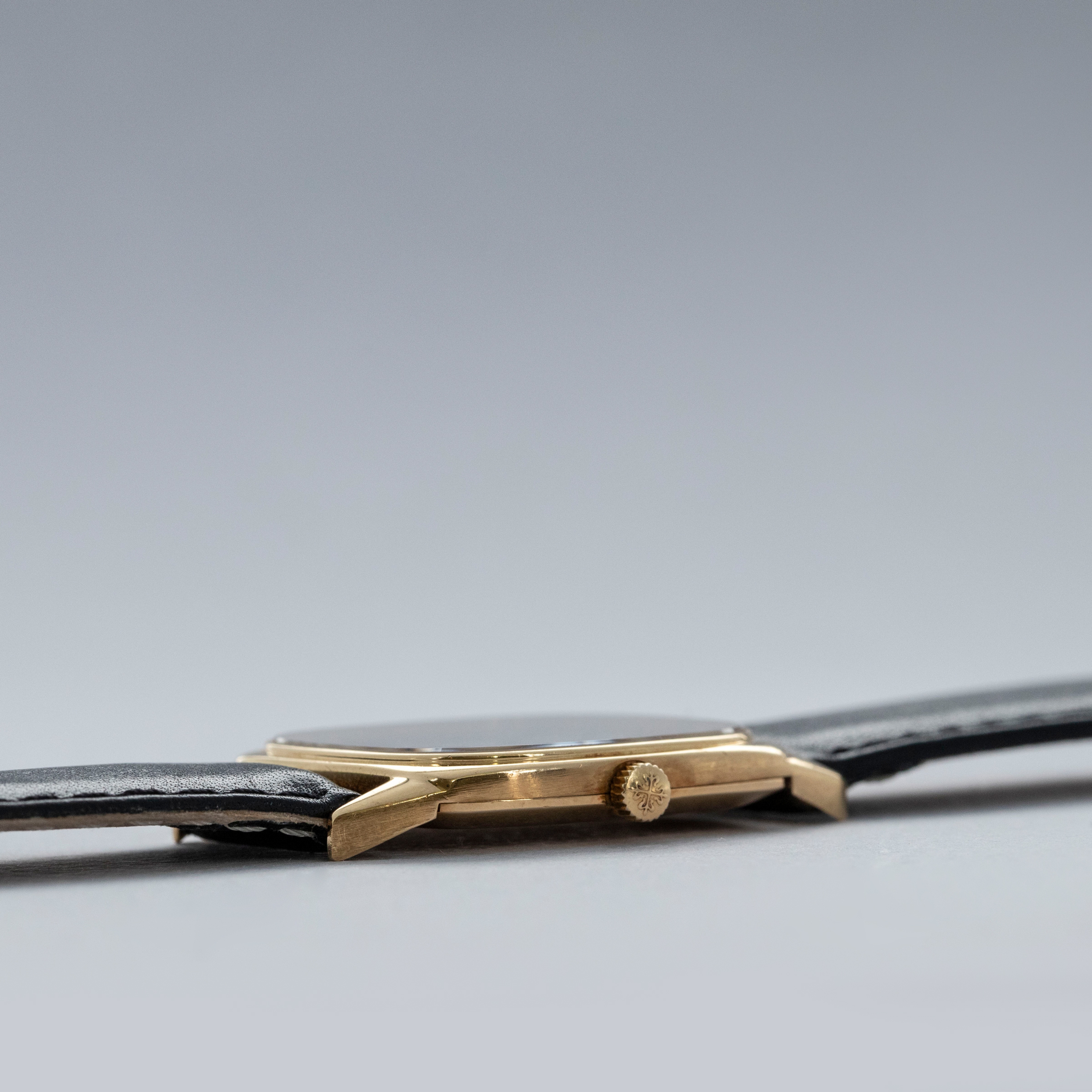 Watch is in overall excellent condition. The yellow gold case has some scratches and light nicks, but the case definition remains excellent. The case back has crisp hallmarks, and the watch retains its Patek Philippe logo winding crown in excellent condition. The dial has some light marks, especially around the edges, with a small line inside the inner track between four and five. The black hands are very clean. The watch is fitted with a black leather strap with a gold pin buckle.