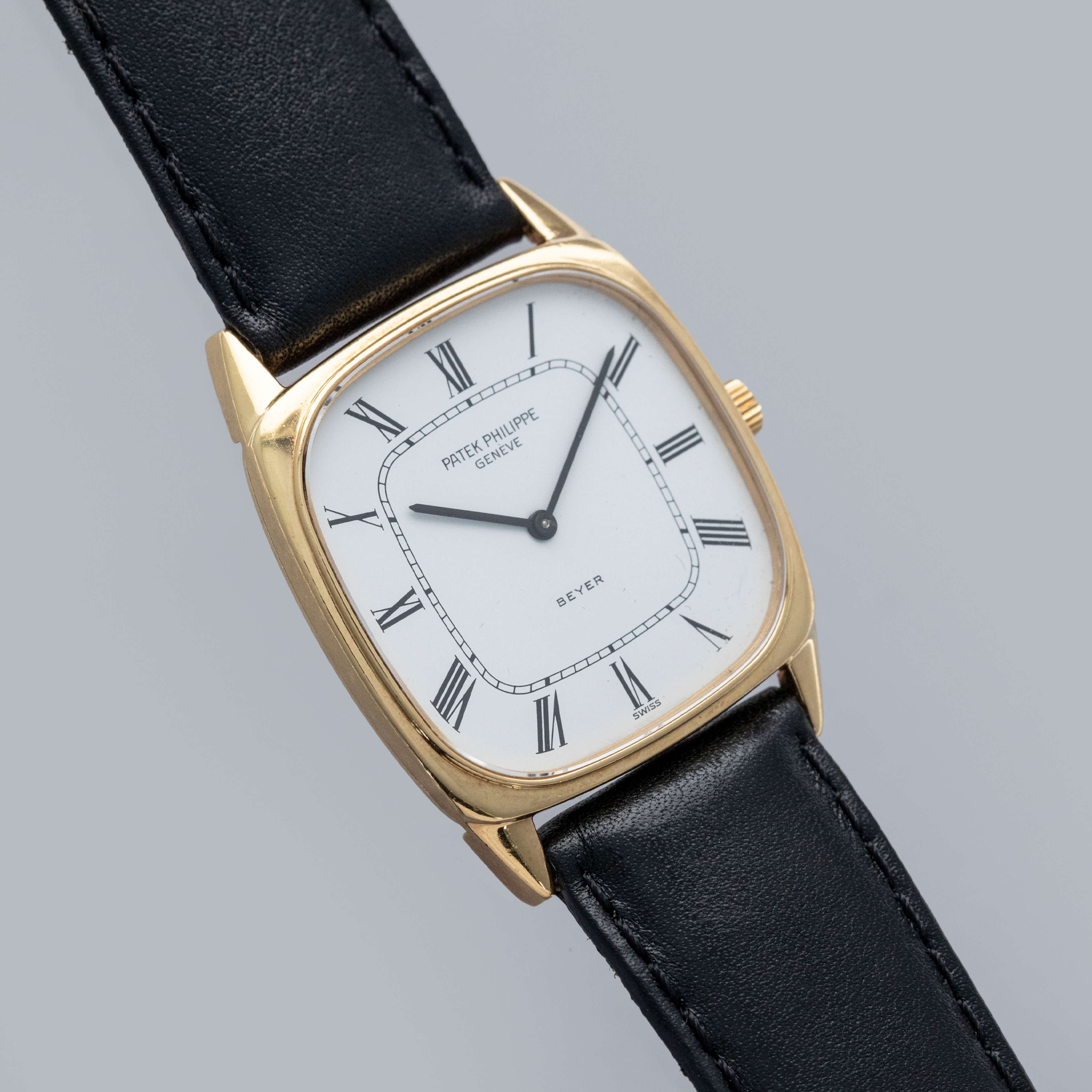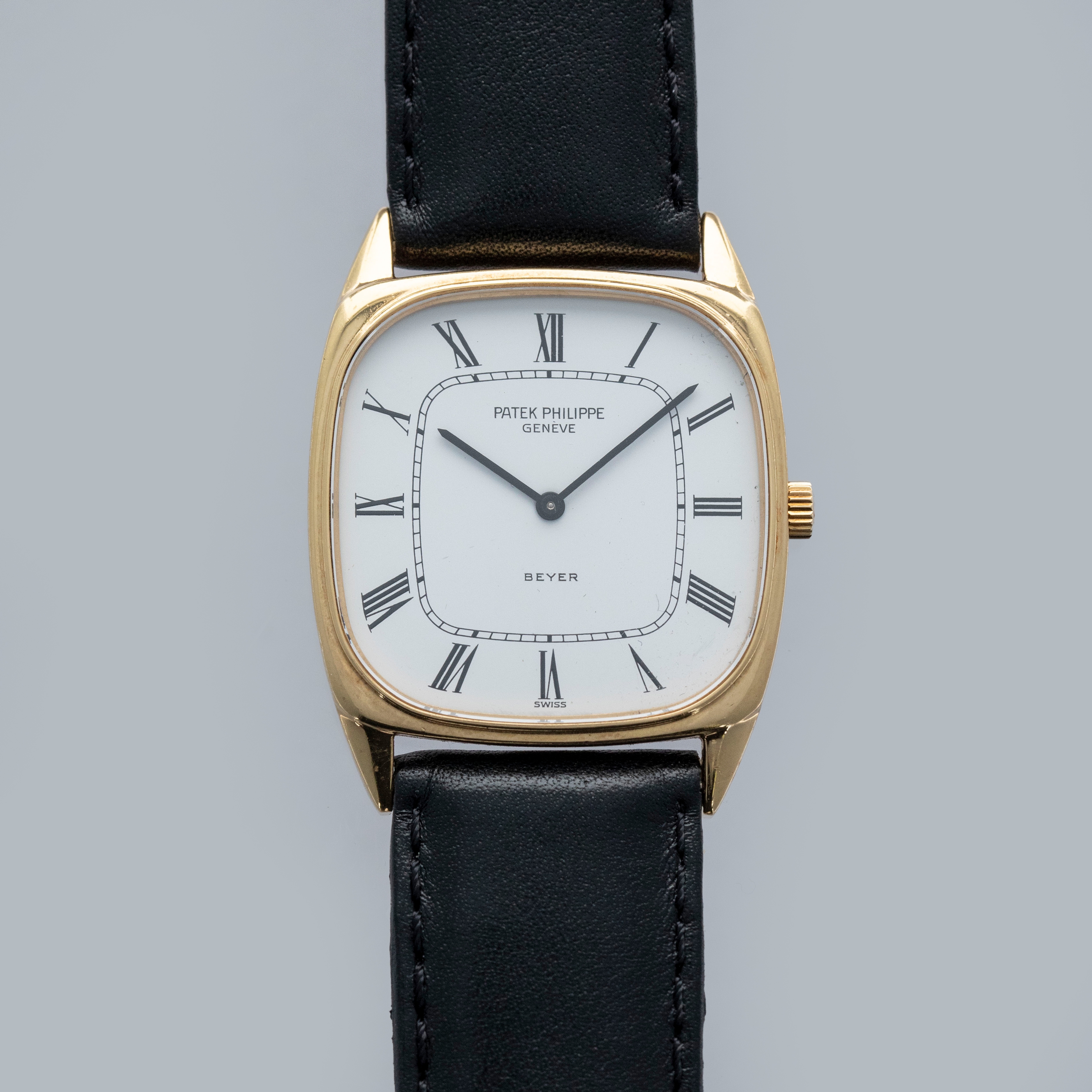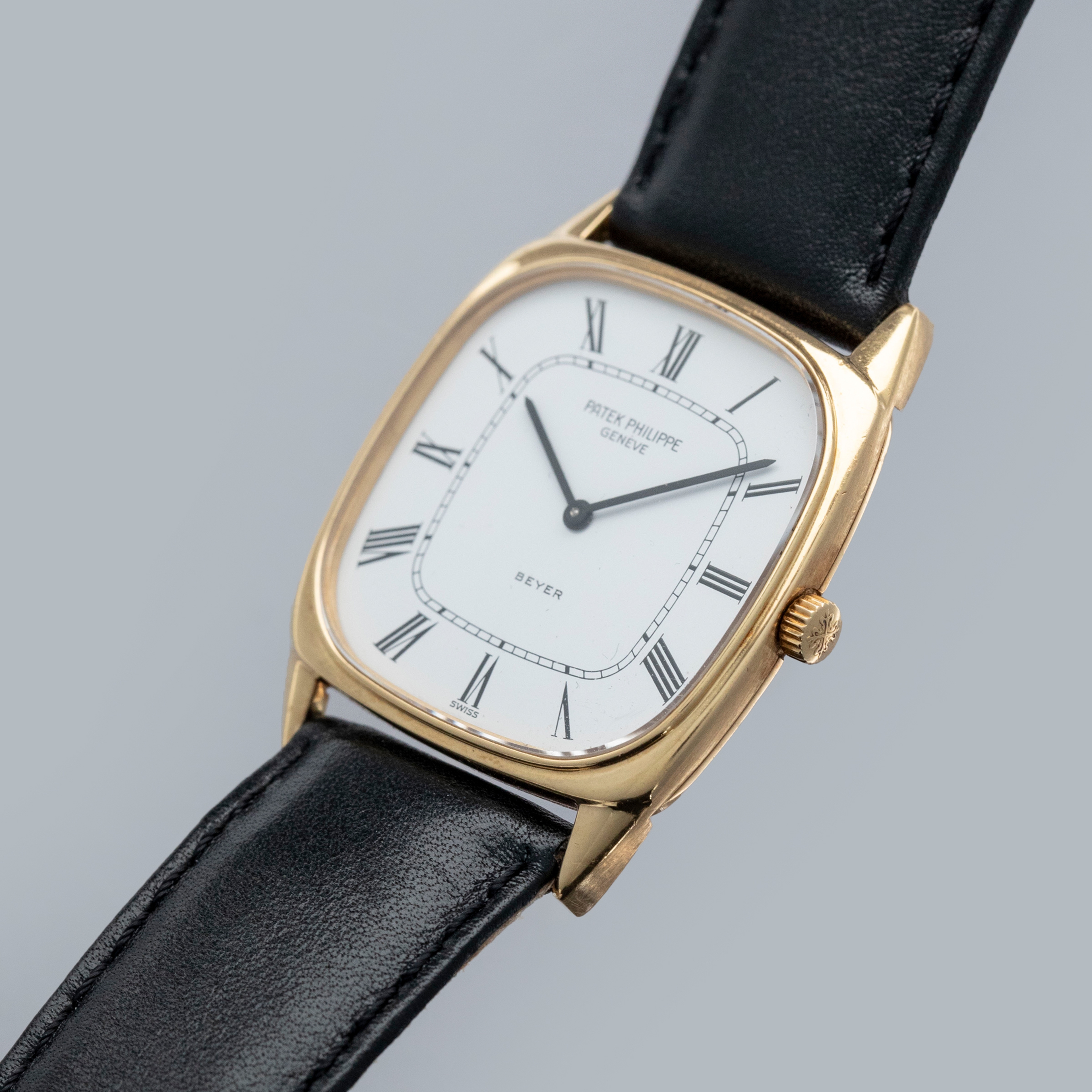 Launched in 1968, Patek Philippe's Golden Ellipse collection marked a significant shift for Patek as they embraced the constantly changing world that was the 1960's. With the dawn quartz technology on its way, Patek sought a watch that was both unisex in its design and also immediately 'Patek' in its aesthetic. With that design brief, Patek debuted the Golden Ellipse to immediate success as a result of its novel and forward-thinking design and luxurious construction. Made from 18k gold and powered by a manual-wind movement, the Ellipse celebrated classical watchmaking's techniques while also retaining a forward-thinking design in the form of its thin elegant cases, understated dials and elegant unisex proportions. Following the success of the first Ellipse, the ref. 3548, Patek followed with several other variants that proved to be just as successful, leading to the collection remaining within Patek's catalog to this day. As such, one of those references was the Ellipse that we see here, the Ellipse ref. 3666. Featuring a 28mm-wide square case (35mm from lug to lug) made of 18kt yellow gold, the ref. 3666 wears on the wrist with an elegant stance that is slightly shorter than other Ellipse references, and thus easier to wear. In combination with its monochromatic white dial that features black painted Roman numerals and the co-signature of its original retailer Beyer, and its manual-wind cal. 177 movement, this example is also offered in exceptional condition throughout, making it a delight on wrist.