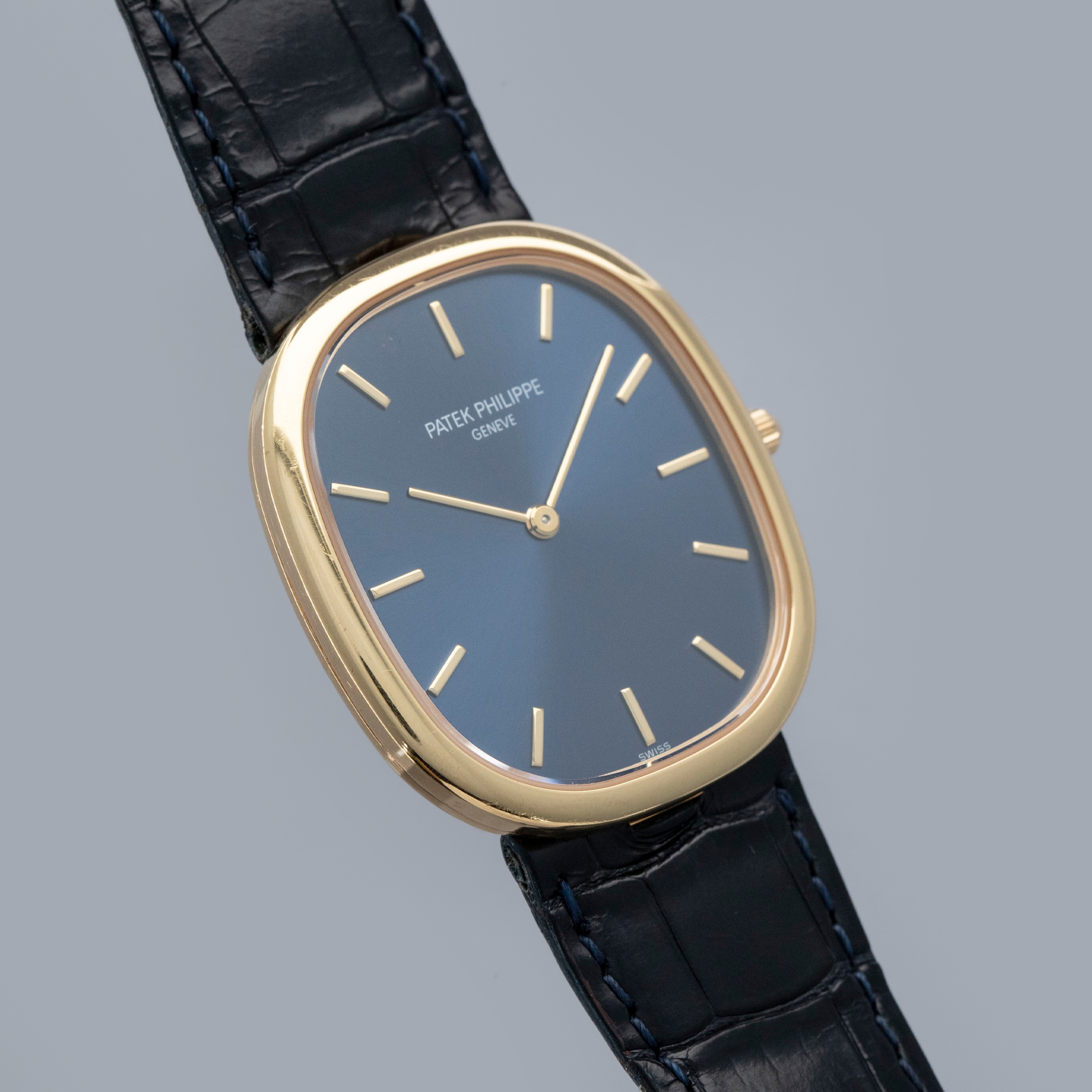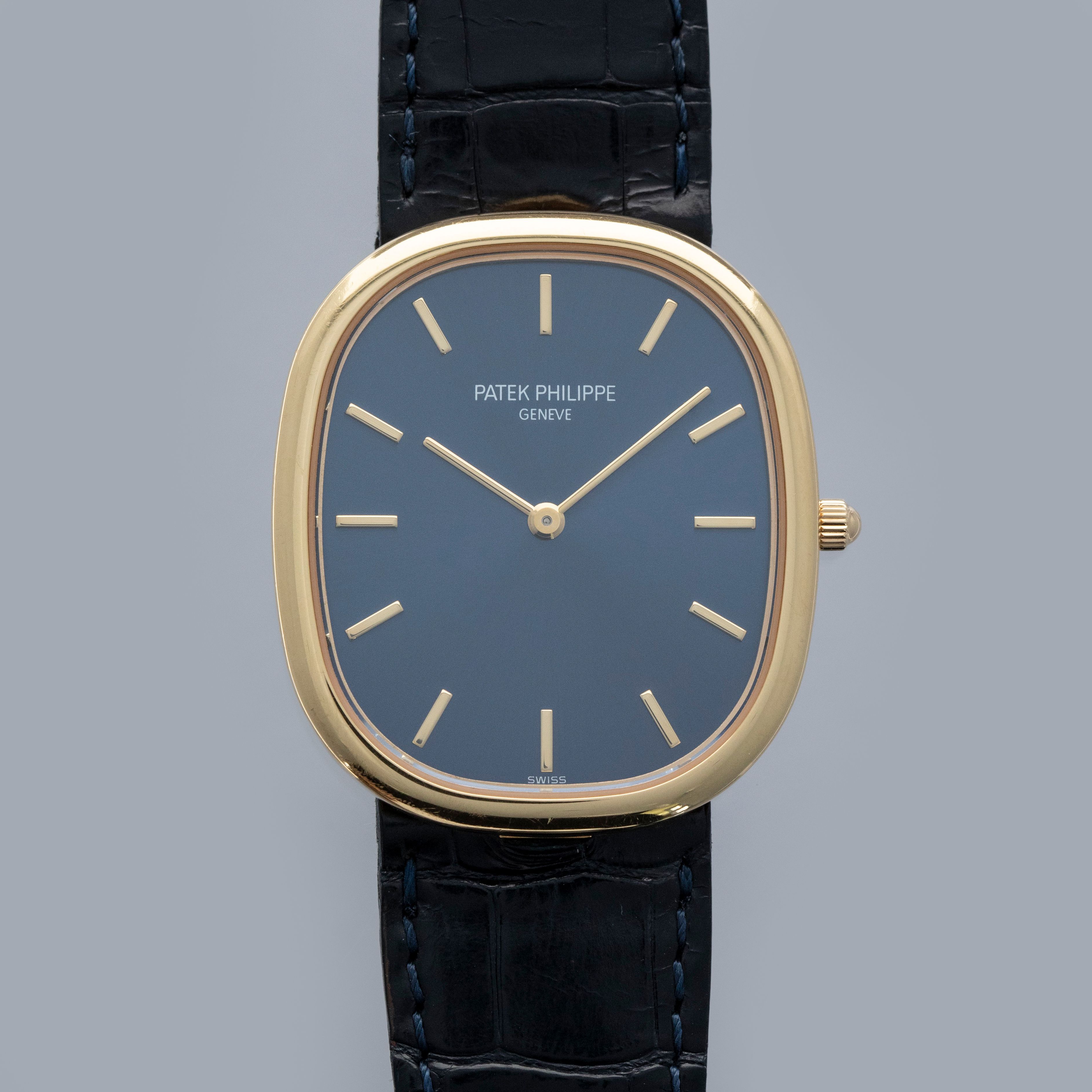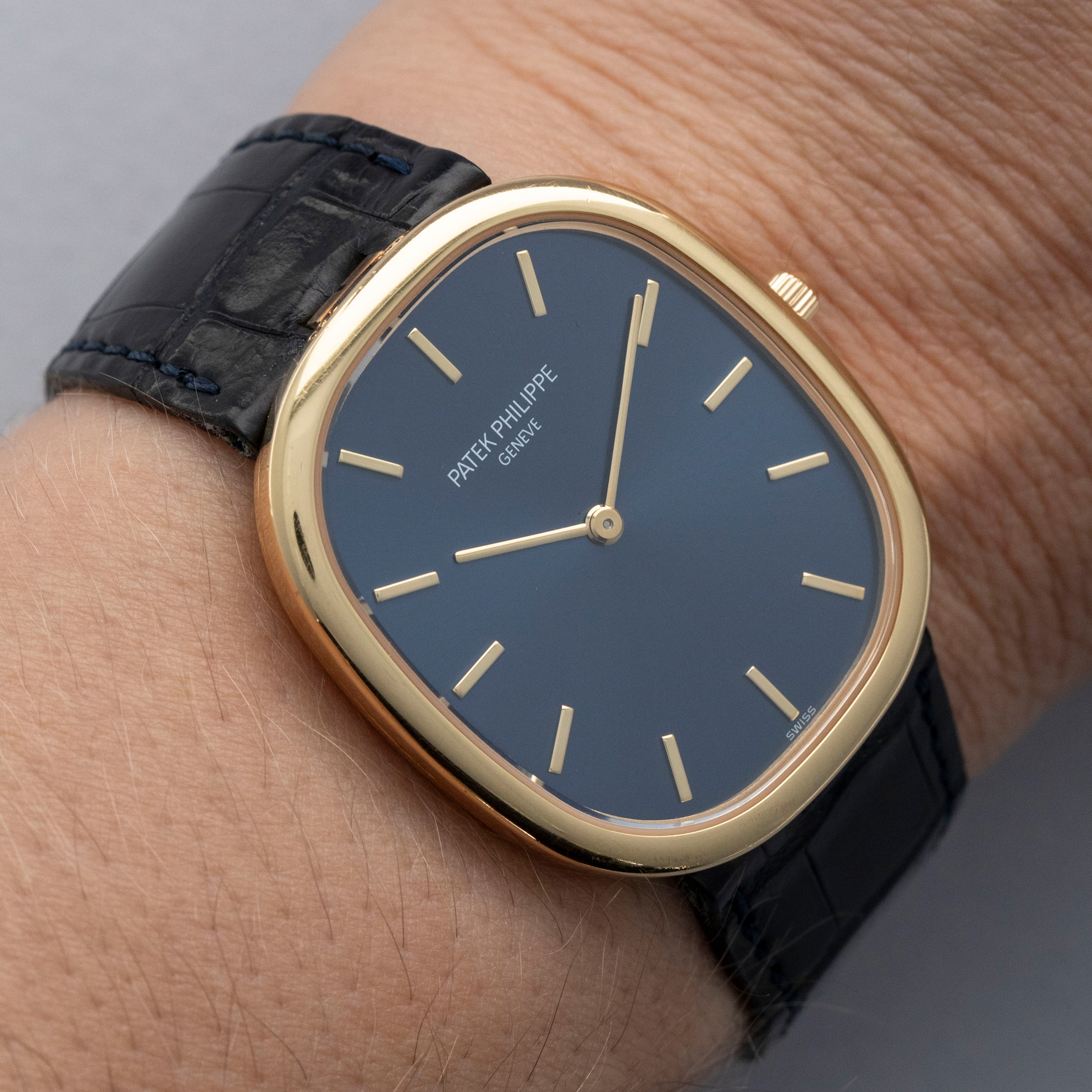 Classic, slim, yellow gold Ellipse with blued gold dial — this is the Golden Ellipse to own. Nicely sized, understated, and pure Patek Philippe design - it's the kind of watch that always looks and feels right.